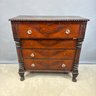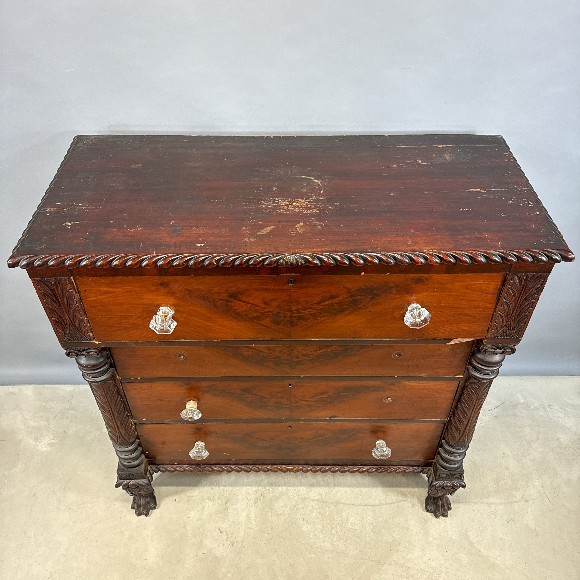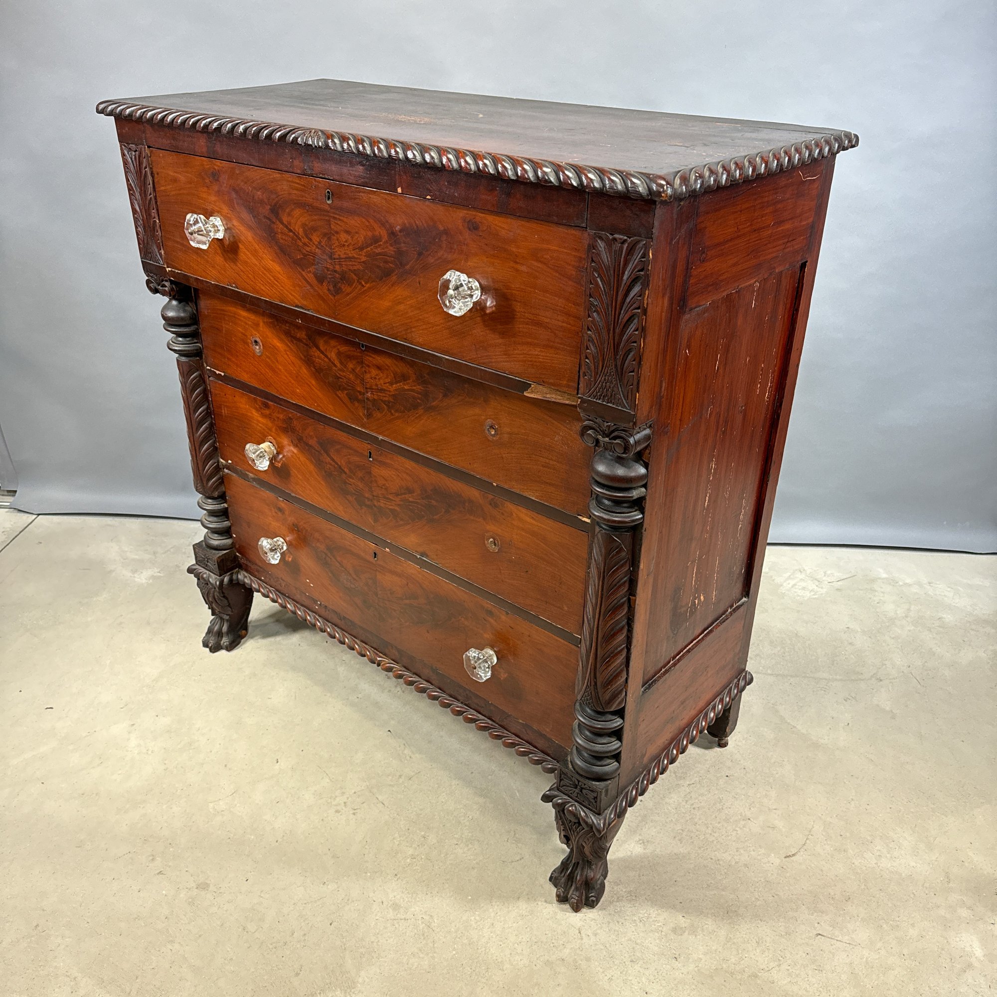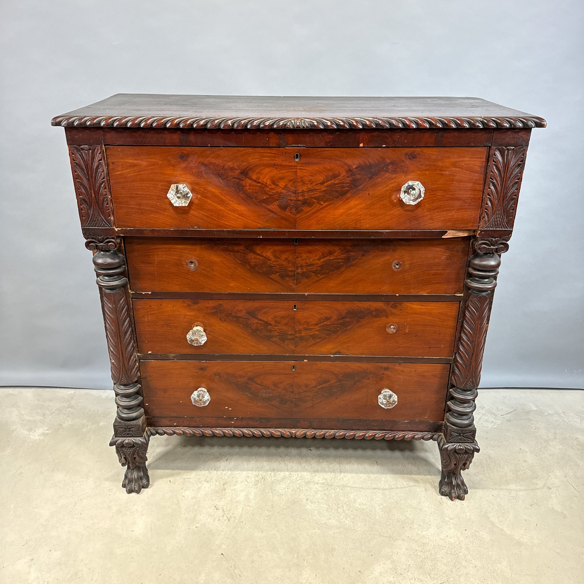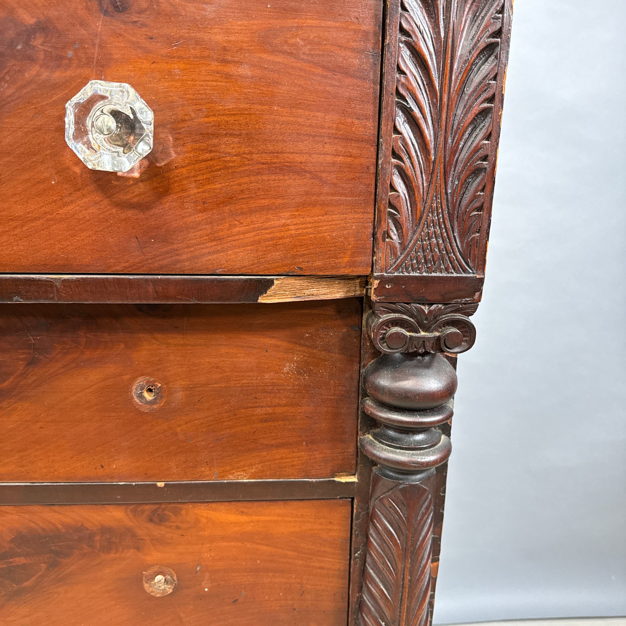 Classical Carved Mahogany Chest of Drawers, Early 19th Century. The rectangular top with gadrooned edge above a slightly outset drawer flanked by acanthus leaf panels, over three drawers, all with glass pulls and flanked by turned and acanthus leaf columns, above a gadrooned border and raised on frontal paw feet, affixed with a label on the back printed "Lt. Col. James Parker./ 13th Cavalry."