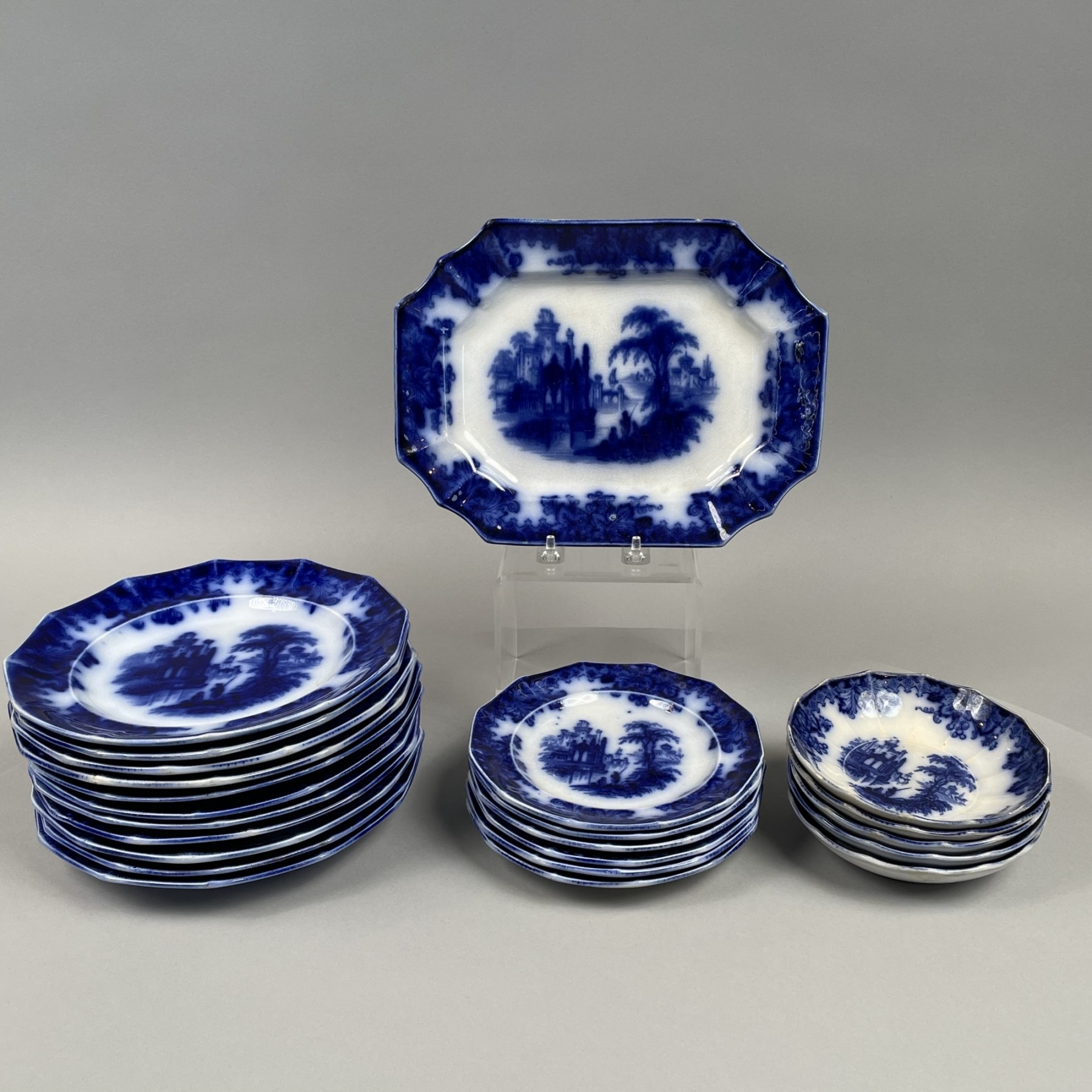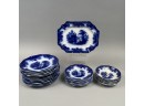Comprising one platter, five fruit dishes, six bread and butter plates and eleven plates, each printed "COBURG J.E." in underglaze-blue. (23)