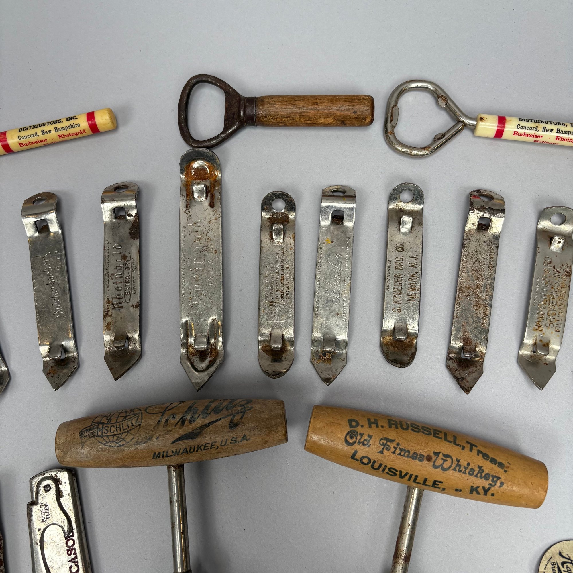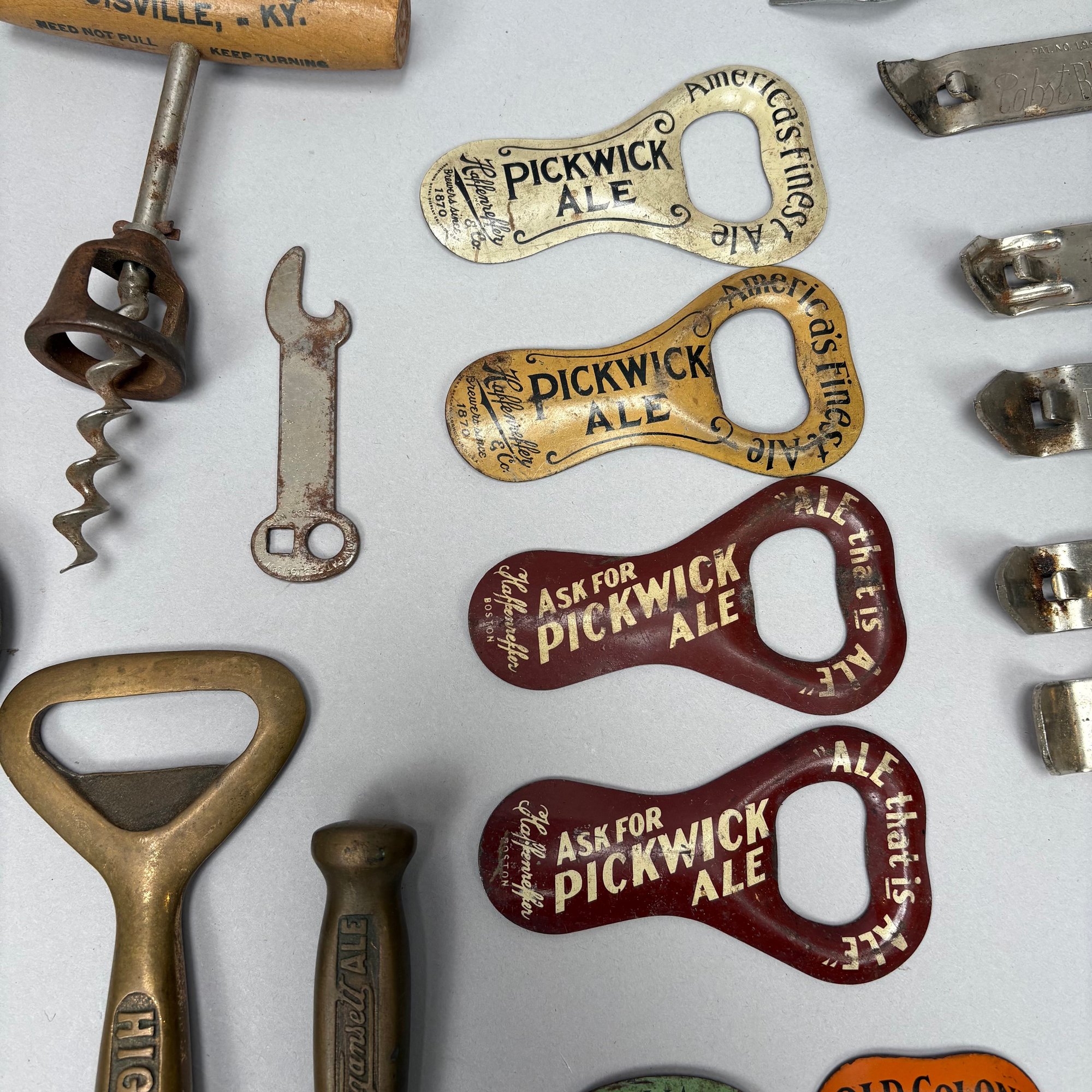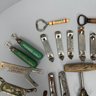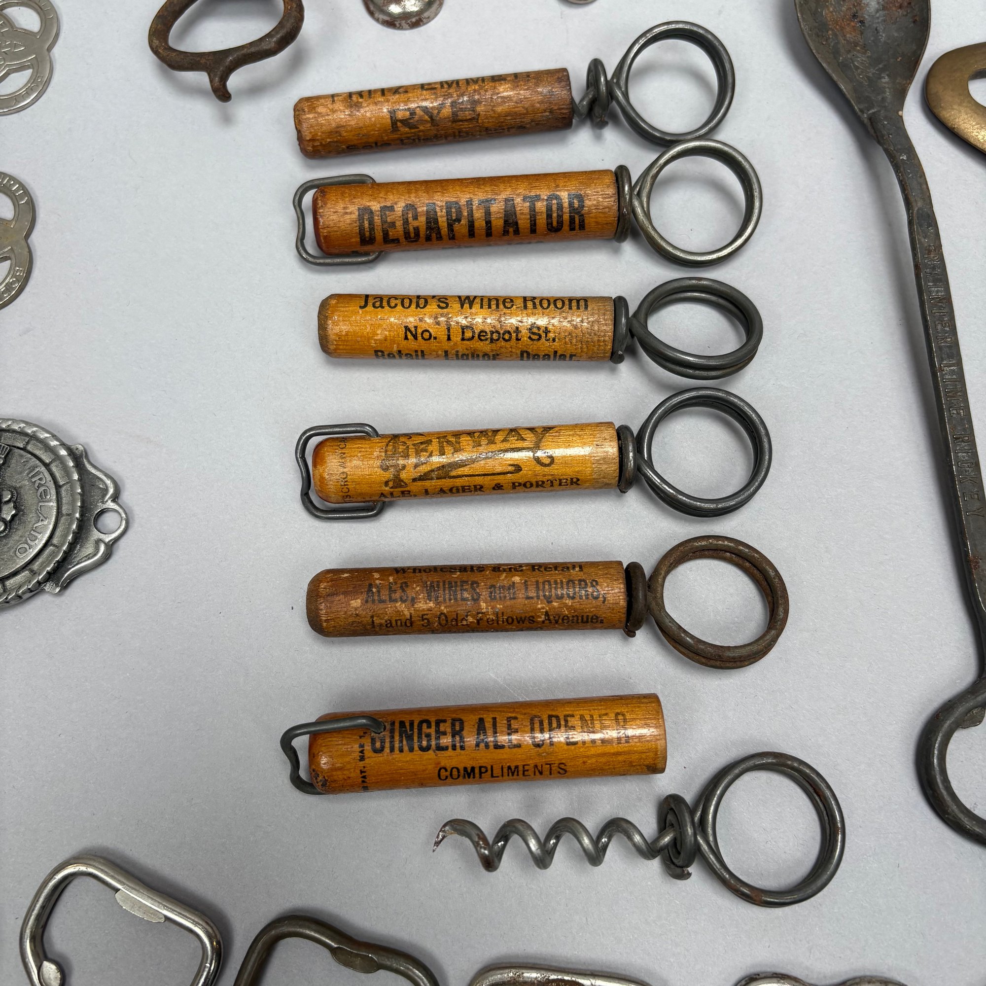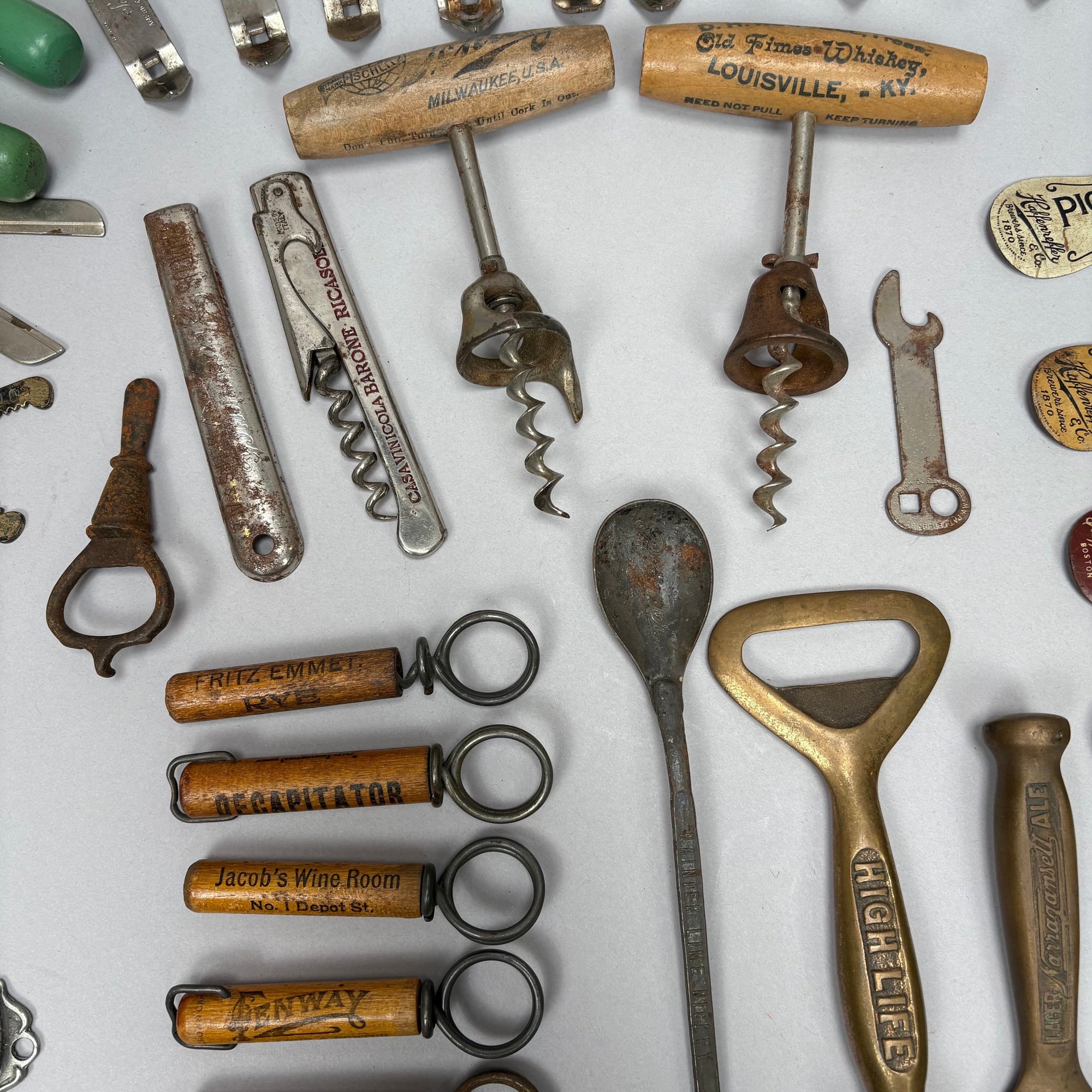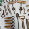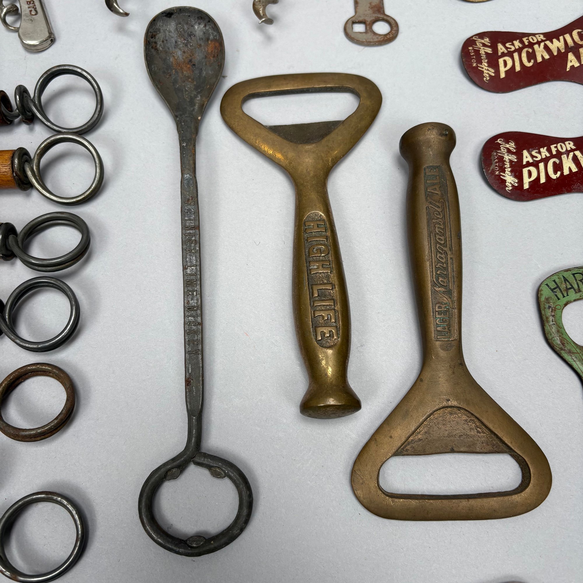 Collection of Eighty-Two Advertising Bottle Openers and Cork Screws, Various English, German and American Brewers and Distillers, 19th and 20th Century. Housed in a mahogany compass case.