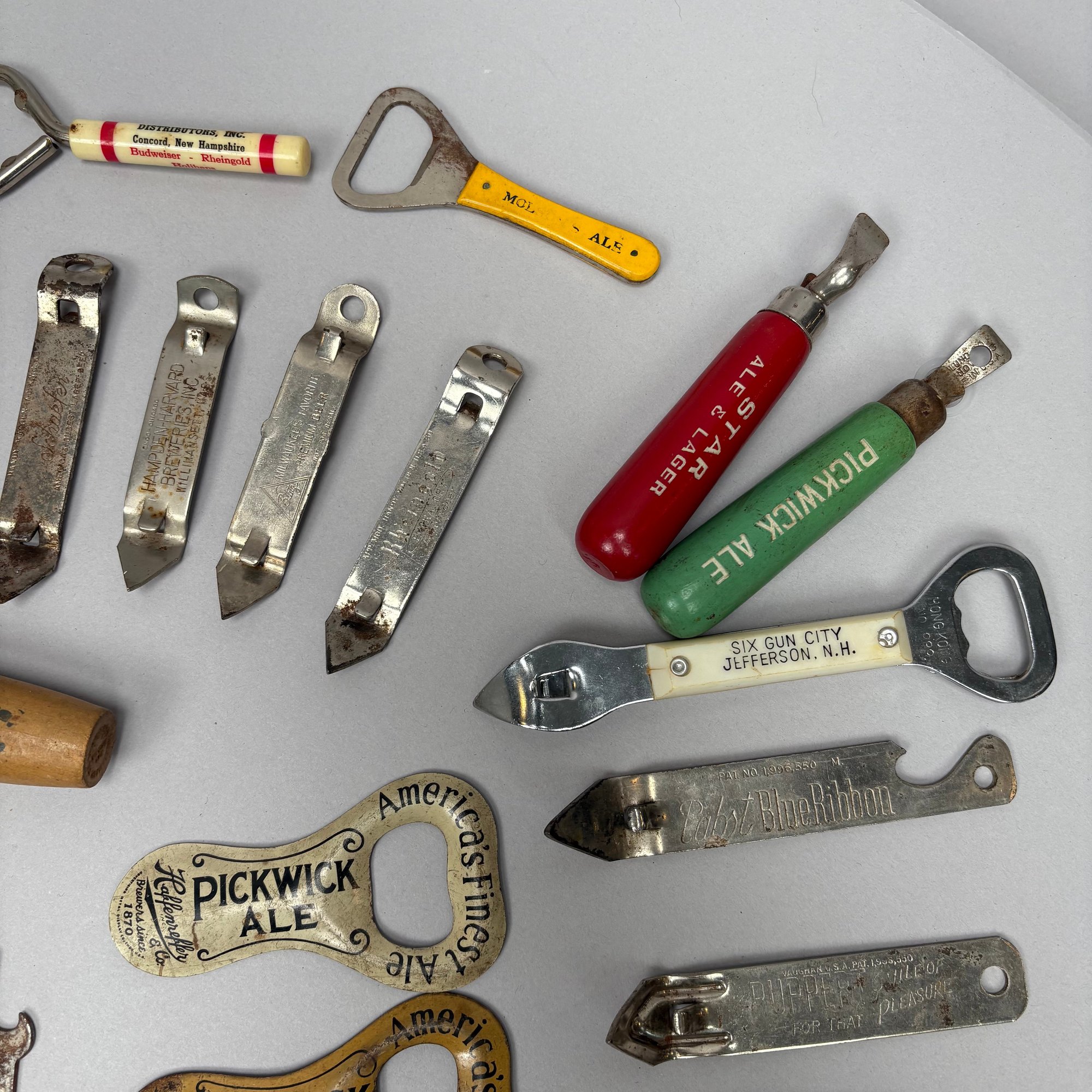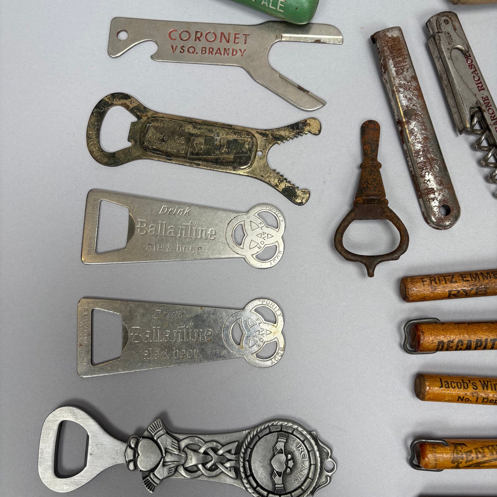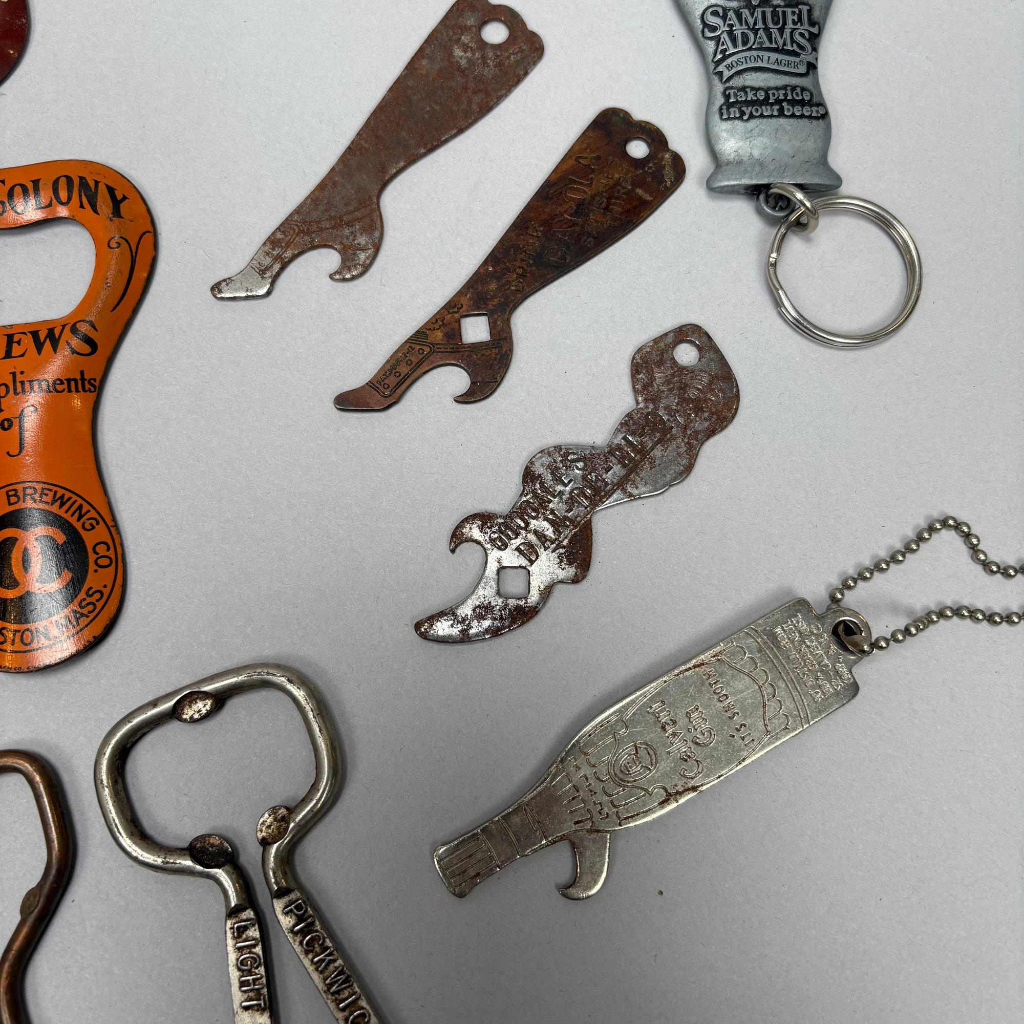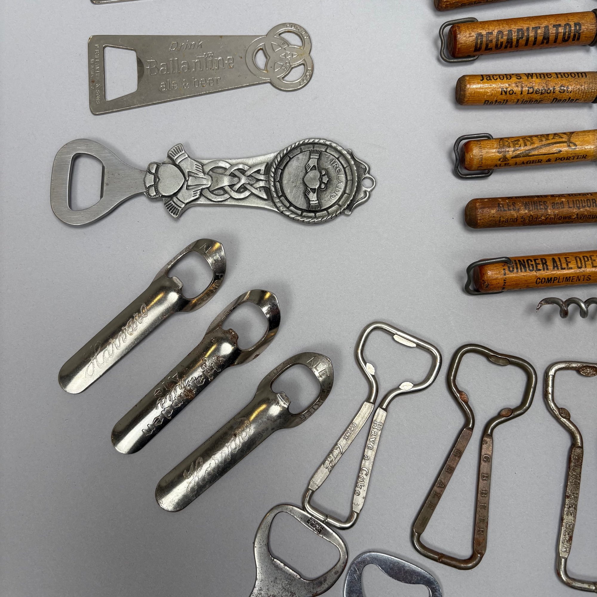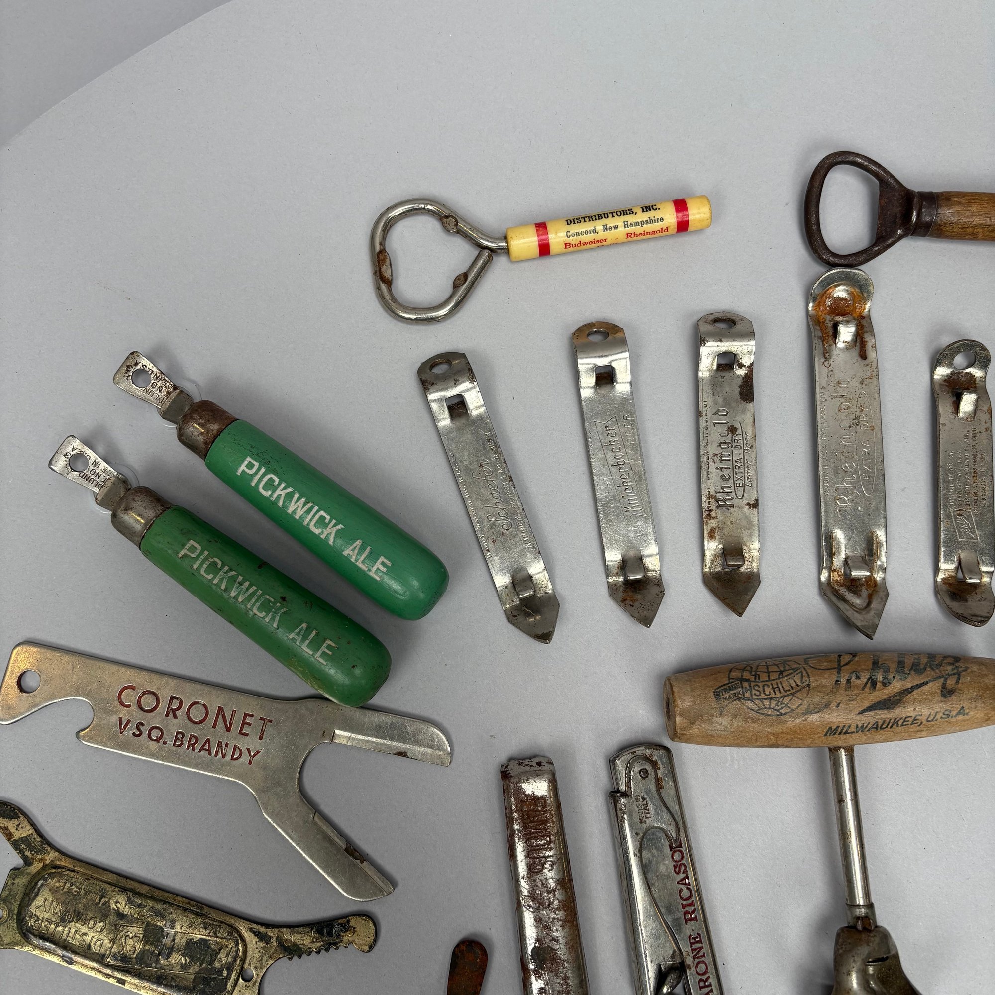 Collection of Eighty-Two Advertising Bottle Openers and Cork Screws, Various English, German and American Brewers and Distillers, 19th and 20th Century. Housed in a mahogany compass case.