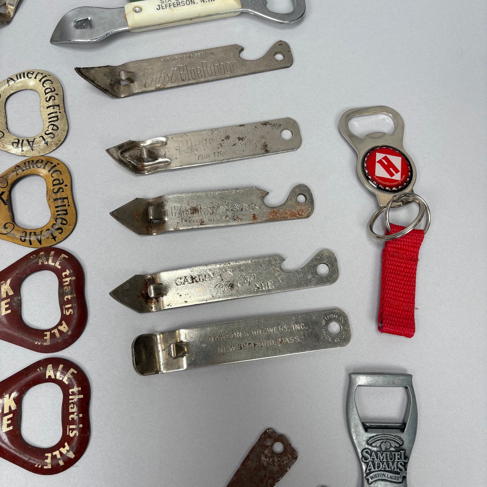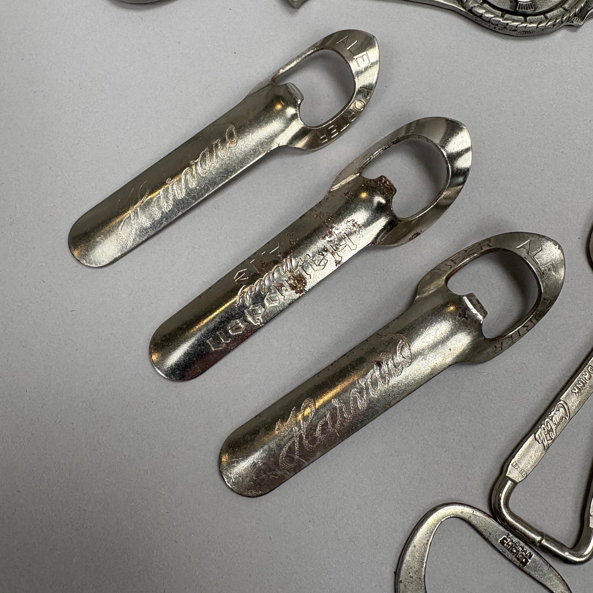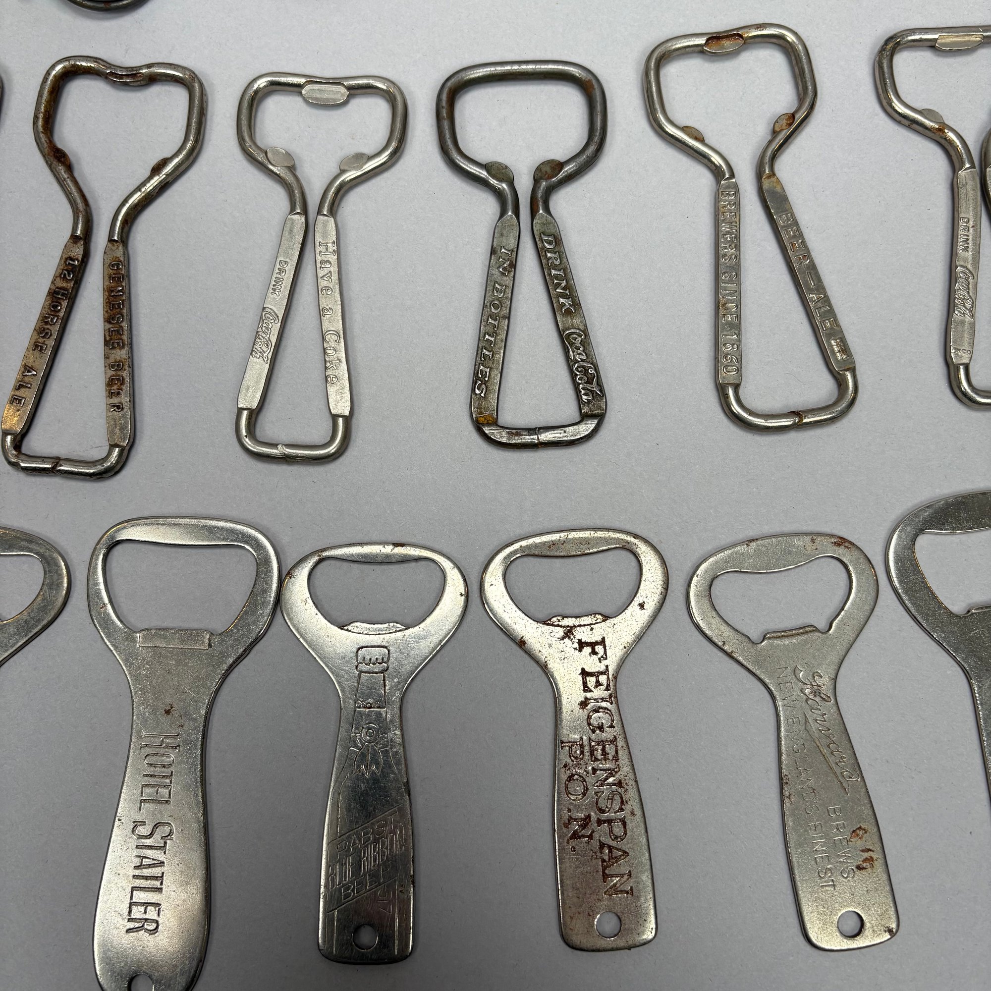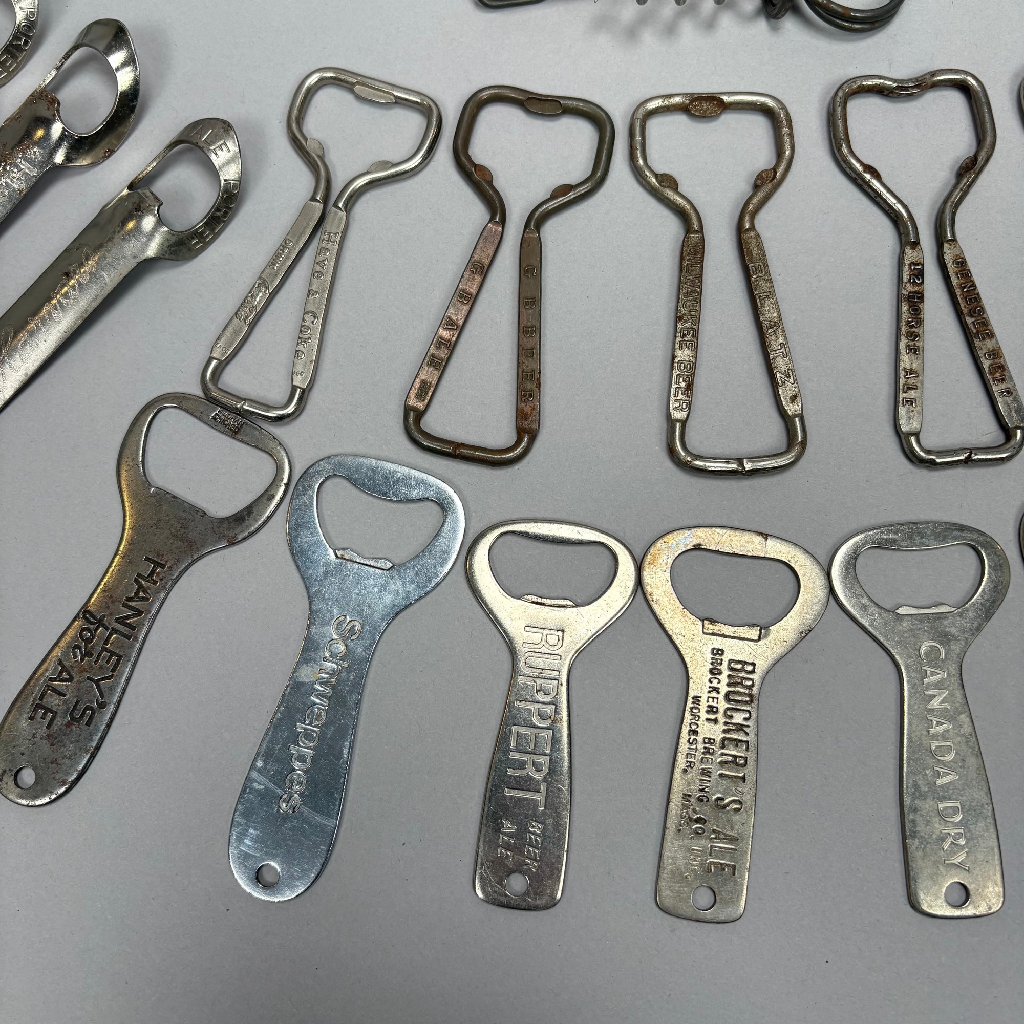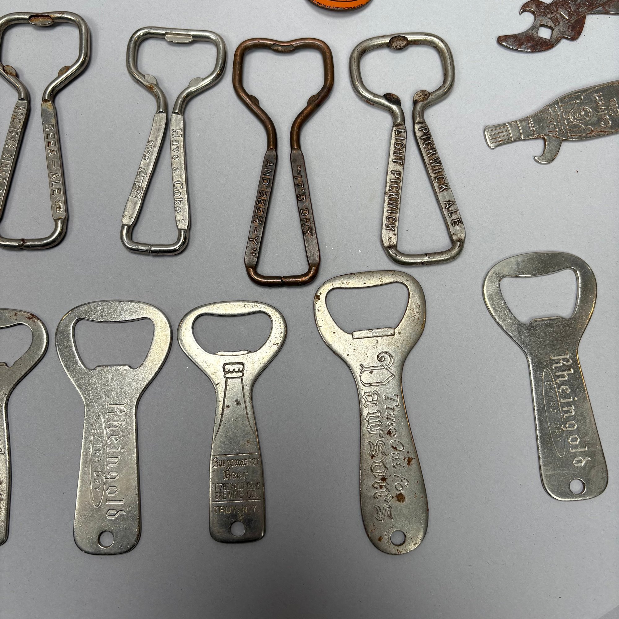 Collection of Eighty-Two Advertising Bottle Openers and Cork Screws, Various English, German and American Brewers and Distillers, 19th and 20th Century. Housed in a mahogany compass case.