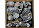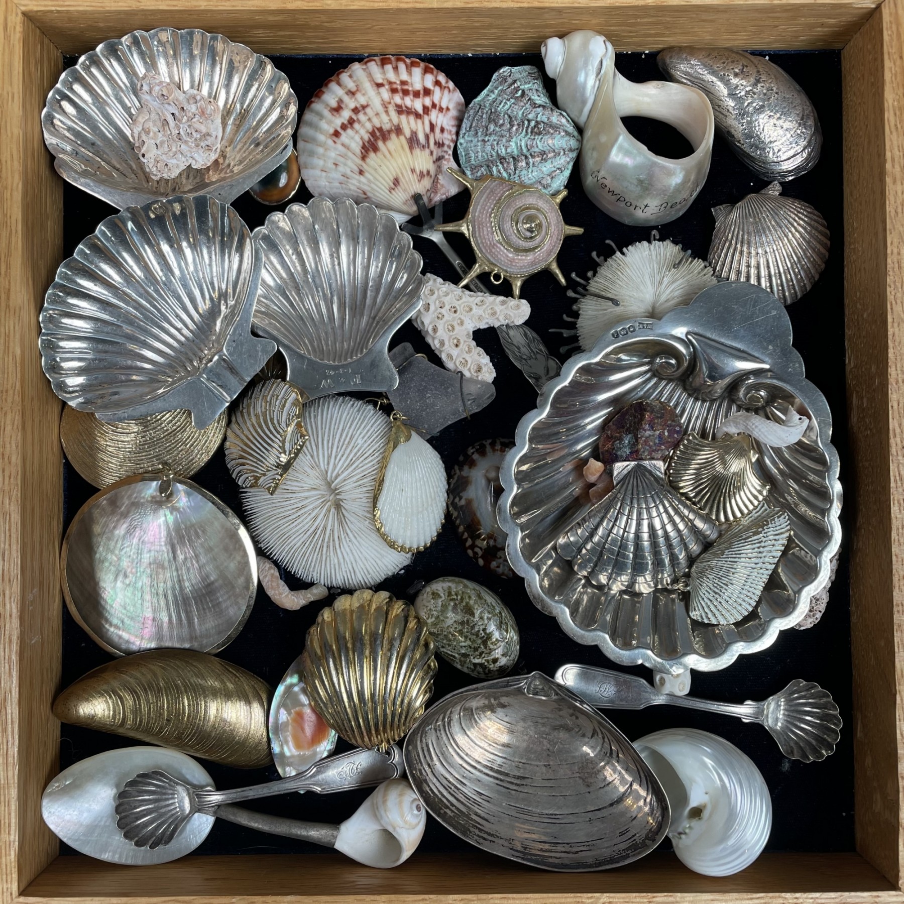 The silver comprising one large George V silver shell sweetmeat dish, Walker & Hall, Sheffield, 1921; a pair of Mexican silver ashtrays and one shell salt; a pair of George W. Welsh 'Fiddle Thread' salt spoons with shell bowls; a Wallace clam shell; a JH Breakell silver mussel shell brooch; a Heidi Studio Handwrought shell brooch; the remaining specimen shells and decorative objects.
