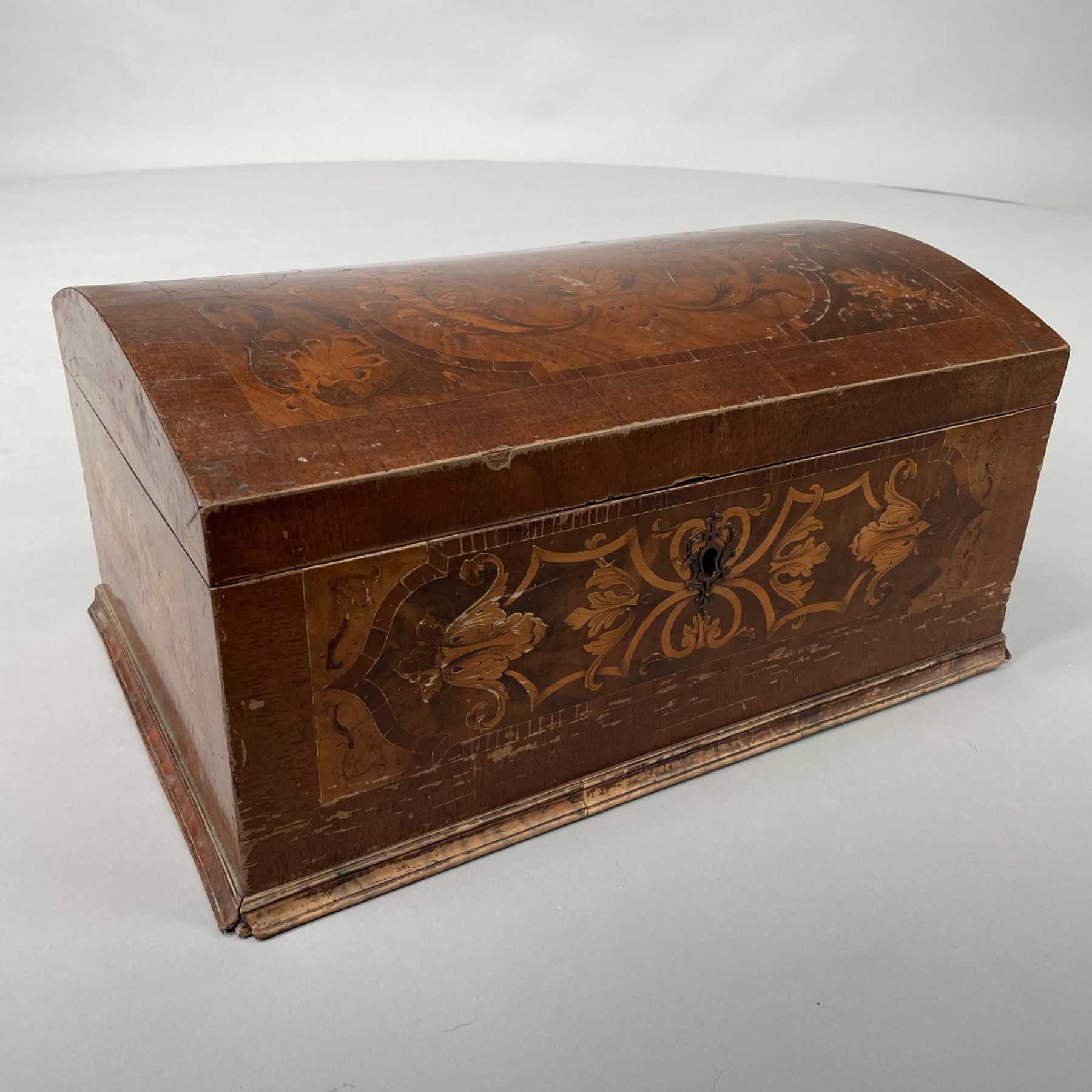 Decorated with foliate and scroll inlaid panels above a molded base.