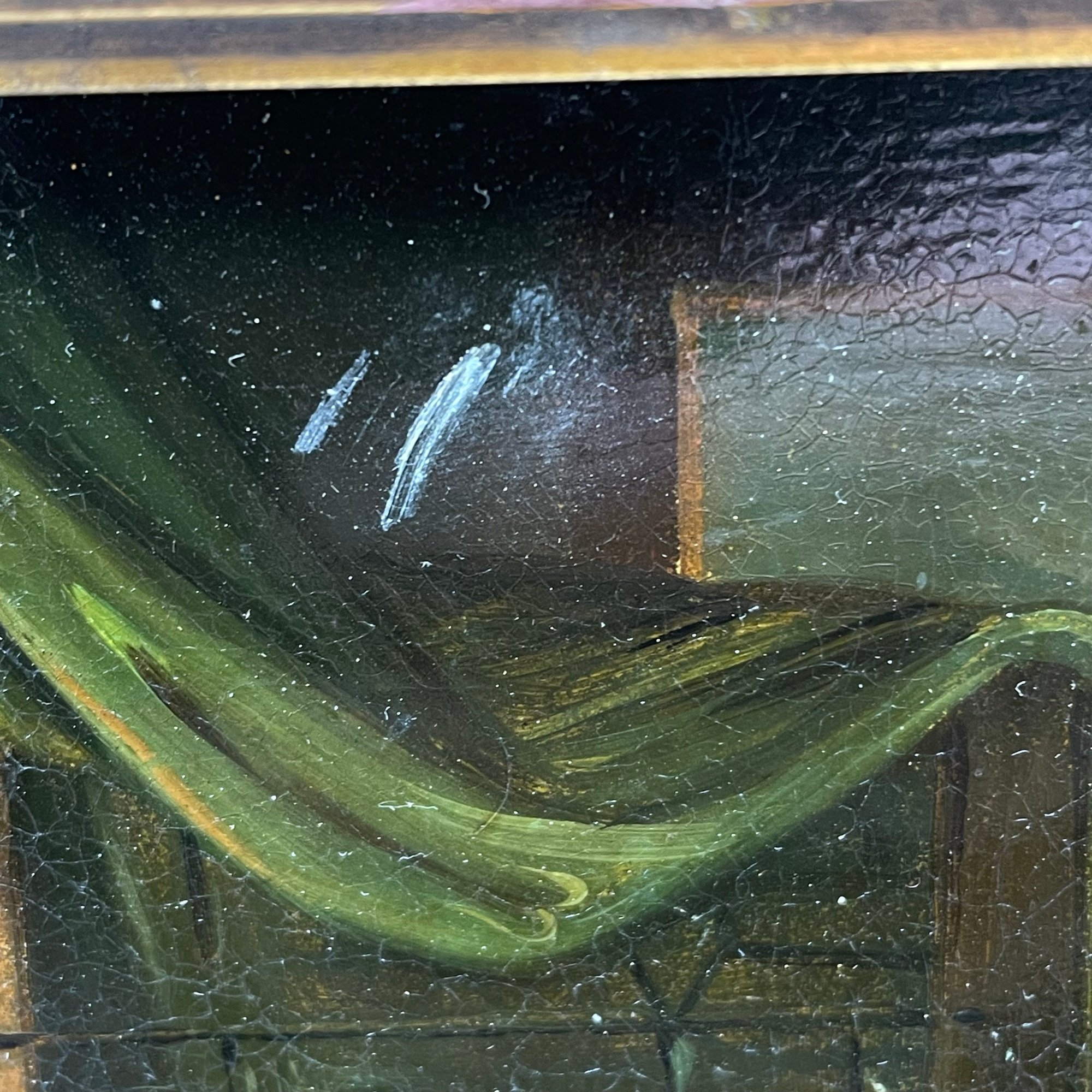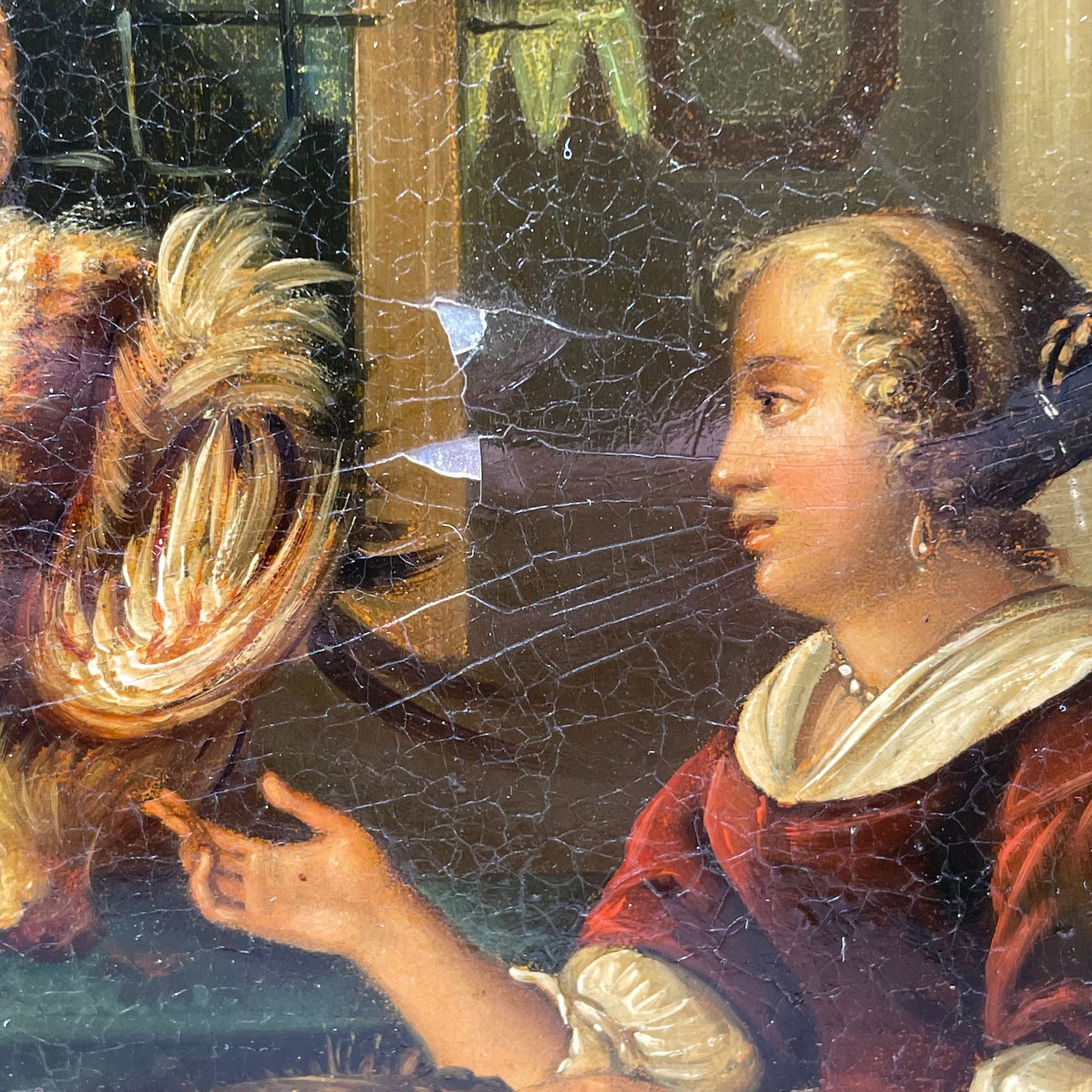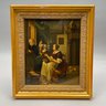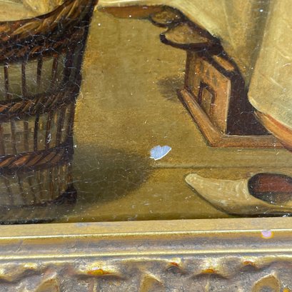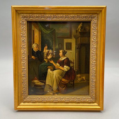 Continental School. Painting on Tin, Mid-Nineteenth Century. Depicting a woman wearing a kerchief and handing a chicken through the window to a woman seated at a table, a terrier watching from behind her chair, (9.25 x 7.75 inches, sight).