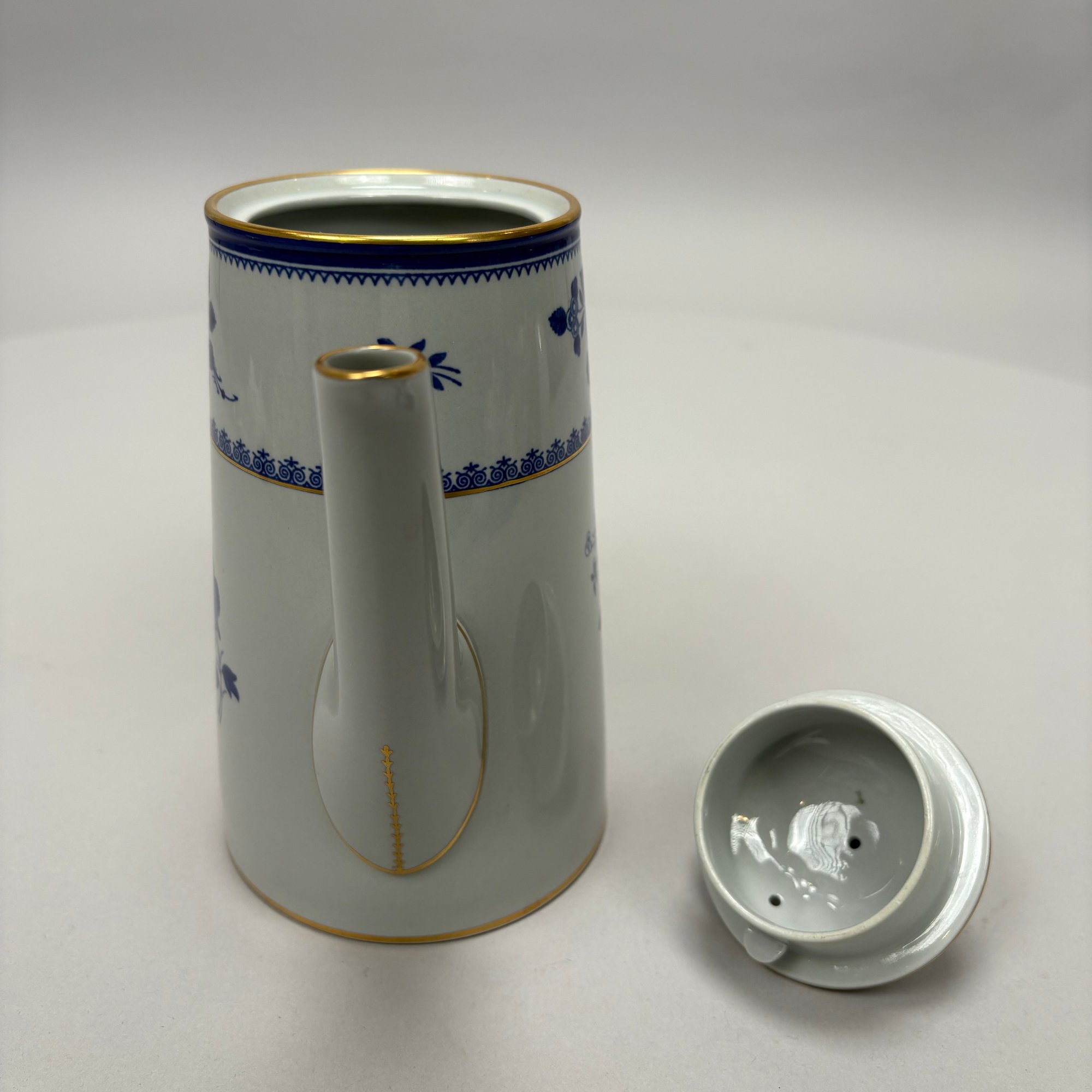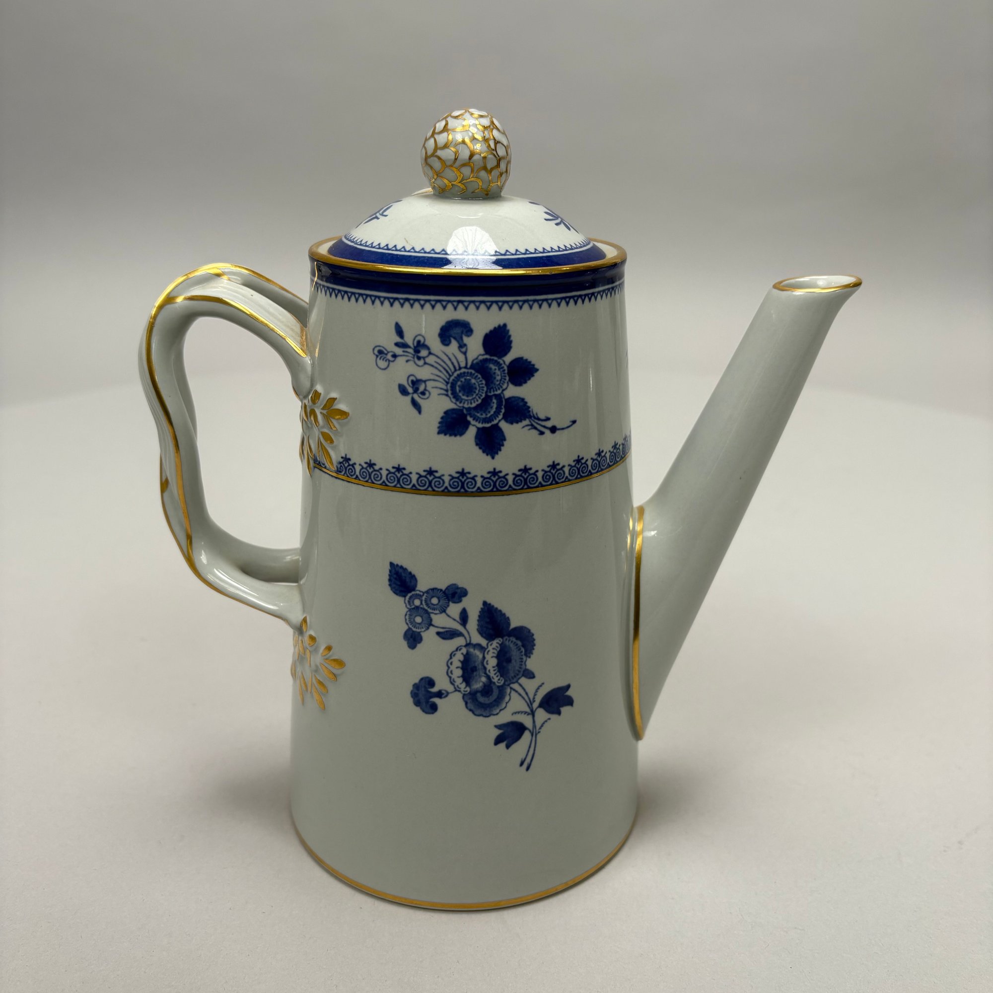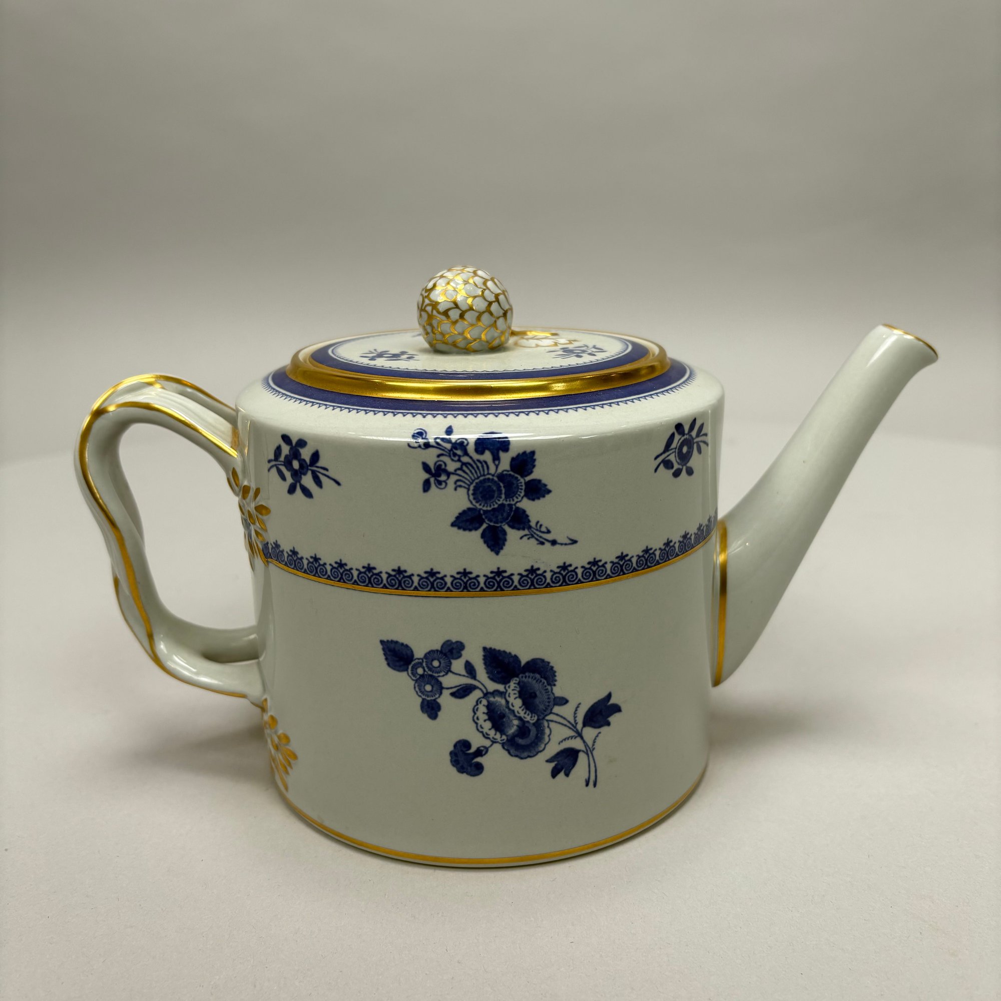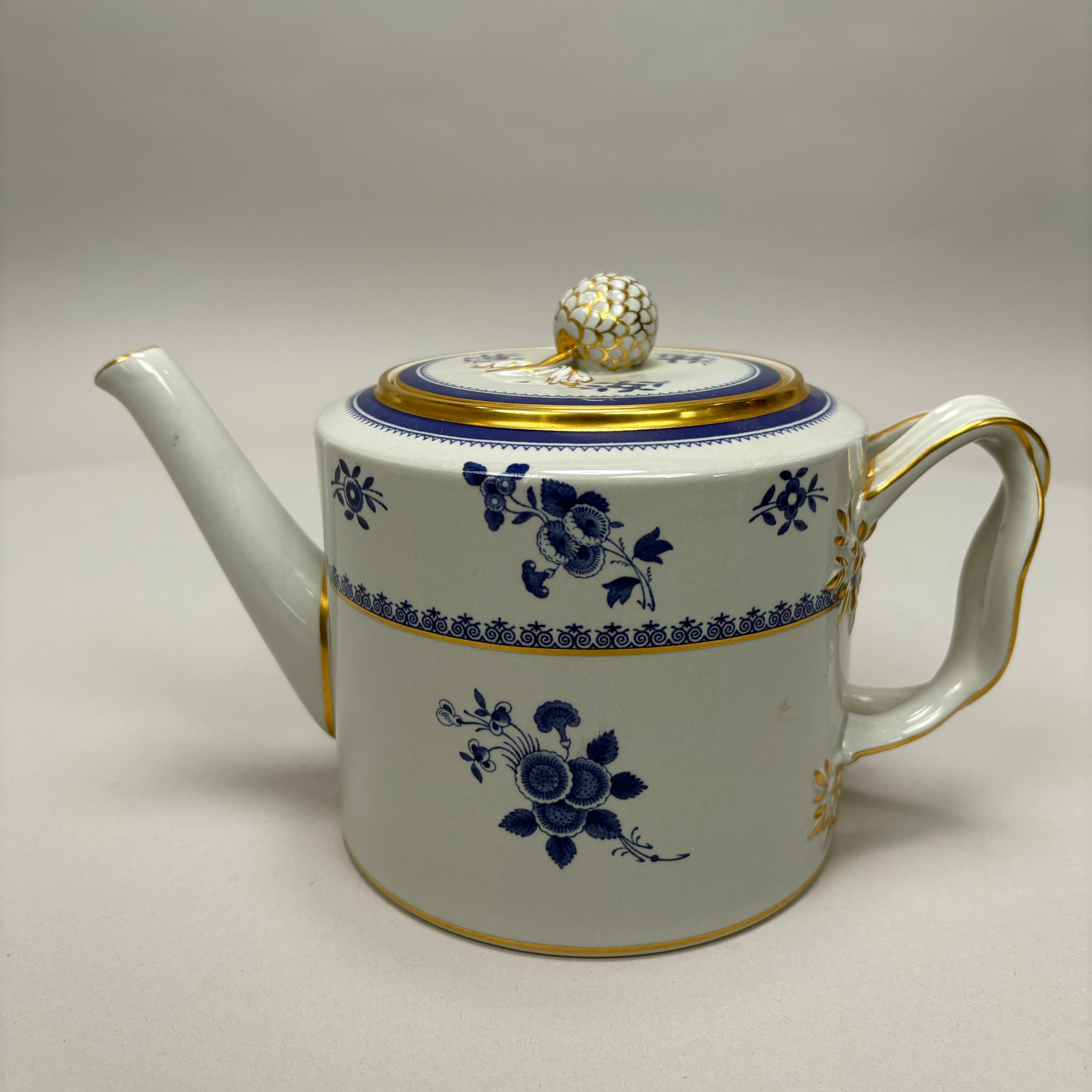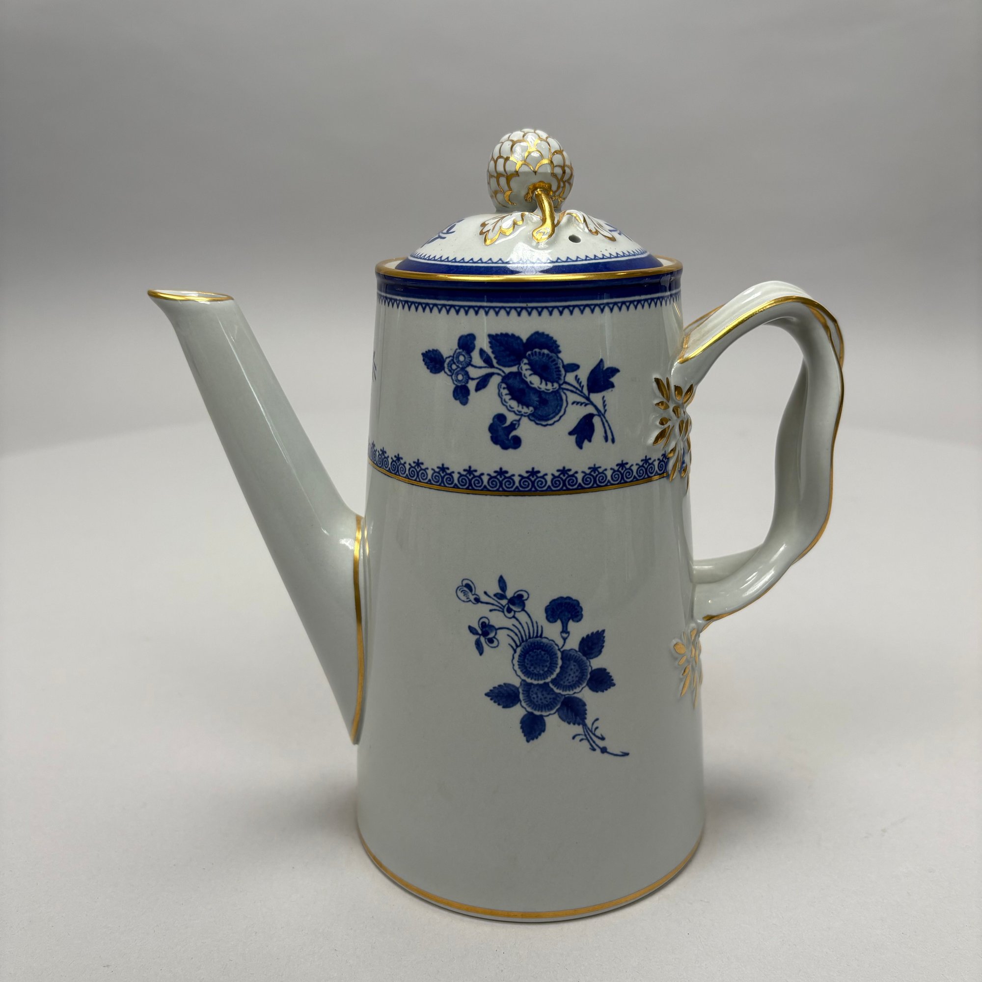 Copeland Spode Blue 'Spode's Gloucester' Tea and Coffee Service, 20th Century. Comprising a lighthouse-form coffeepot, drum-form teapot, sugar bowl and helmet- form cream jug, each marked "COPELAND SPODE/ Stone Lowestoft Style/ Contemporary/ ENGLAND/ SPODE'S GLOUCESTER," pattern "42649" in iron-red.