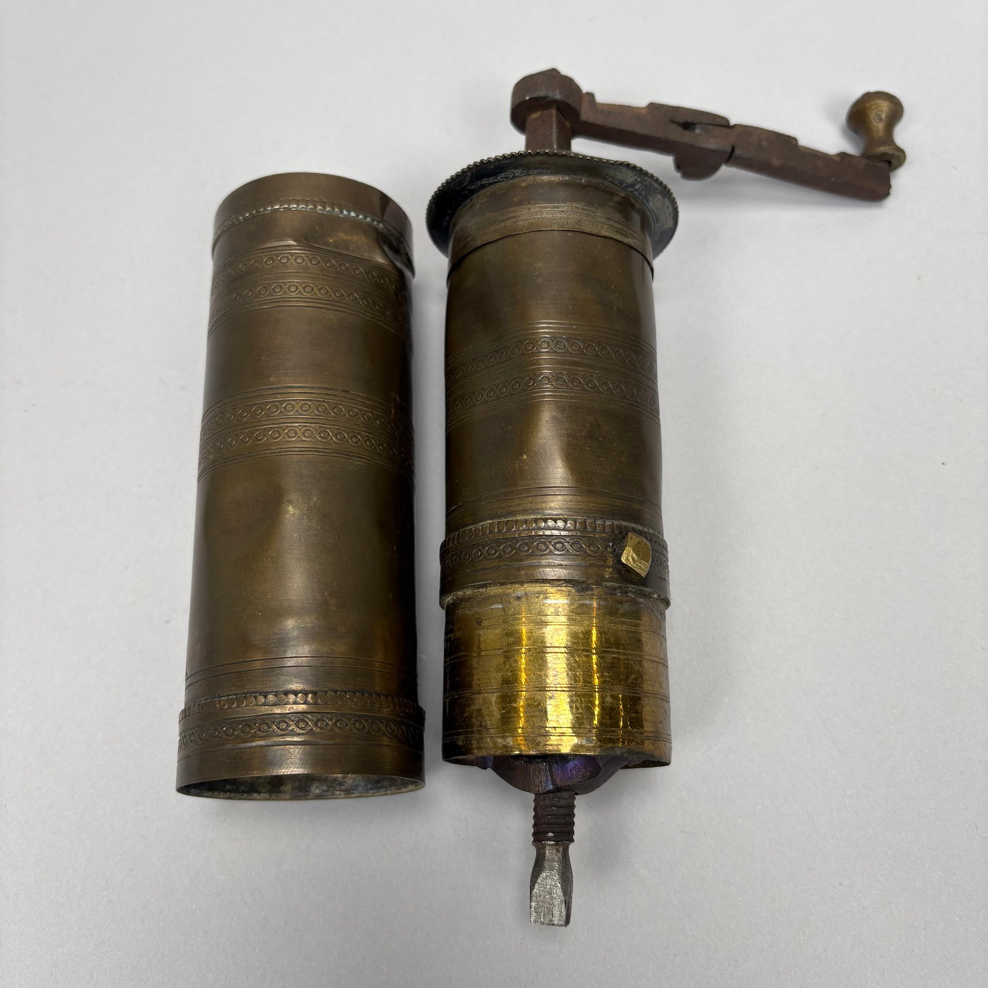 Copper and Brass Coal Skuttle/ Hod and a Persian Brass Spice/ Coffee Grinder.