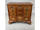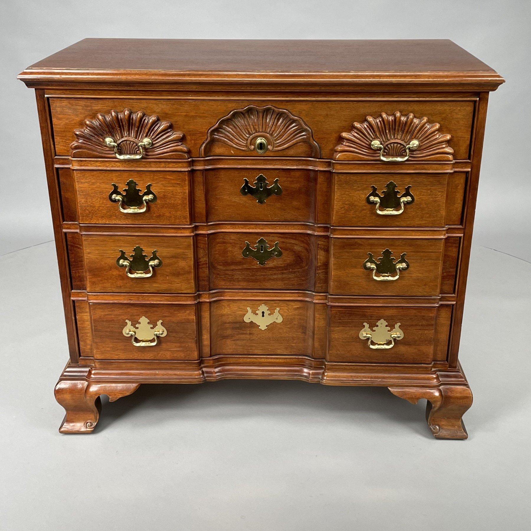 In the manner of Goddard-Townsend, the oblong top with molded edge above a case of four blocked front drawers, the top shell-carved, above a molded base and raised on ogee bracket feet.