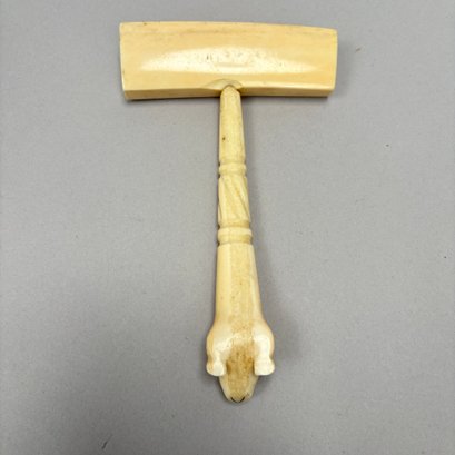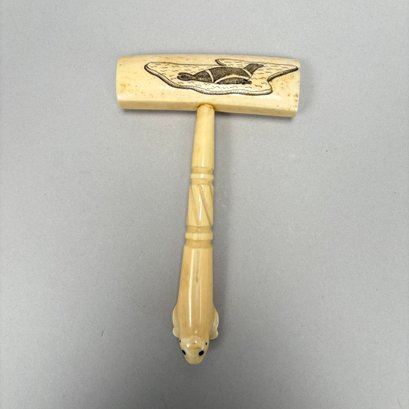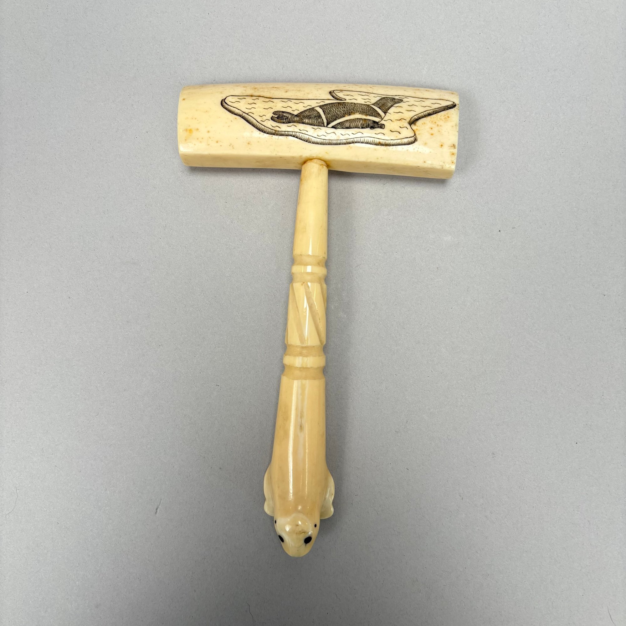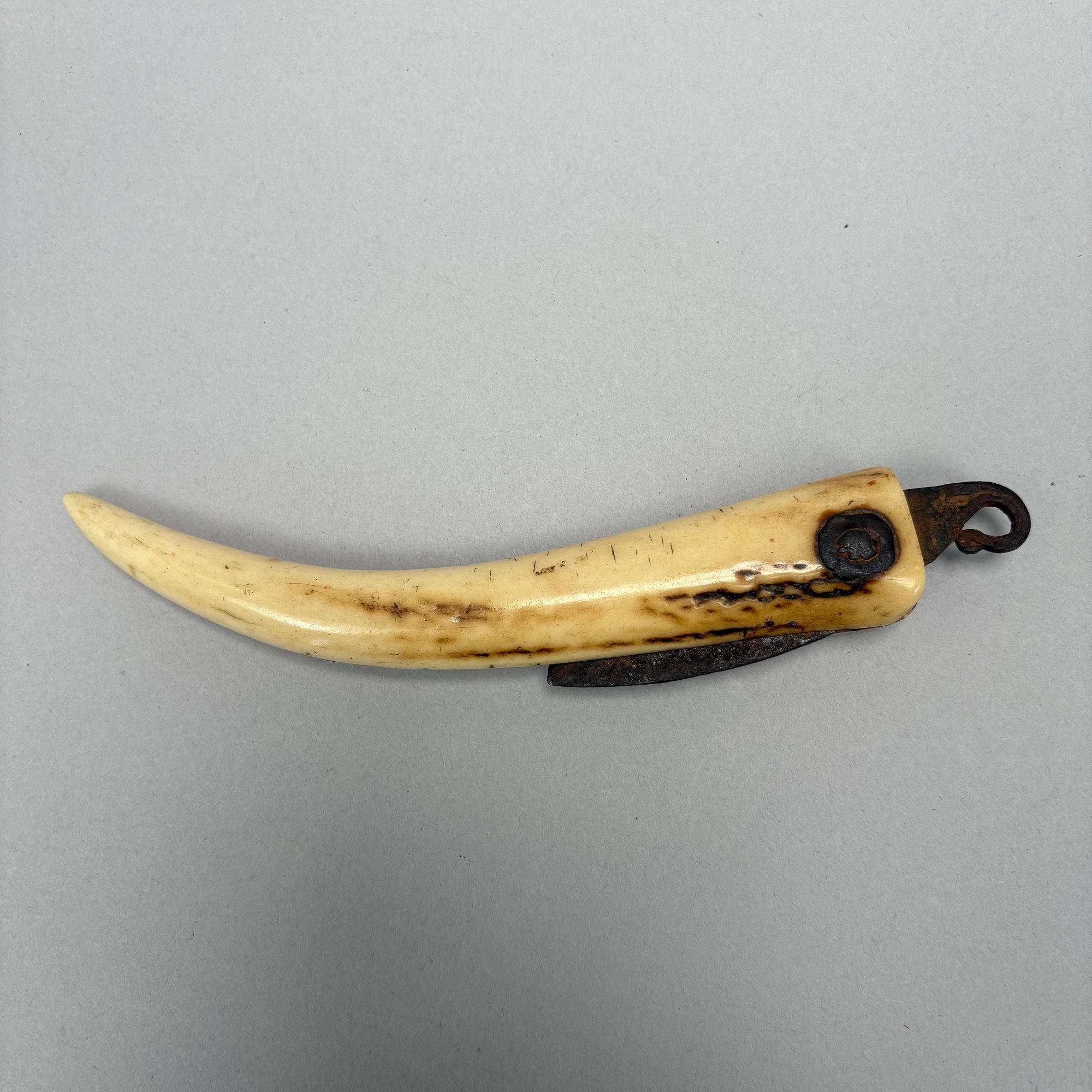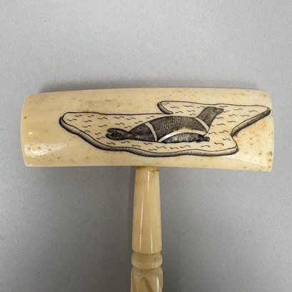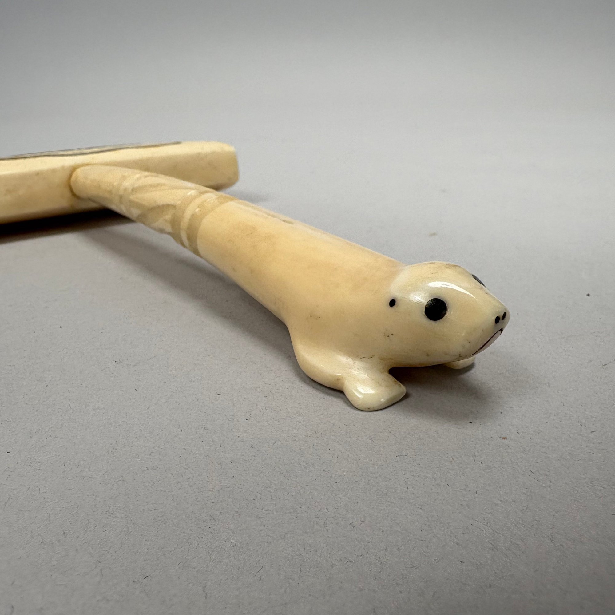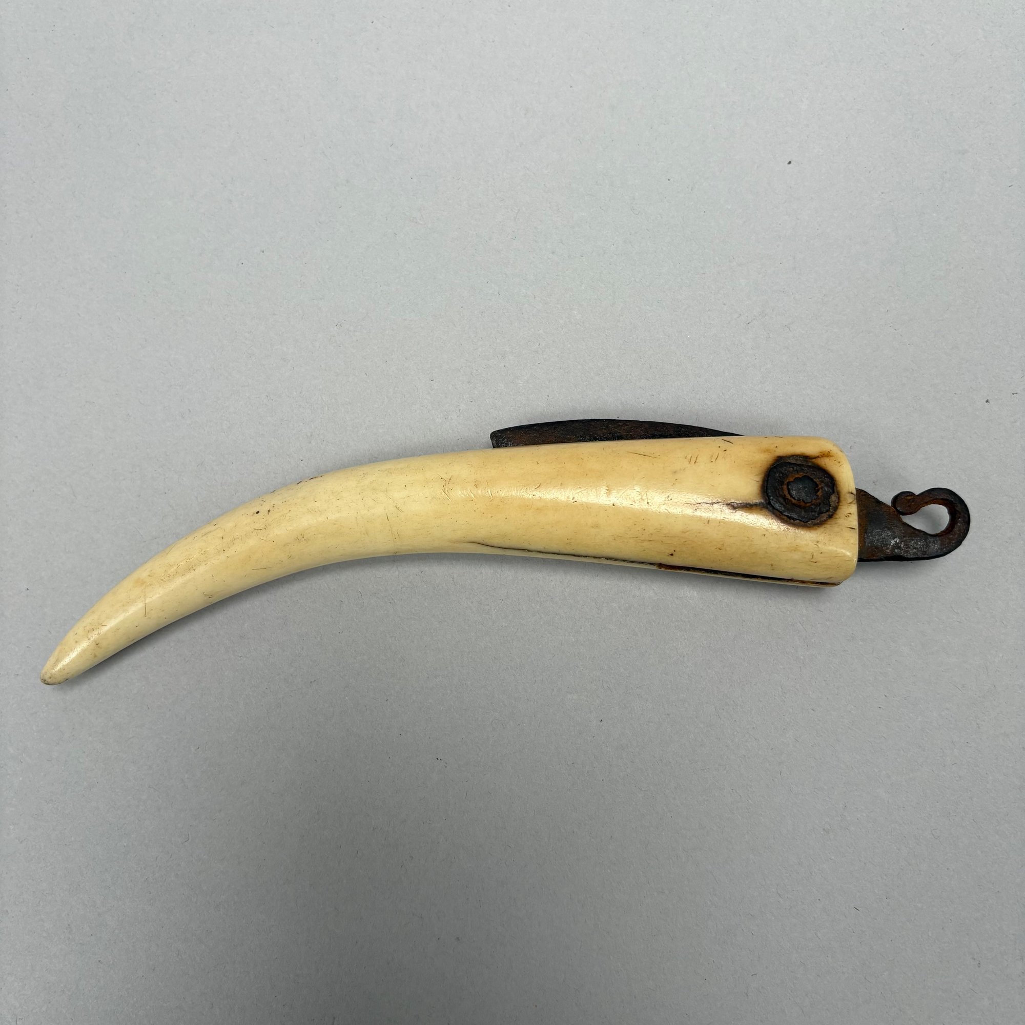 Deer Antler Fid Inset with a Folding Knife, and a Scrimshaw Seam Rubber. The seam rubber engraved with a seal resting on an ice floe, the handle carved with a seal terminal.