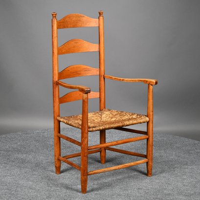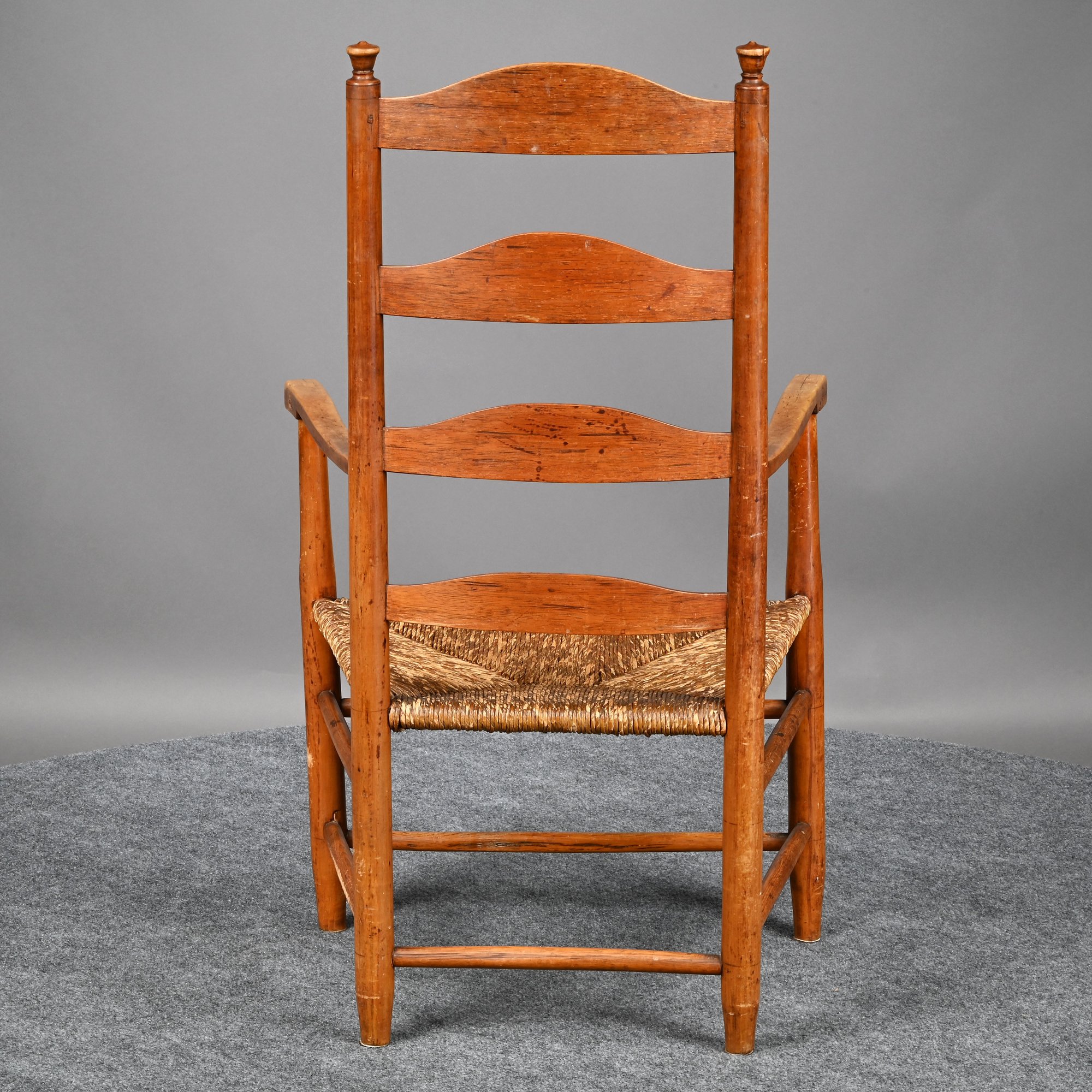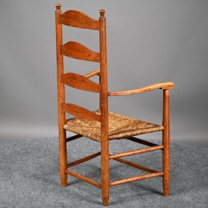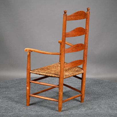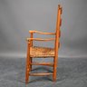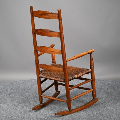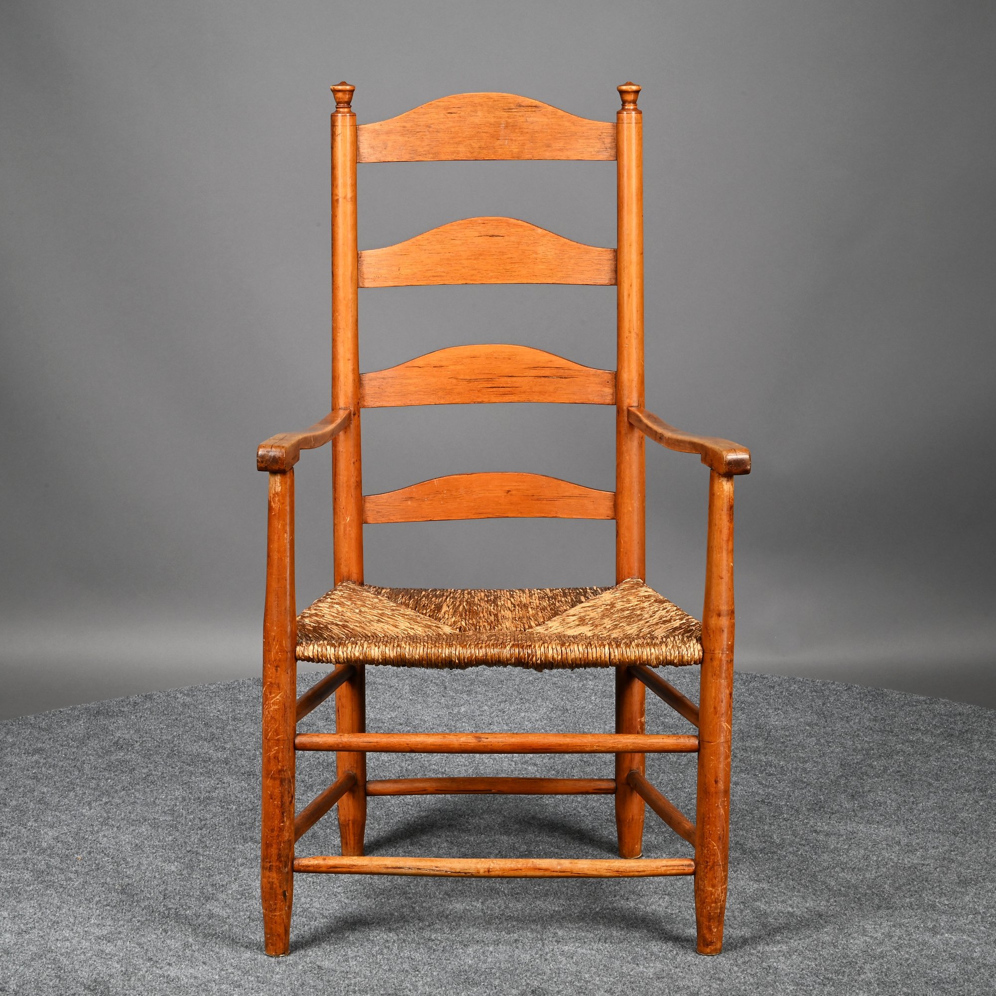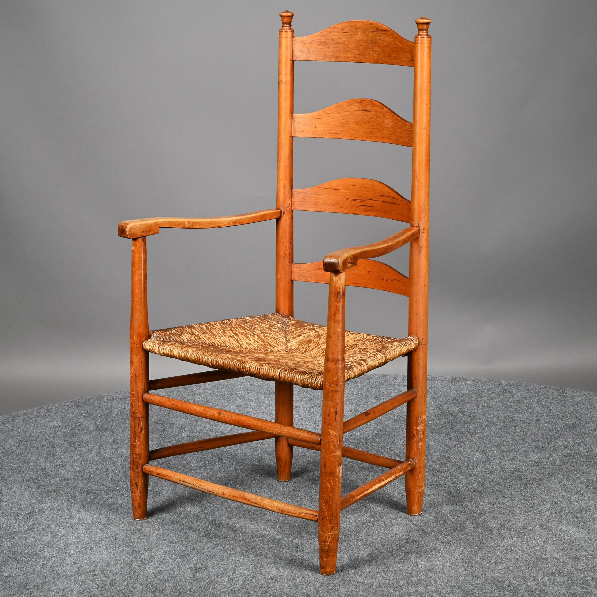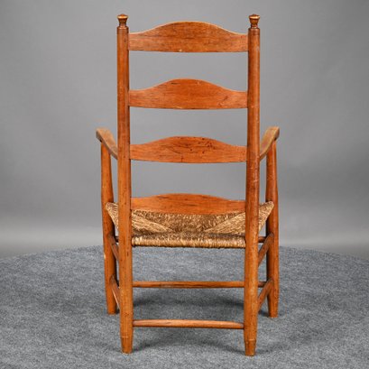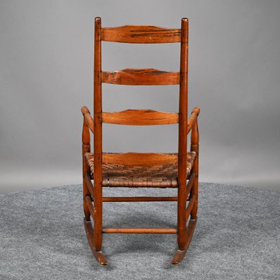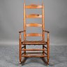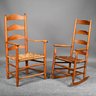 Delaware River Valley Ladderback Armchair and a Ladderback Rocking Chair. The armchair with four arched splats and turned tapered circular finials, above a rush seat; the rocking chair with woven splint seat.