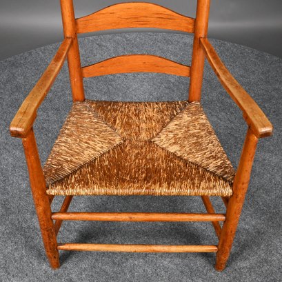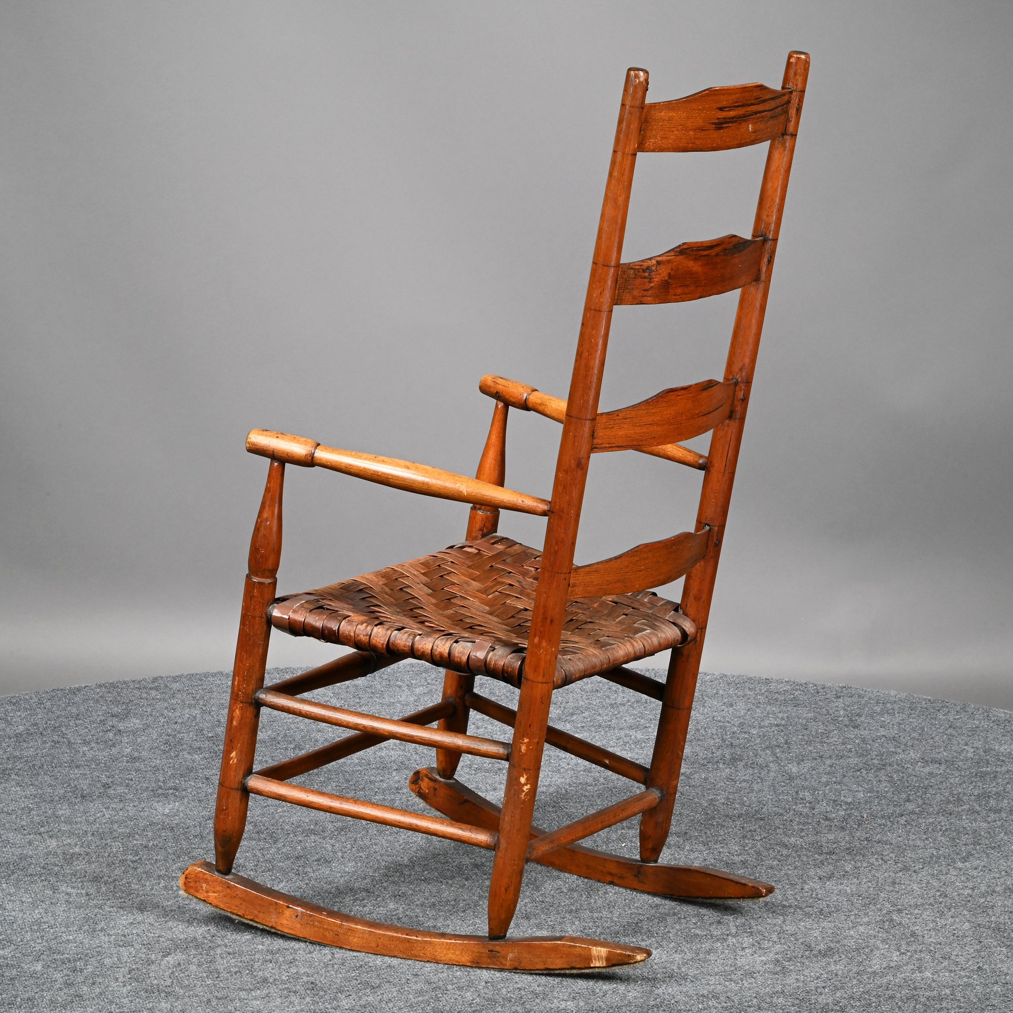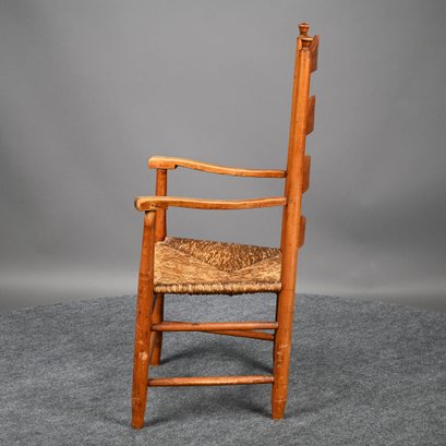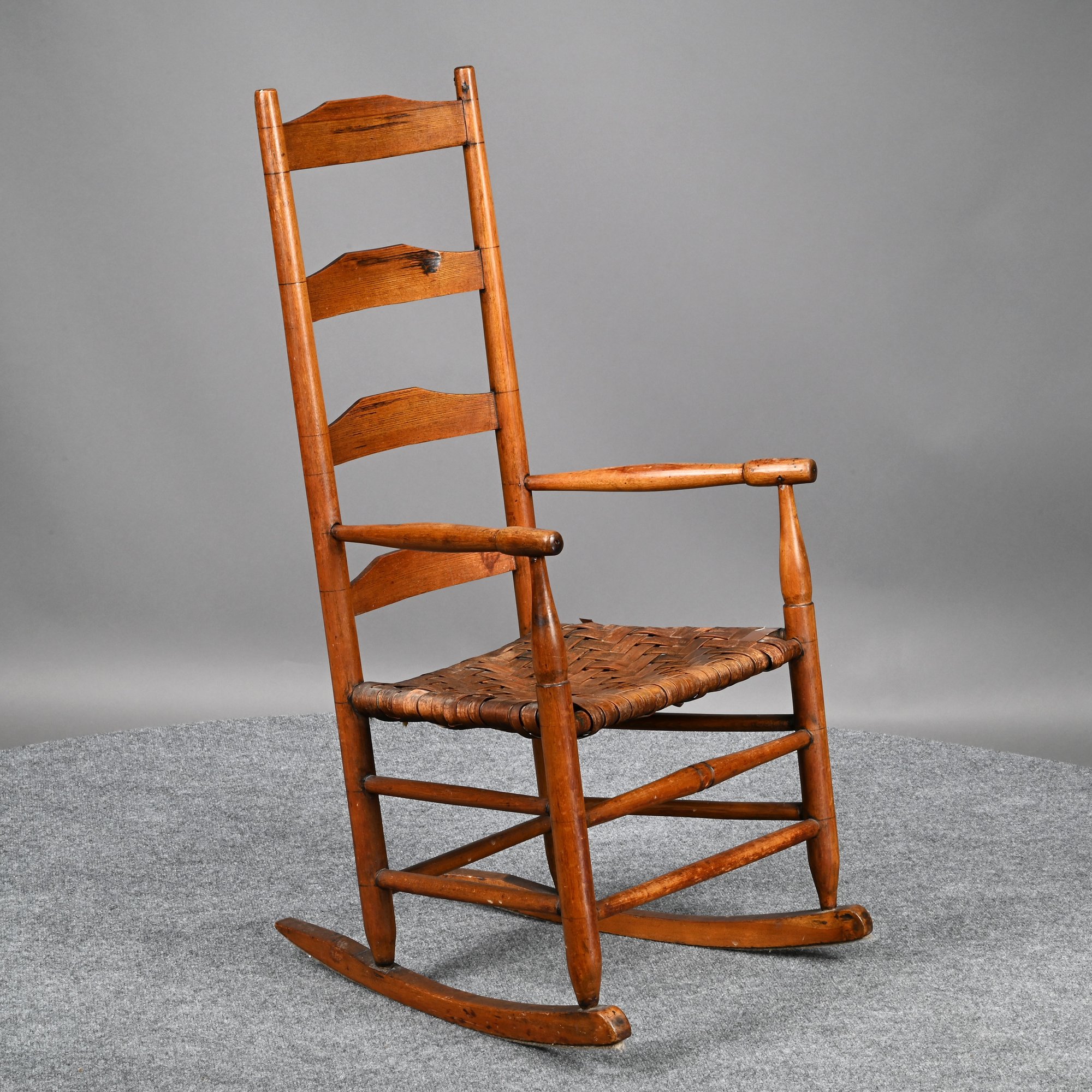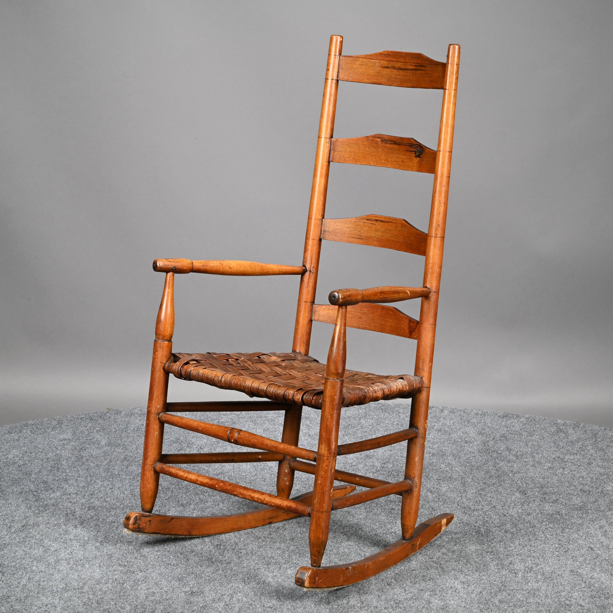 Delaware River Valley Ladderback Armchair and a Ladderback Rocking Chair. The armchair with four arched splats and turned tapered circular finials, above a rush seat; the rocking chair with woven splint seat.