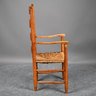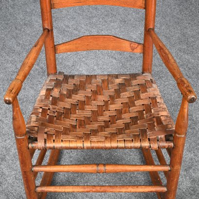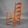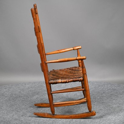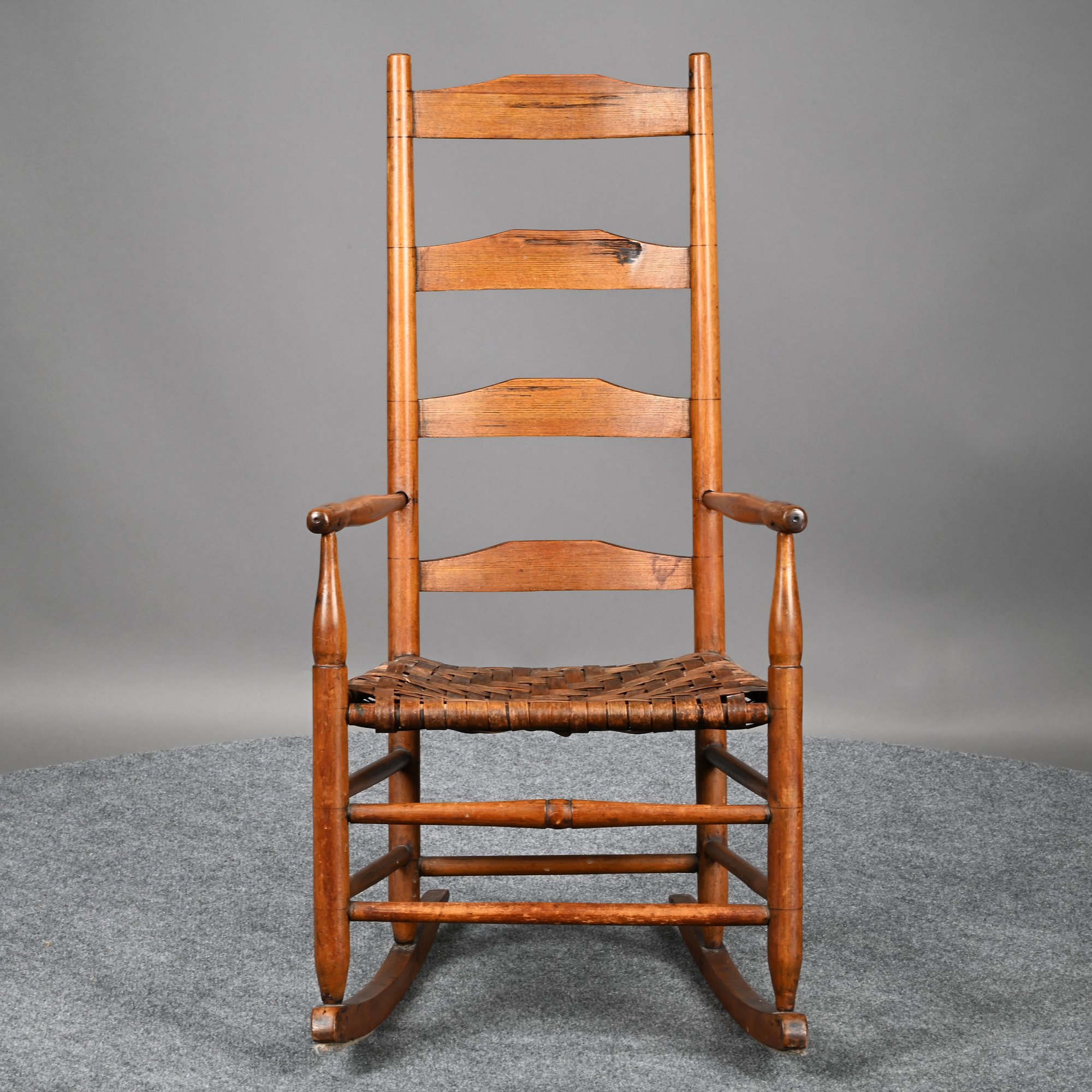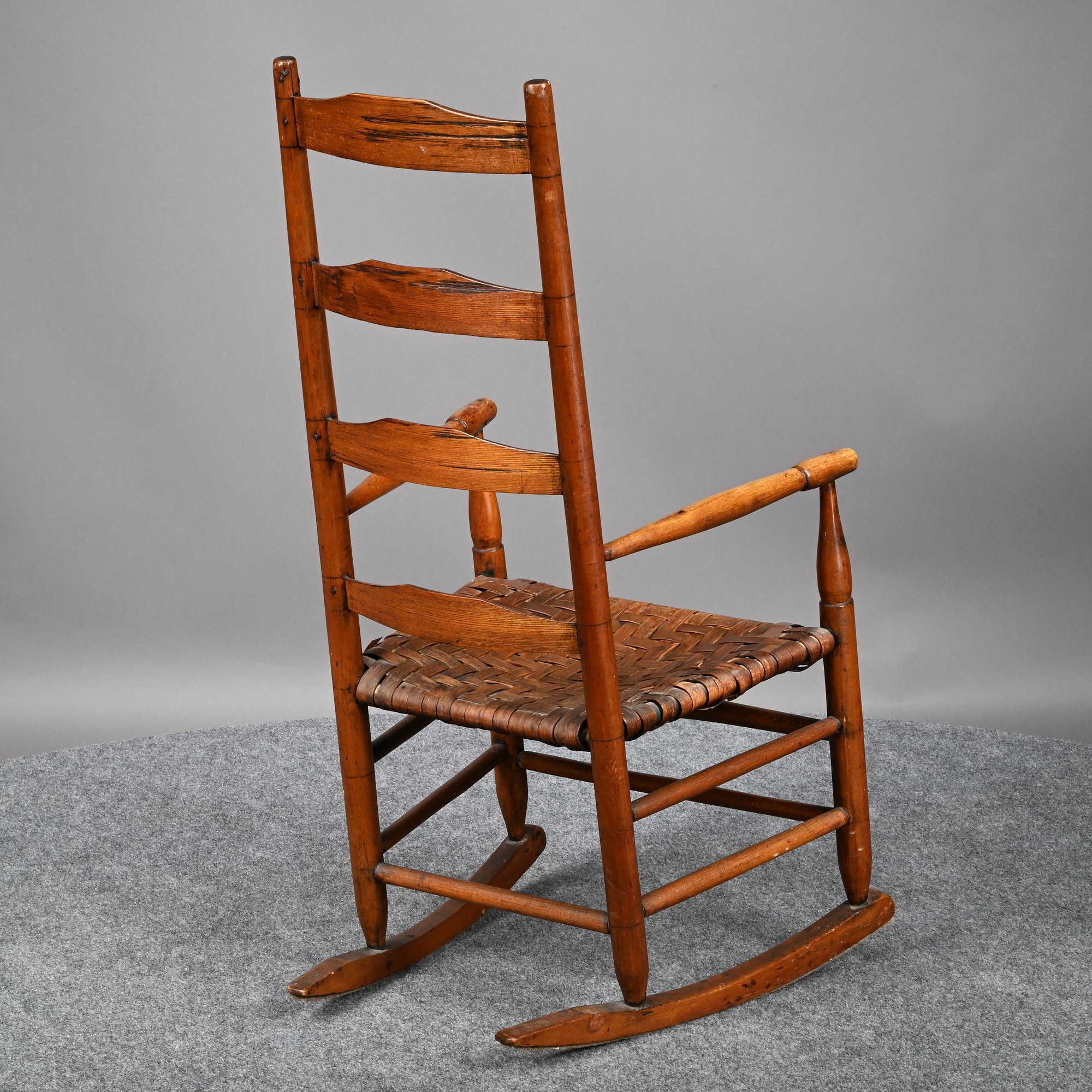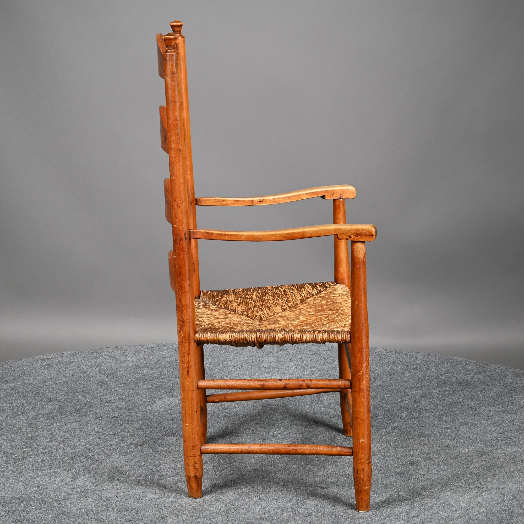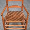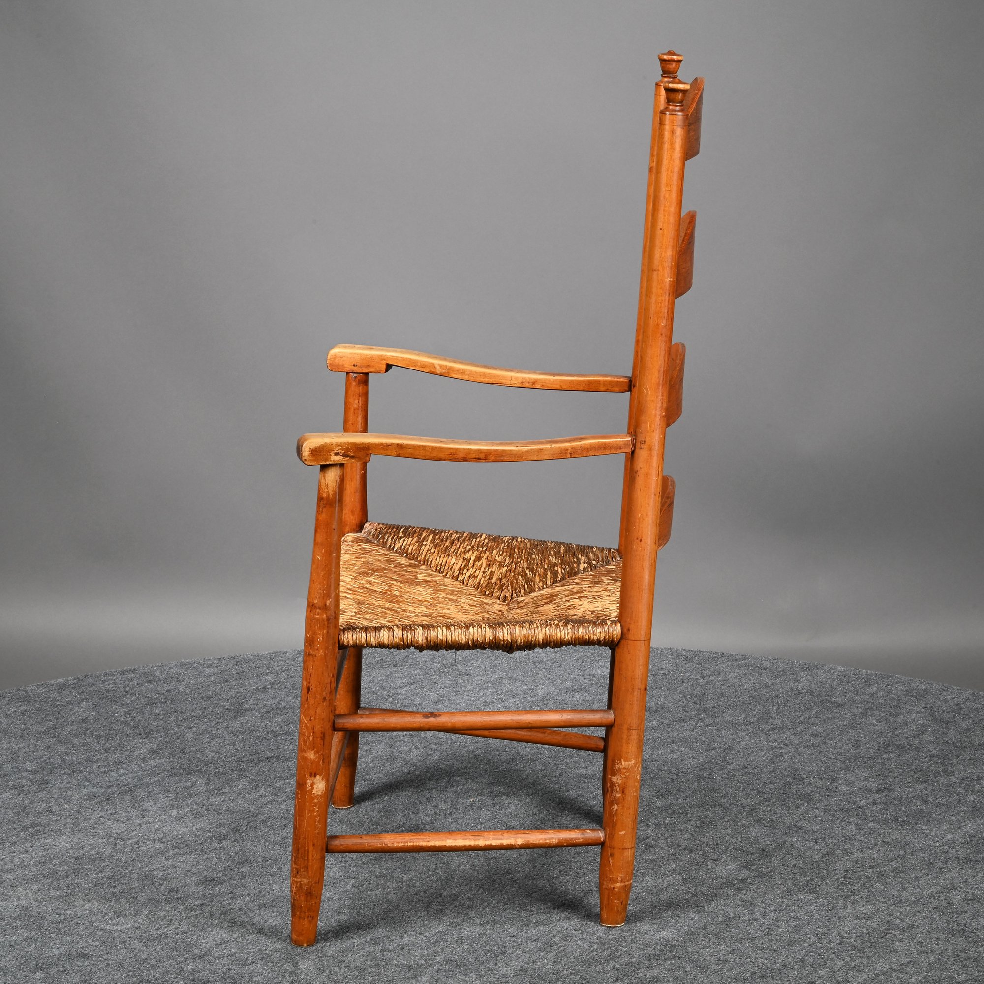 Delaware River Valley Ladderback Armchair and a Ladderback Rocking Chair. The armchair with four arched splats and turned tapered circular finials, above a rush seat; the rocking chair with woven splint seat.