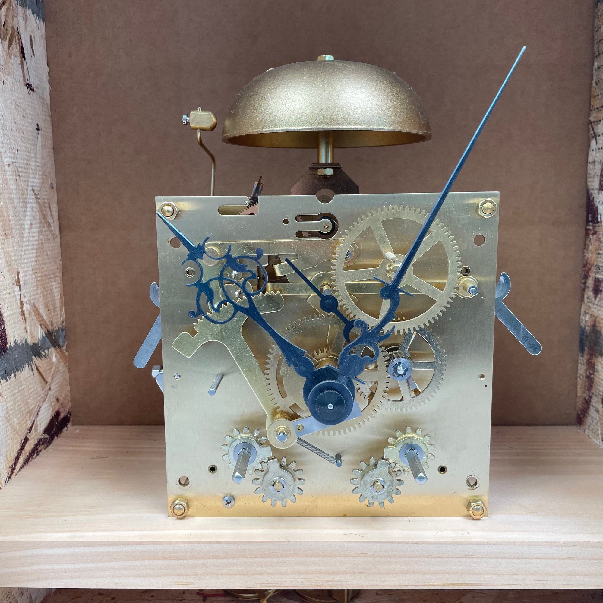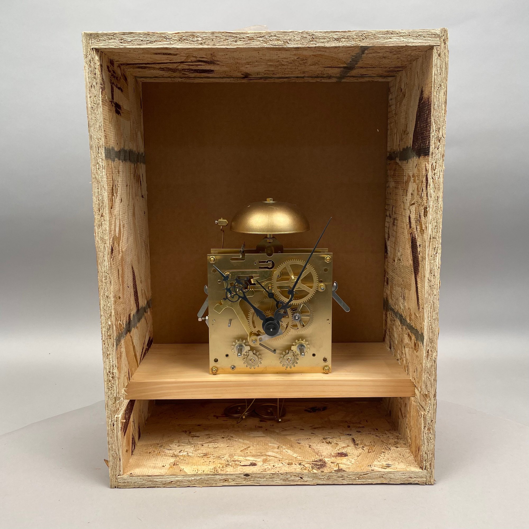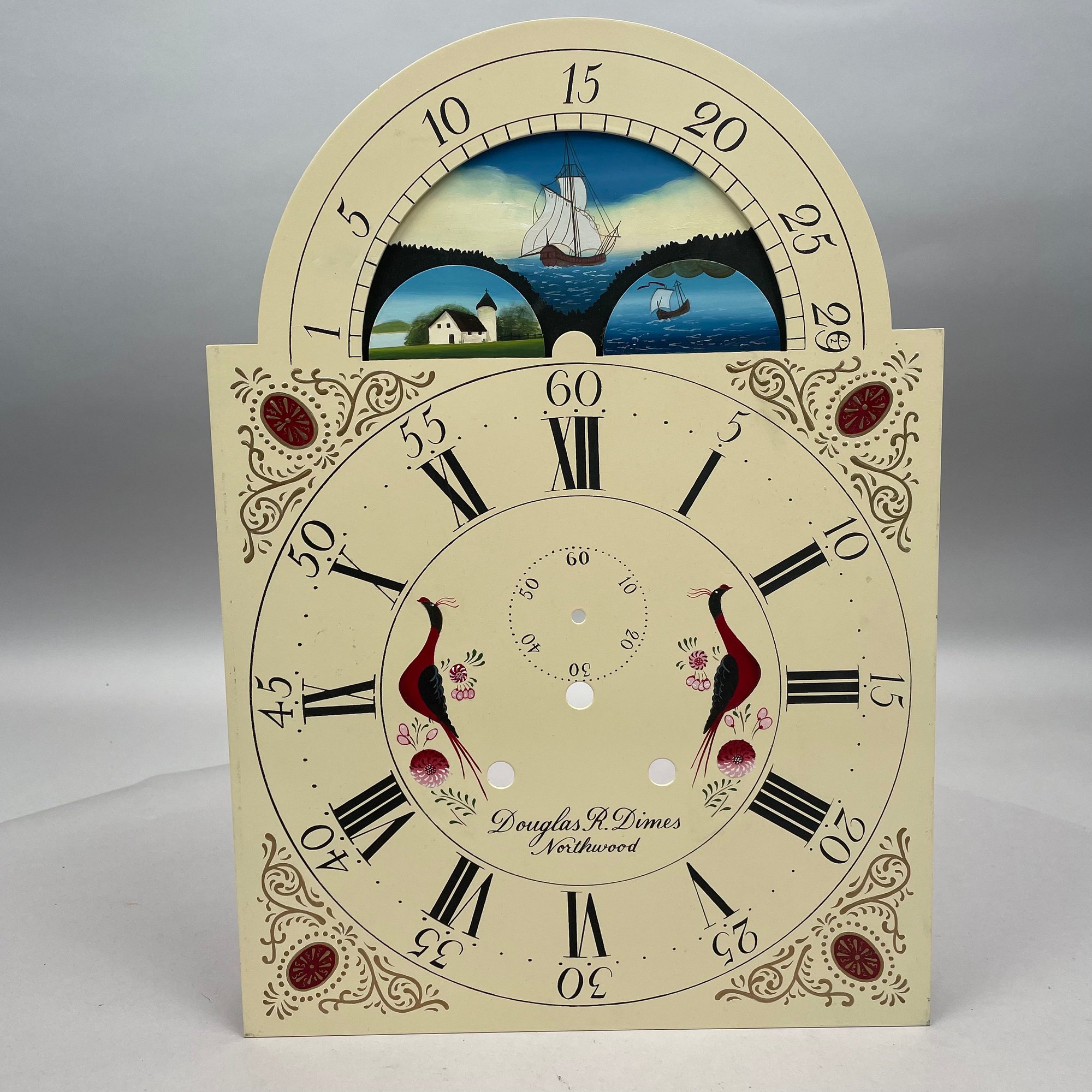 Douglas R. Dimes Tall Case Clock Movement and Dials. For a Chippendale style clock, the clock face signed "Douglas R. Dimes/ Northwood," the clock face and moon phases dial signed "Catherine Green 6/2018," with pendulum, weights and two winding keys.