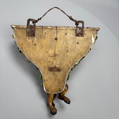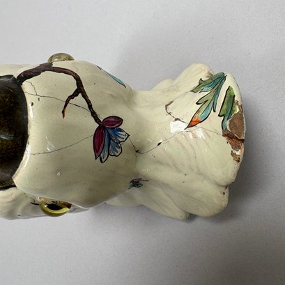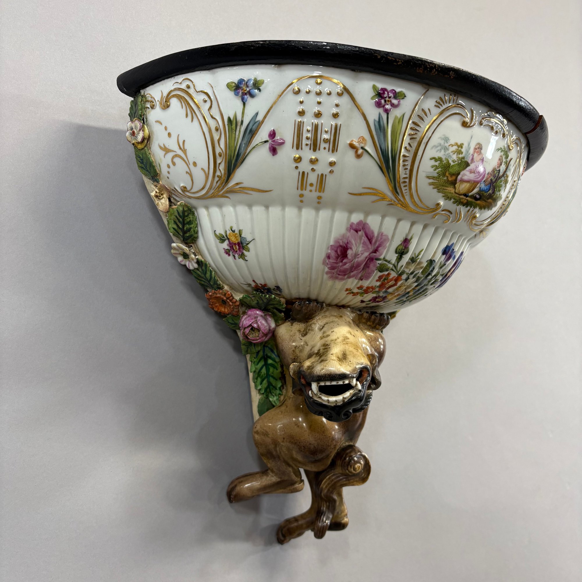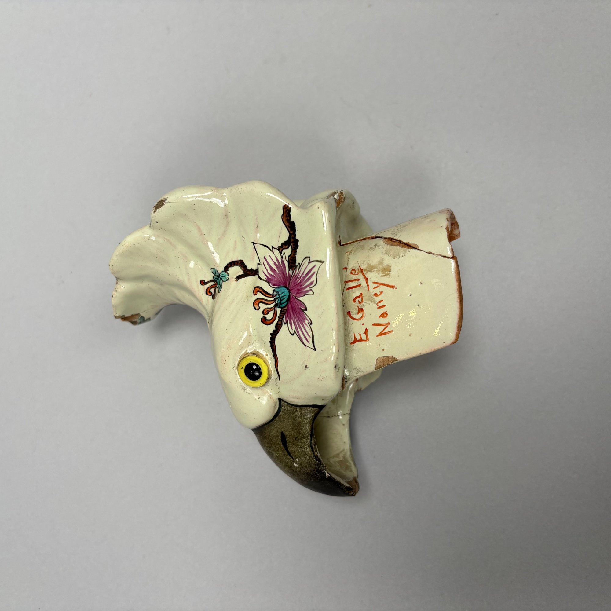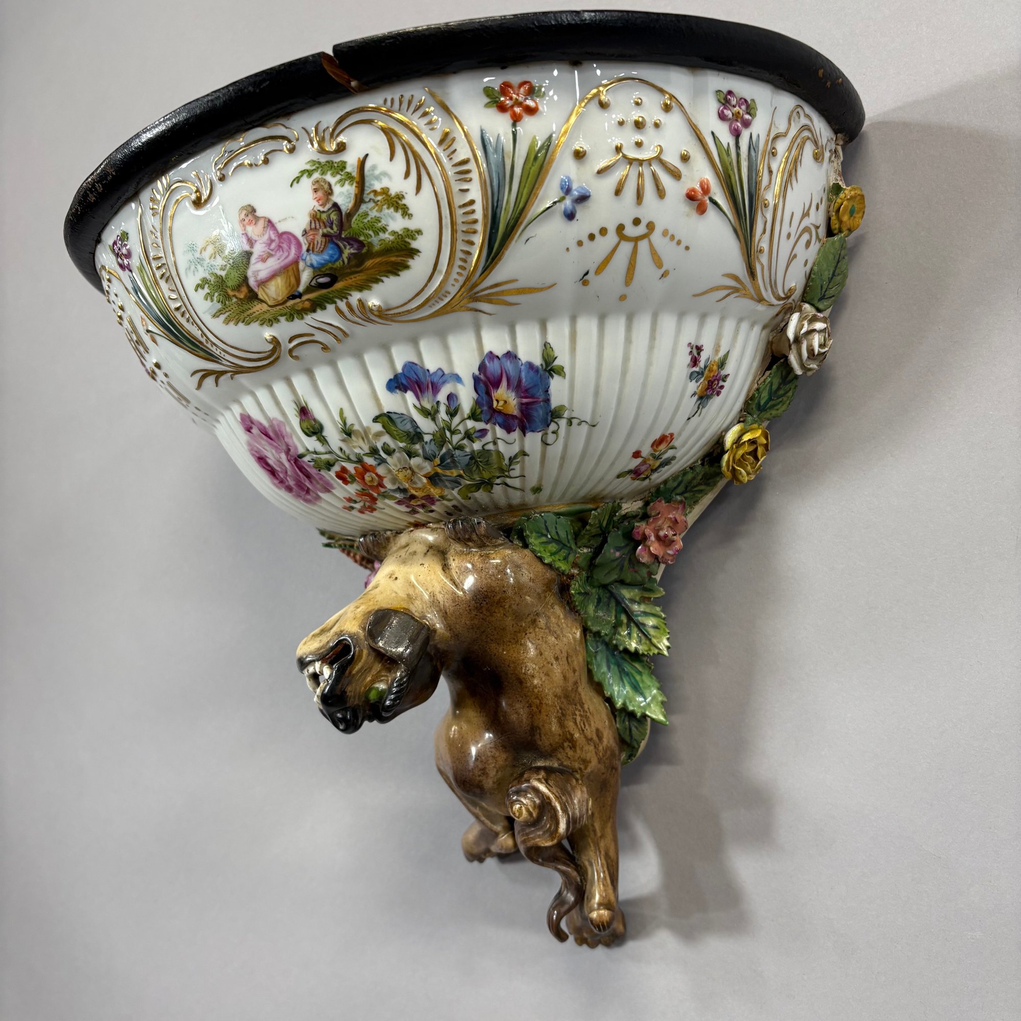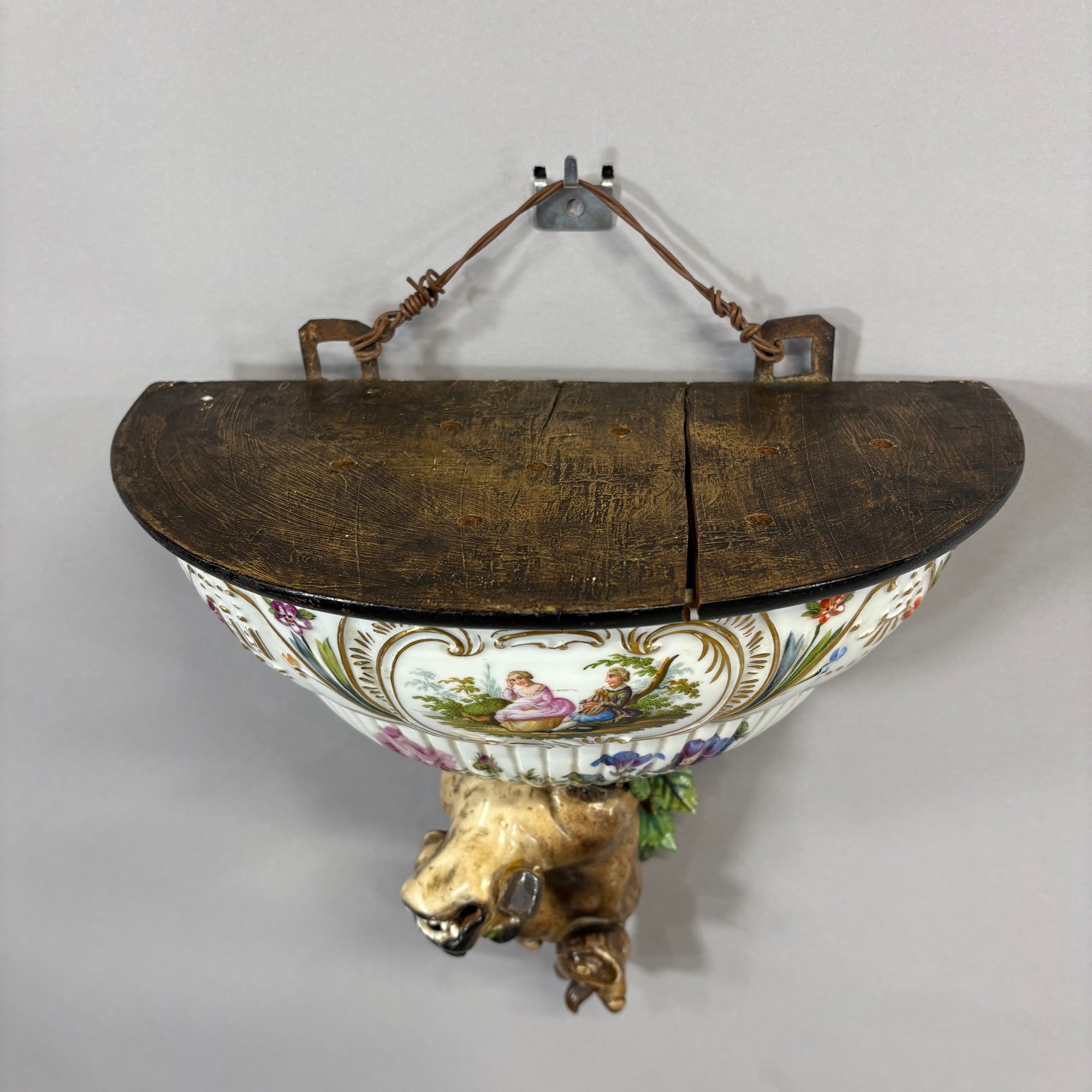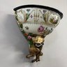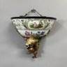 Dresden Porcelain Wall Shelf and an Emile Galle Faience 'Cockatoo' Jug, Both Circa 1880. The wall shelf painted with a courting couple within a cartouche above a floral spray, applied flower and leaf borders and Foo dog pendant; the pitcher painted with scattered birds perched upon branches and flowering branches, signed "E. Galle/ Nancy."