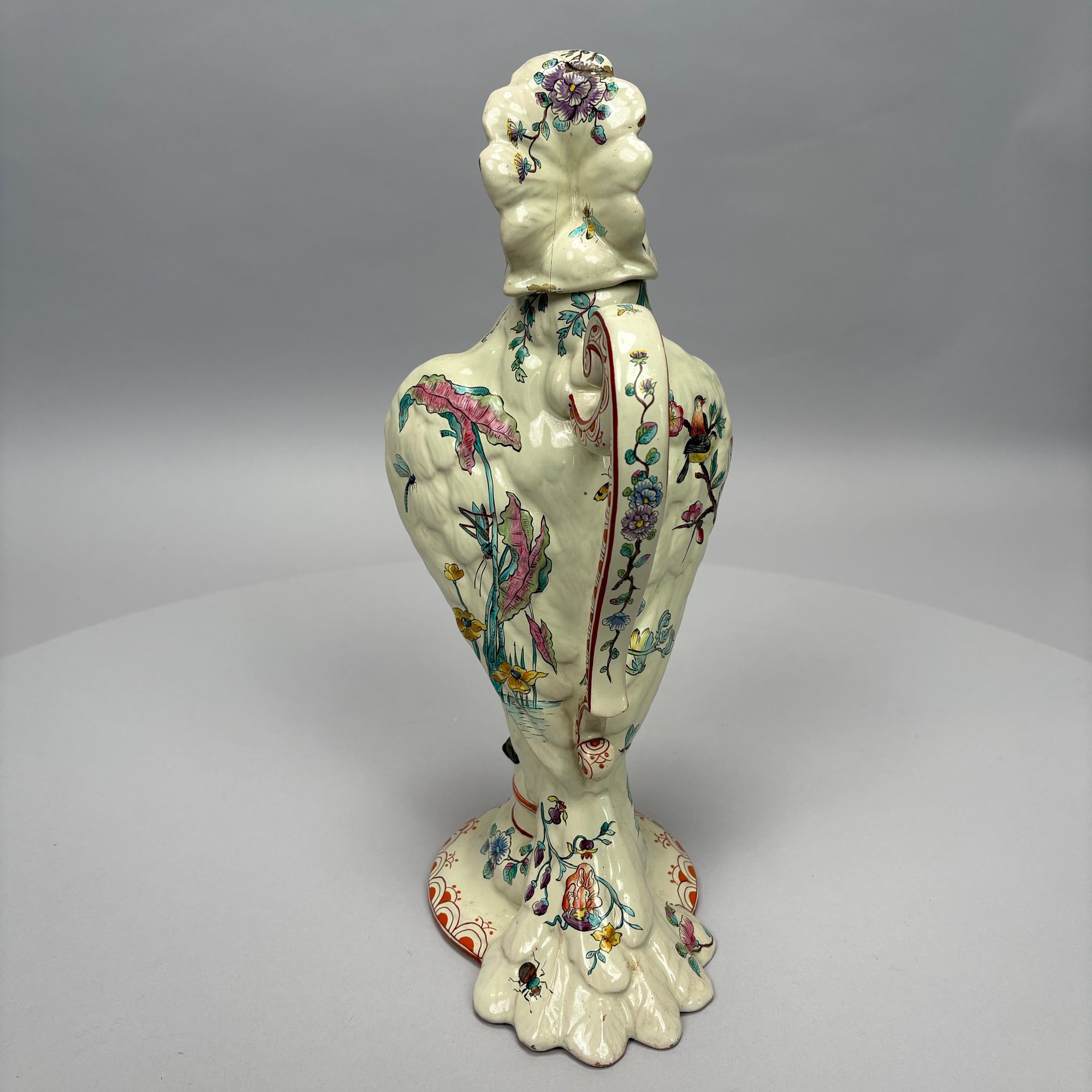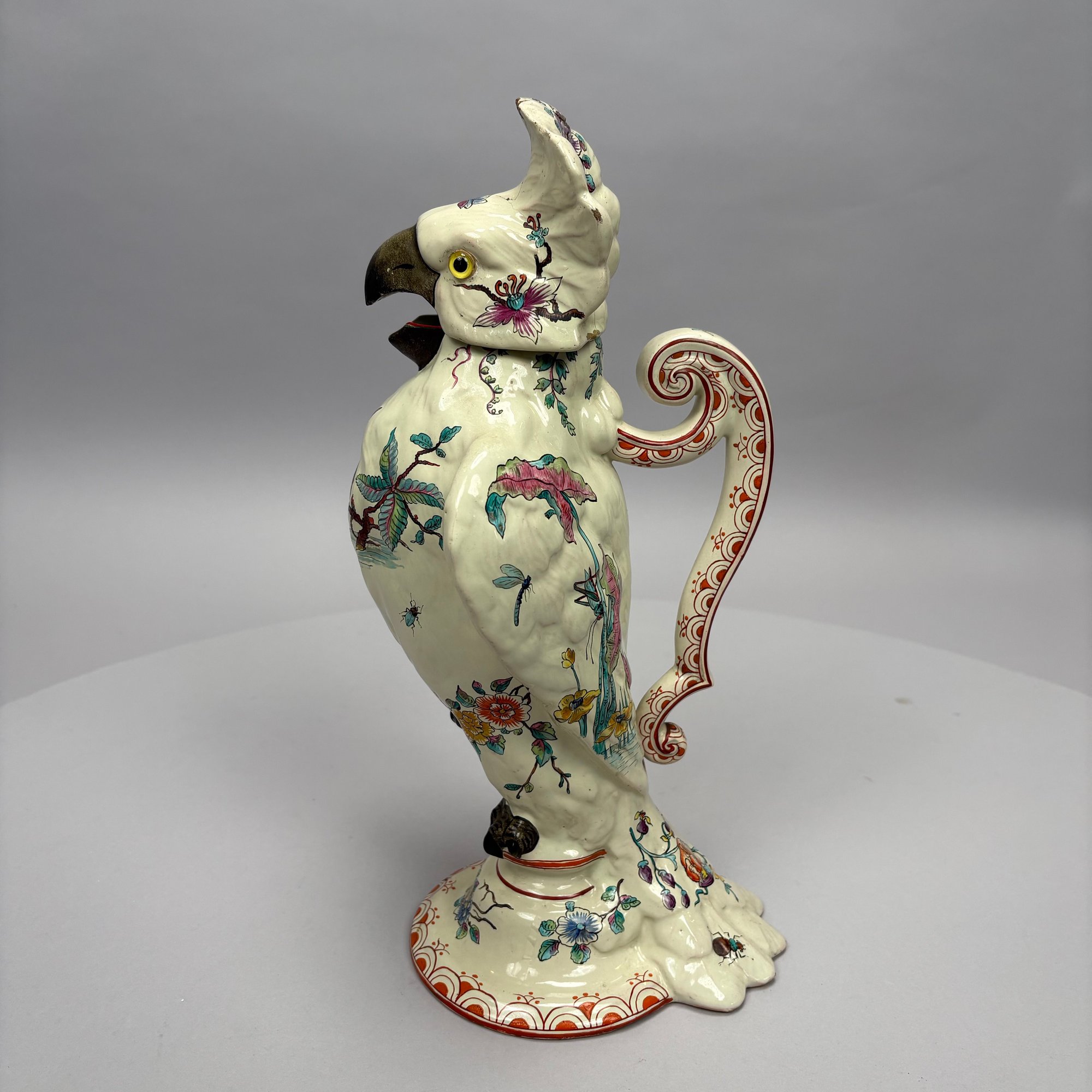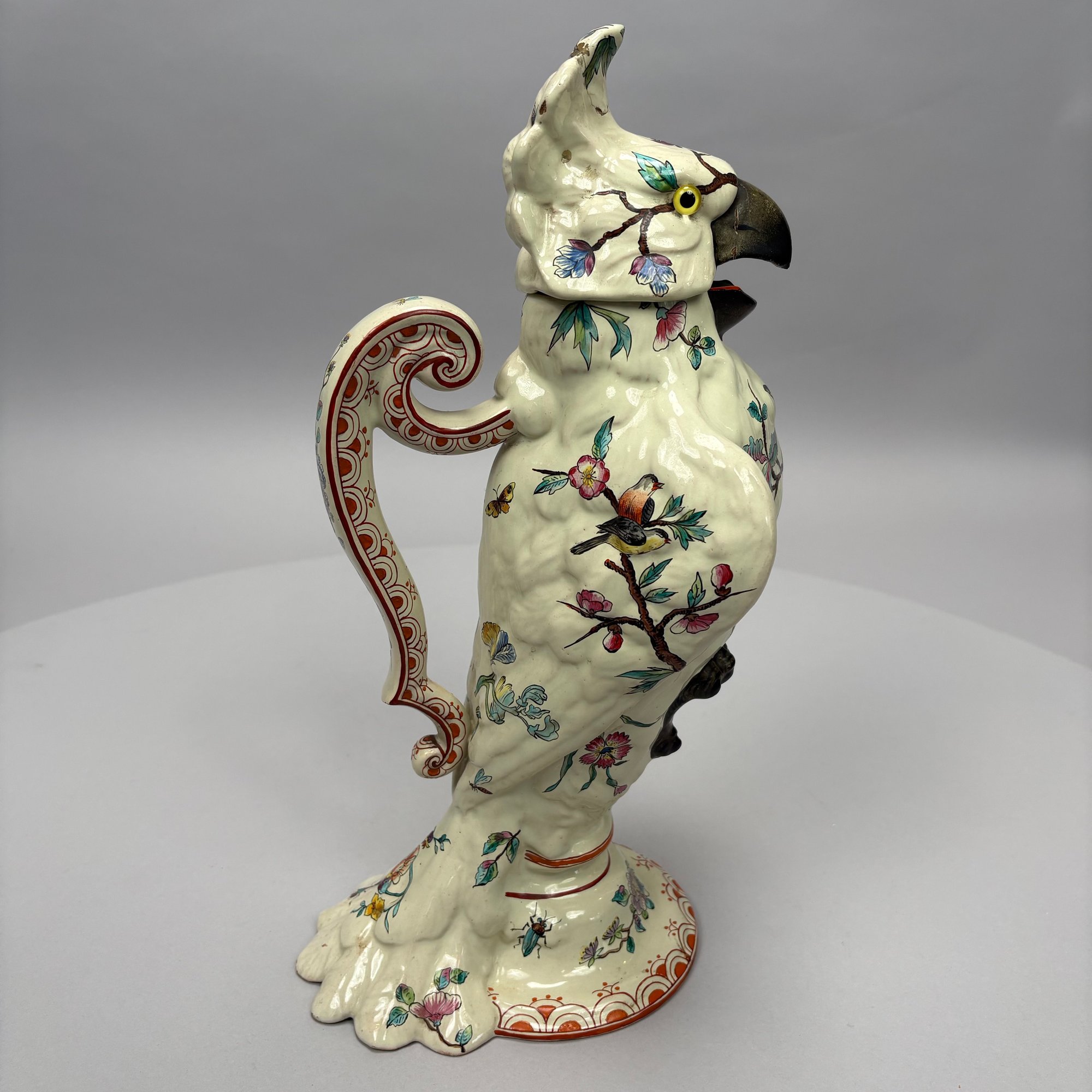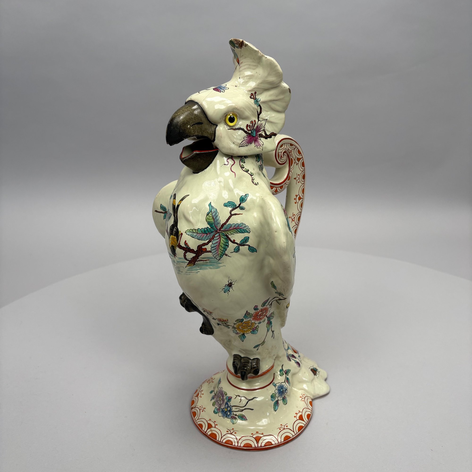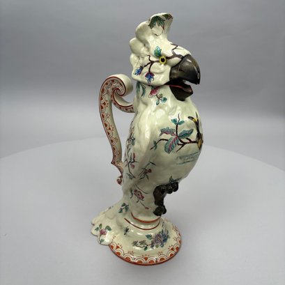 Cockatoo pitcher: H: 14.625 in., W: 7.75 in., D: 6 in.