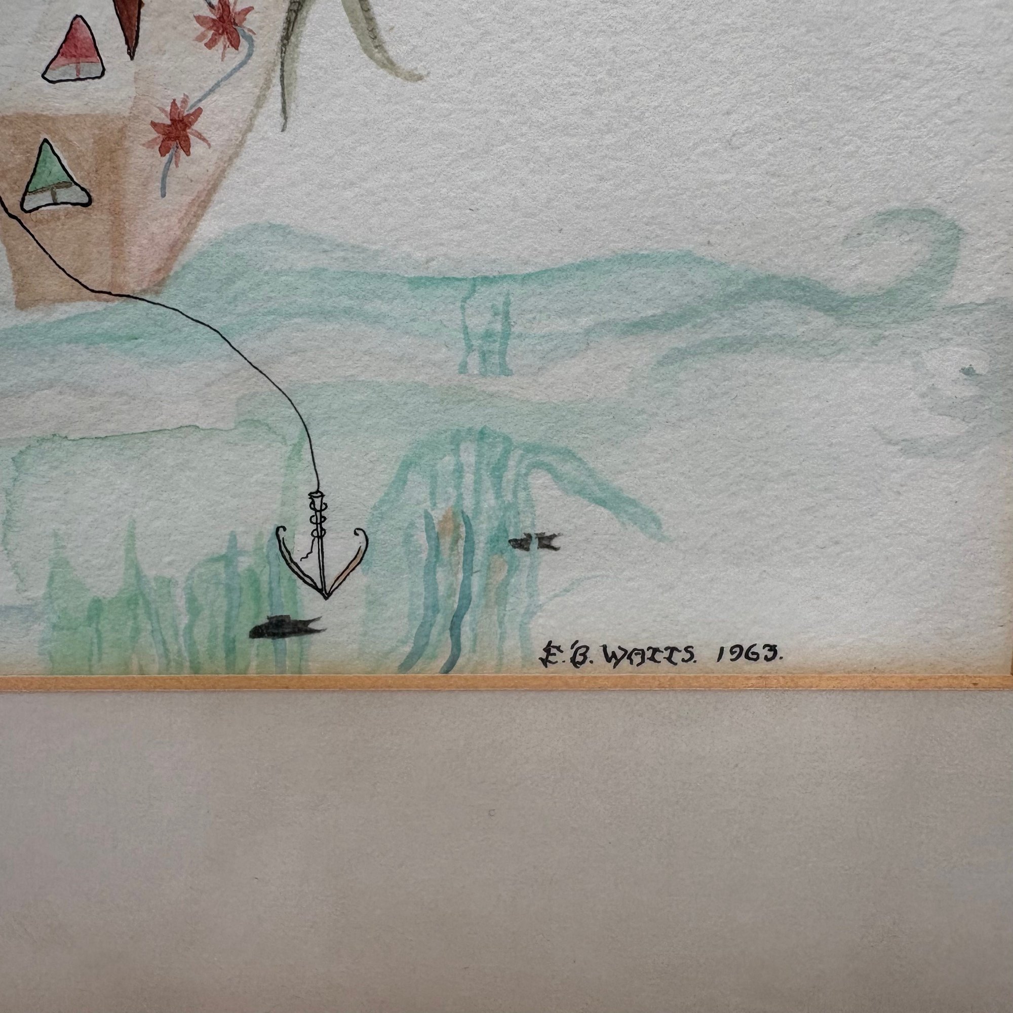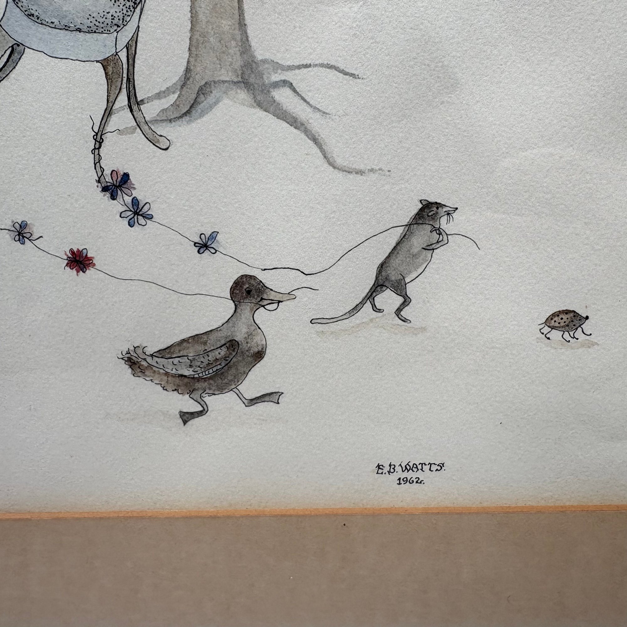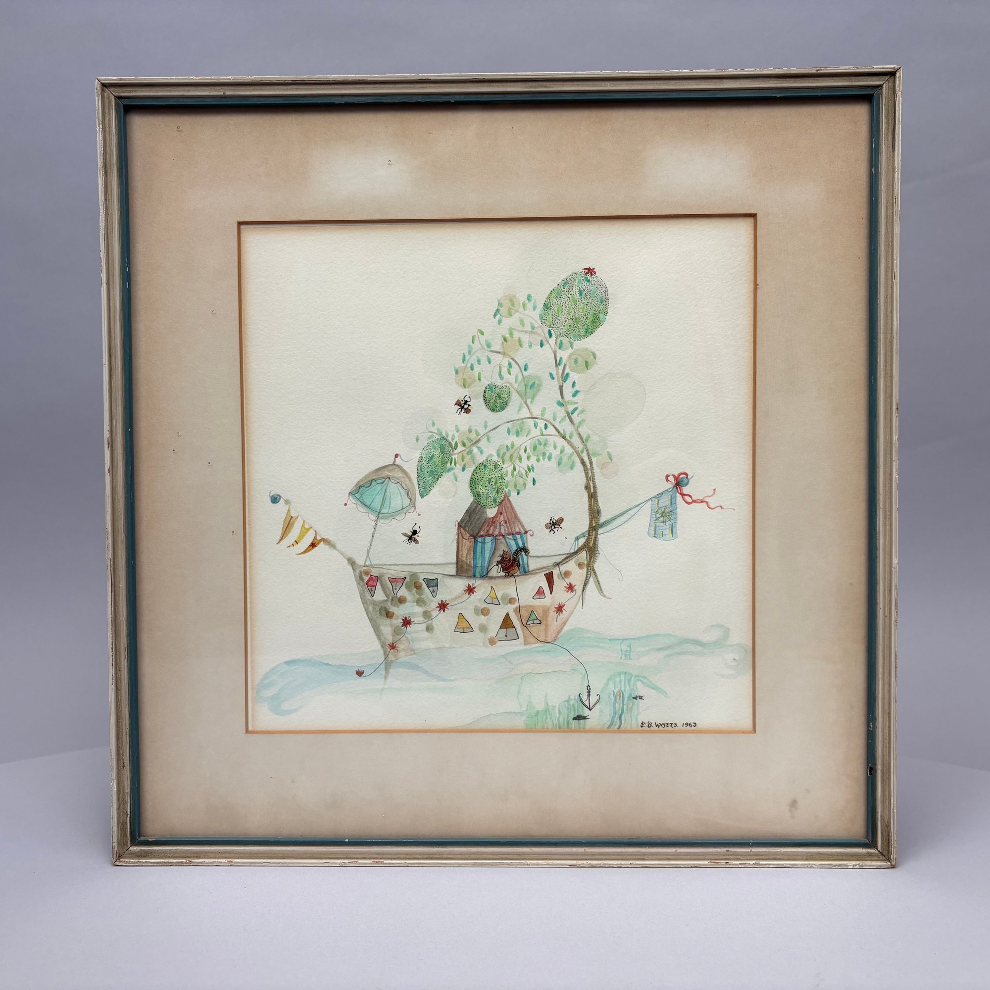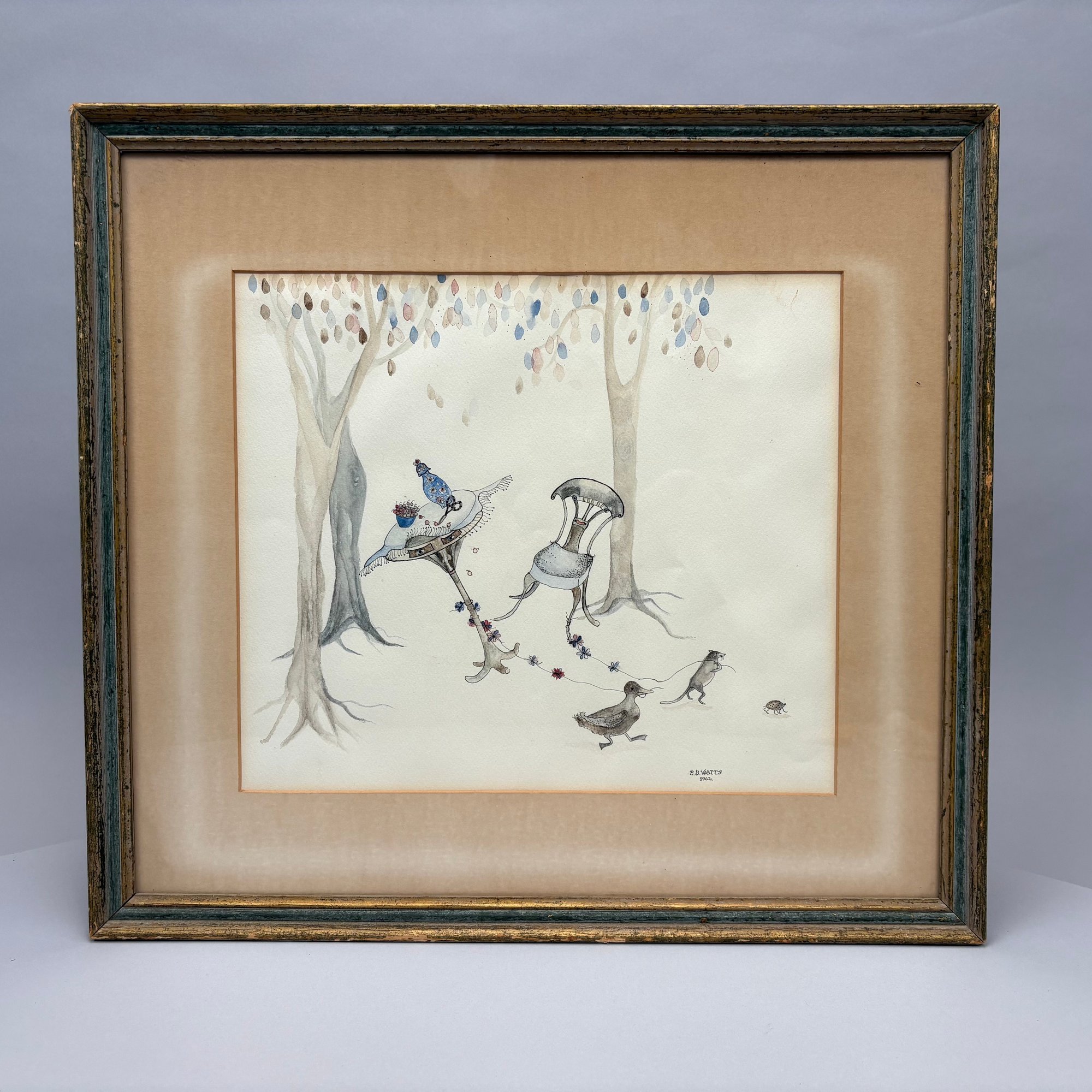 E.B. Watts. Two Fantasy Pictures. Watercolor, the first, 1962, depicting a duck and a rat using rope to upset a table and chair; the second, 1963, depicting a squirrel weighing anchor in a boat surrounded by insects, each signed "E.B. WATTS" and dated "1962" and "1963," largest 10.25 x 12 inches, sight).