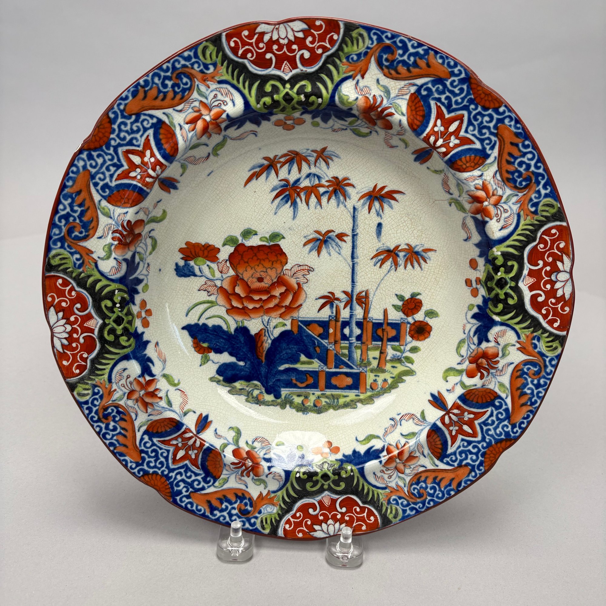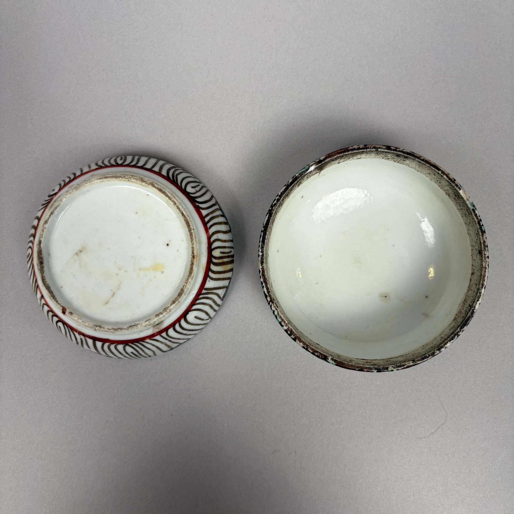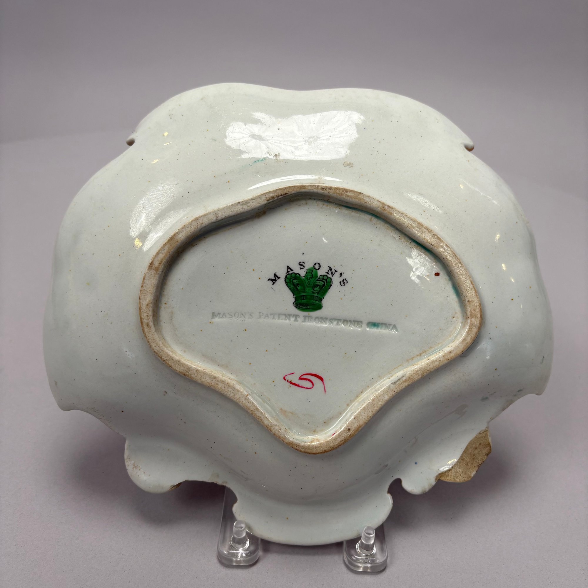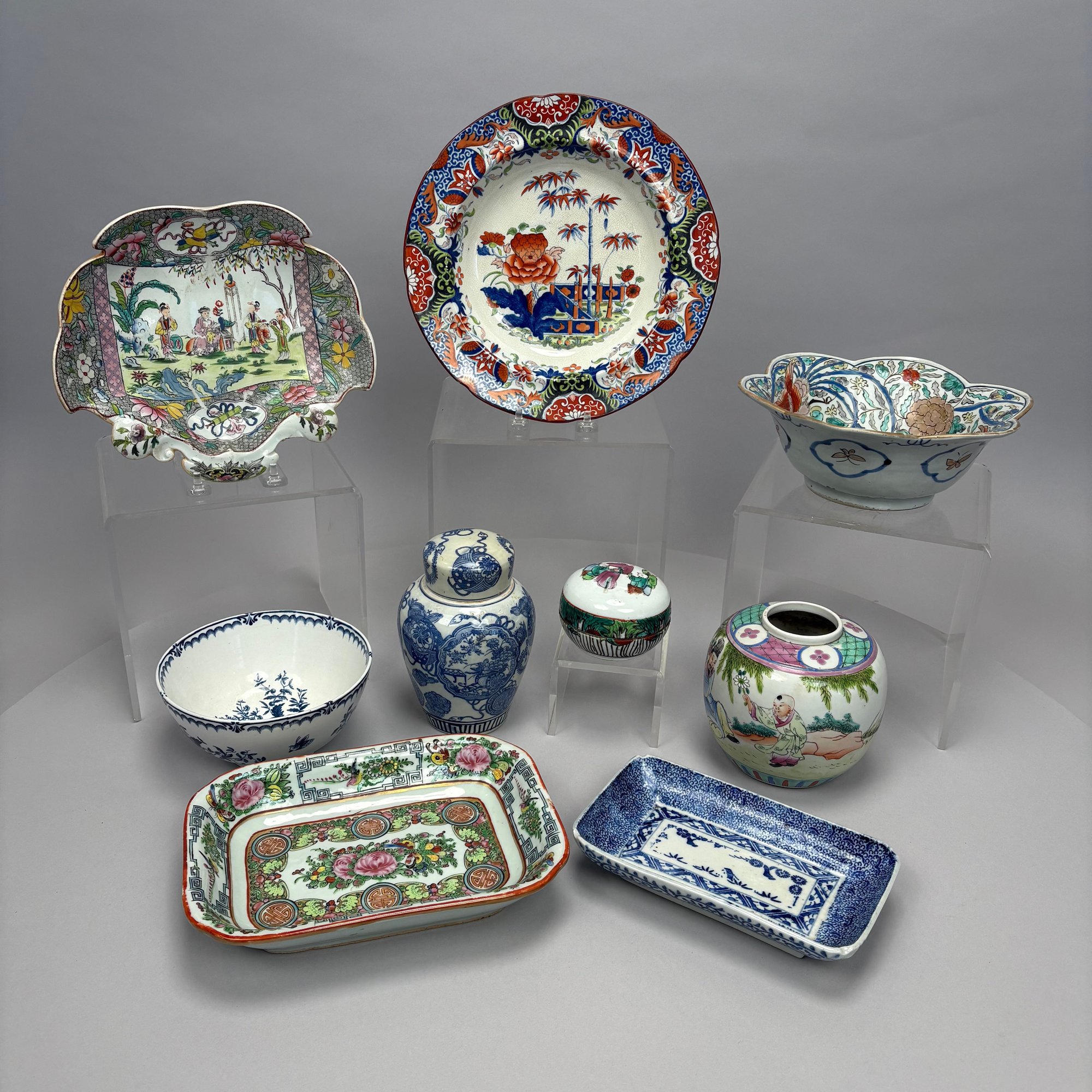 Nine English and Asian Ceramic Decorative Wares, 19th and 20th Century. Comprising a Mason's ironstone Chinoiserie sweetmeat dish, impressed and printed factory marks; an ironstone Imari soup plate, likely Masons; 'Pinecone' pattern bowl; blue and white jar and cover and a tray; famille rose serving dish, jar and circular box and cover; and a Japanese bowl.