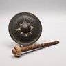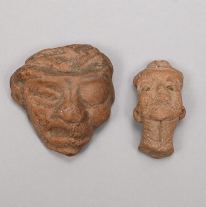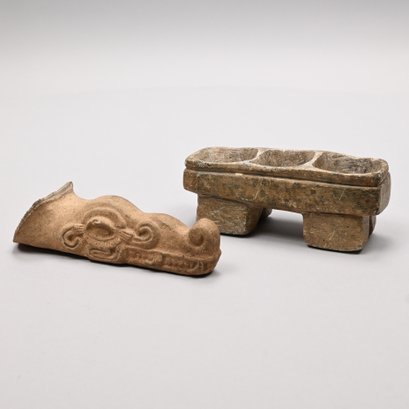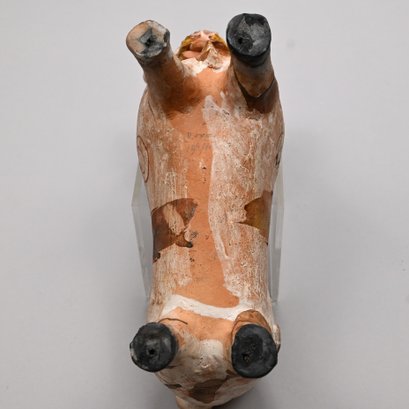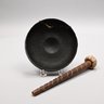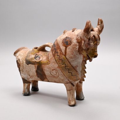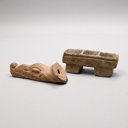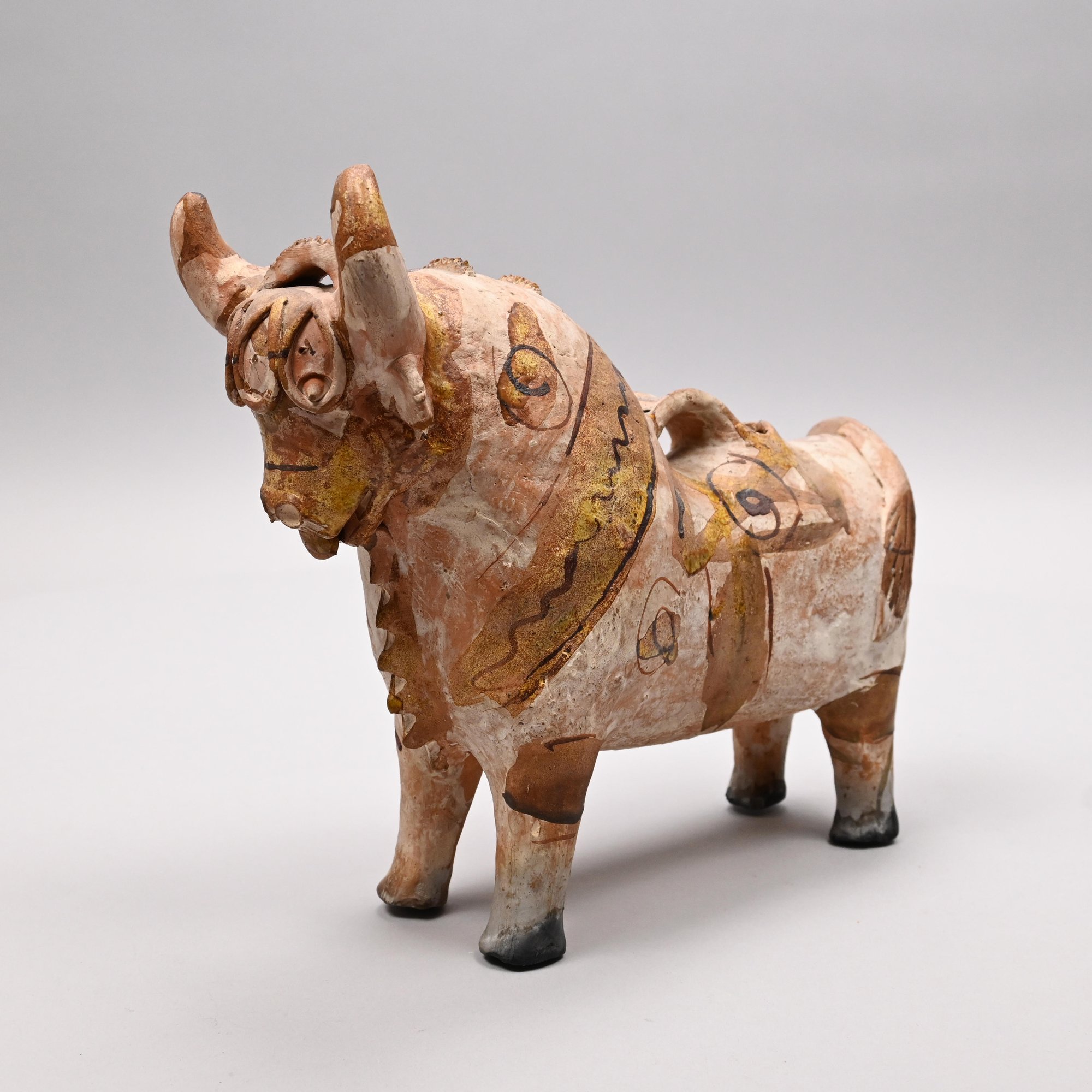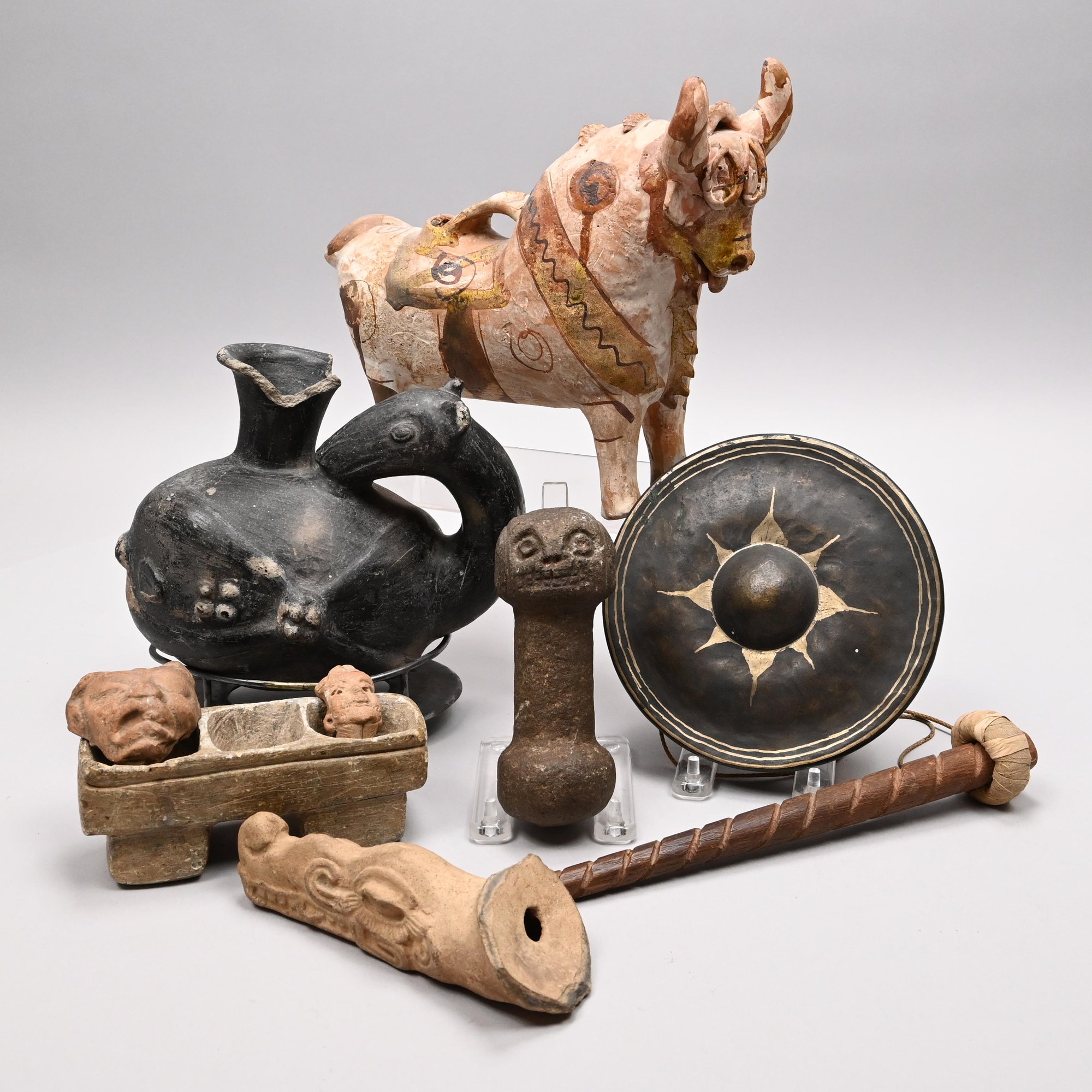 Nine Ethnographic Pottery and Metal Articles. Comprising a figure of a bull, a vessel in the form of a deer, a small three-part trough, two masks, a dragon's head, a pestle-type device carved with opposing faces, and a metal gong with wood and fabric mallet.