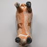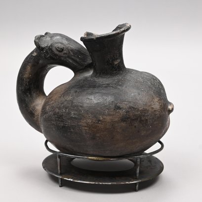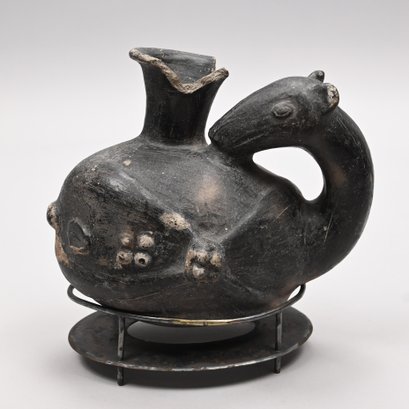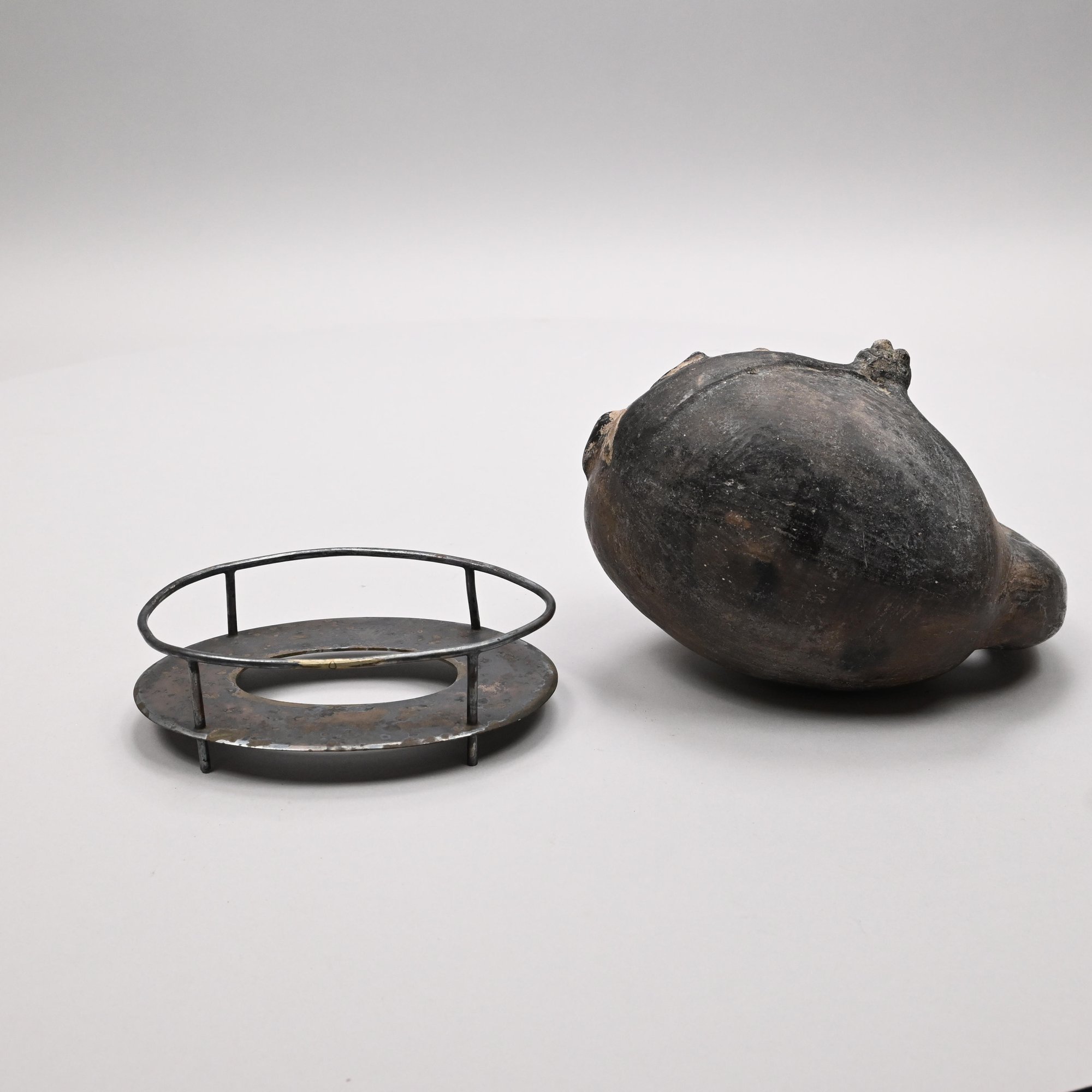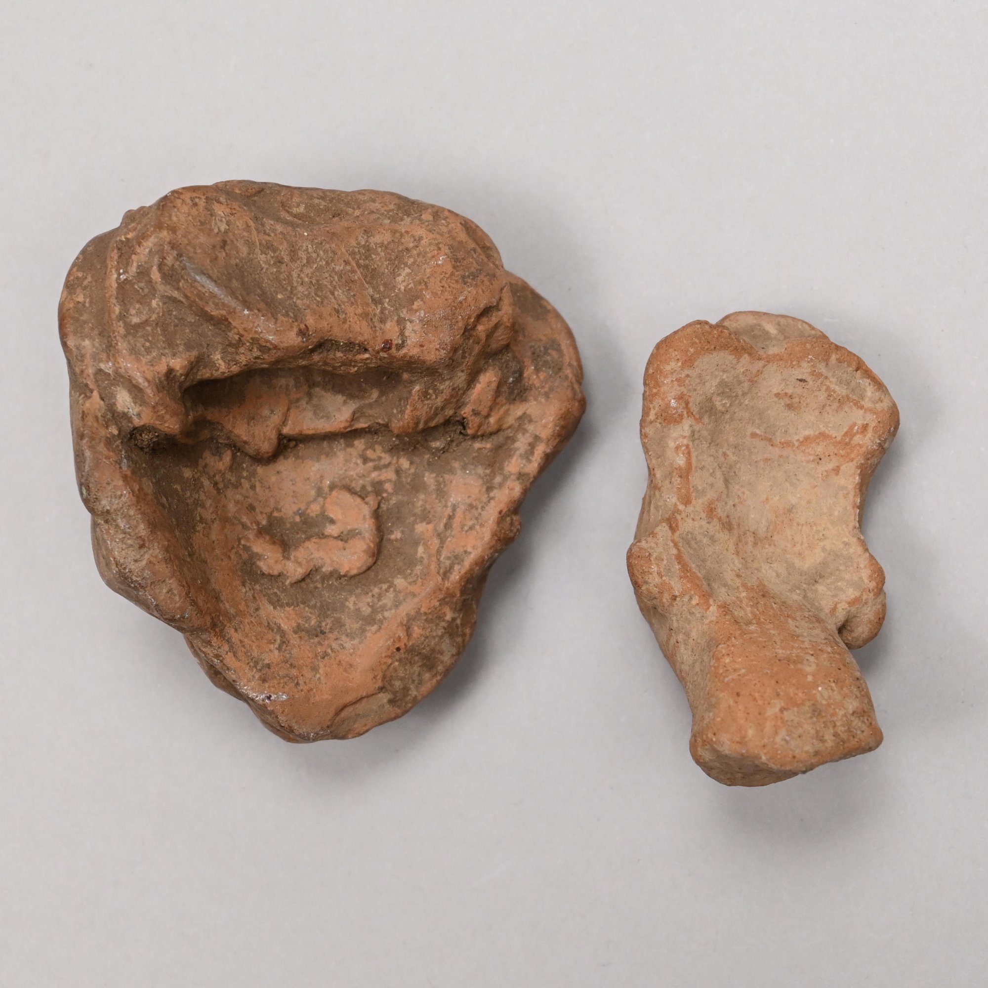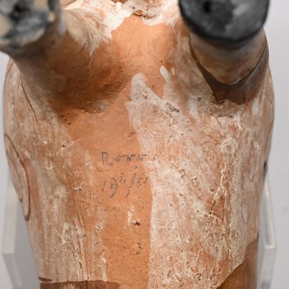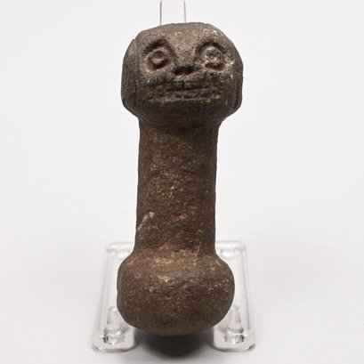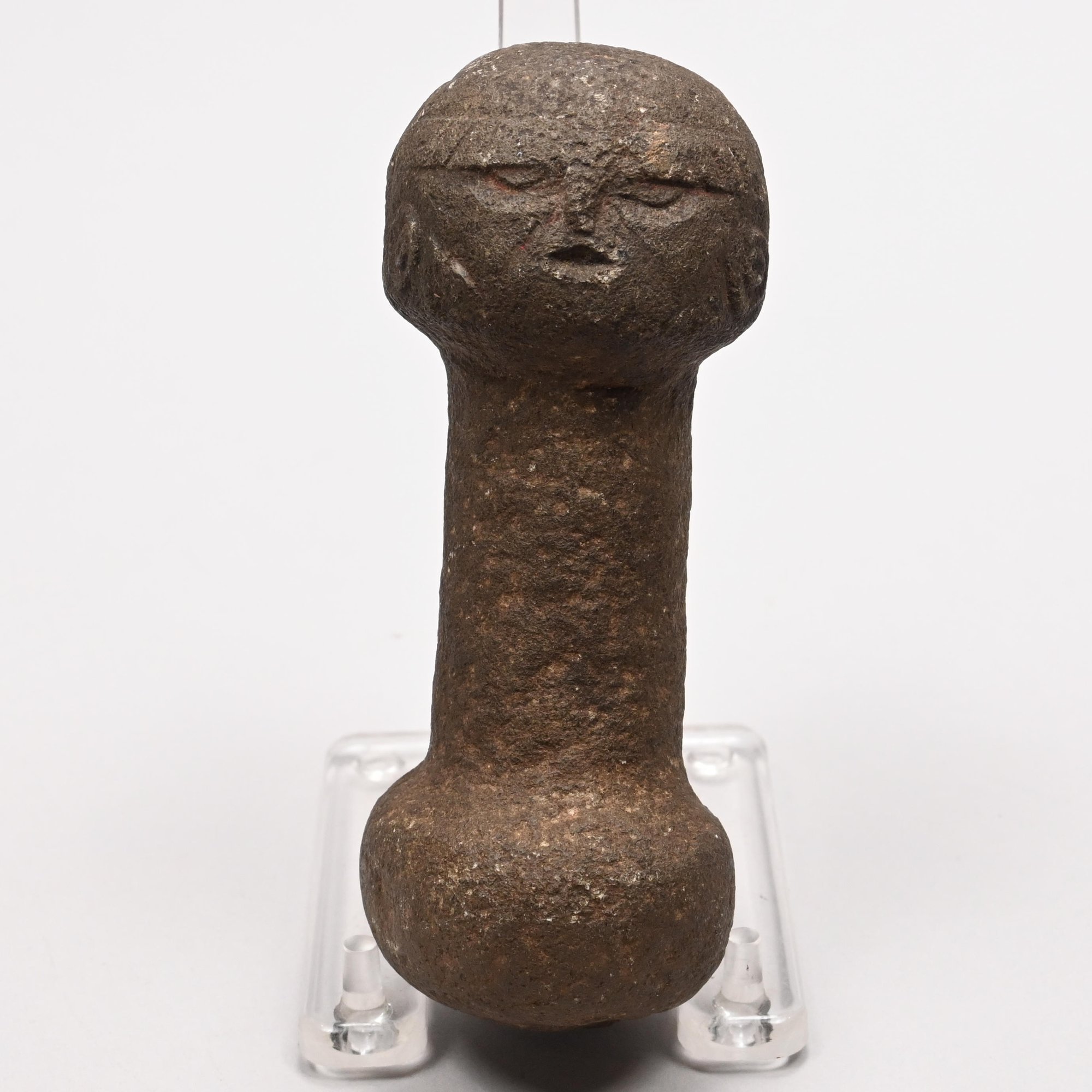 Nine Ethnographic Pottery and Metal Articles. Comprising a figure of a bull, a vessel in the form of a deer, a small three-part trough, two masks, a dragon's head, a pestle-type device carved with opposing faces, and a metal gong with wood and fabric mallet.