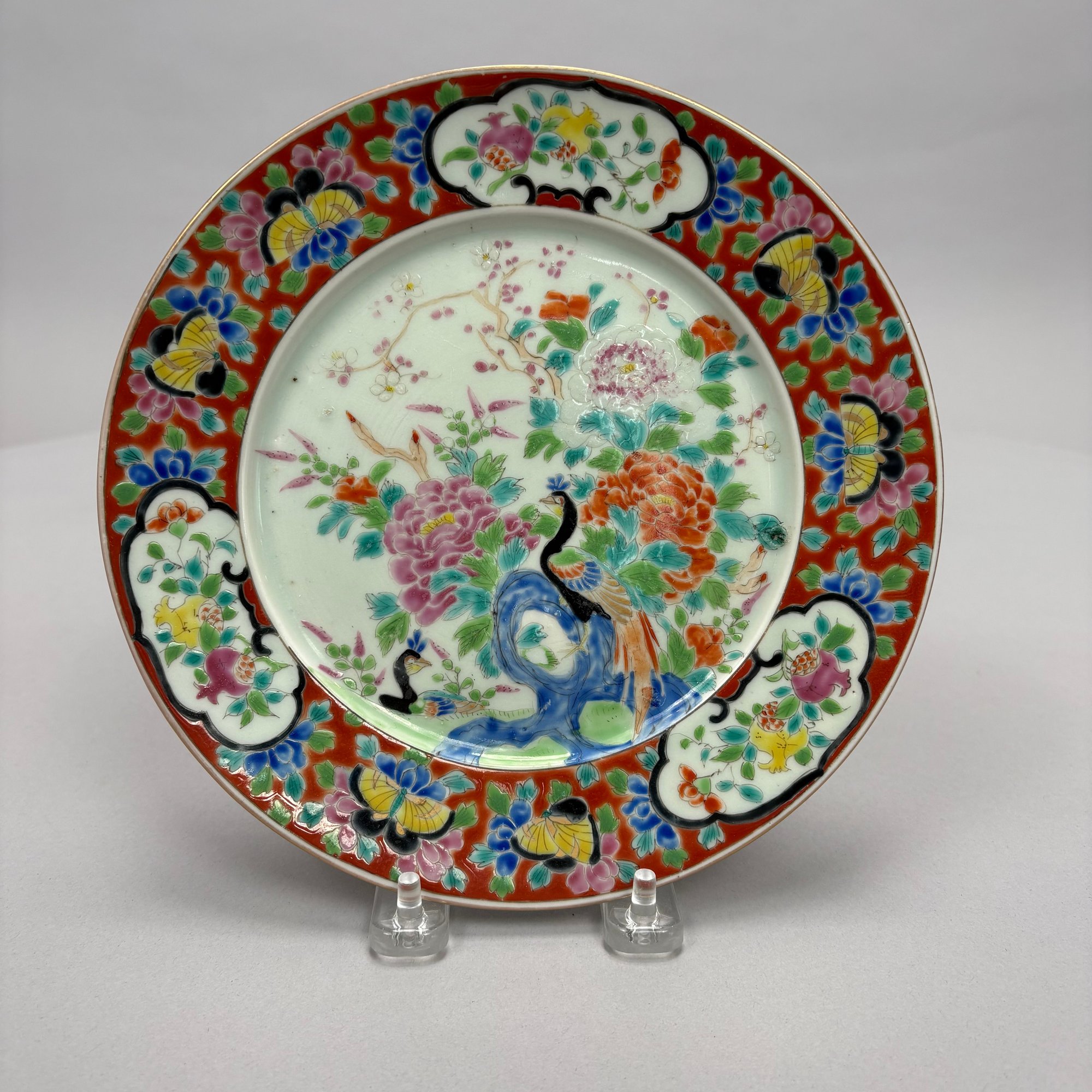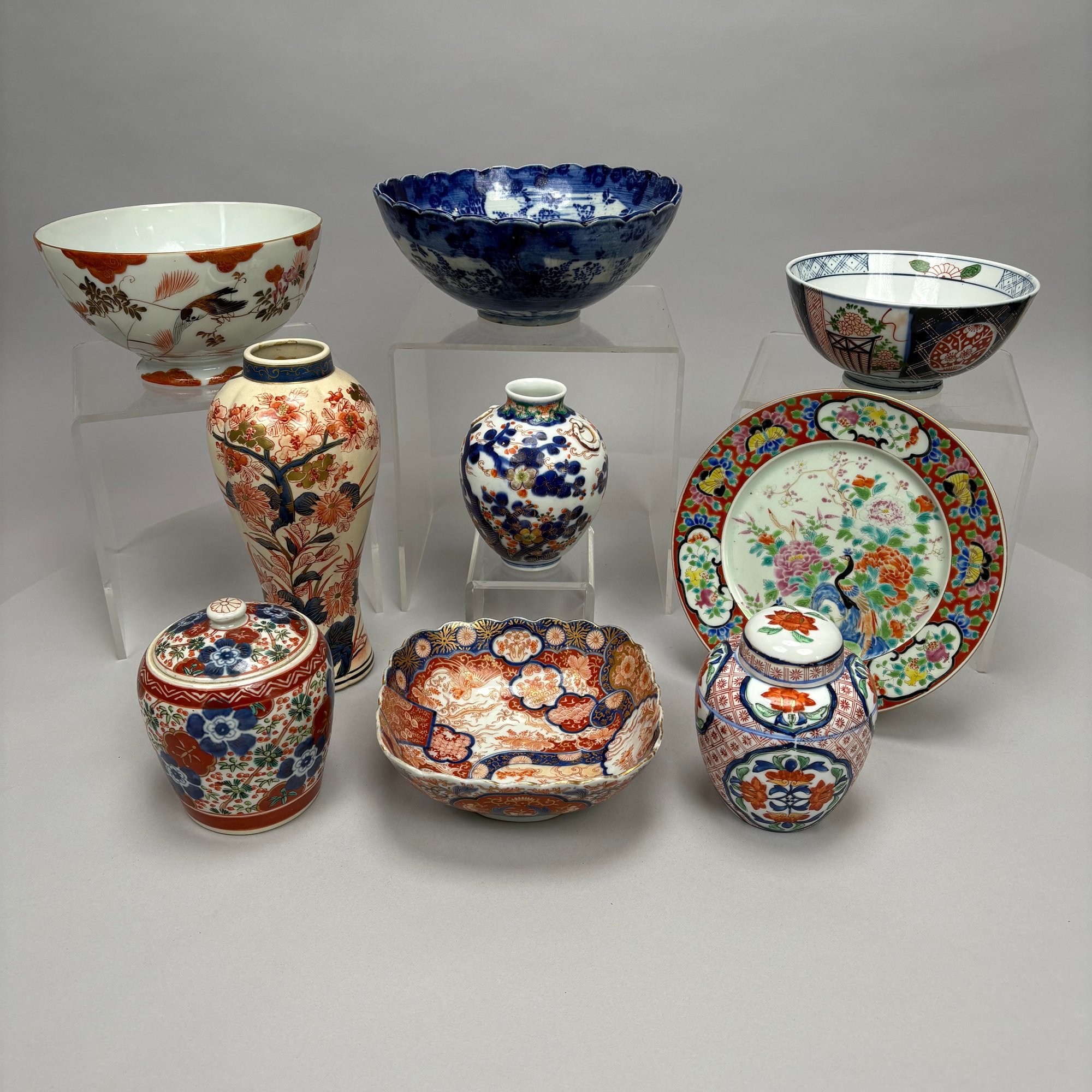 Nine Japanese Porcelain Wares, Late 19th-20th Century. Comprising a Meiji Seto ware blue transfer-printed bowl; a plate painted with a peacock; and a group of Imari comprising a garniture vase, a vase, two jars and covers, two bowls and a dish, various marks.