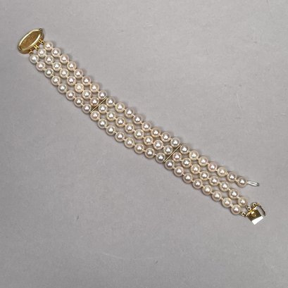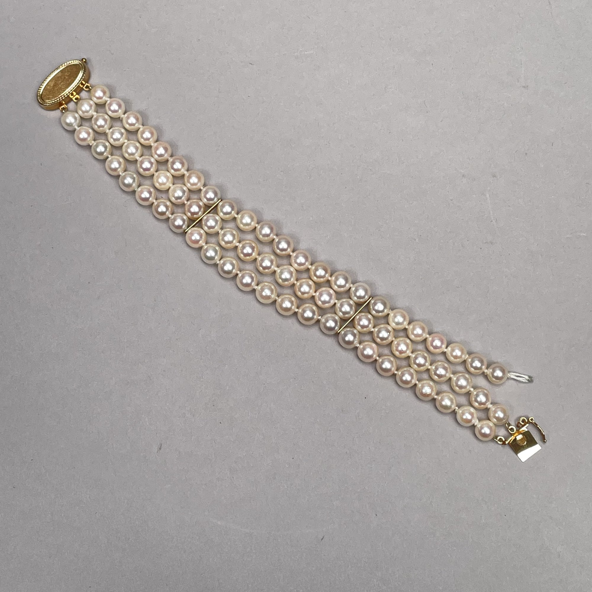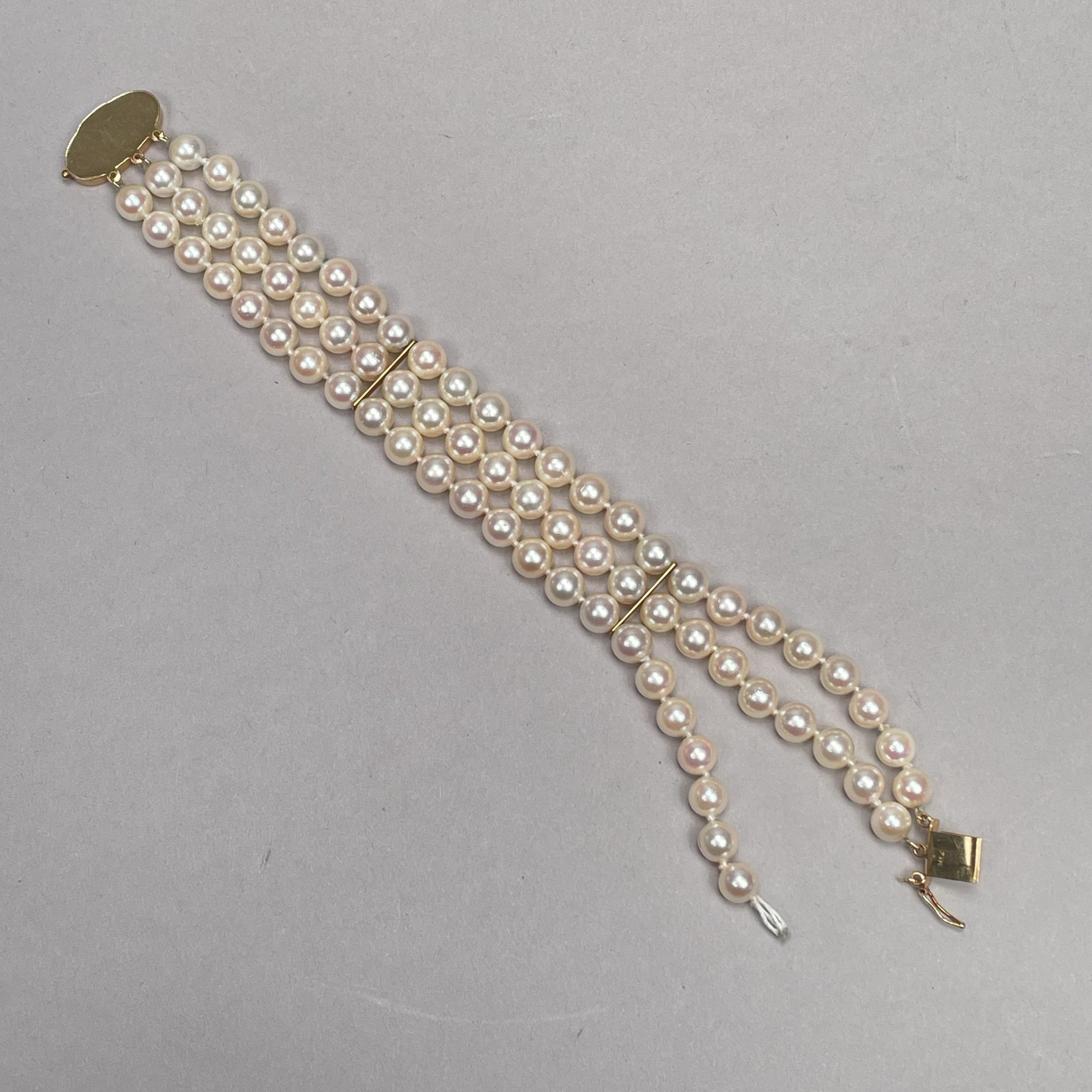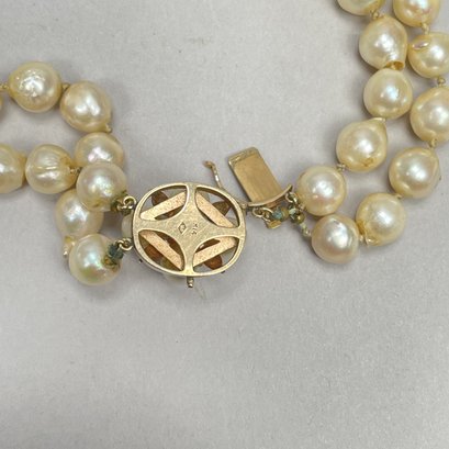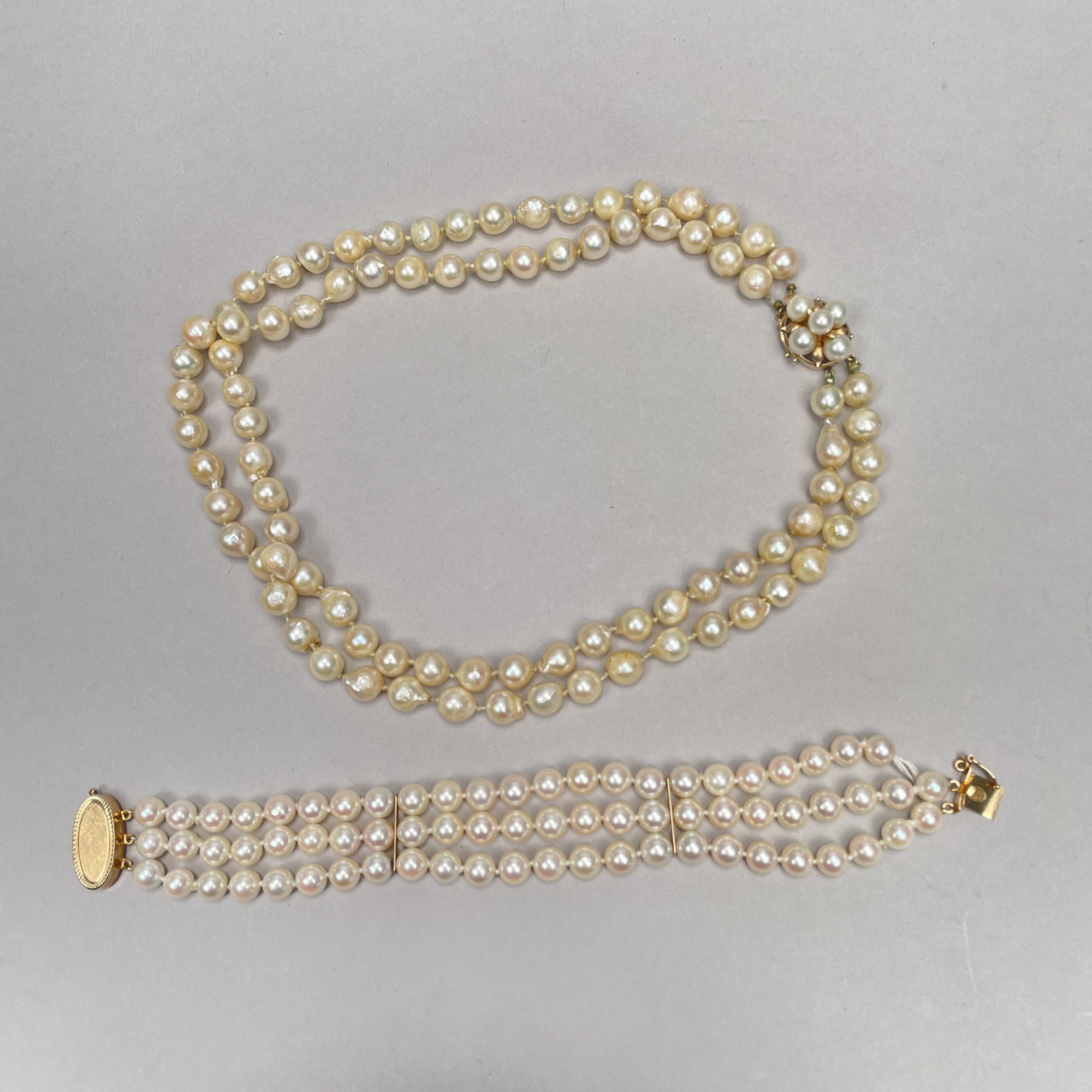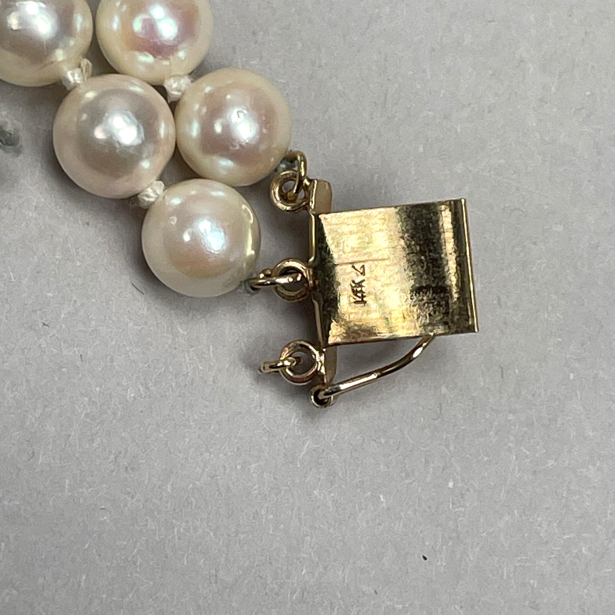 Pearl Necklace and Bracelet (As-Is), Each with 14k Yellow Gold Clasp. The necklace marked "K14" and "HO" into a diamond on the clasp; the bracelet marked "14K" on the clasp.