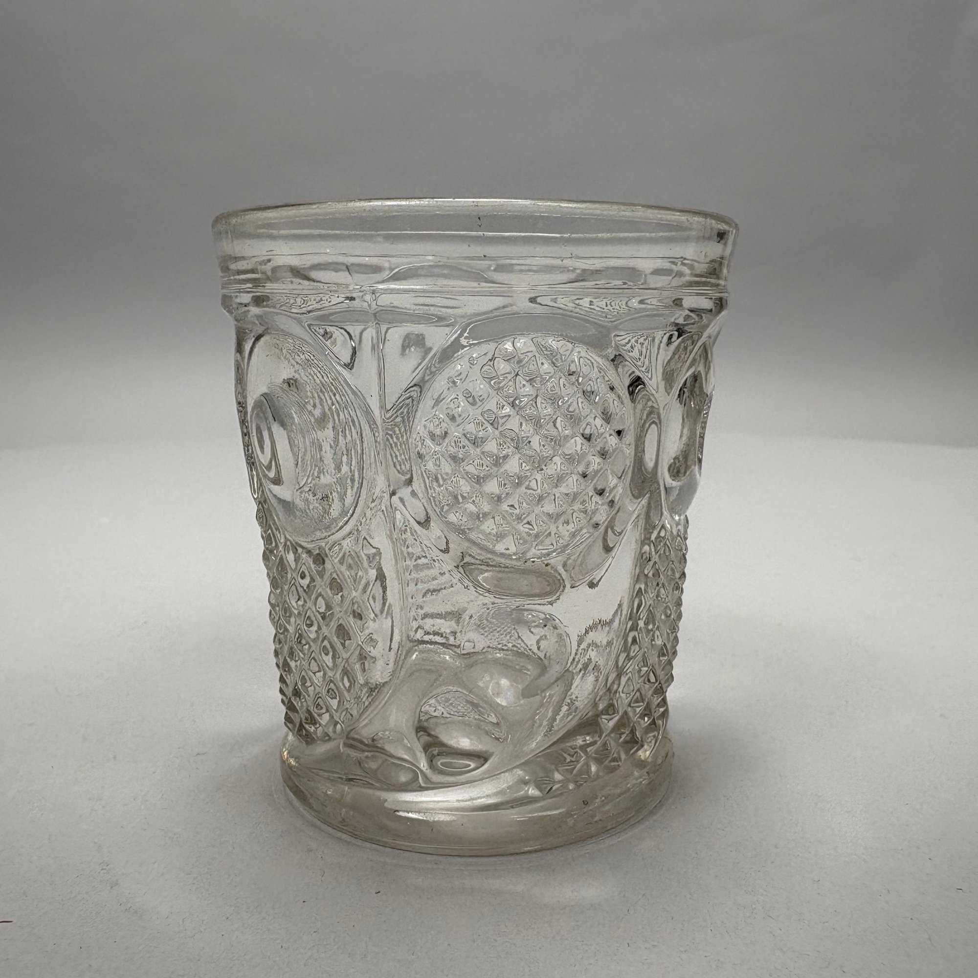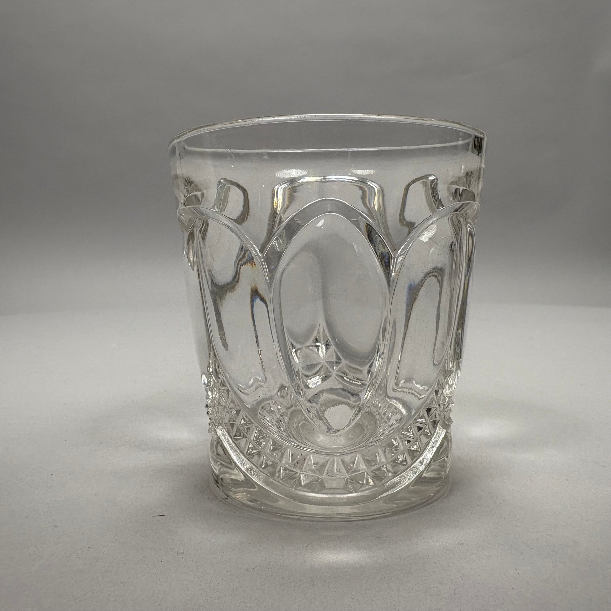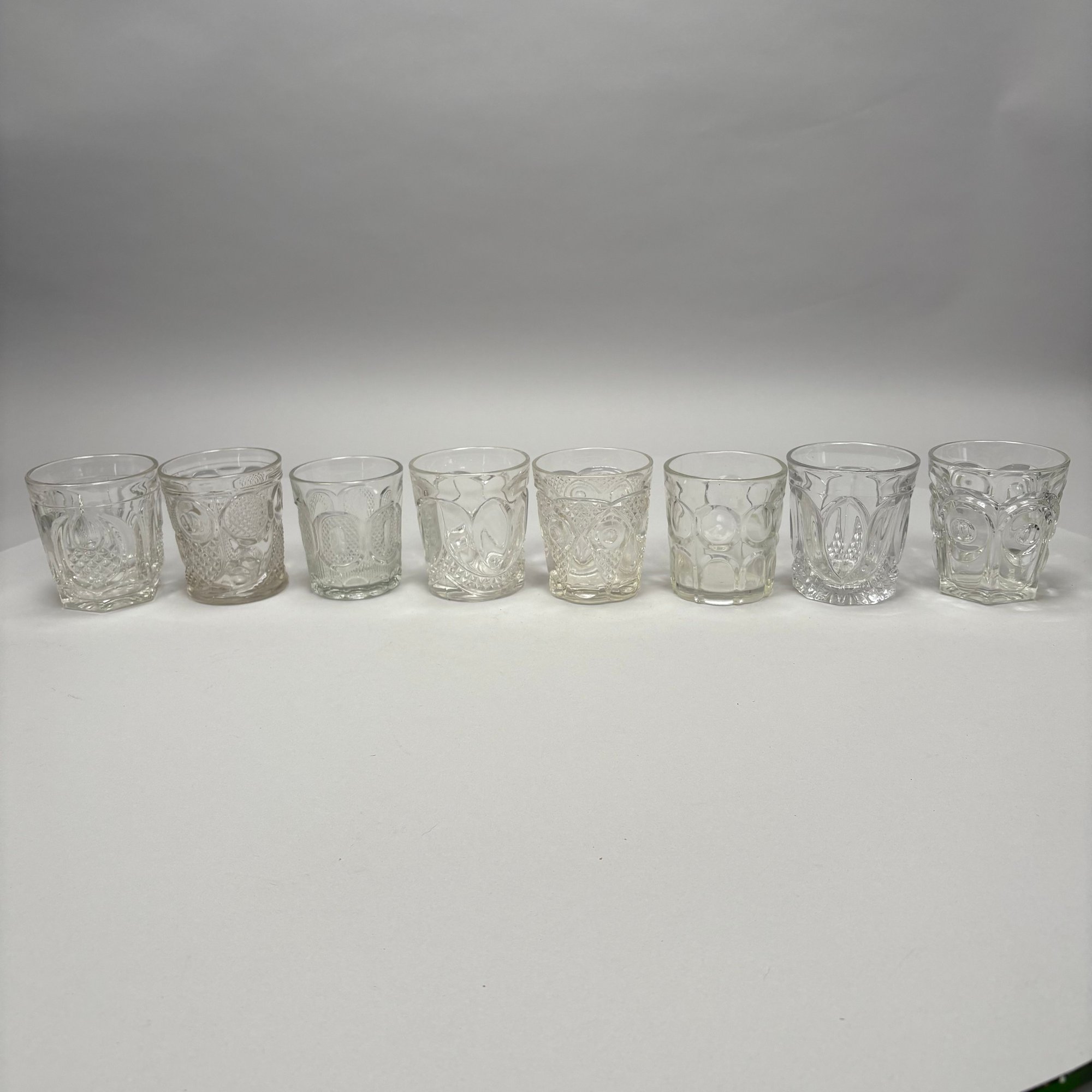 Eight American Colorless Flint Pattern Glass Tumblers, Mid-19th Century. Molded in various bull's-eye, oval, circular and cornucopia patterns with rayed and sawtooth borders, including a pair molded with tulips and two different sawtooth borders, Bryce, Richards & Co., Pittsburgh, Pennsylvania, 1854-1865.