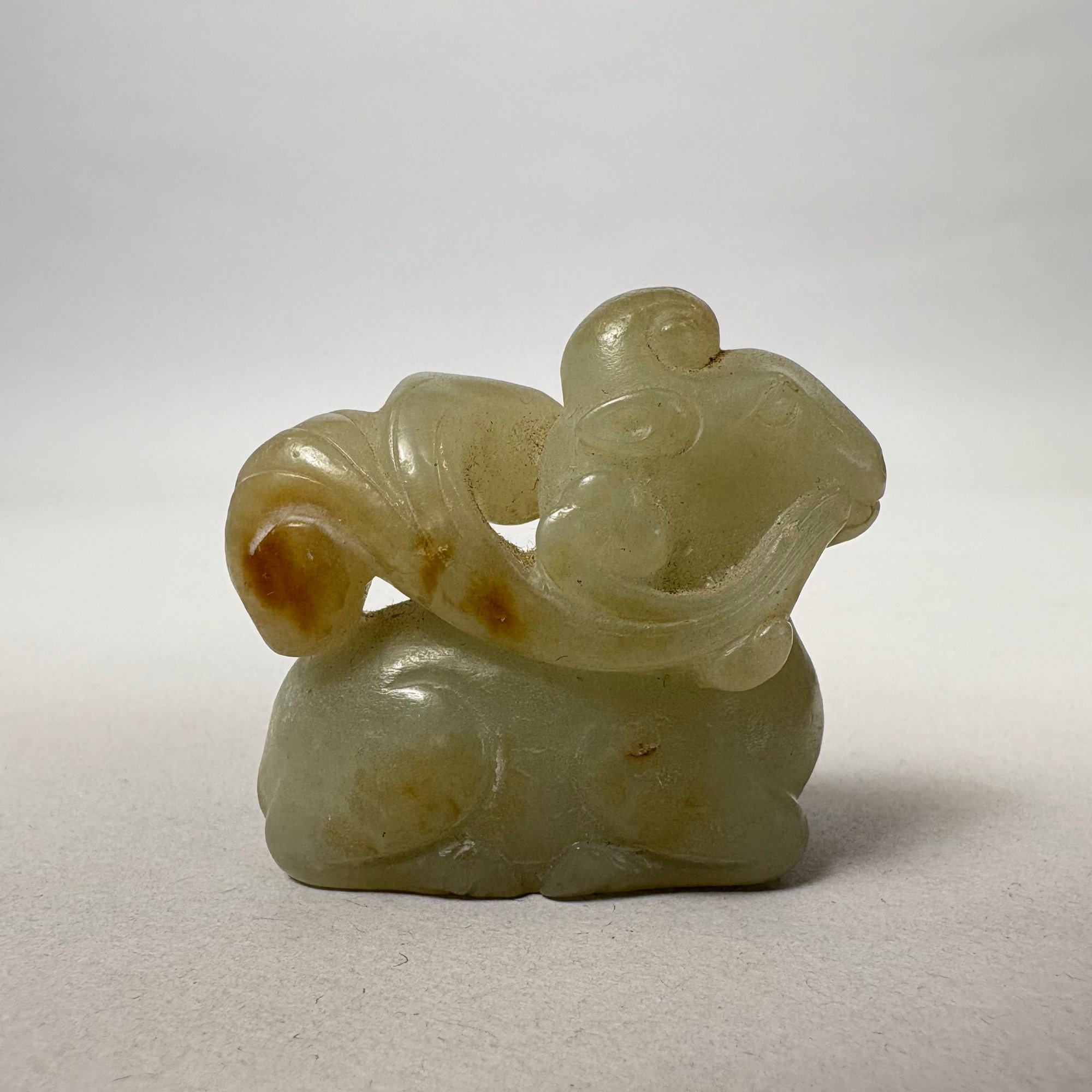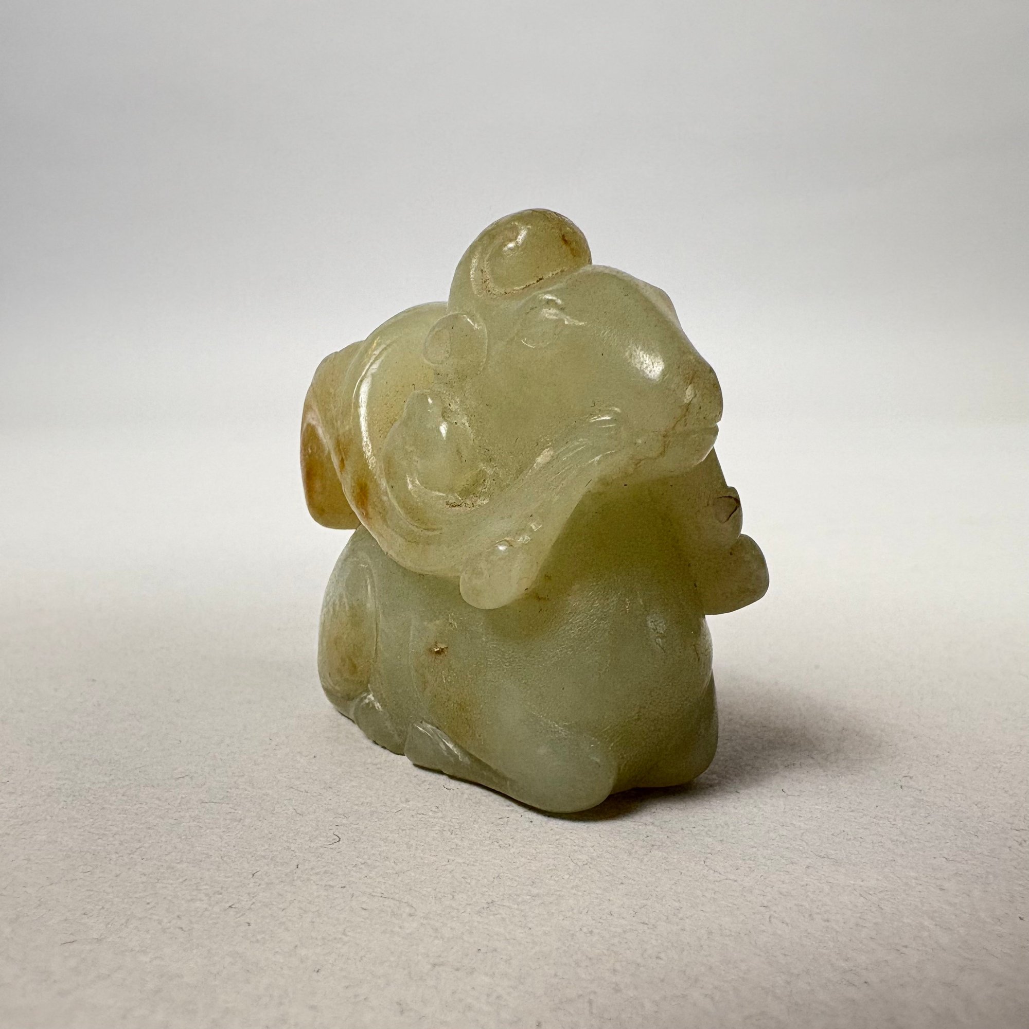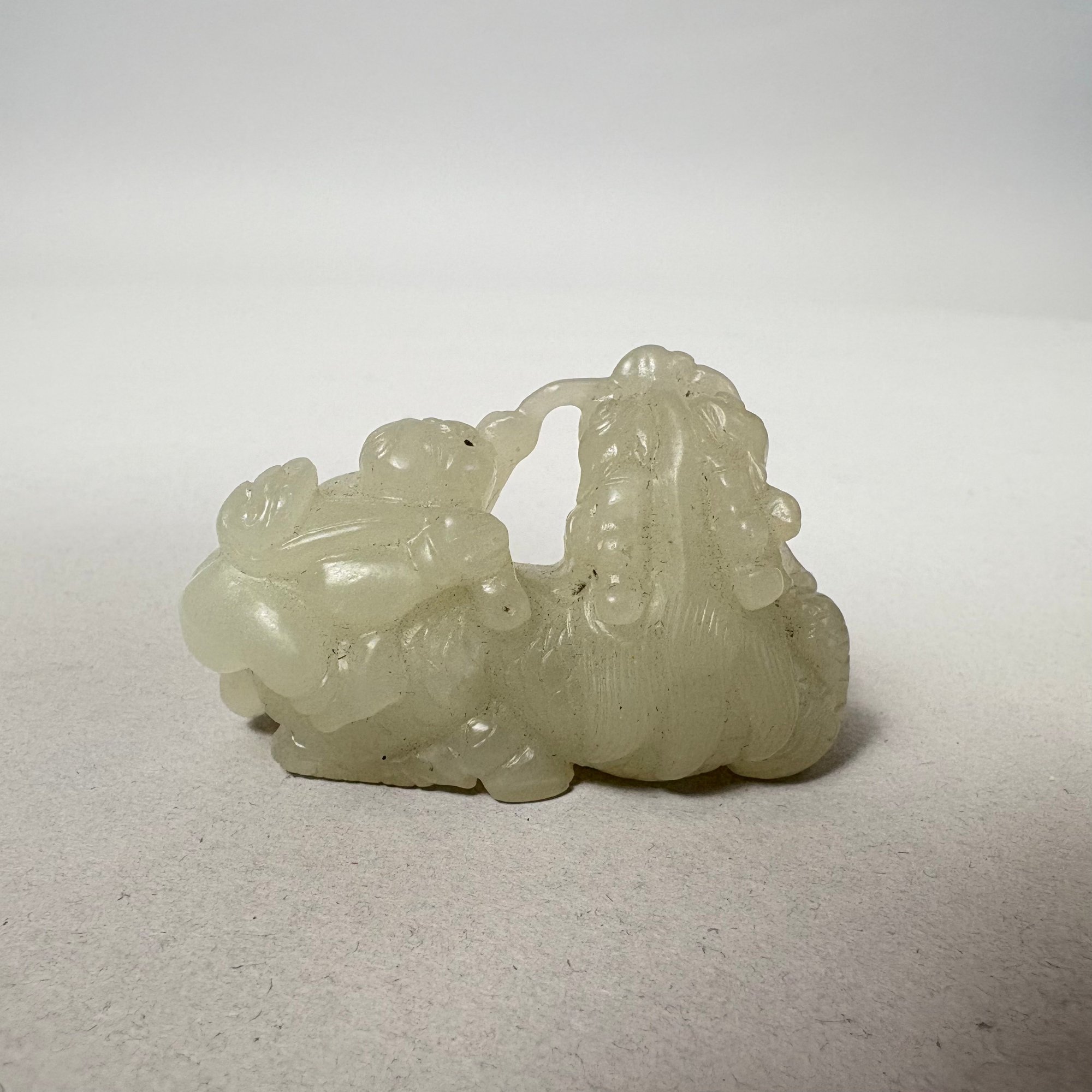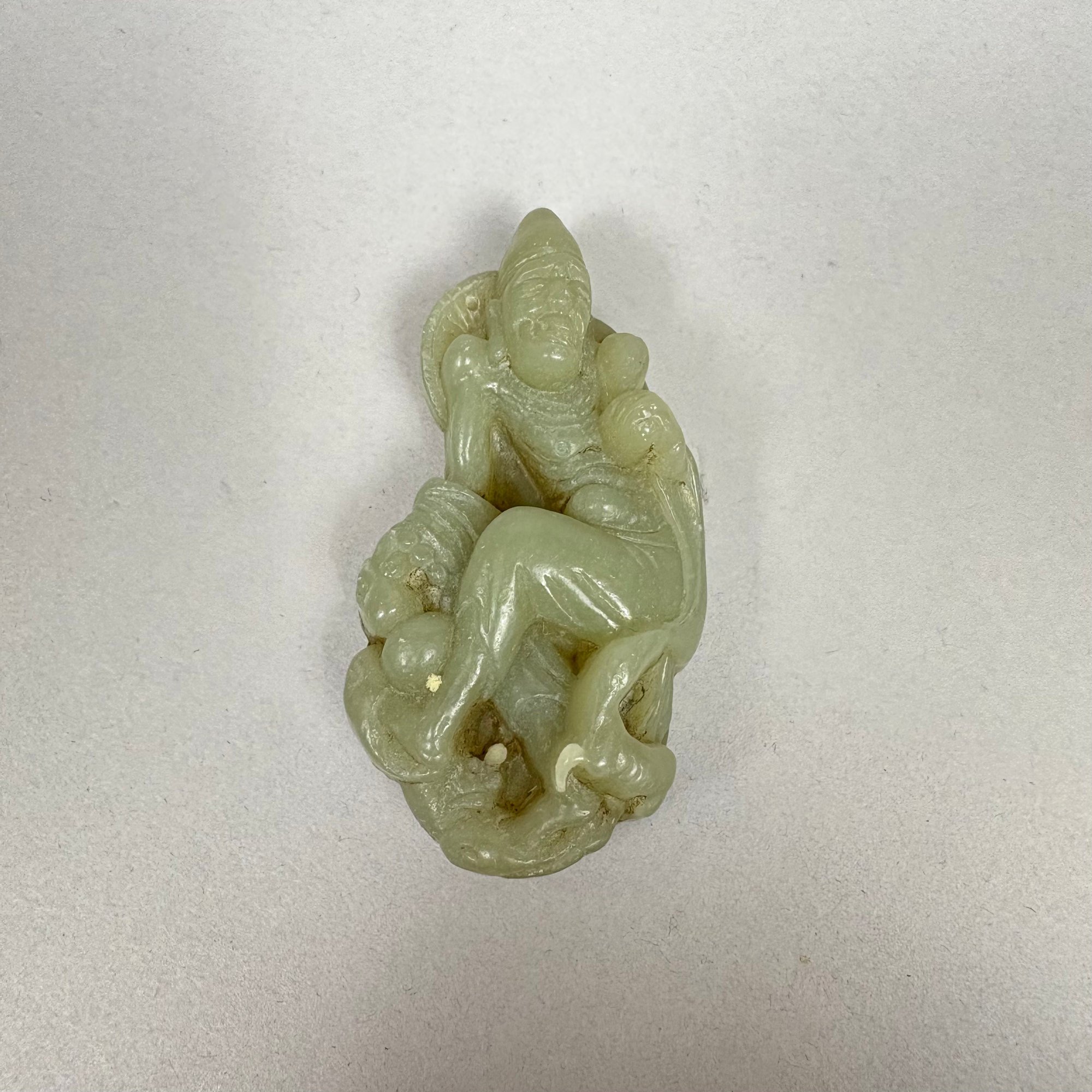 Eight Chinese Carved Nephrite Jade and Hardstone Ornamental Objects. Comprising a figure of Huangdi on top of a dragon and grabbing its whisker, a figure of a foreign man, a Chimei (spirit with human face and four legs), a water buffalo, donkey, sheep, recumbent elephant and phoenix.