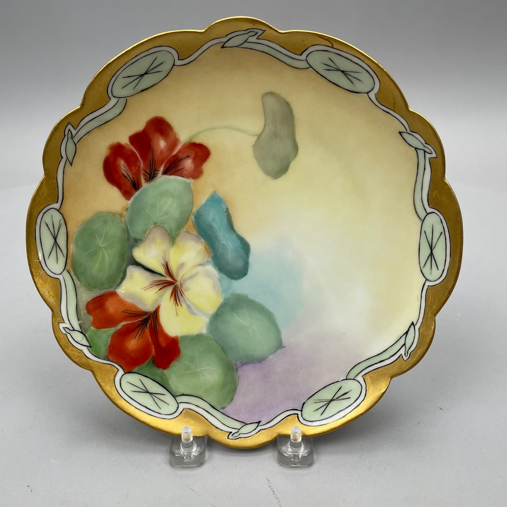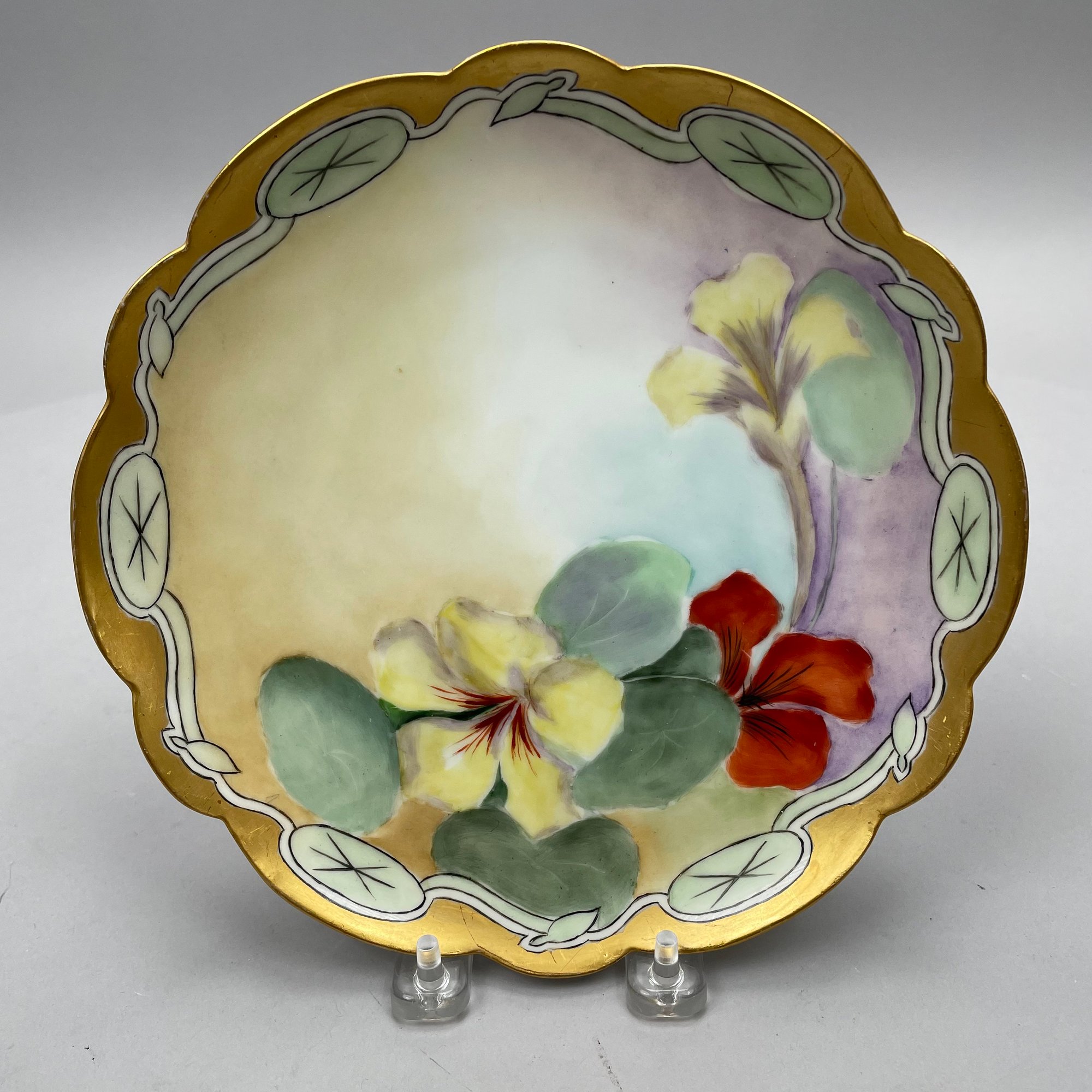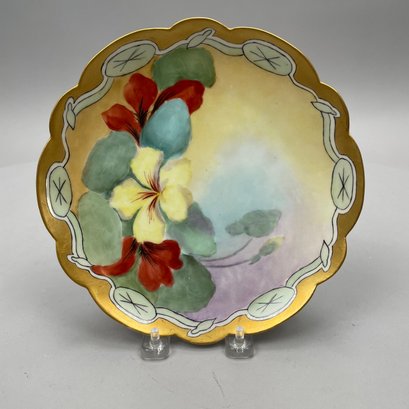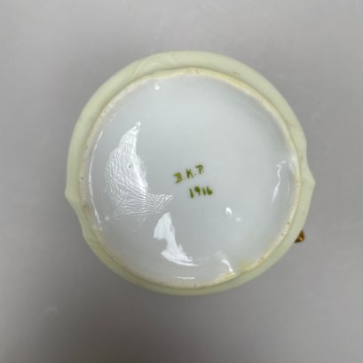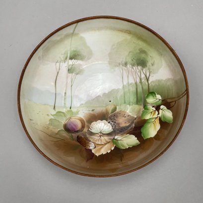 Eight Continental Handpainted Porcelain Wares, Late Nineteenth-Early Twentieth Century. Comprising a set of four Limoges plates, a milk pitcher initialled and dated "B.K.P./ 1916, a Nippon bowl, a vase initialled and dated "L.M.D. 1899, and an Austrian Turn Wien jardiniere, 1897-1906, printed factory mark, painted "II/ 6421/ 2519/ 34."