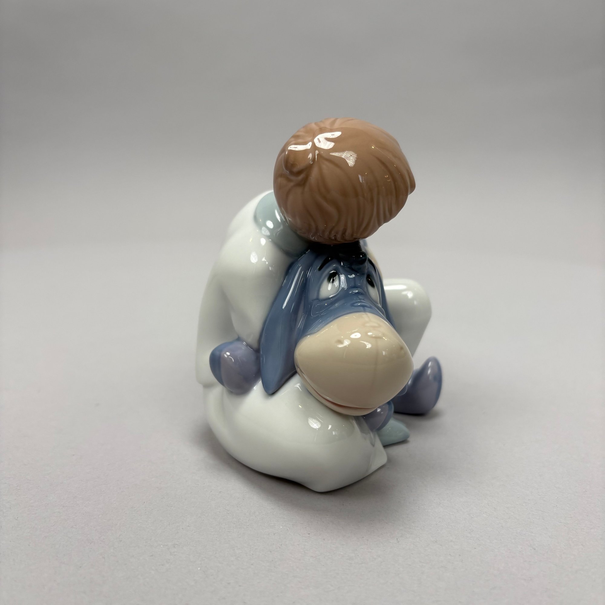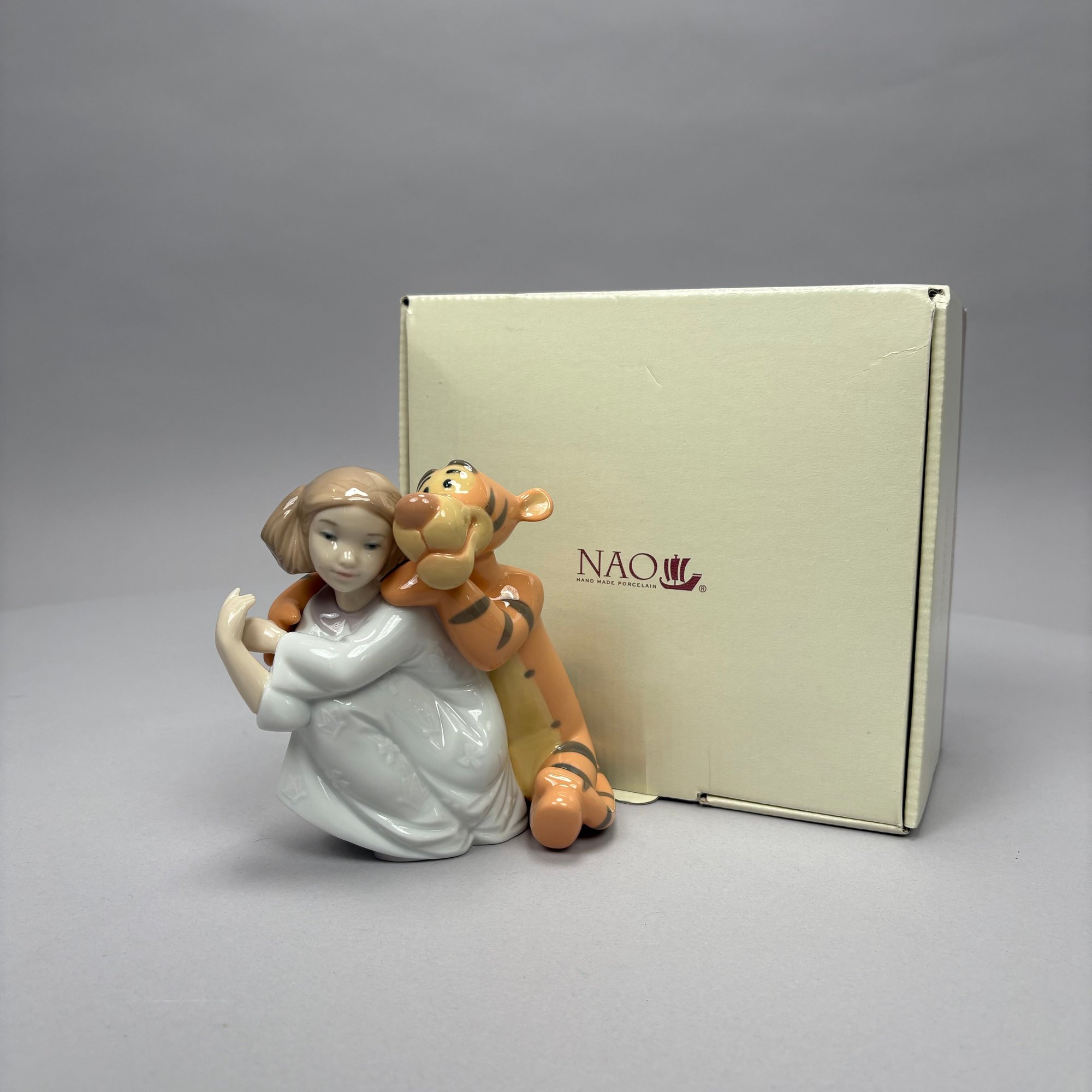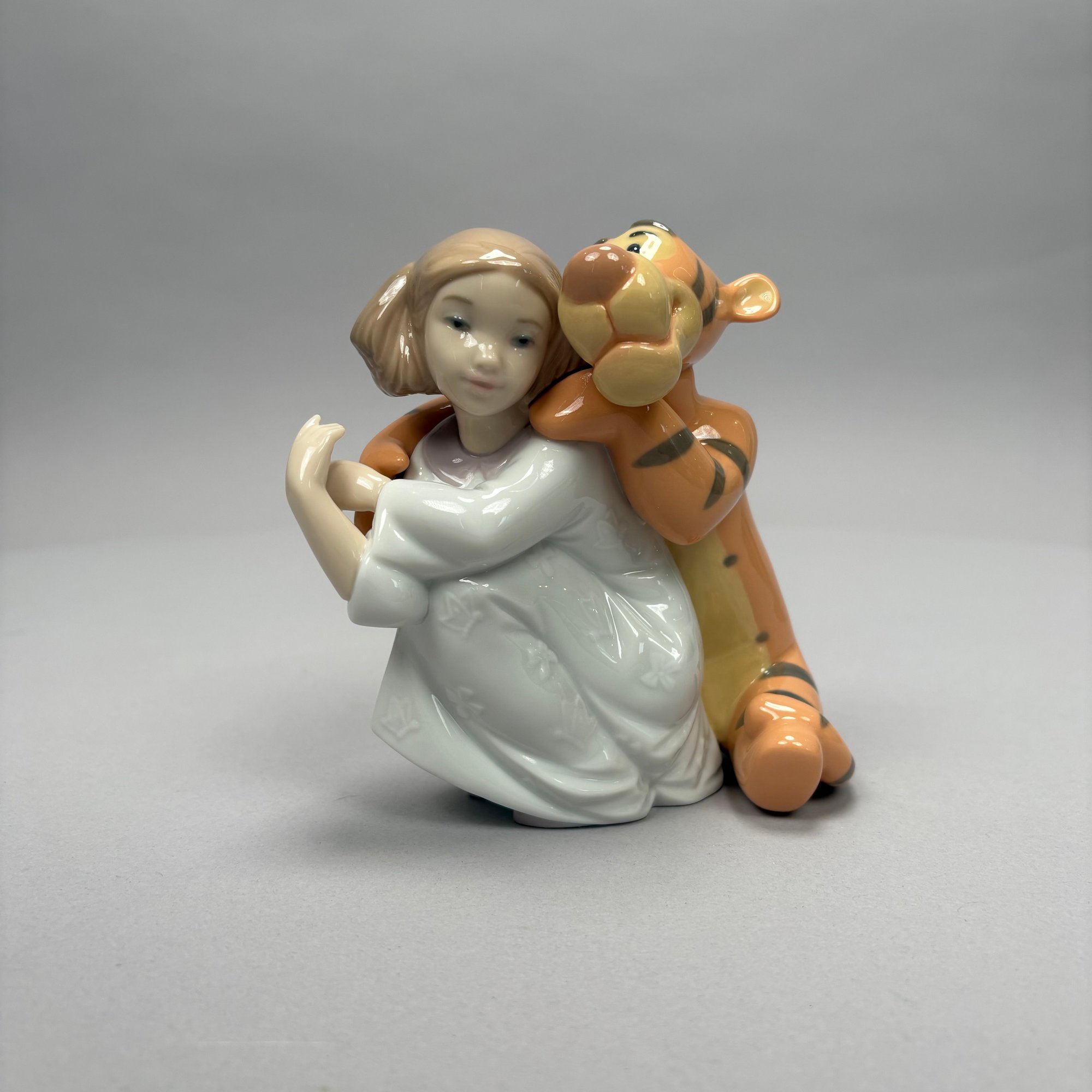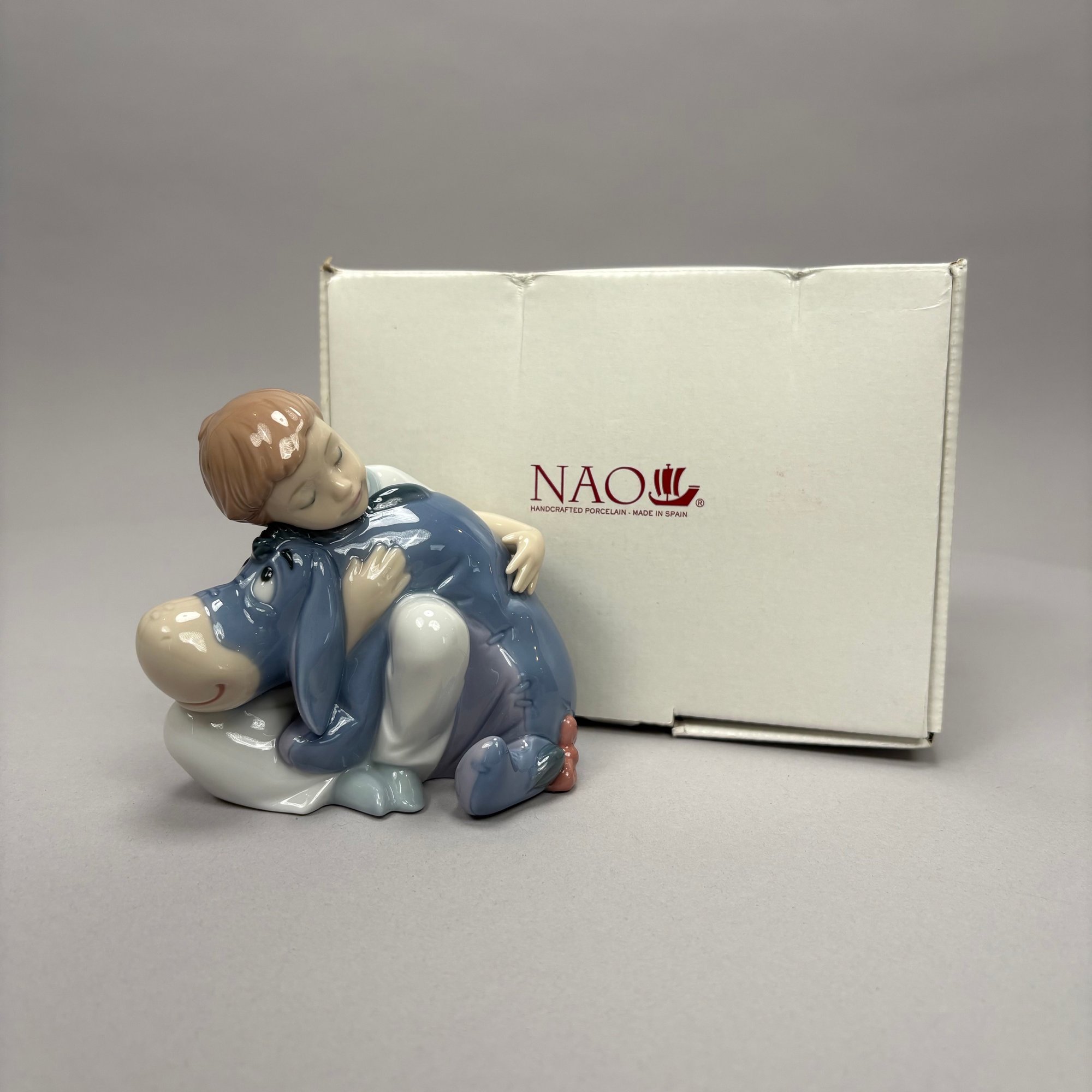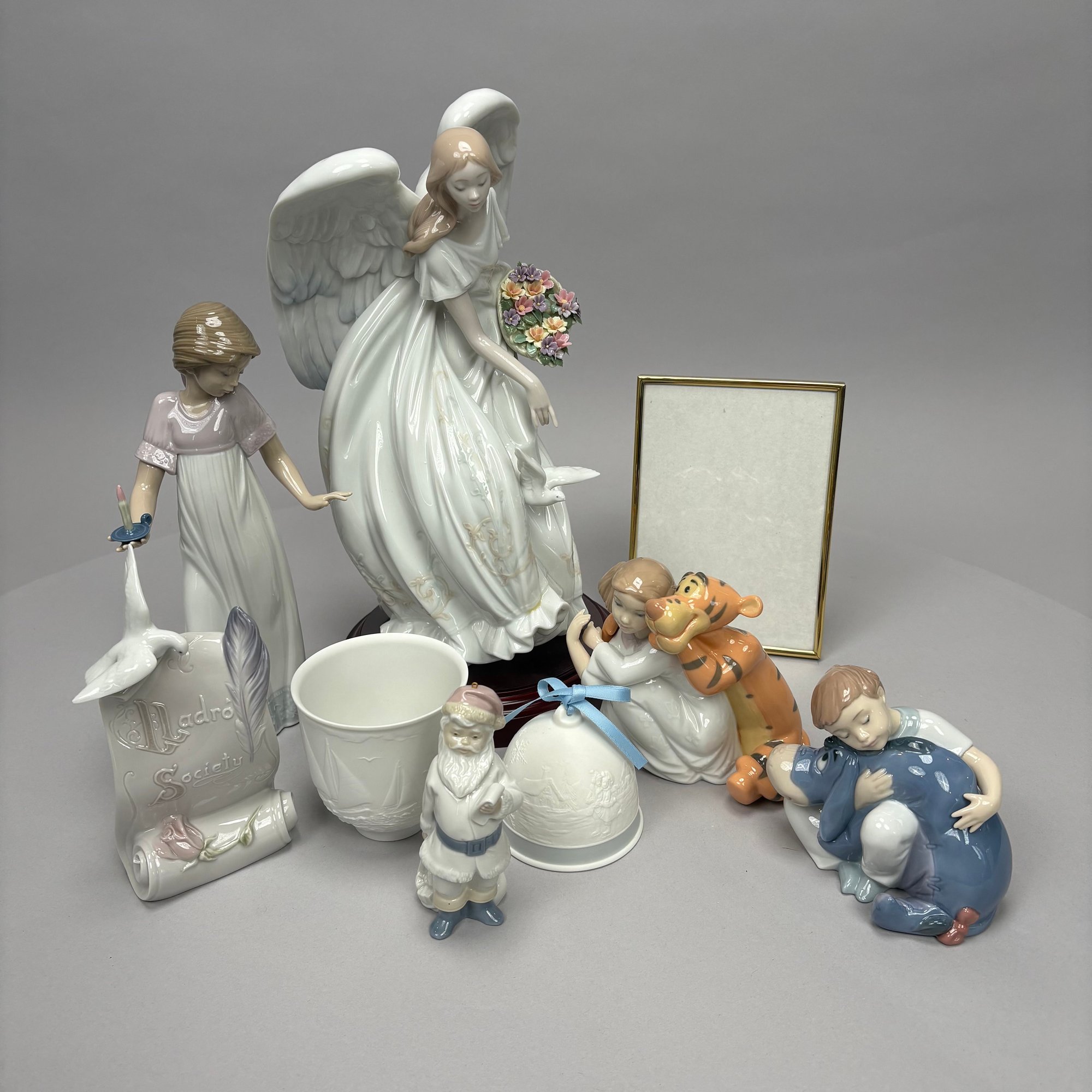 Comprising a Lladro #1867 "Flowers of Peace" figure (signed, with base & brass photo frame), a Lladro #7677 "Art Brings Us Together" figure, a Lladro #17657 "Sailing the Seas" cup, a Lladro #17616 "Winter Bell", a Lladro #5842 "Santa Claus" figure, a Nao by Lladro #1155 "Nina con Palmatoria" figure, a Nao by Lladro #2001595 "Hugs With Tigger" figure (signed), and a Nao by Lladro #2001594 "Dreams With Eeyore" figure (signed); each housed in the original box.