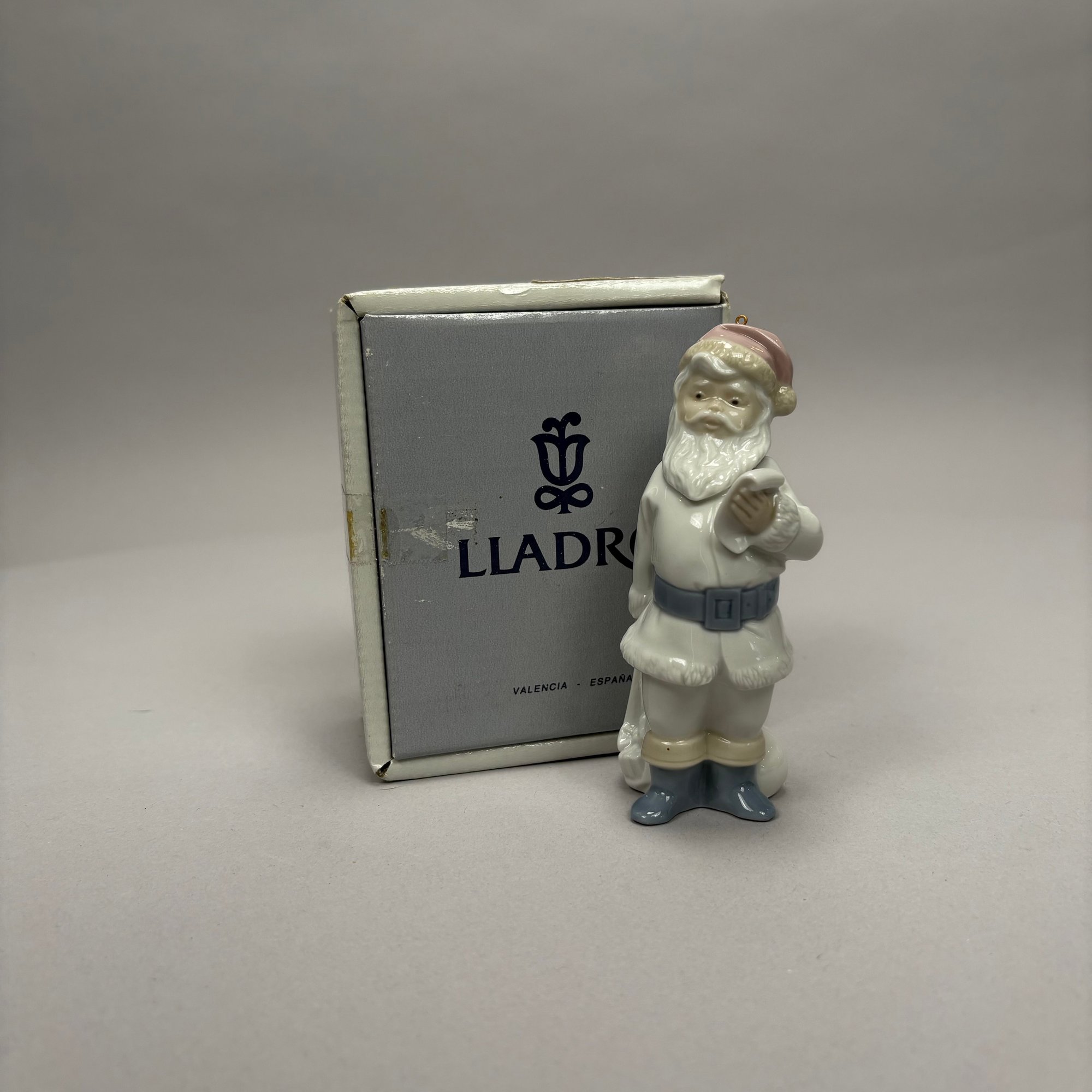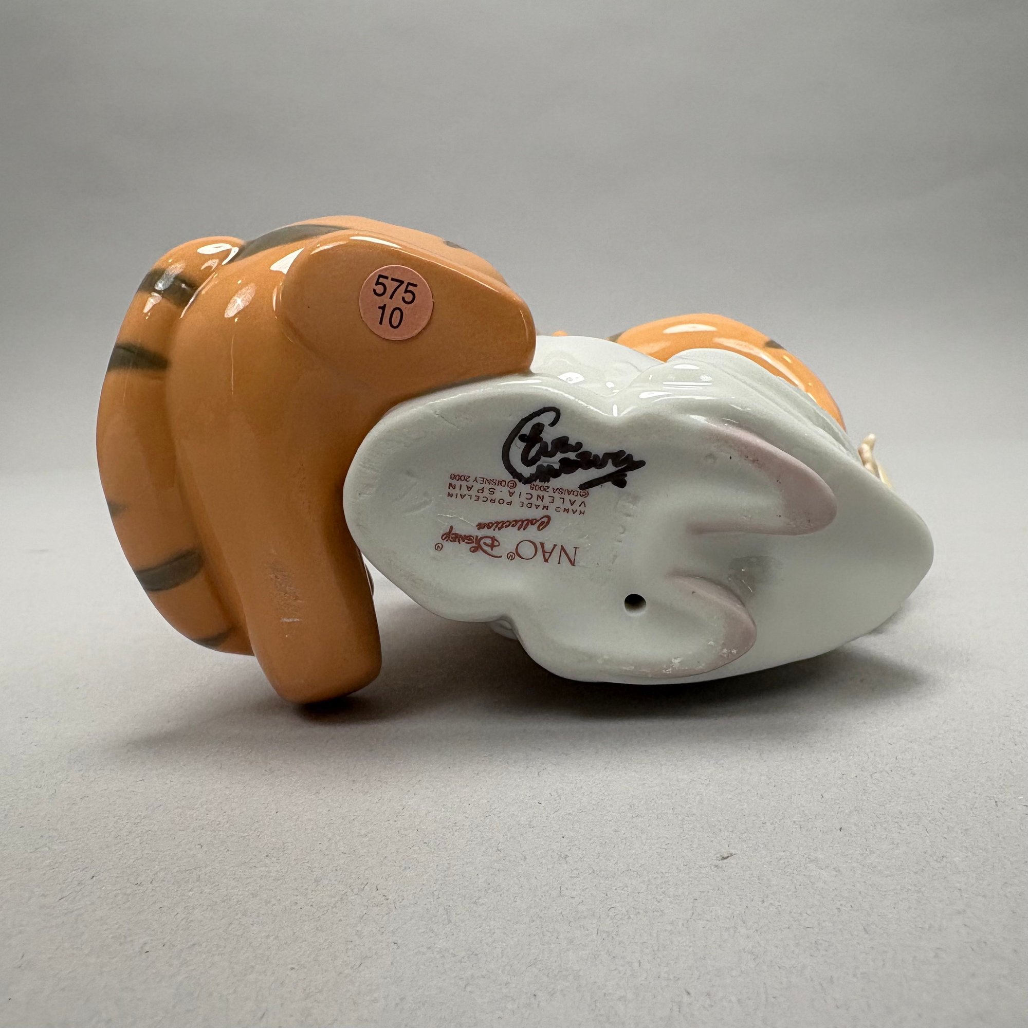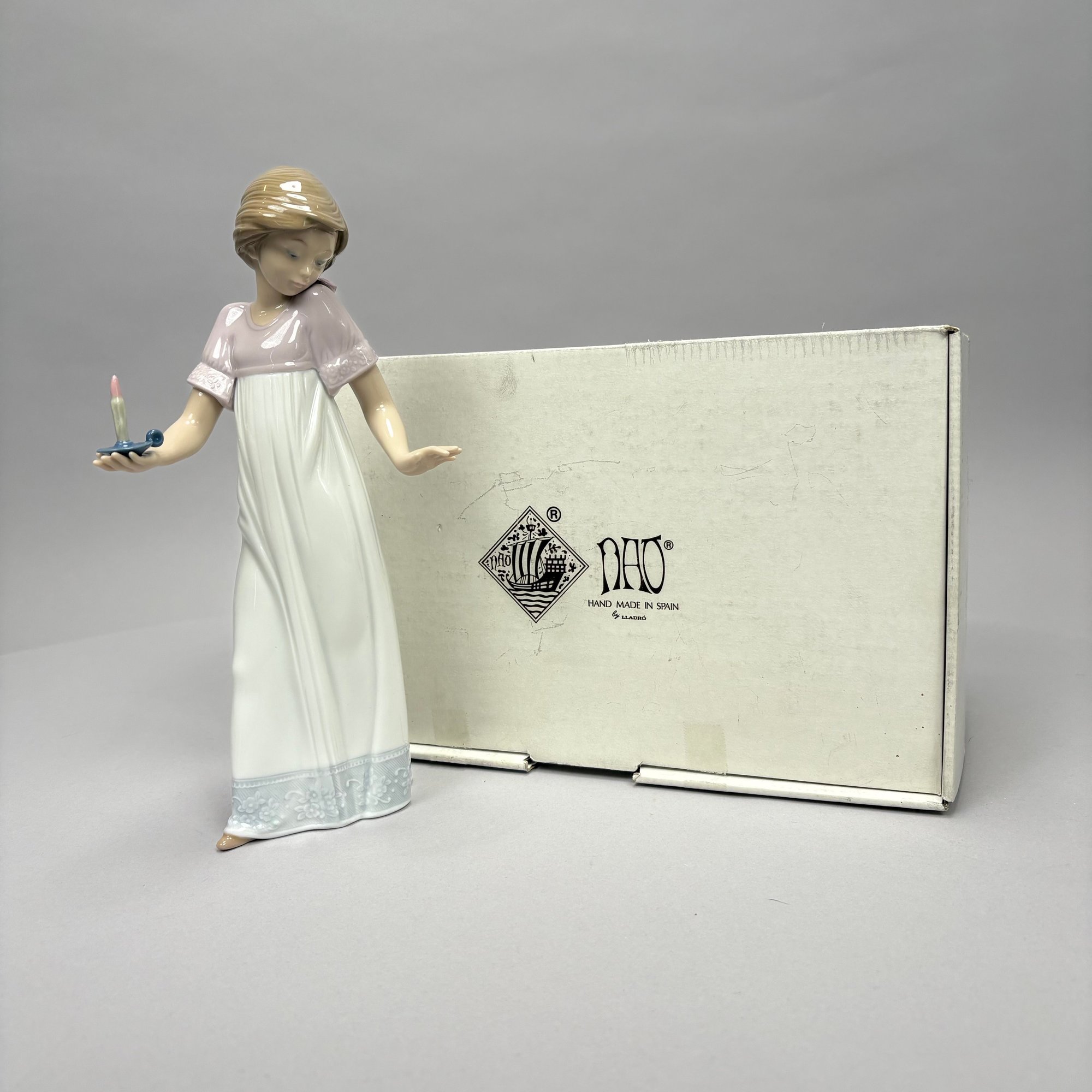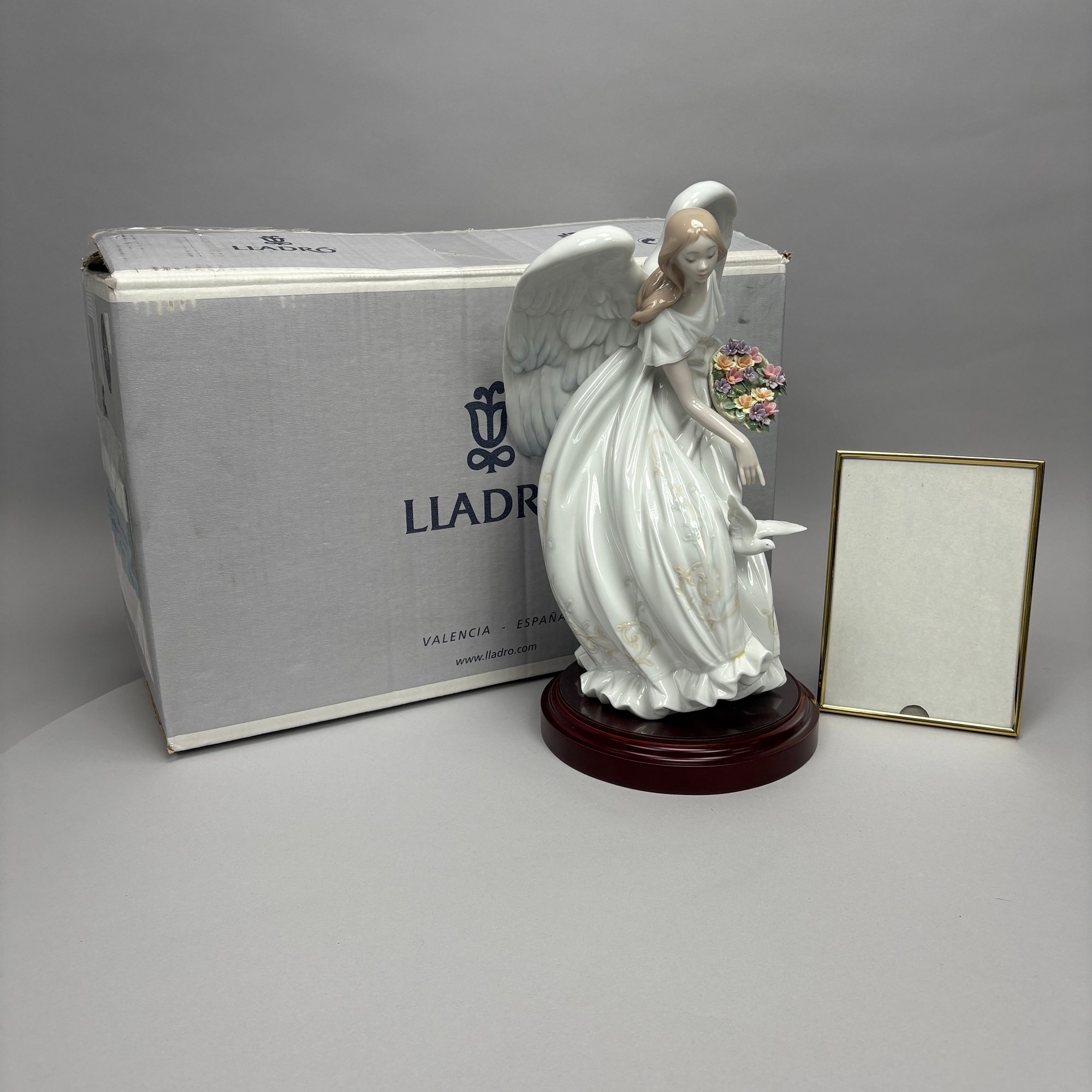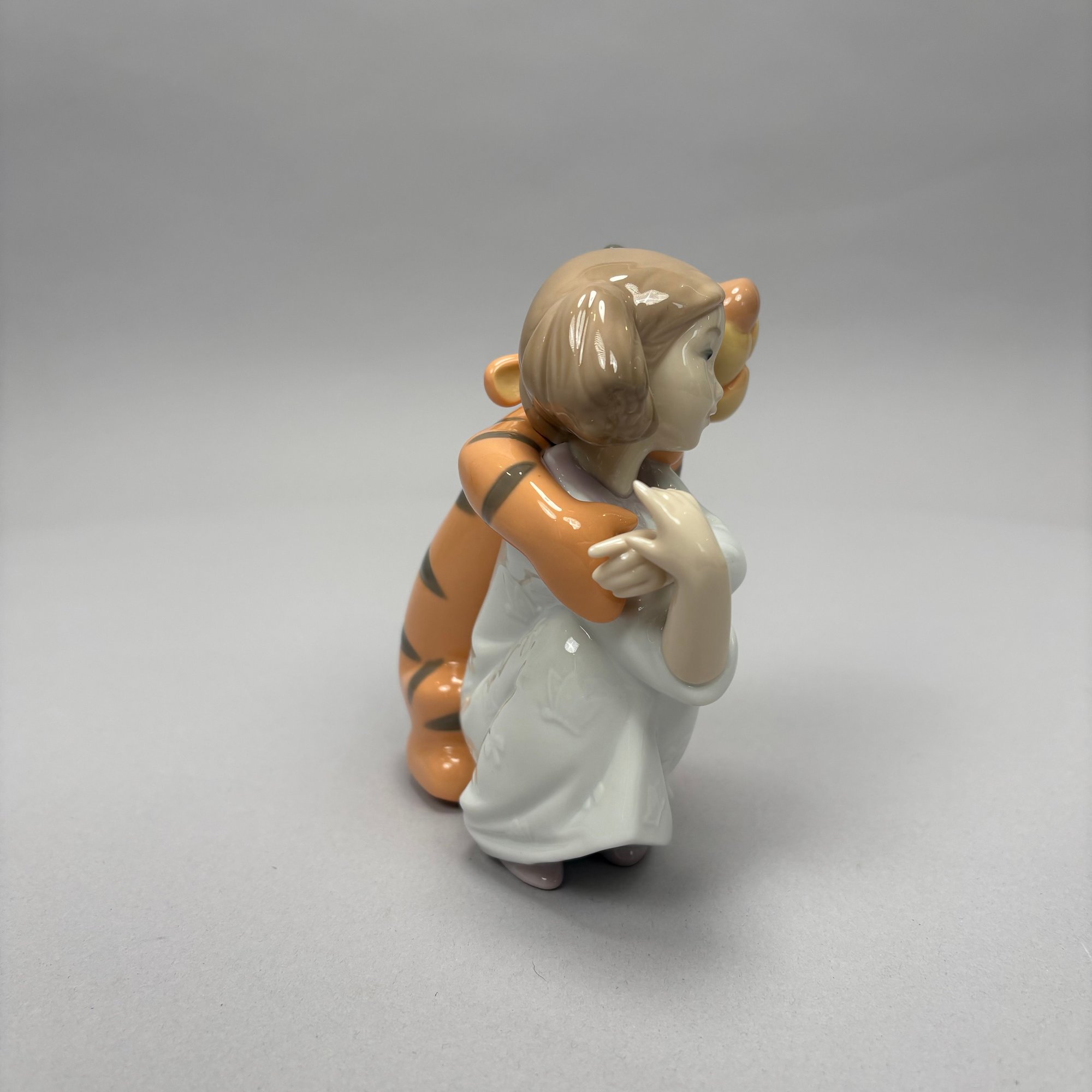 Comprising a Lladro #1867 "Flowers of Peace" figure (signed, with base & brass photo frame), a Lladro #7677 "Art Brings Us Together" figure, a Lladro #17657 "Sailing the Seas" cup, a Lladro #17616 "Winter Bell", a Lladro #5842 "Santa Claus" figure, a Nao by Lladro #1155 "Nina con Palmatoria" figure, a Nao by Lladro #2001595 "Hugs With Tigger" figure (signed), and a Nao by Lladro #2001594 "Dreams With Eeyore" figure (signed); each housed in the original box.