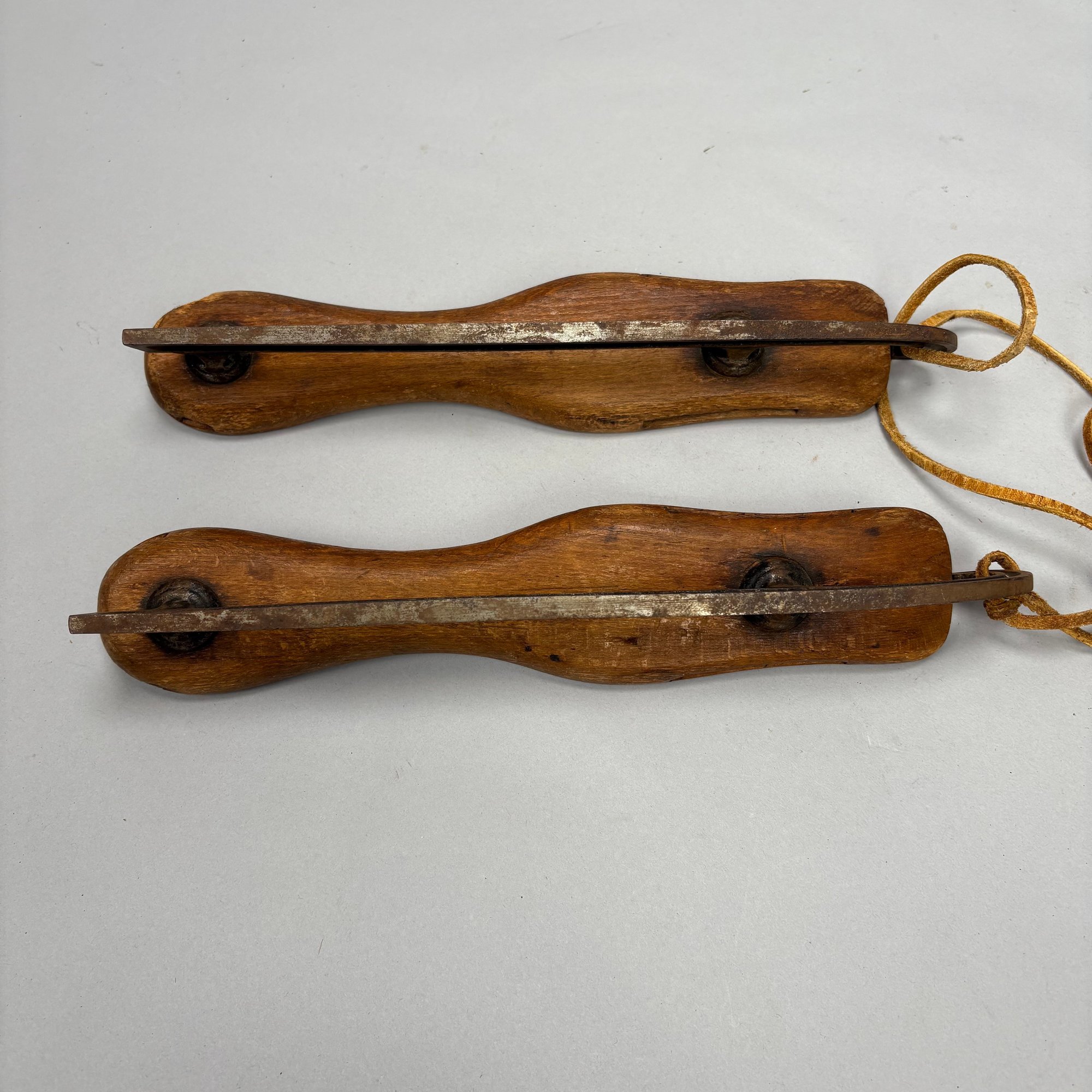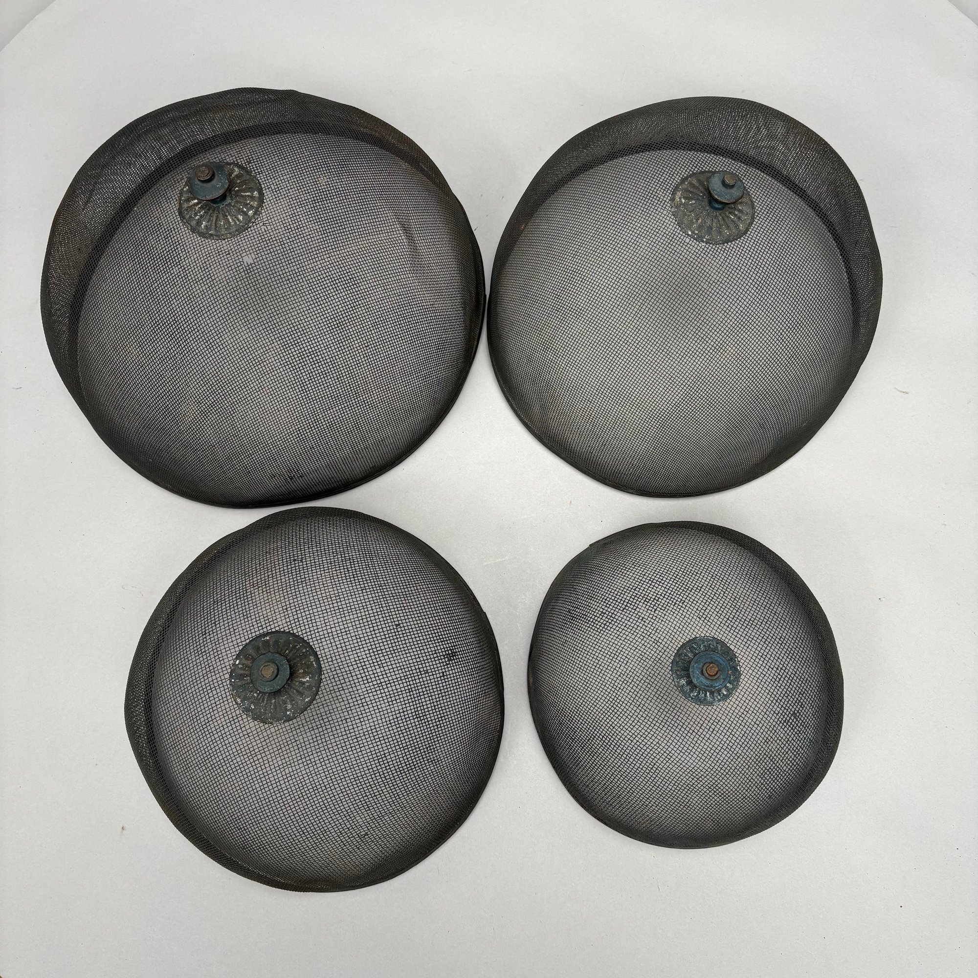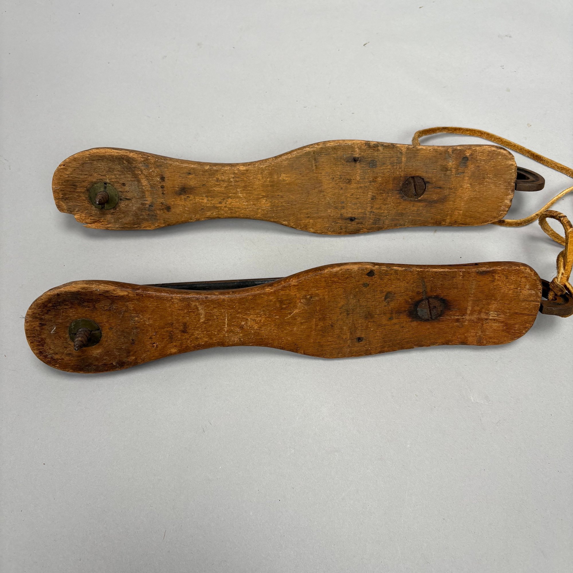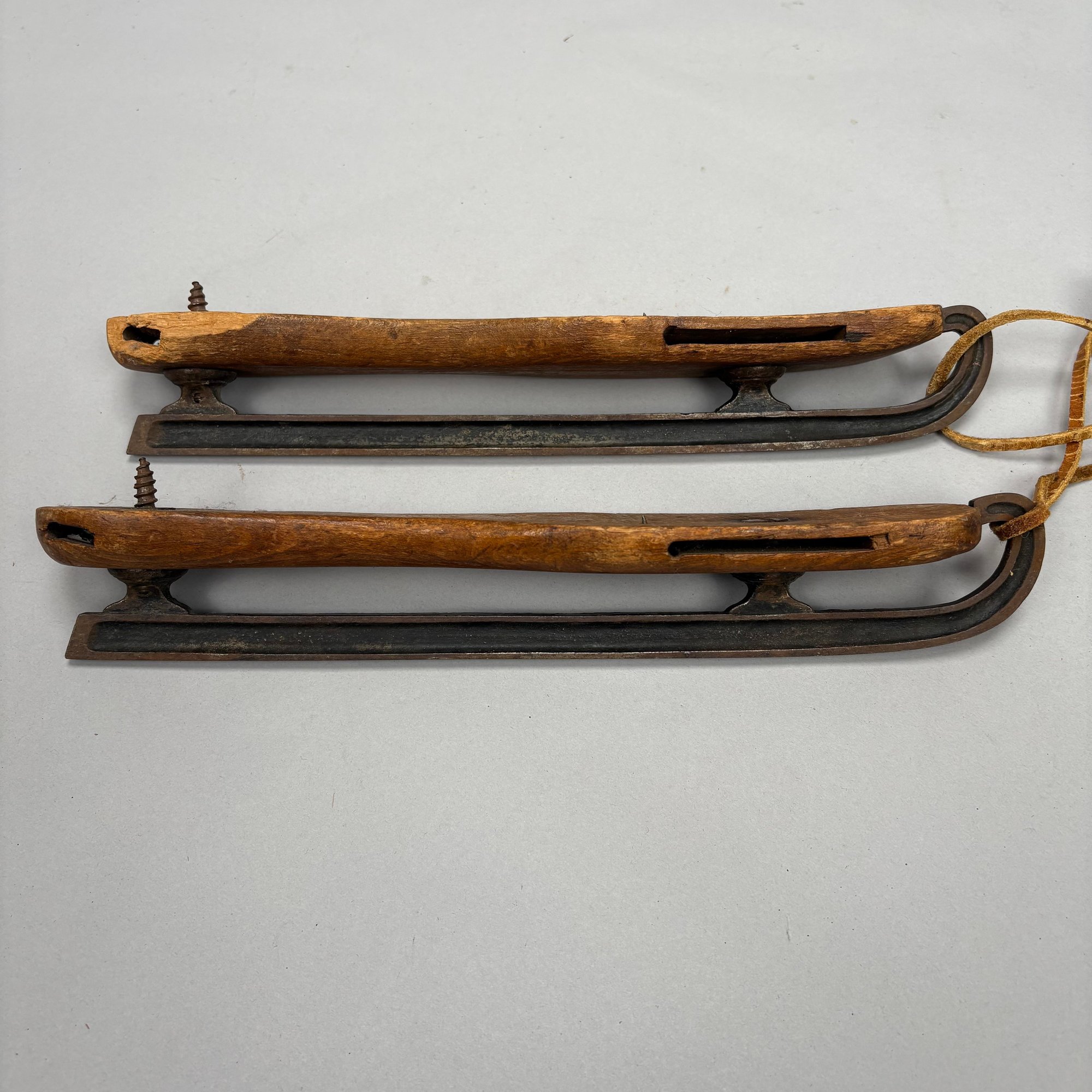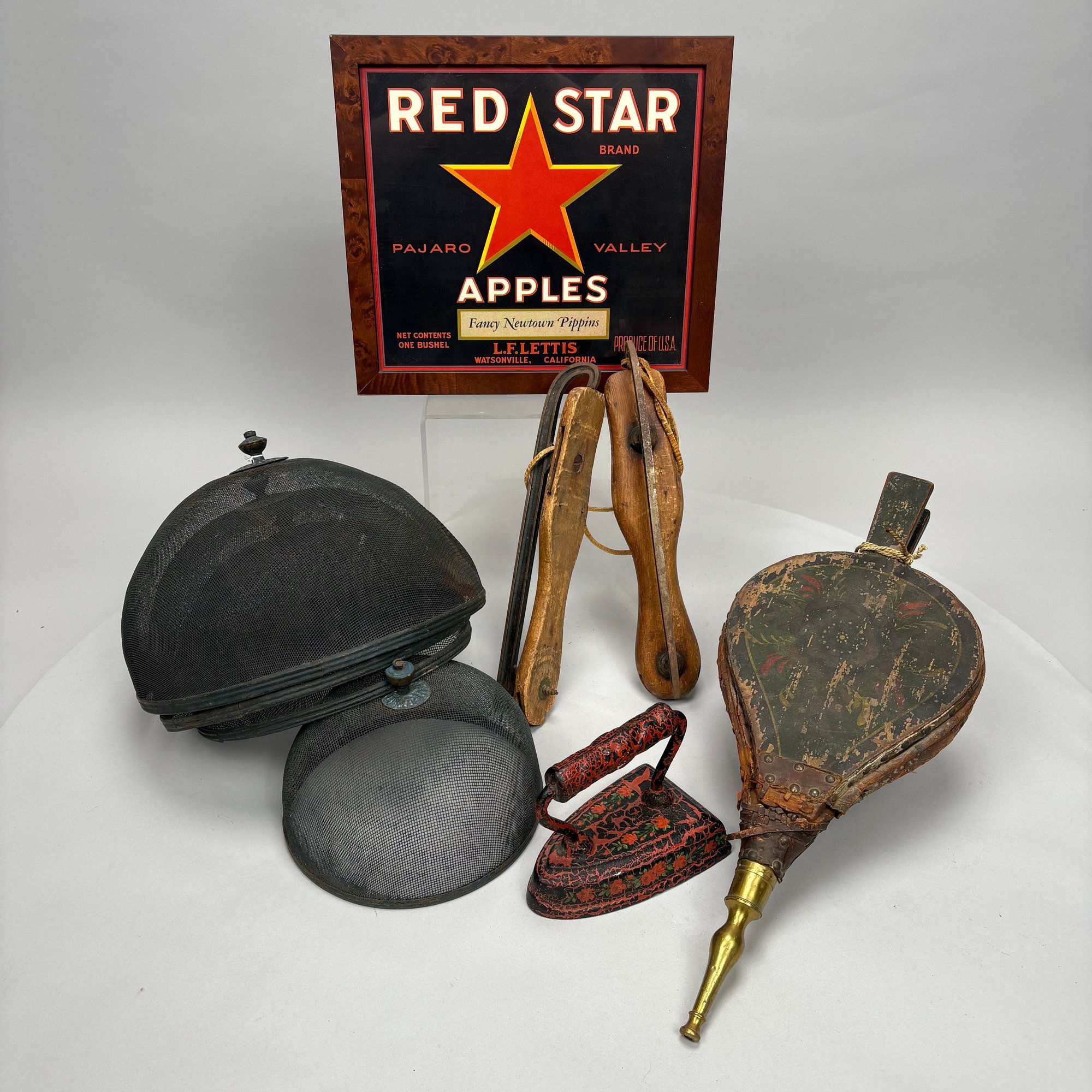 Eight Wood, Cast-Iron, Mesh and Glass Country Items, 19th and 20th Century. Comprising a pair of ice skates with screw-in heels, an iron, a bellows, set of four graduated food covers and a "RED STAR APPLES" advertisement.