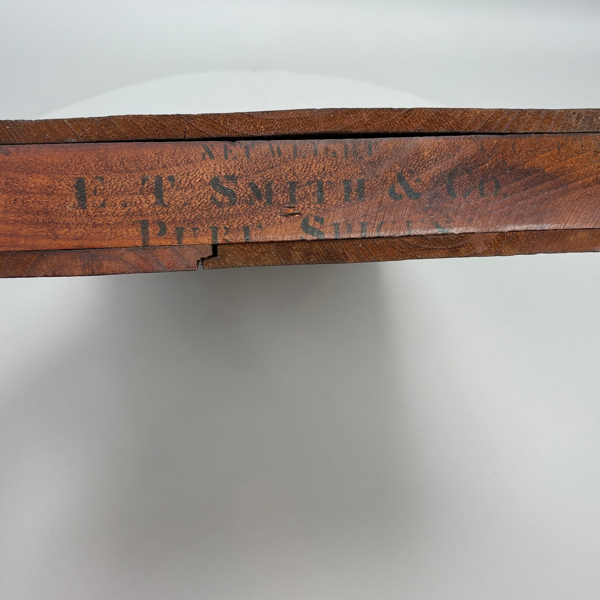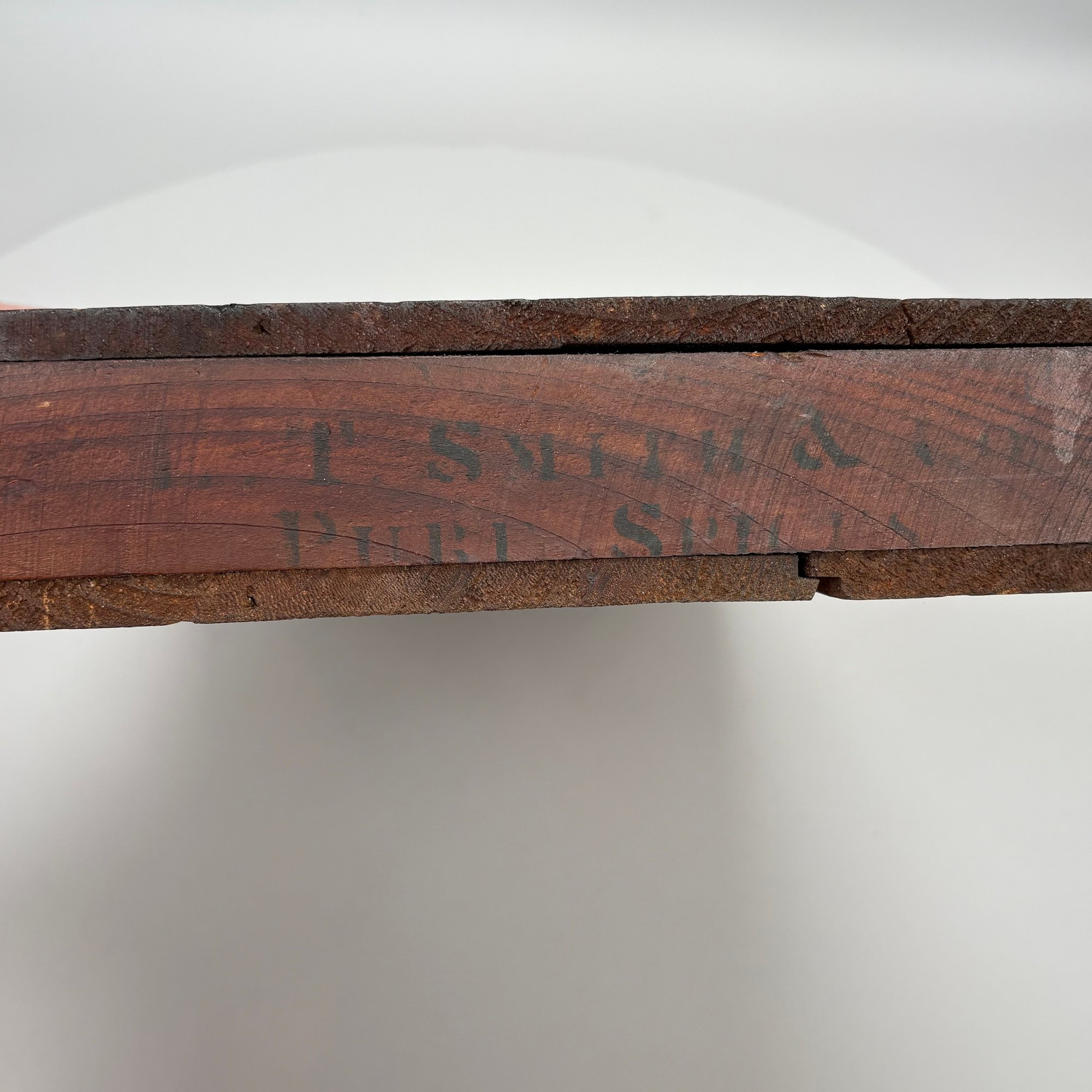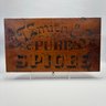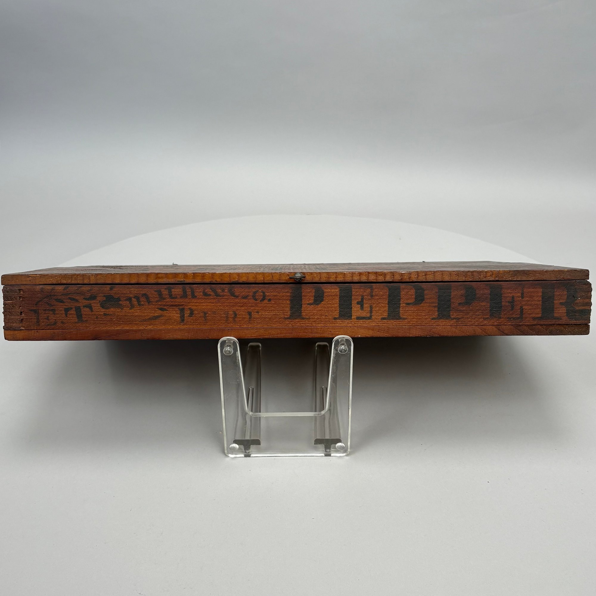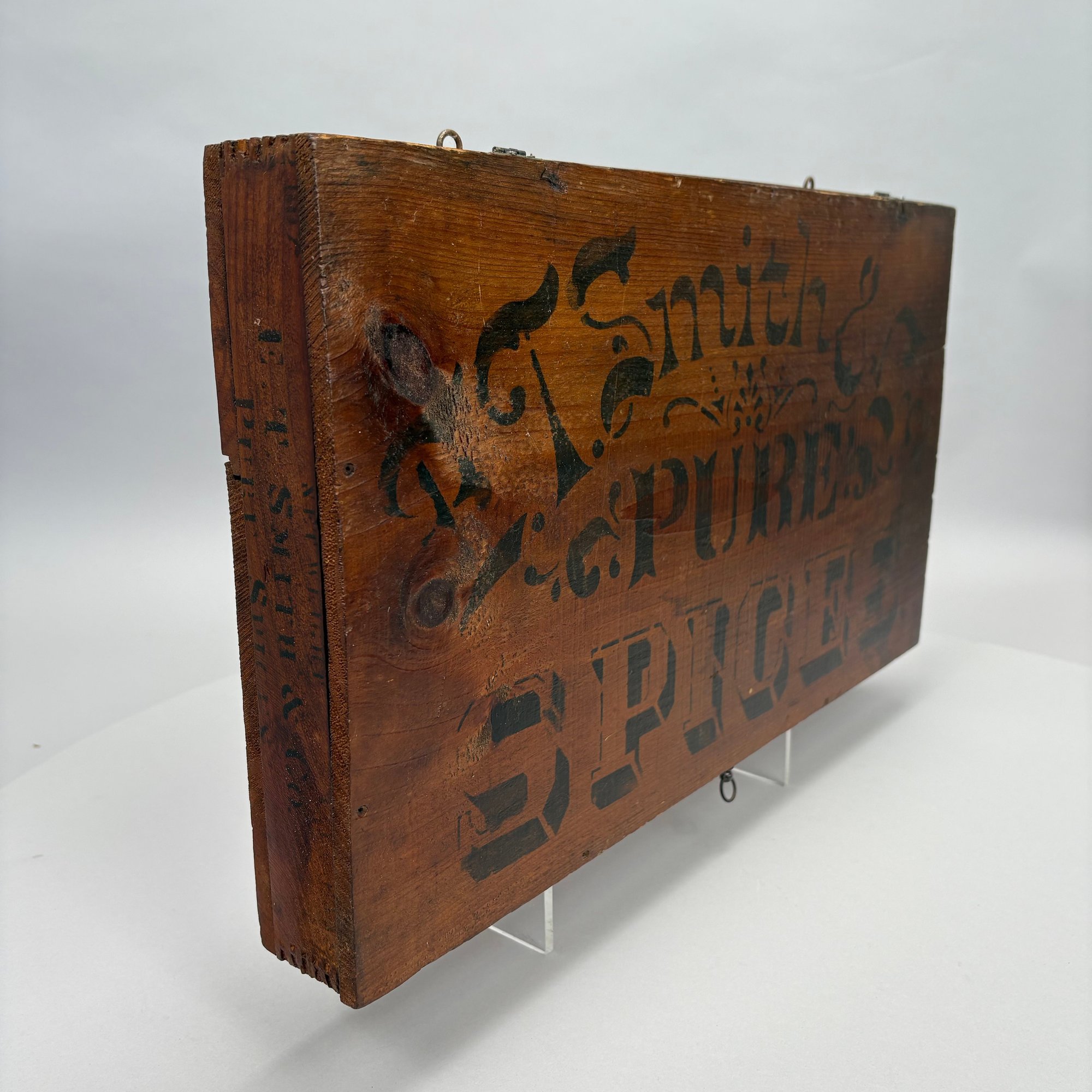 Elliot T. Smith & Co. Stained Pine Spice Box, Wholesale Grocers, Worcester, Massachusetts, Circa 1889. Stencilled in black letters on the cover "E.T. Smith & Co./ PURE SPICES" and on the front of the box "E.T. Smith & Co./ PURE PEPPER," the interior divided into three rows for containers.