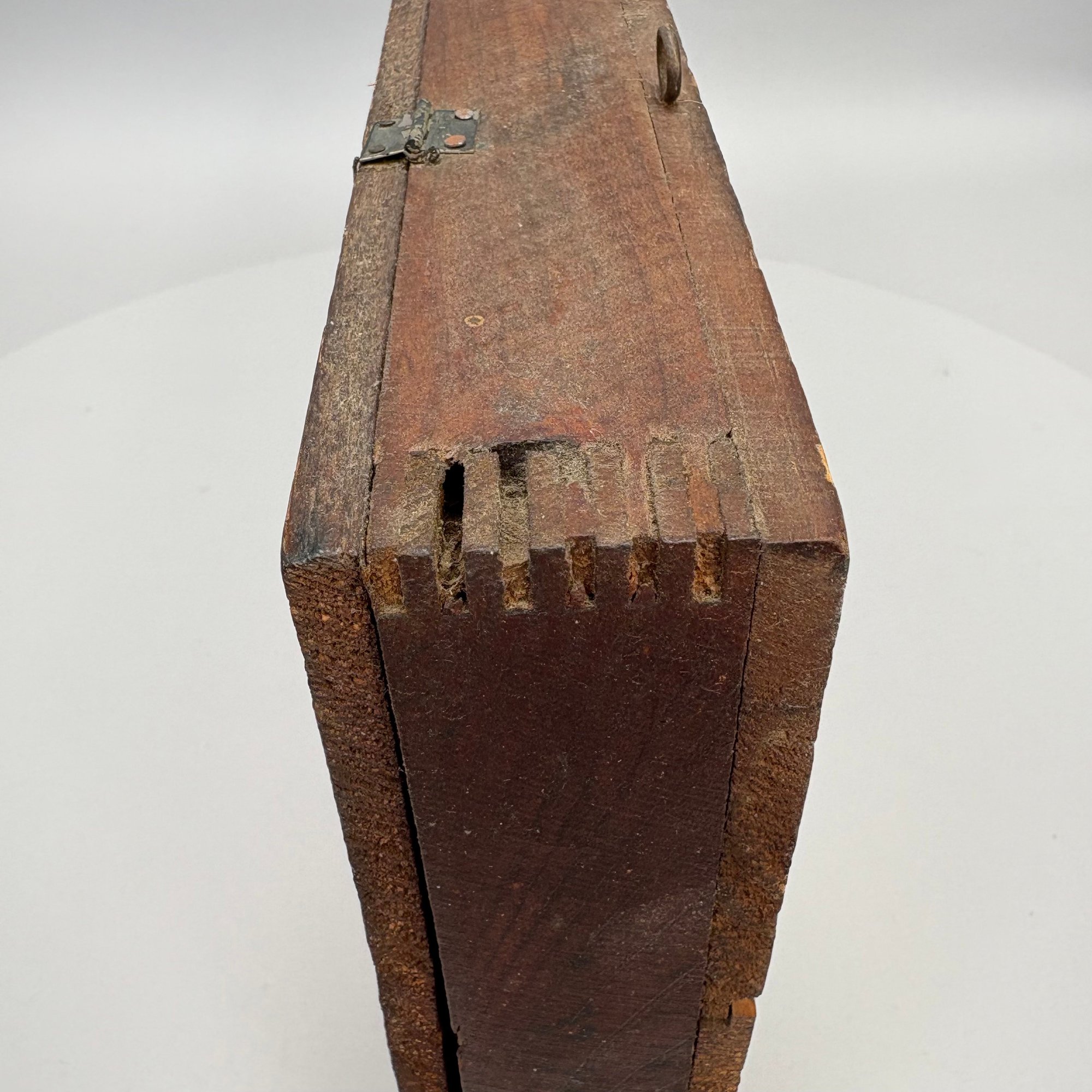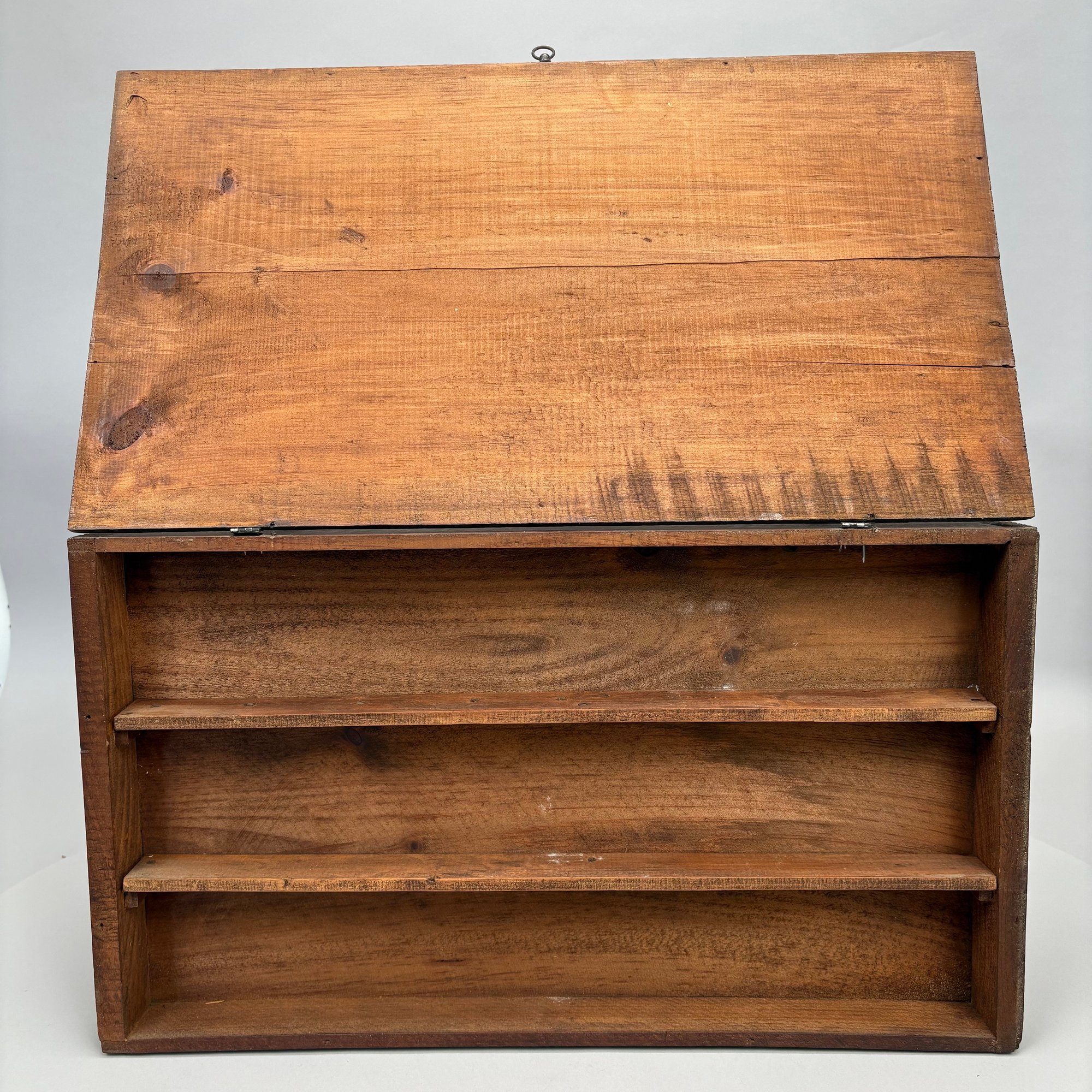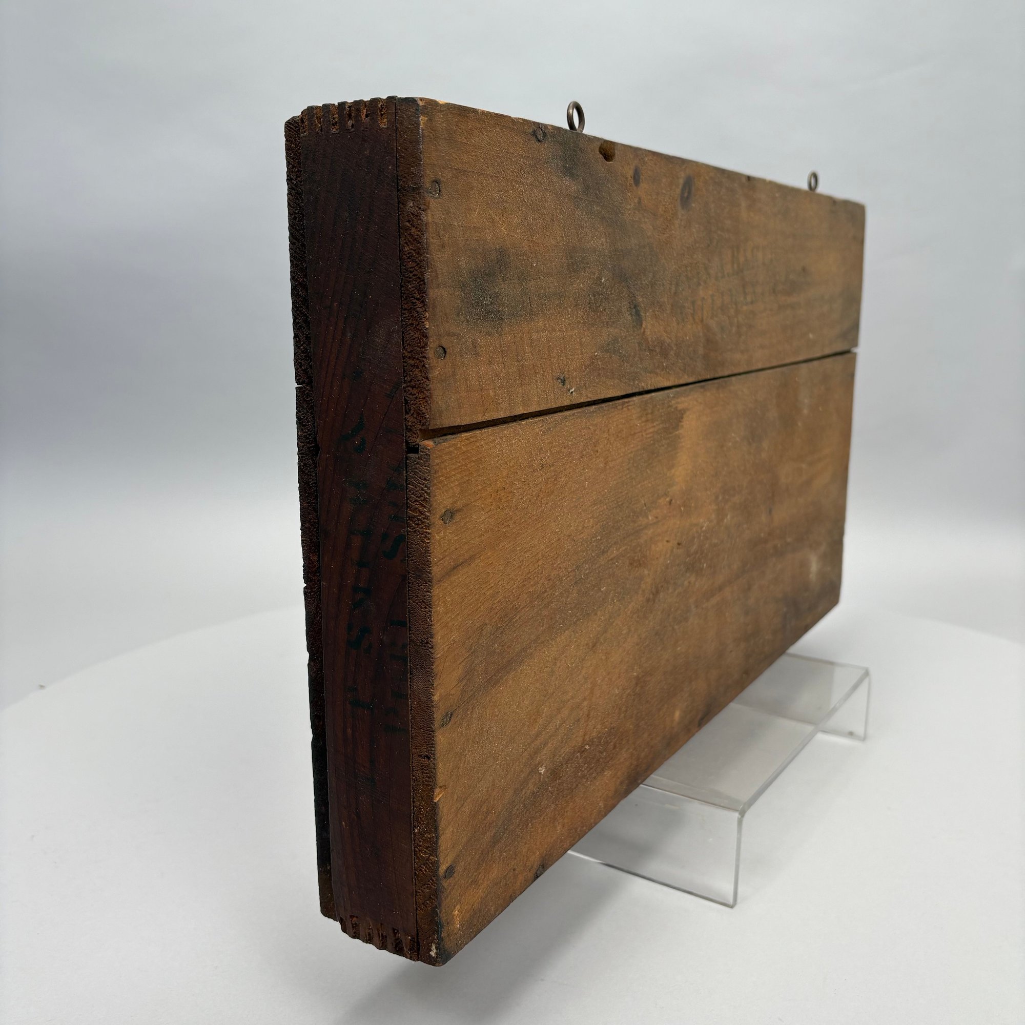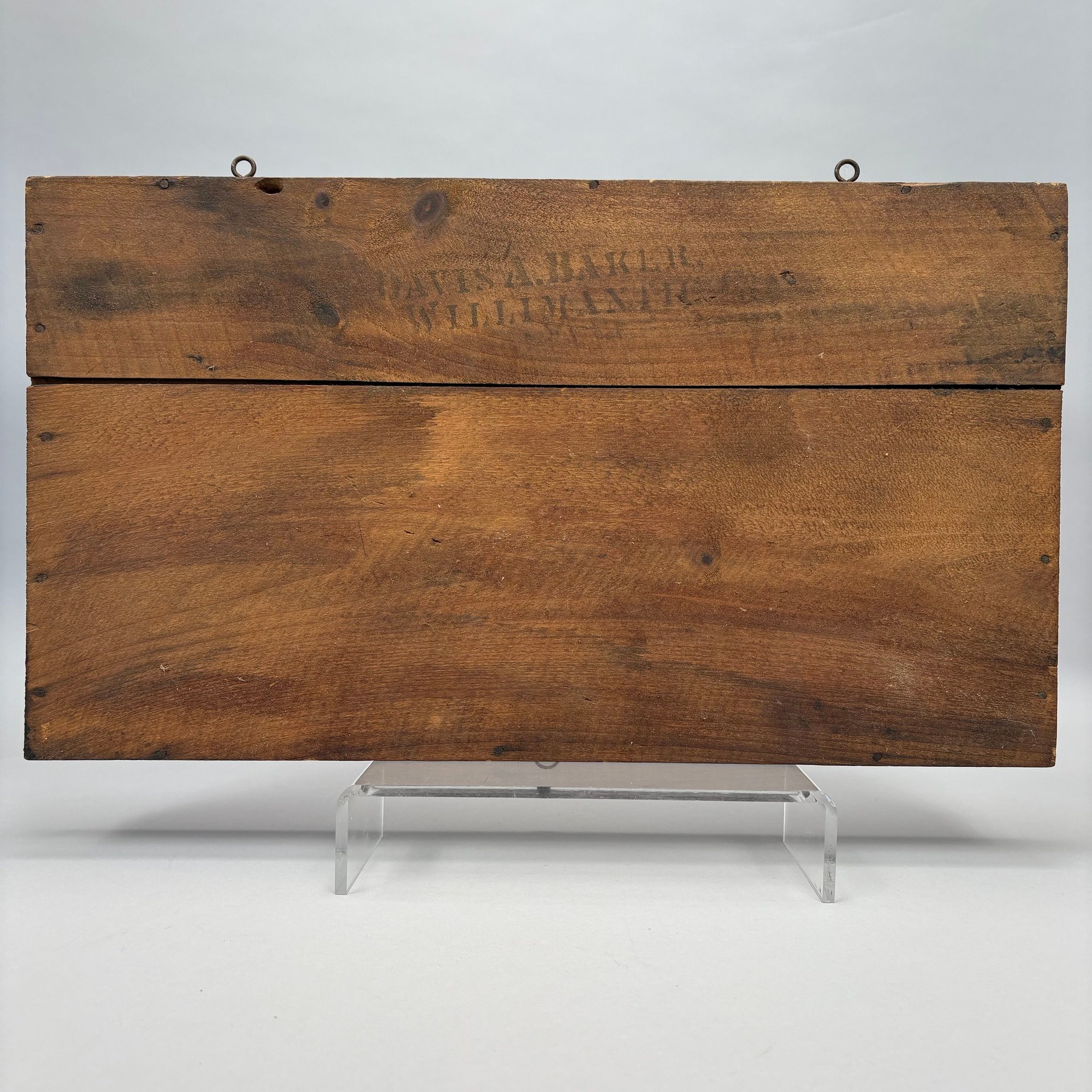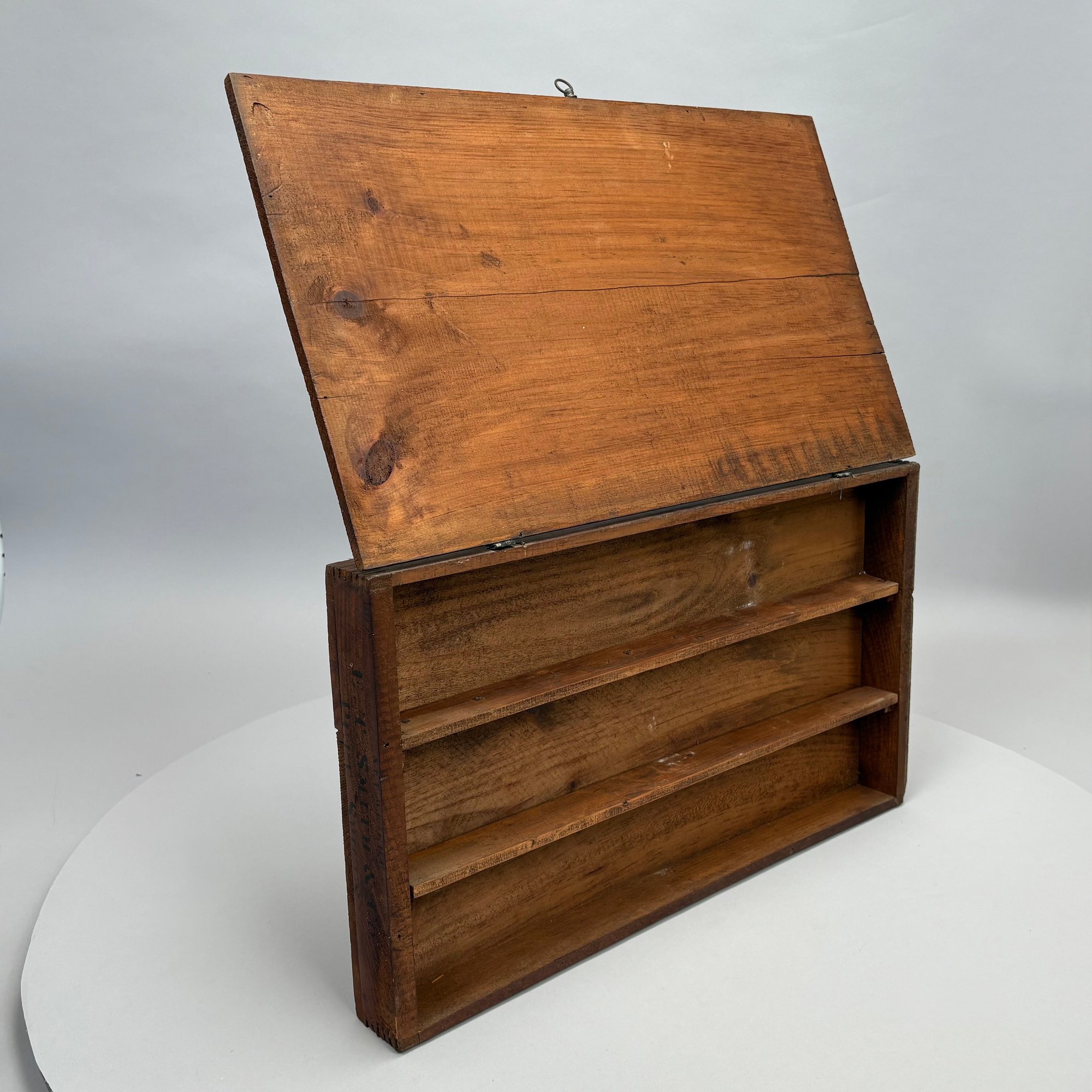 Elliot T. Smith & Co. Stained Pine Spice Box, Wholesale Grocers, Worcester, Massachusetts, Circa 1889. Stencilled in black letters on the cover "E.T. Smith & Co./ PURE SPICES" and on the front of the box "E.T. Smith & Co./ PURE PEPPER," the interior divided into three rows for containers.