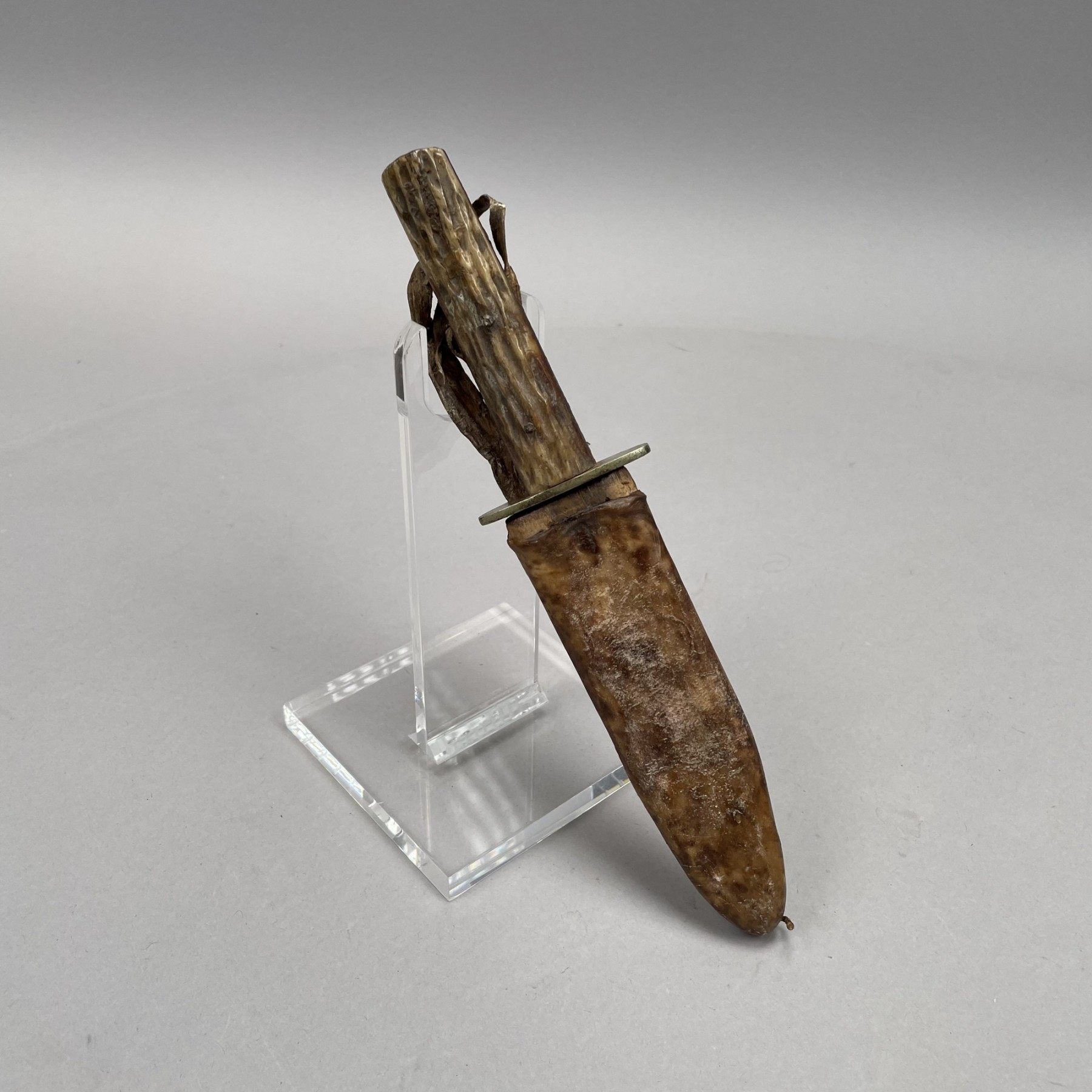 The blade marked "JOSEPH ALLEN & SONS - SHEFFIELD ENGLAND," stag's antler handle, the wood scabbard covered in skin stitched with sinew.