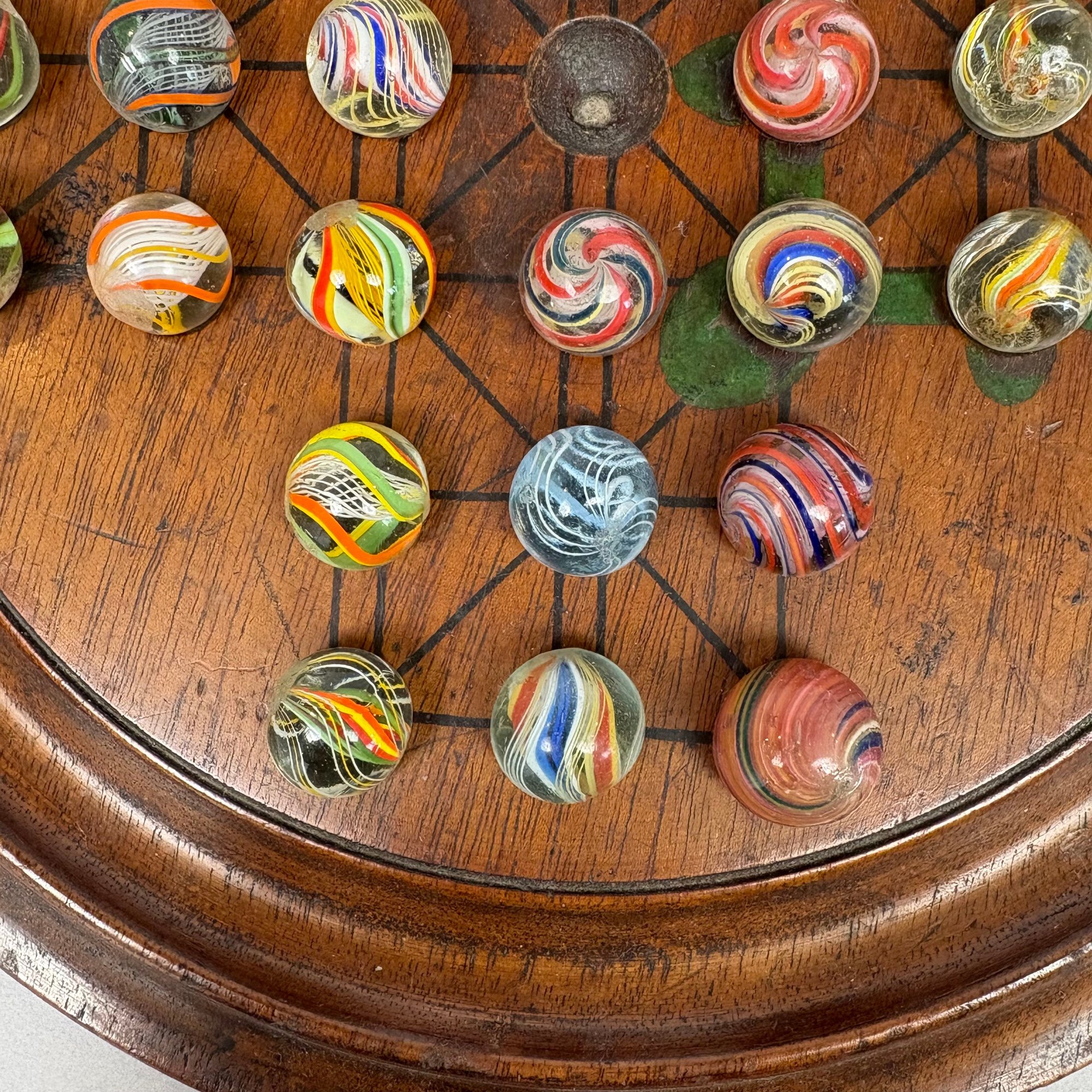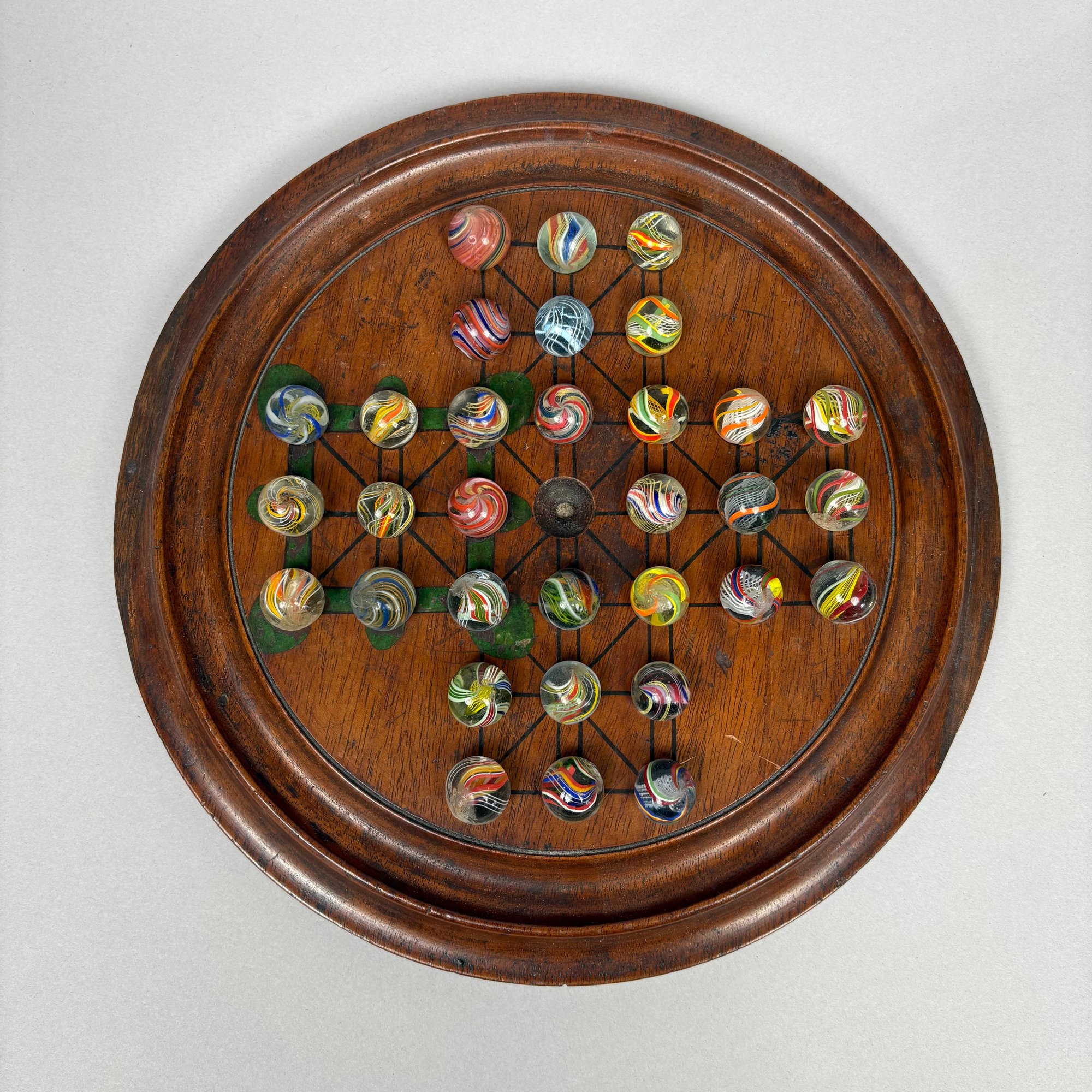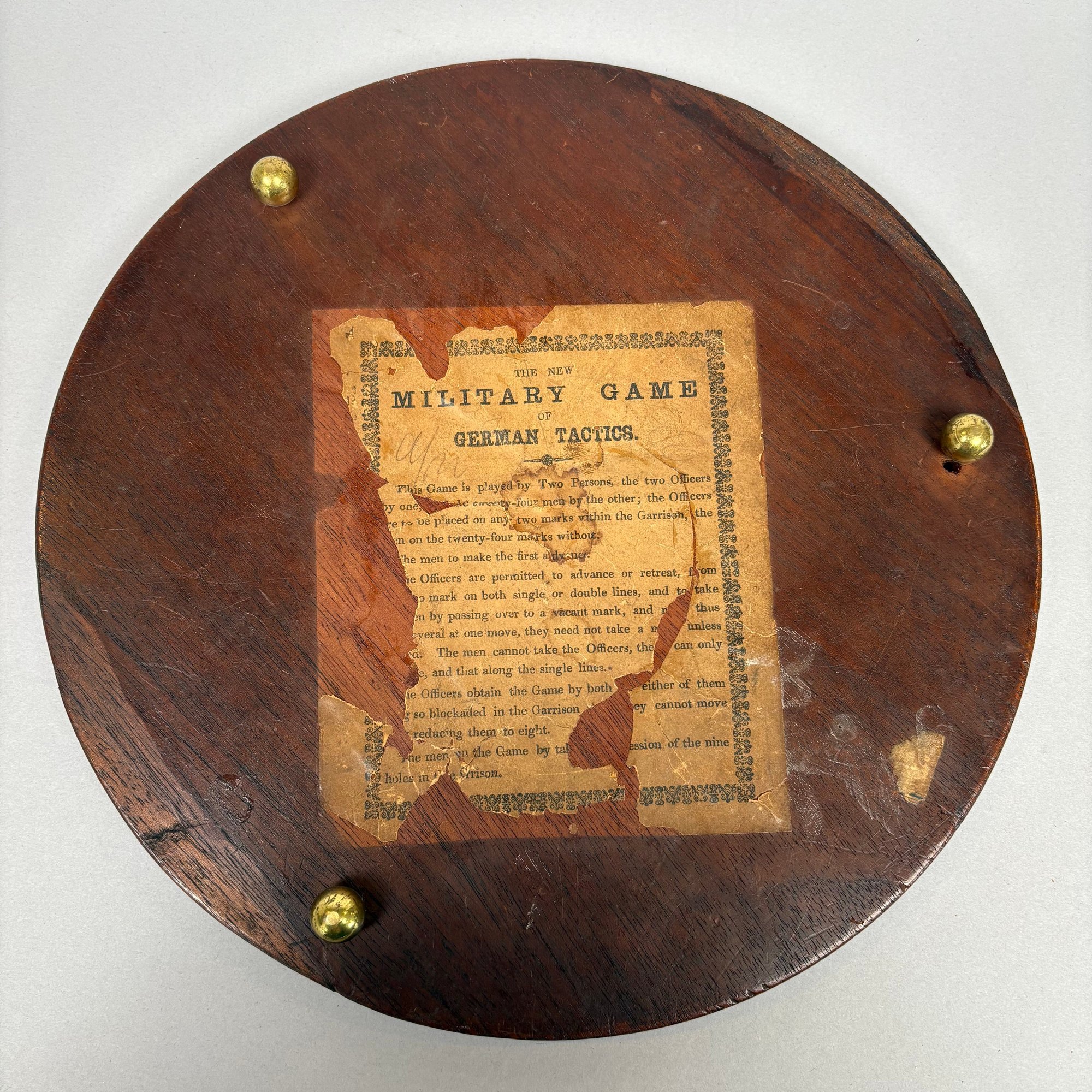 English German Tactics/ Solitaire Marble Game, Circa 1920, Possibly Made by John Jaques & Son. The walnut circular board with hemispherical holes for thirty-three marbles, all joined by dark lines, with nine holes linked by a square marked out in dark green, affixed on the bottom with instructions on how to play "The New Military Game of German Tactics," with thirty-two marbles.