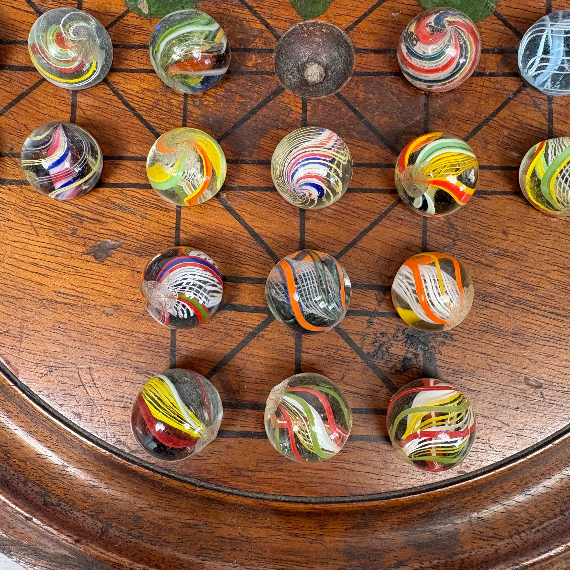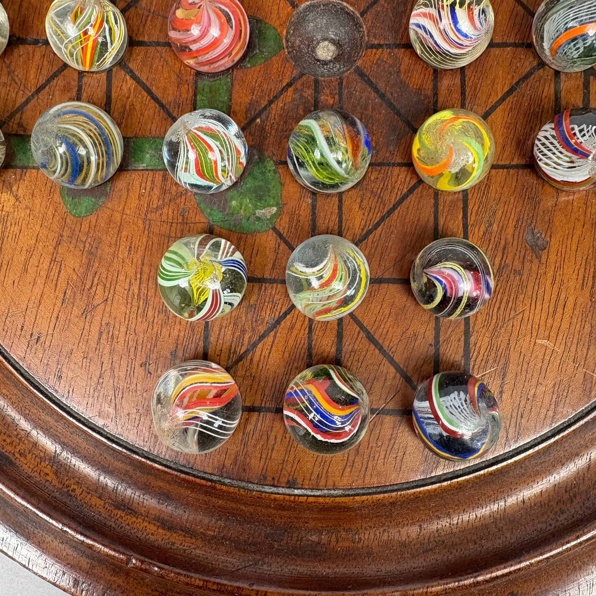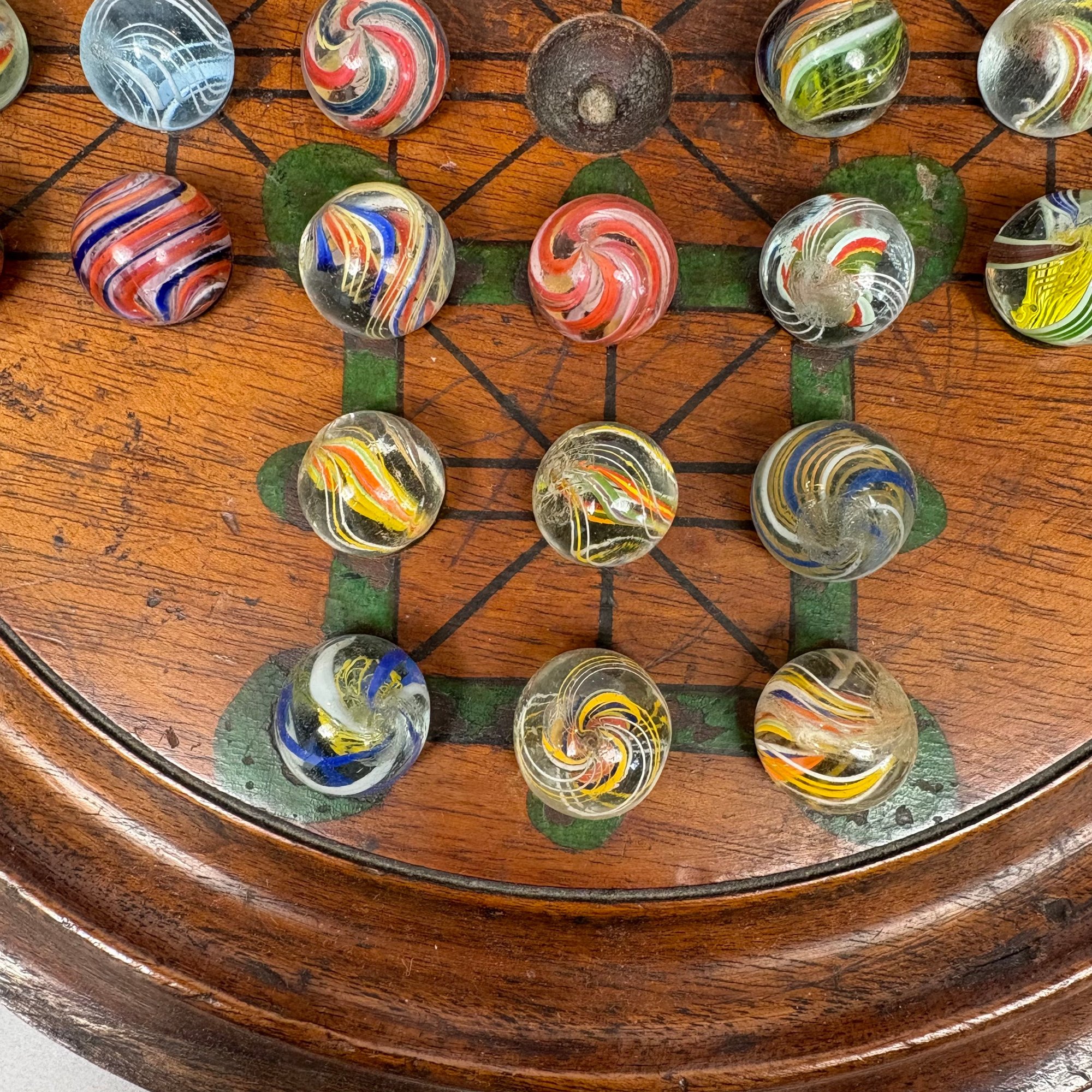 English German Tactics/ Solitaire Marble Game, Circa 1920, Possibly Made by John Jaques & Son. The walnut circular board with hemispherical holes for thirty-three marbles, all joined by dark lines, with nine holes linked by a square marked out in dark green, affixed on the bottom with instructions on how to play "The New Military Game of German Tactics," with thirty-two marbles.