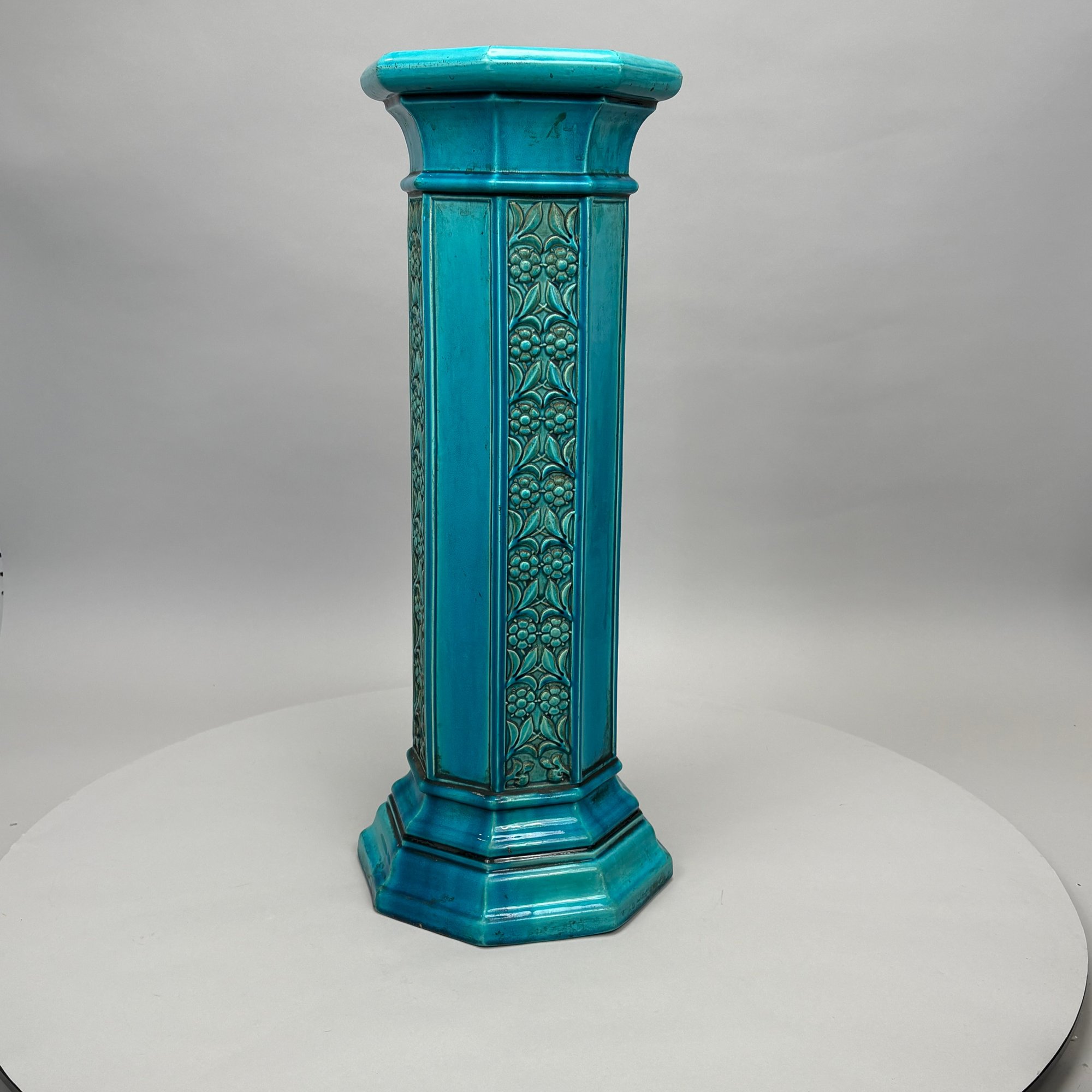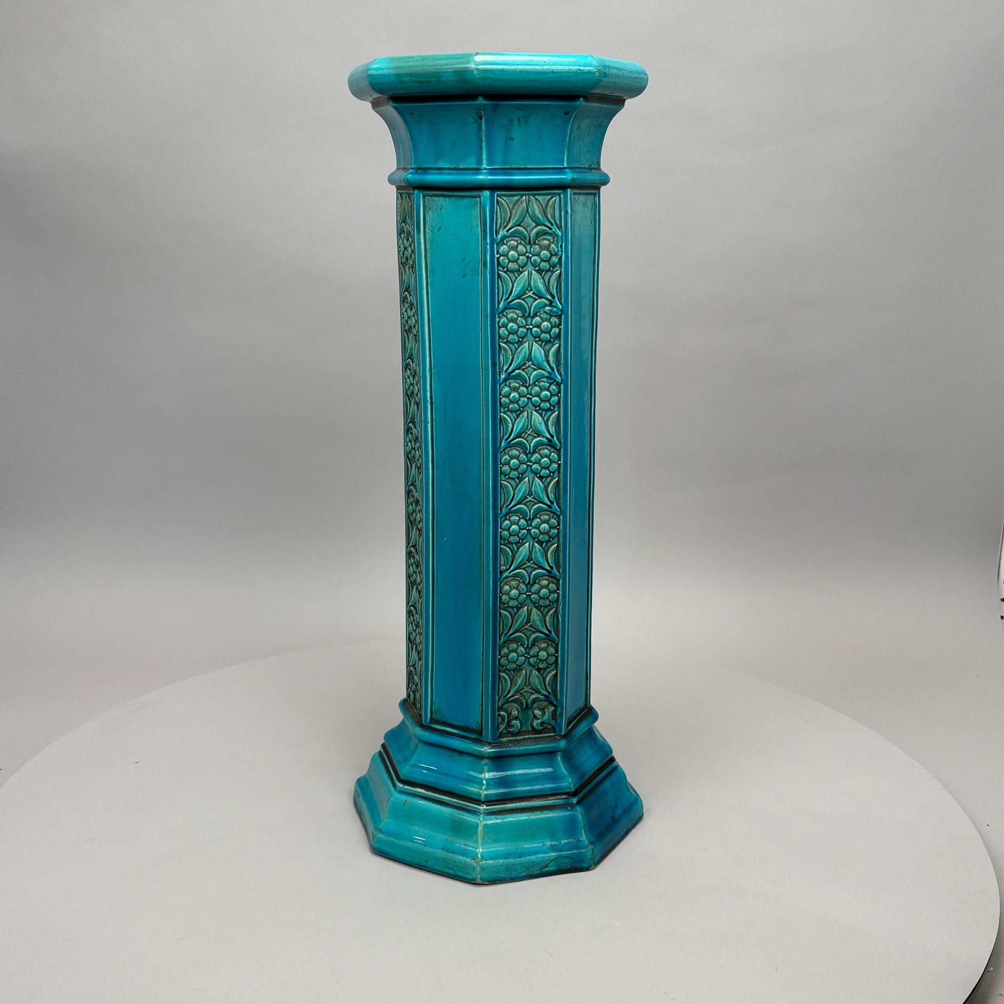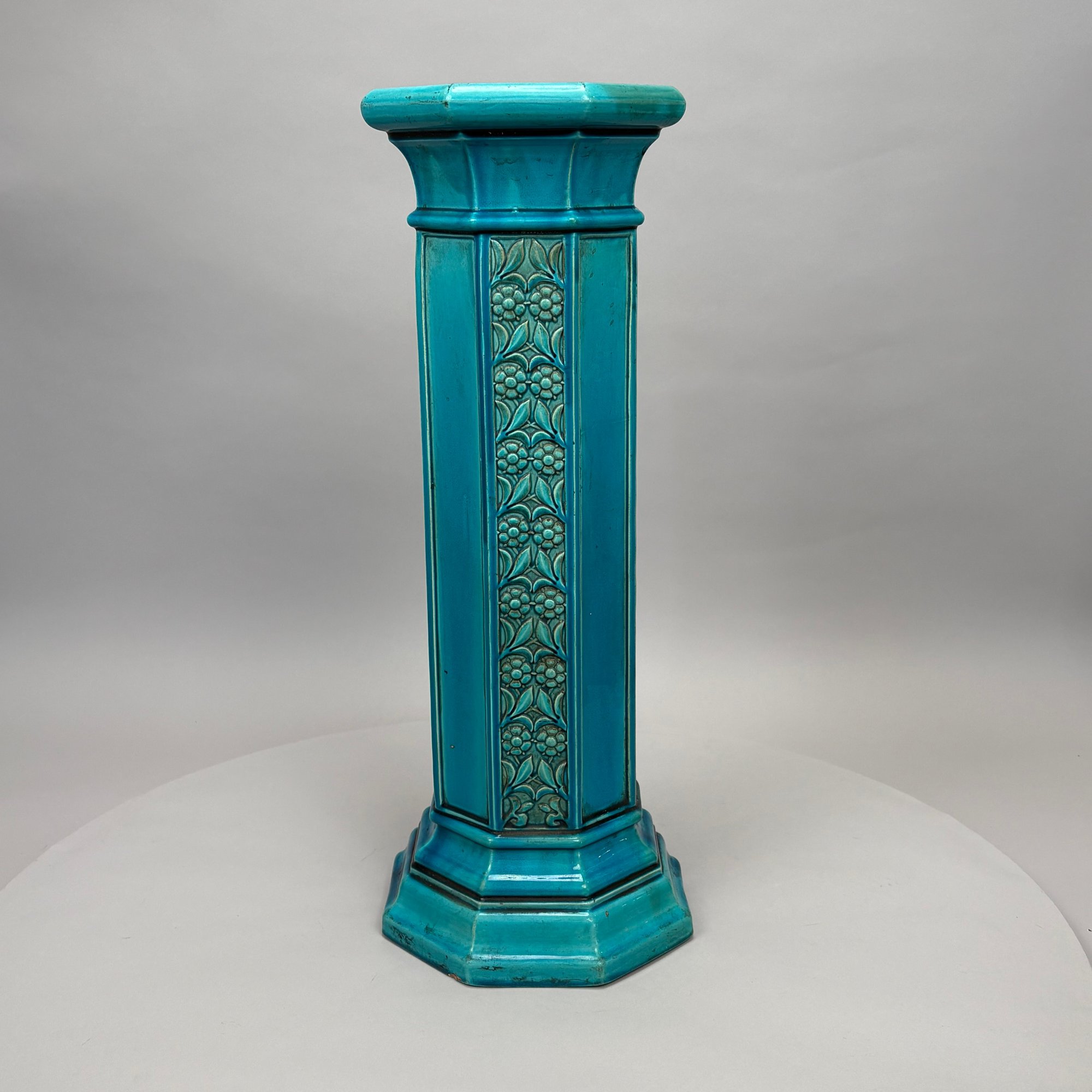 English Glazed Faience Pedestal, Burmantofts Pottery, Leeds, 1882-1904. Of octagonal shape and covered in turquoise glaze, molded with plain panels alternating with strips of double flower blossoms, on a stepped base, impressed BF cipher, "ENGLAND," pattern "1852" and initials "JL" possibly for John Lassey.