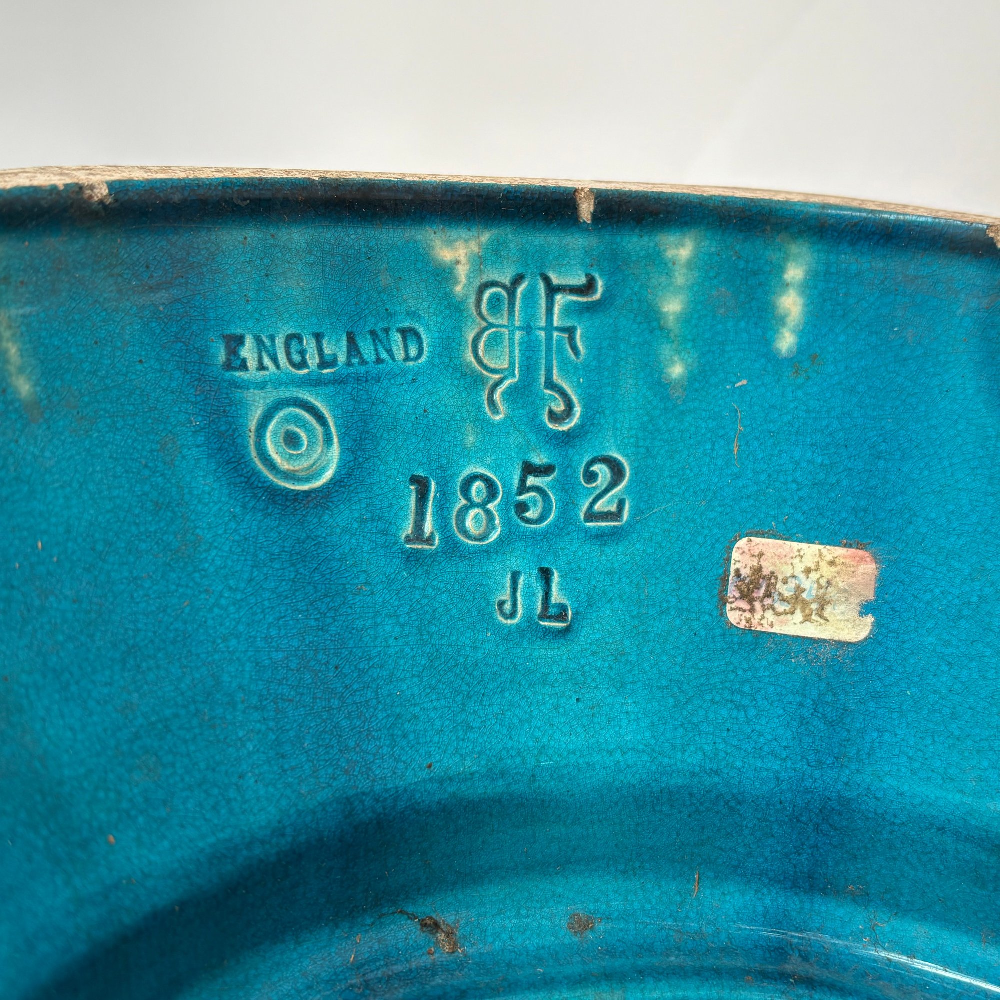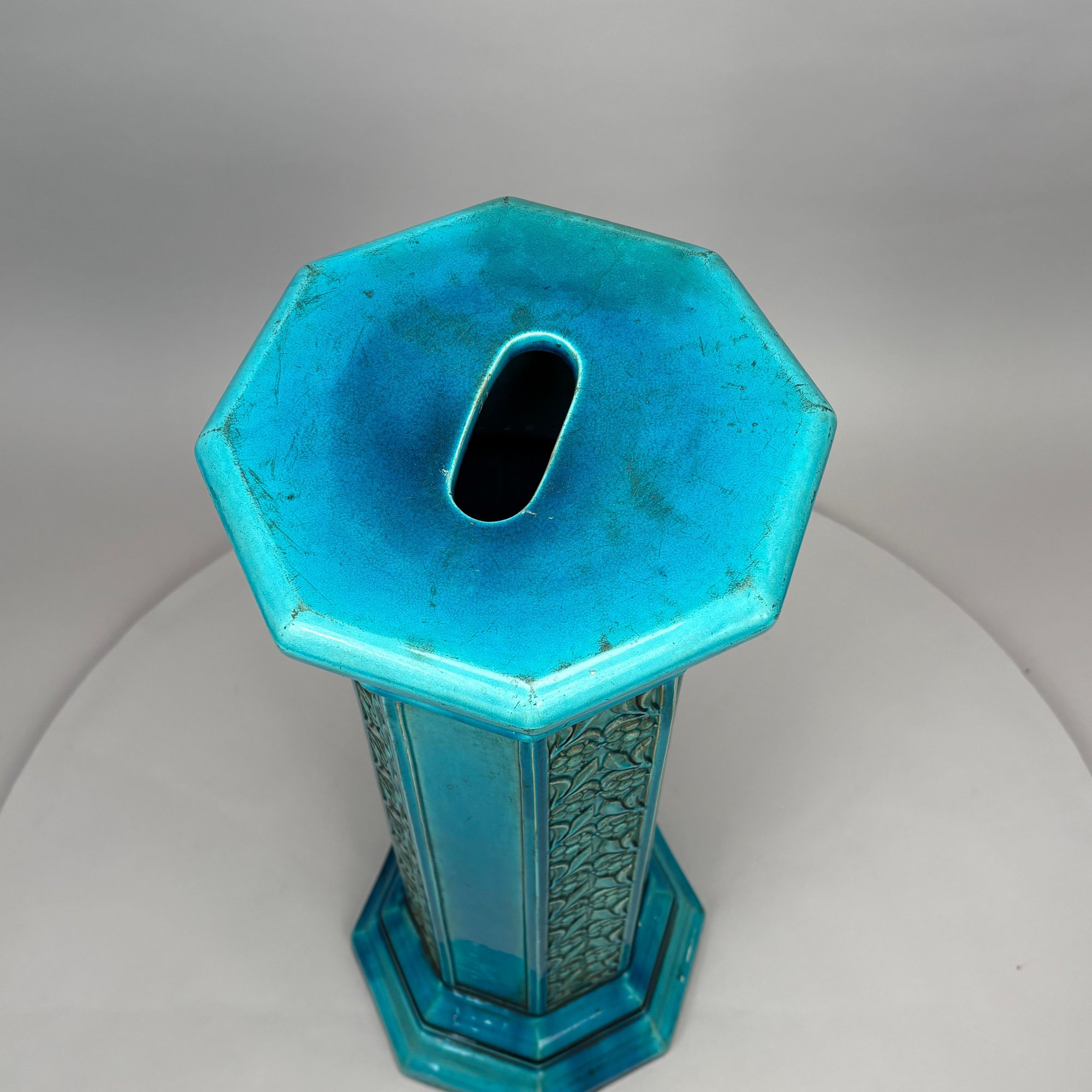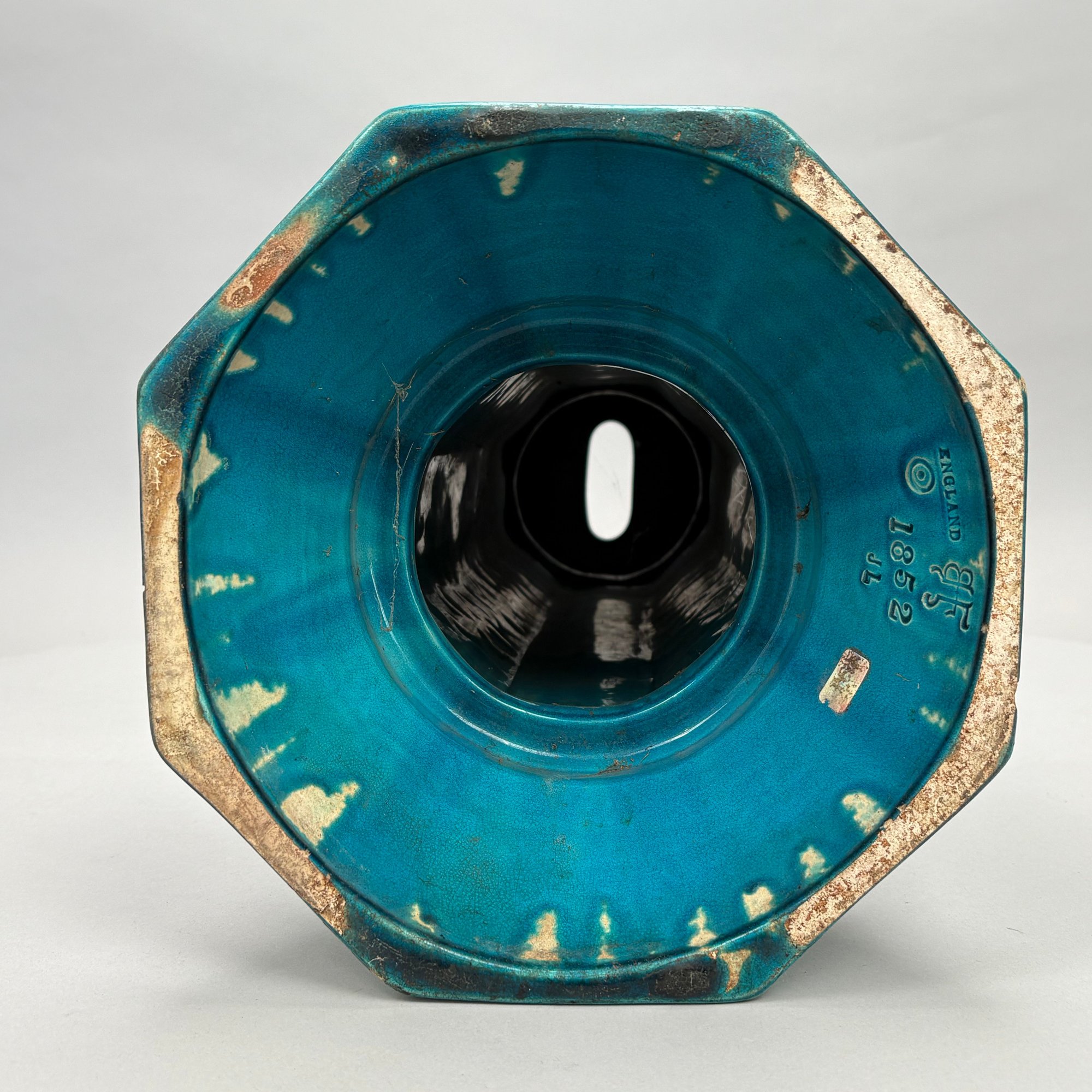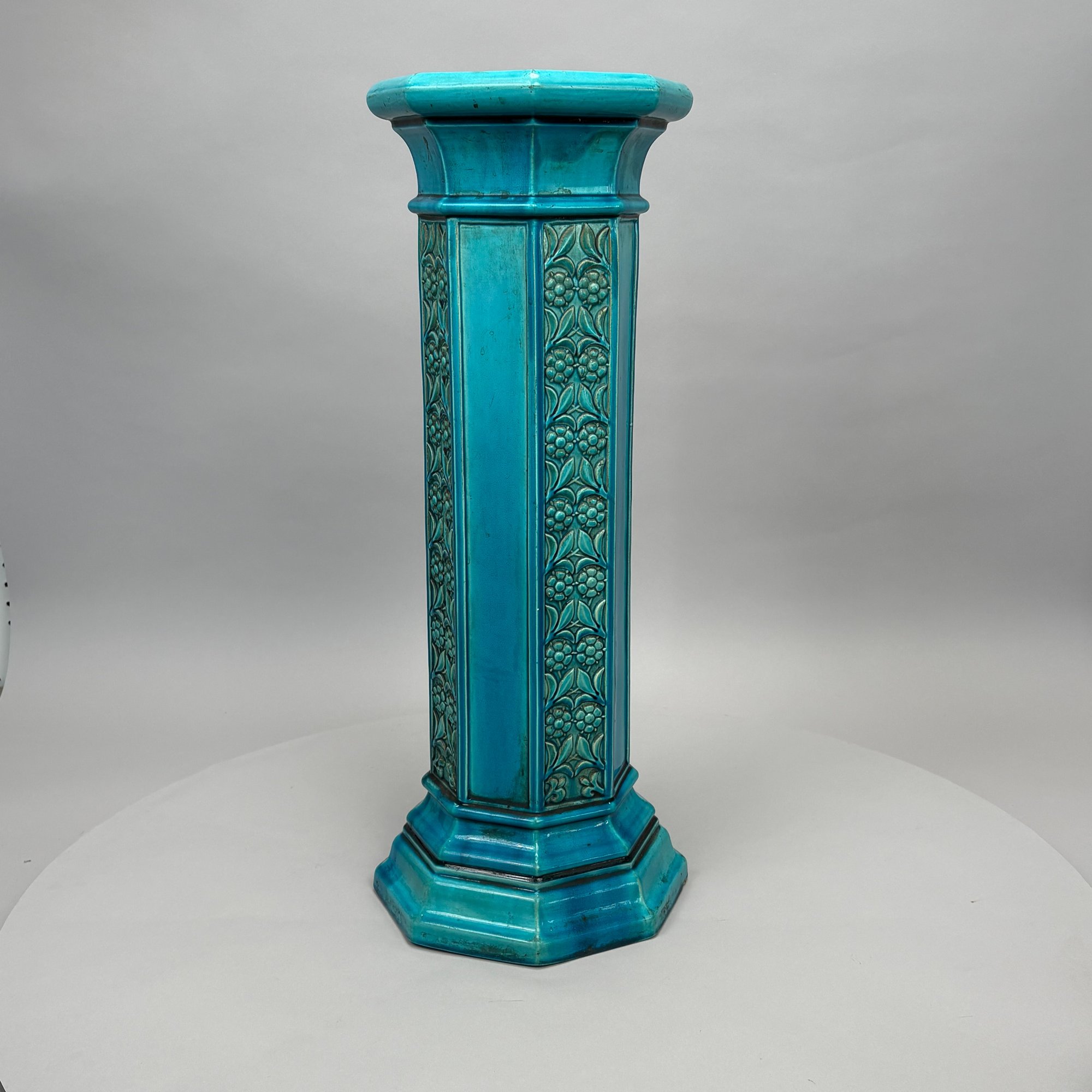 English Glazed Faience Pedestal, Burmantofts Pottery, Leeds, 1882-1904. Of octagonal shape and covered in turquoise glaze, molded with plain panels alternating with strips of double flower blossoms, on a stepped base, impressed BF cipher, "ENGLAND," pattern "1852" and initials "JL" possibly for John Lassey.