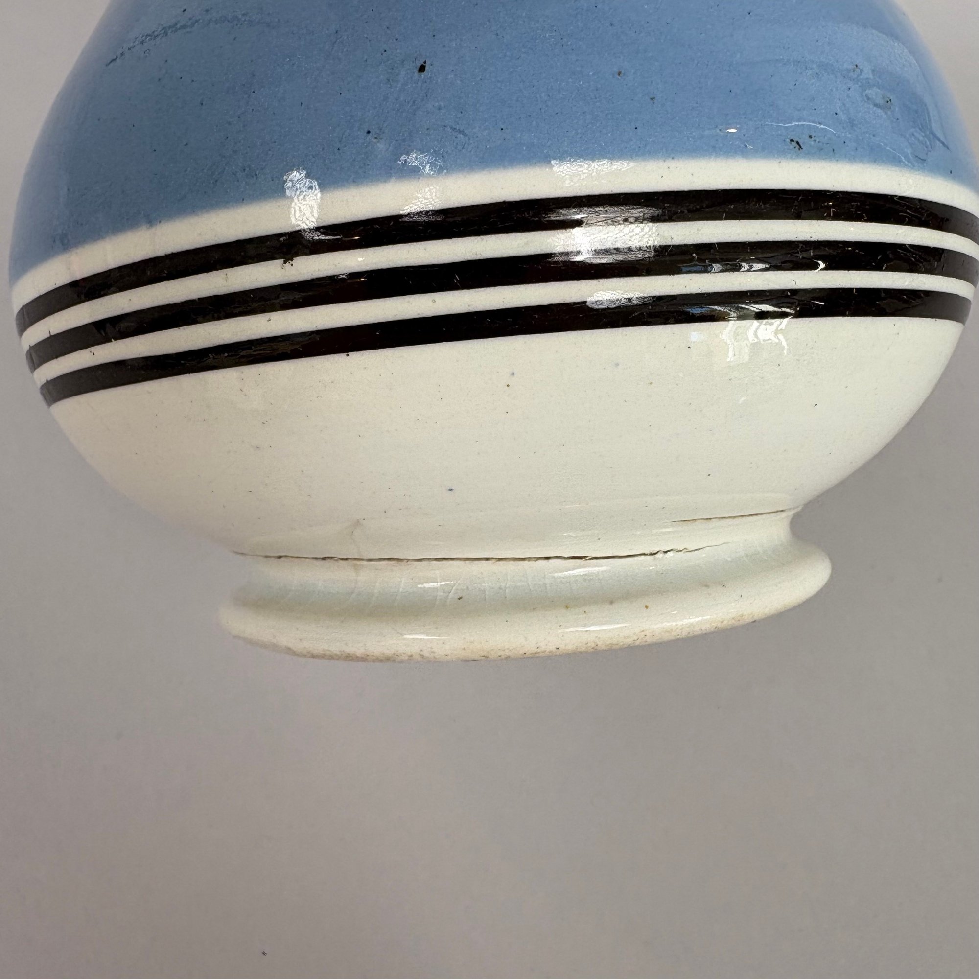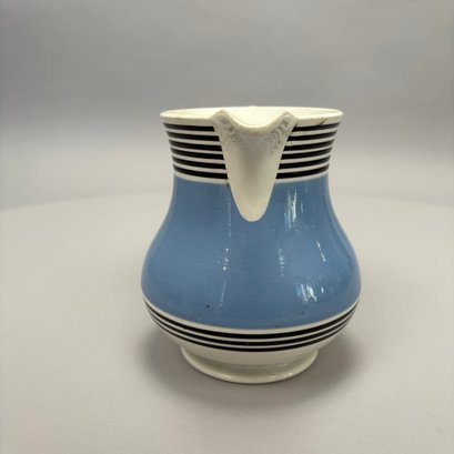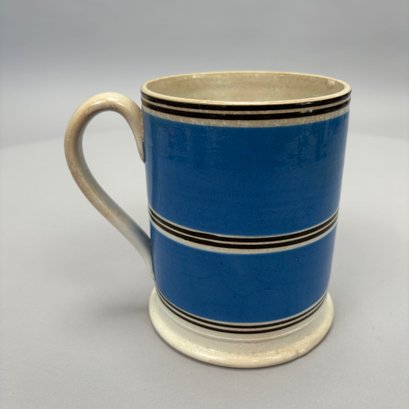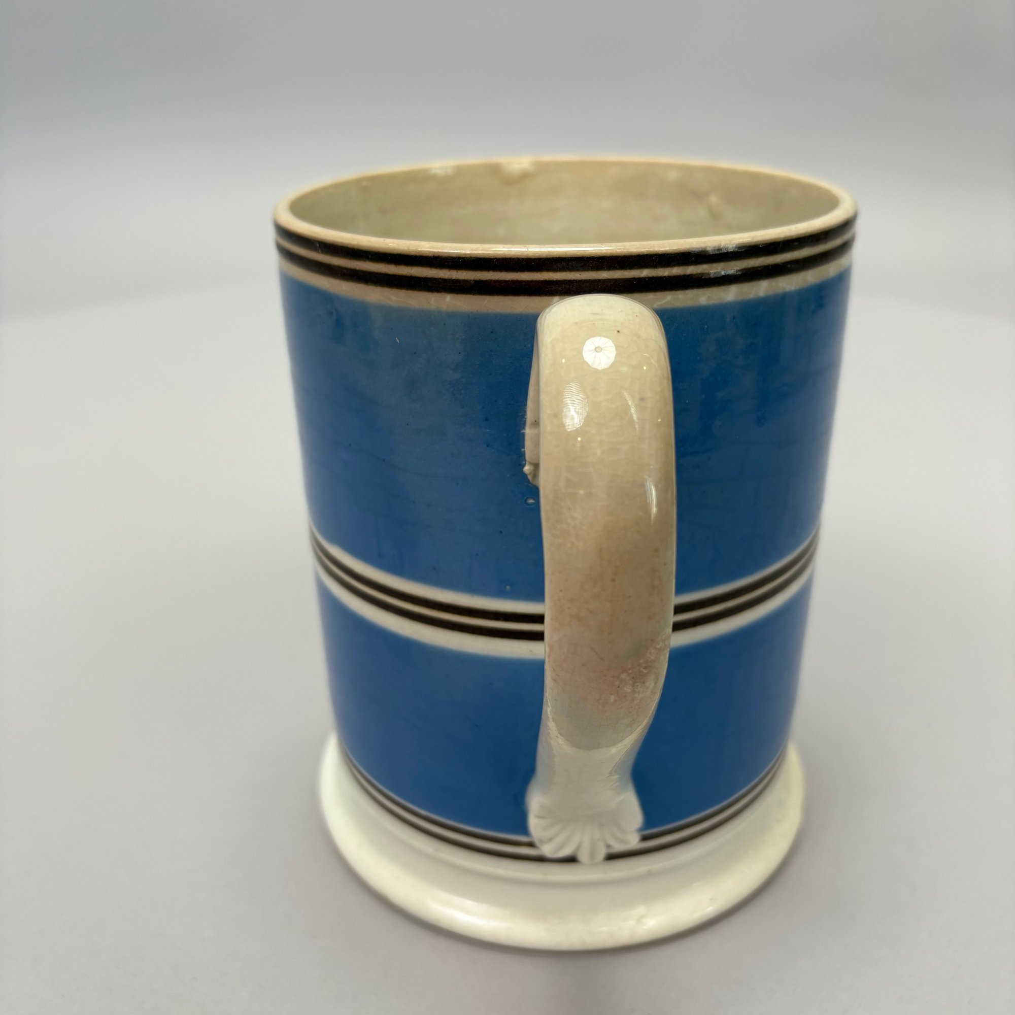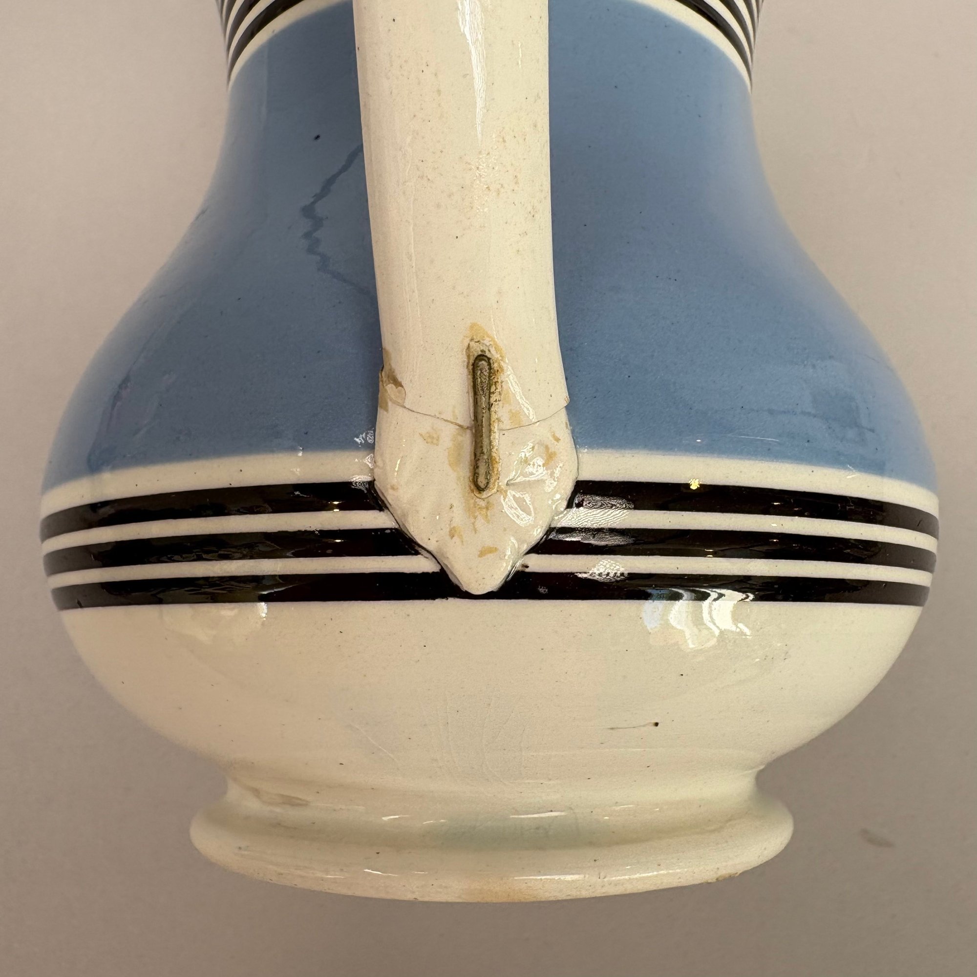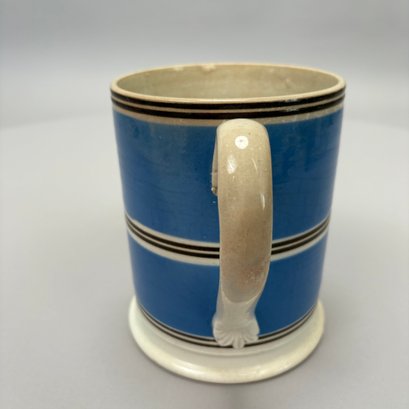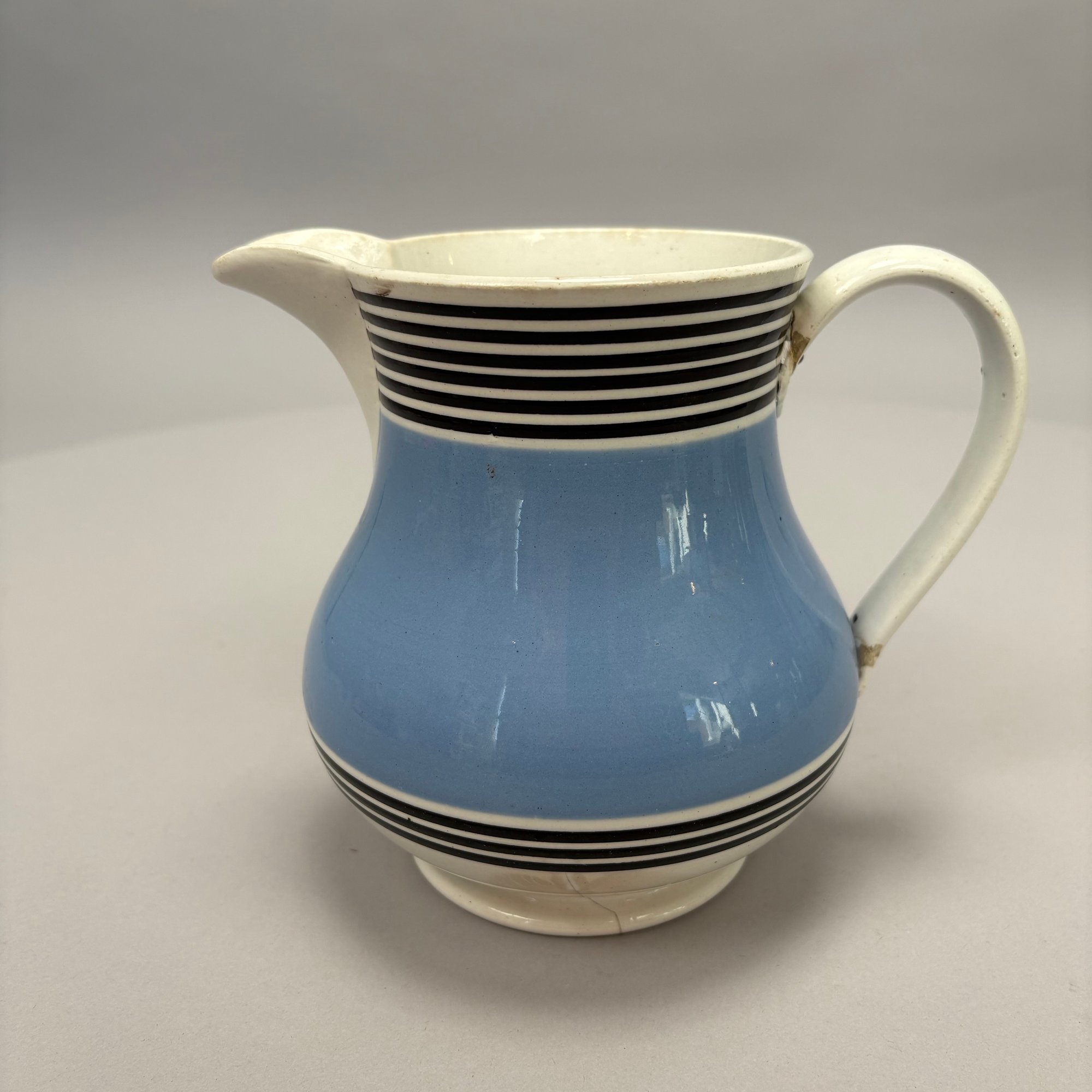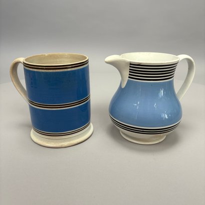 English Pearlware Mochaware Mug and a Whiteware Pitcher, 19th Century. Each slip-banded in blue within dark brown bands.