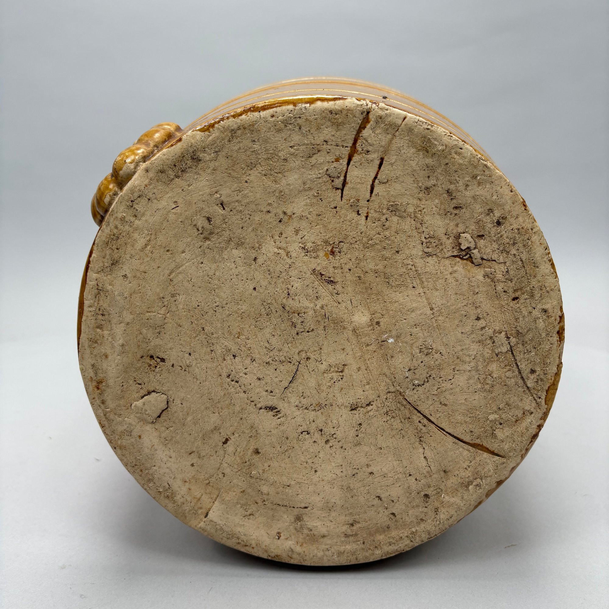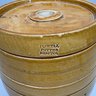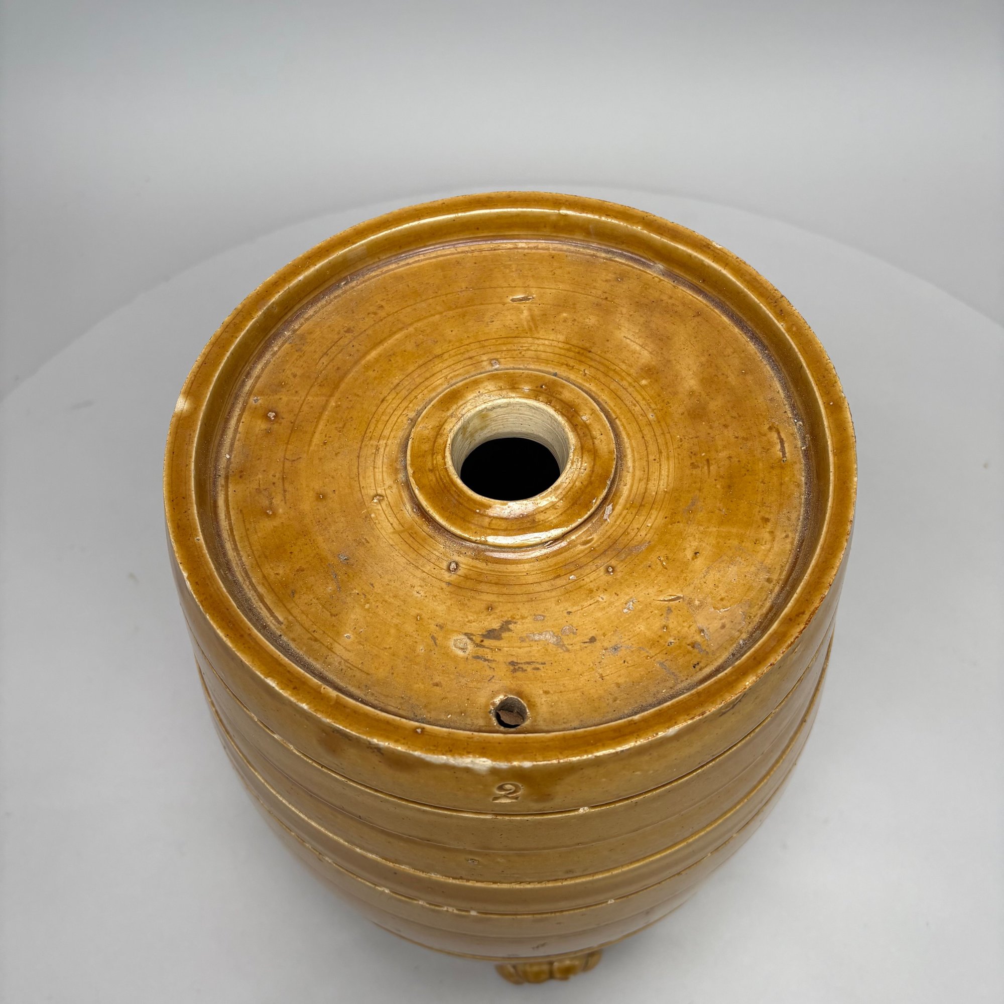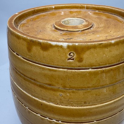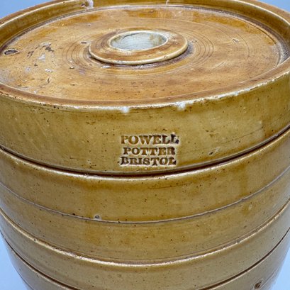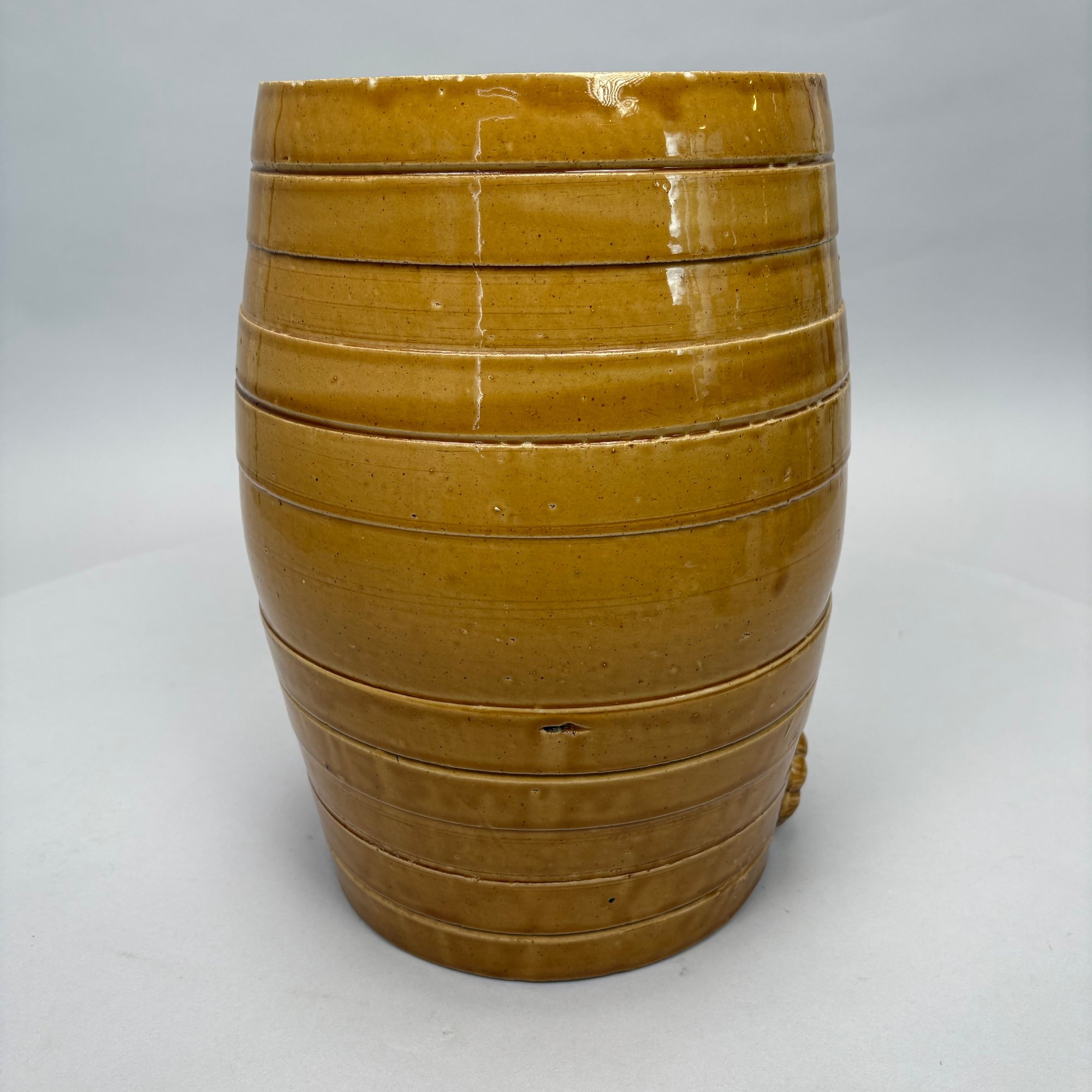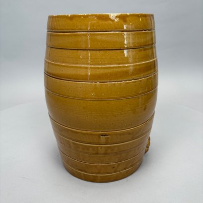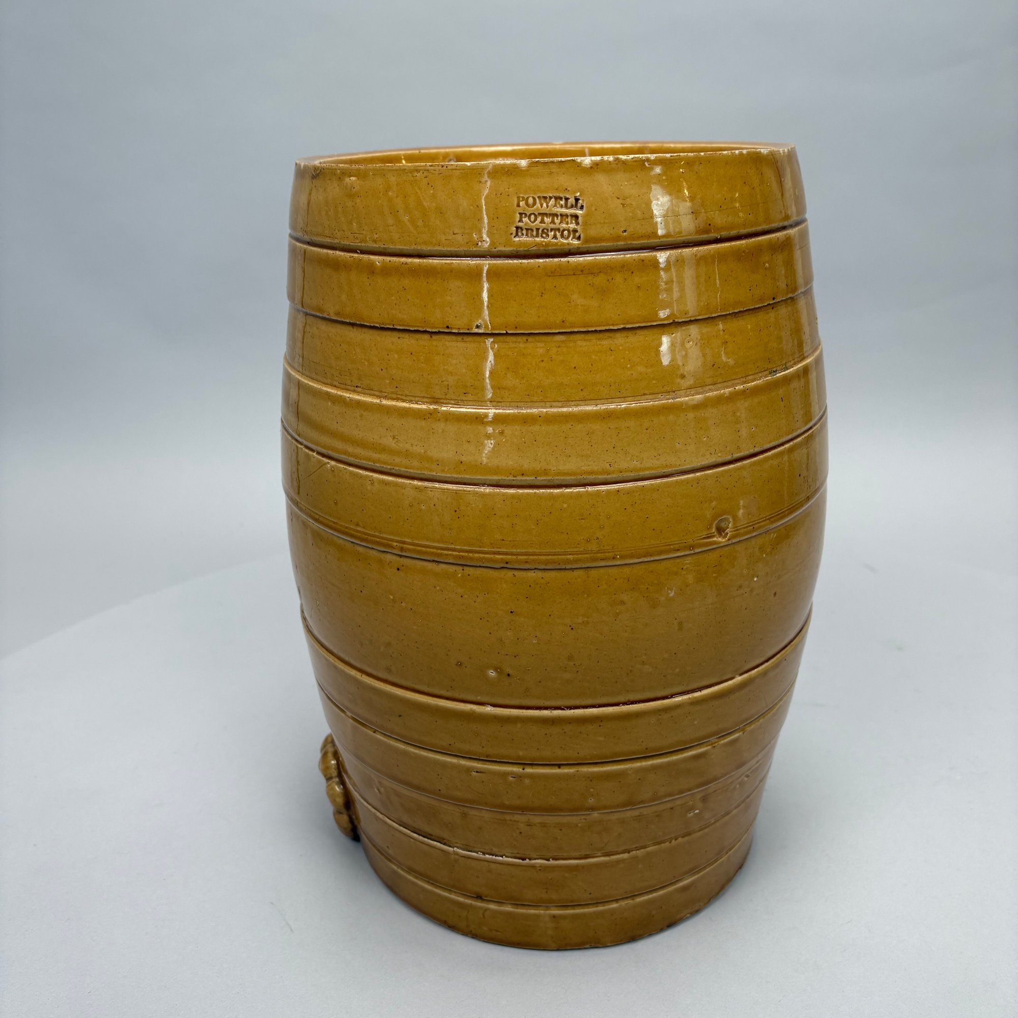 English Pottery Drinking Water Barrel, William Powell, Temple Gate Pottery, Bristol, 1835-1854. Covered in light brown glaze, impressed "2" and "POWELL/ POTTER/ BRISTOL."