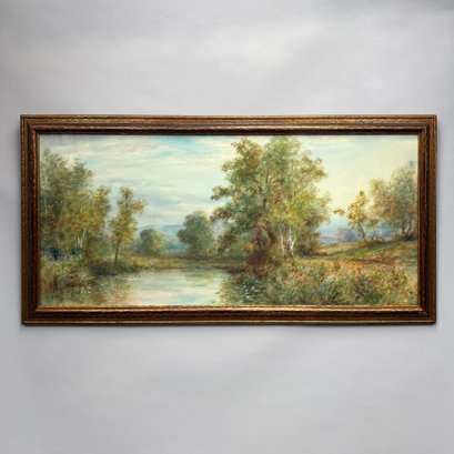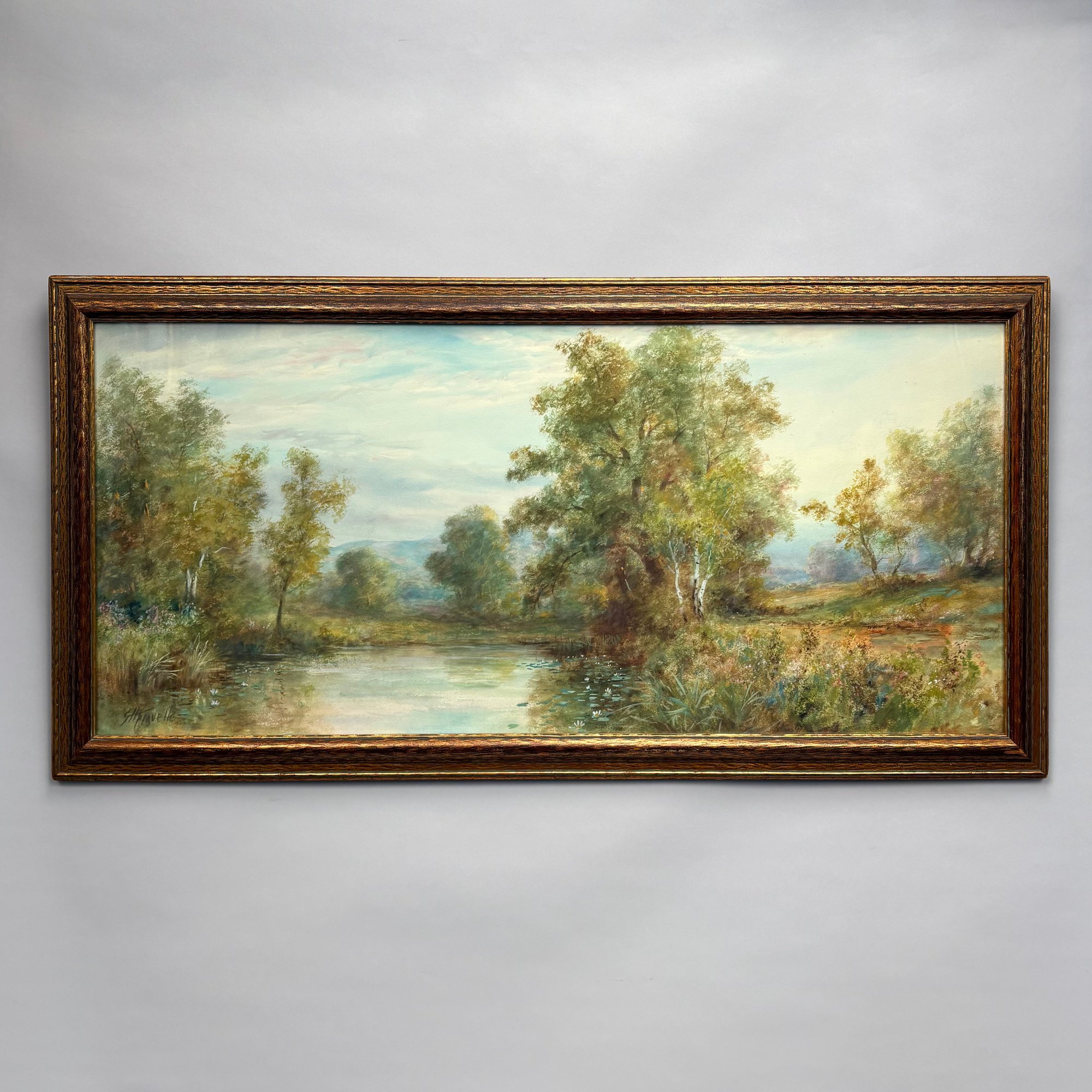 George H. Flavelle (1868, Philadelphia, Pennsylvania - 1945, Lynbrook, Long Island, New York). Spring Landscape with Birches. Watercolor on paper, signed "GH Flavelle" lower left, (17.625 x 39.5 inches, sight); housed in a giltwood frame.