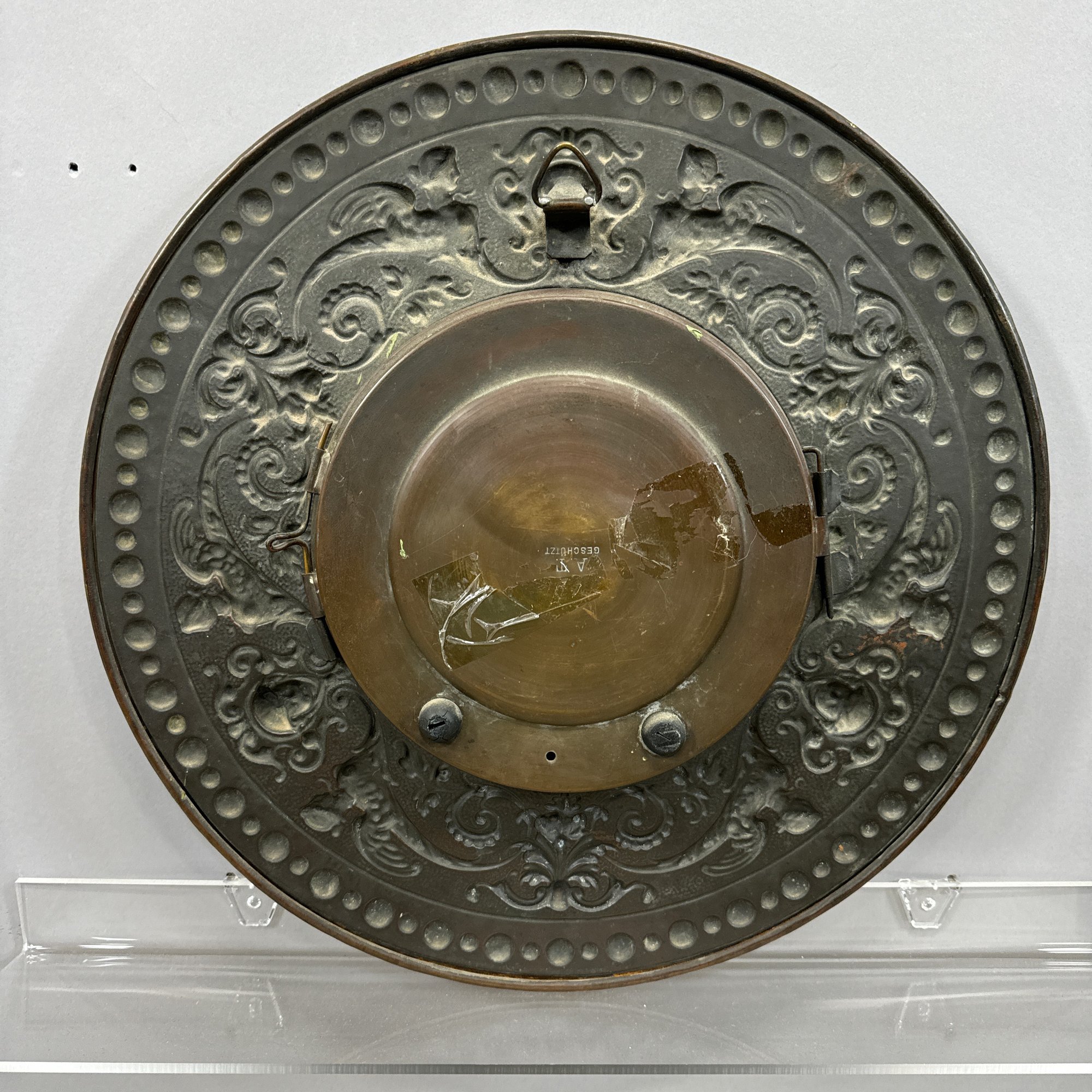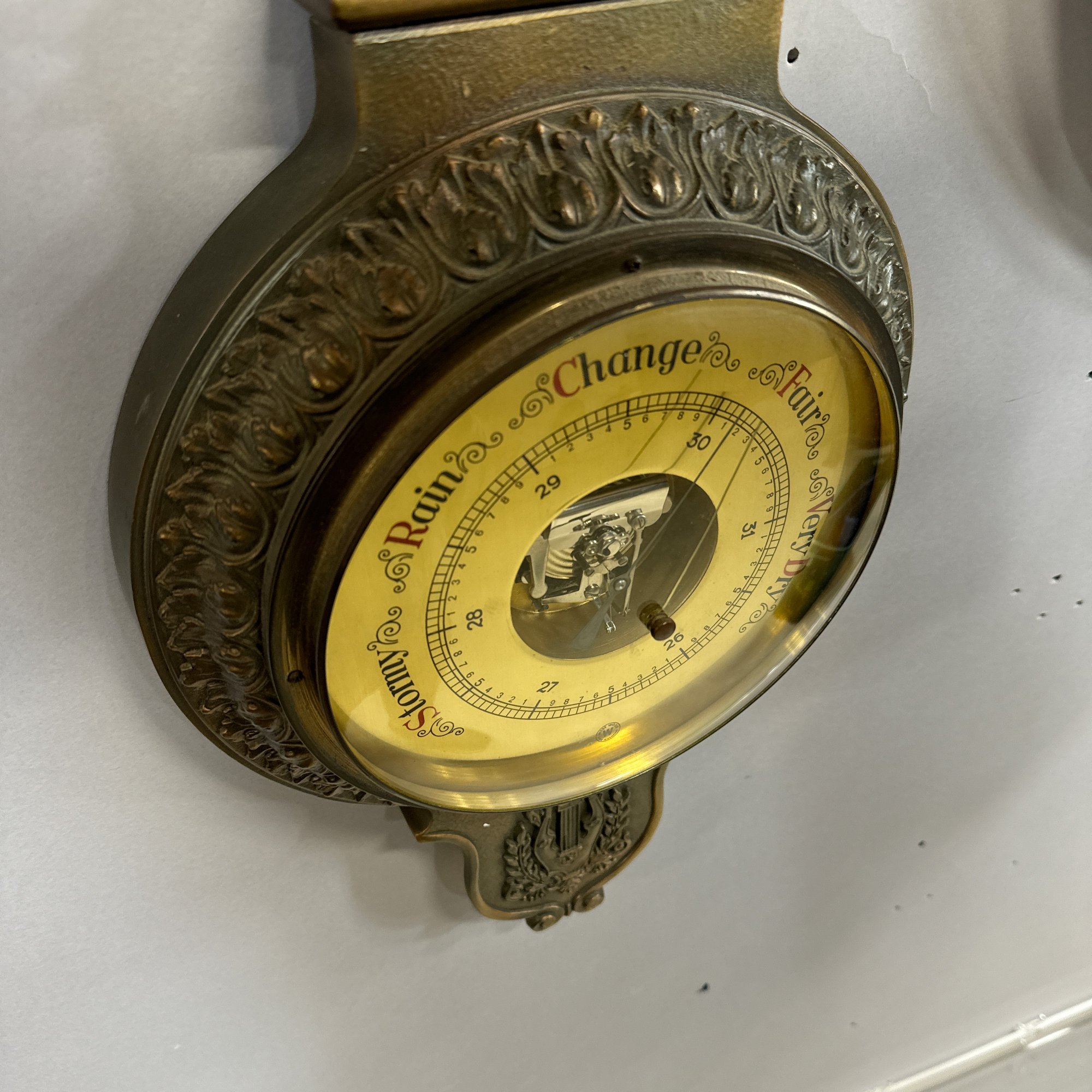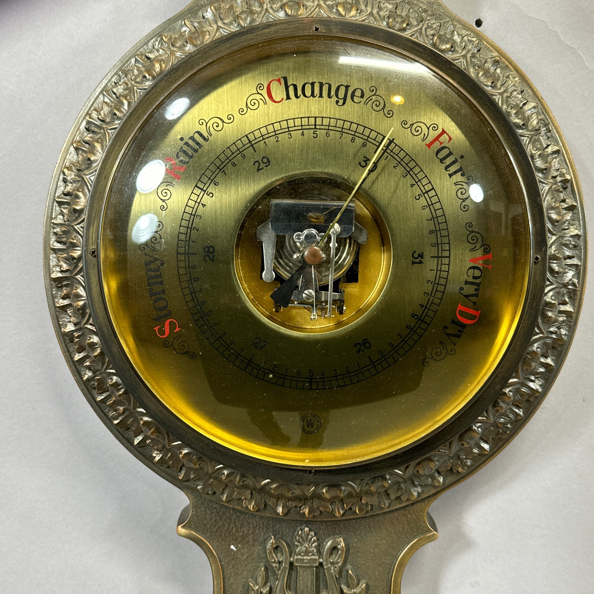 German Brass Wall Clock and a Modern Brass Barometer. The wall clock mounted with enamel Roman numerals and repousse with a border of Harpies, masks, fruit and scrolling leaves, with winding key, "A.T./ GESCHUTZT" patent or trademark; the barometer possibly Westwood, Inc., Germany.