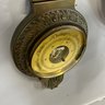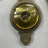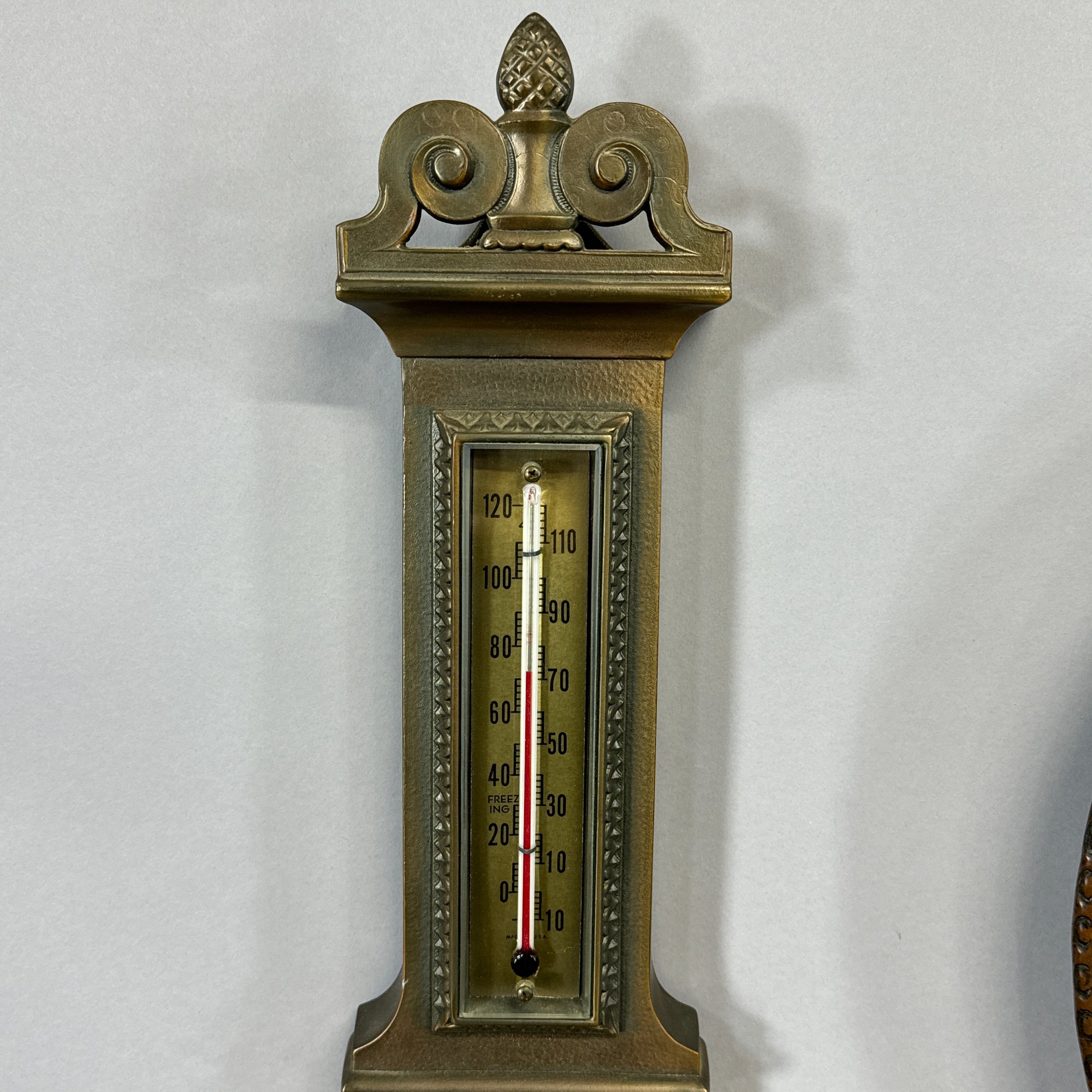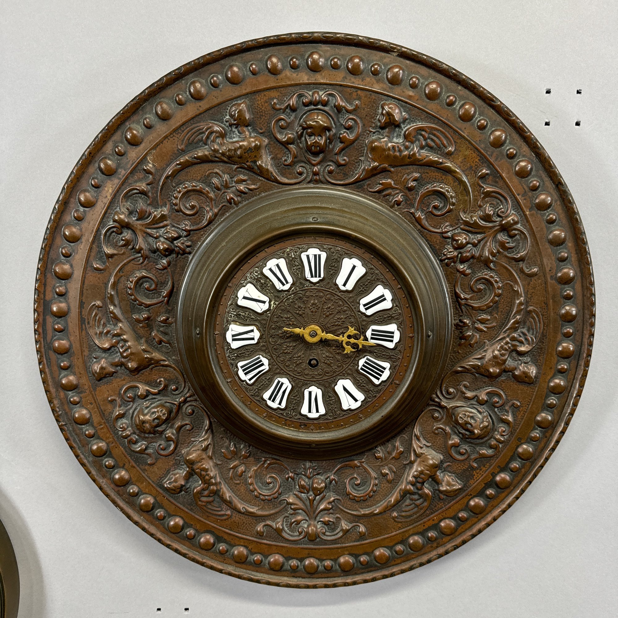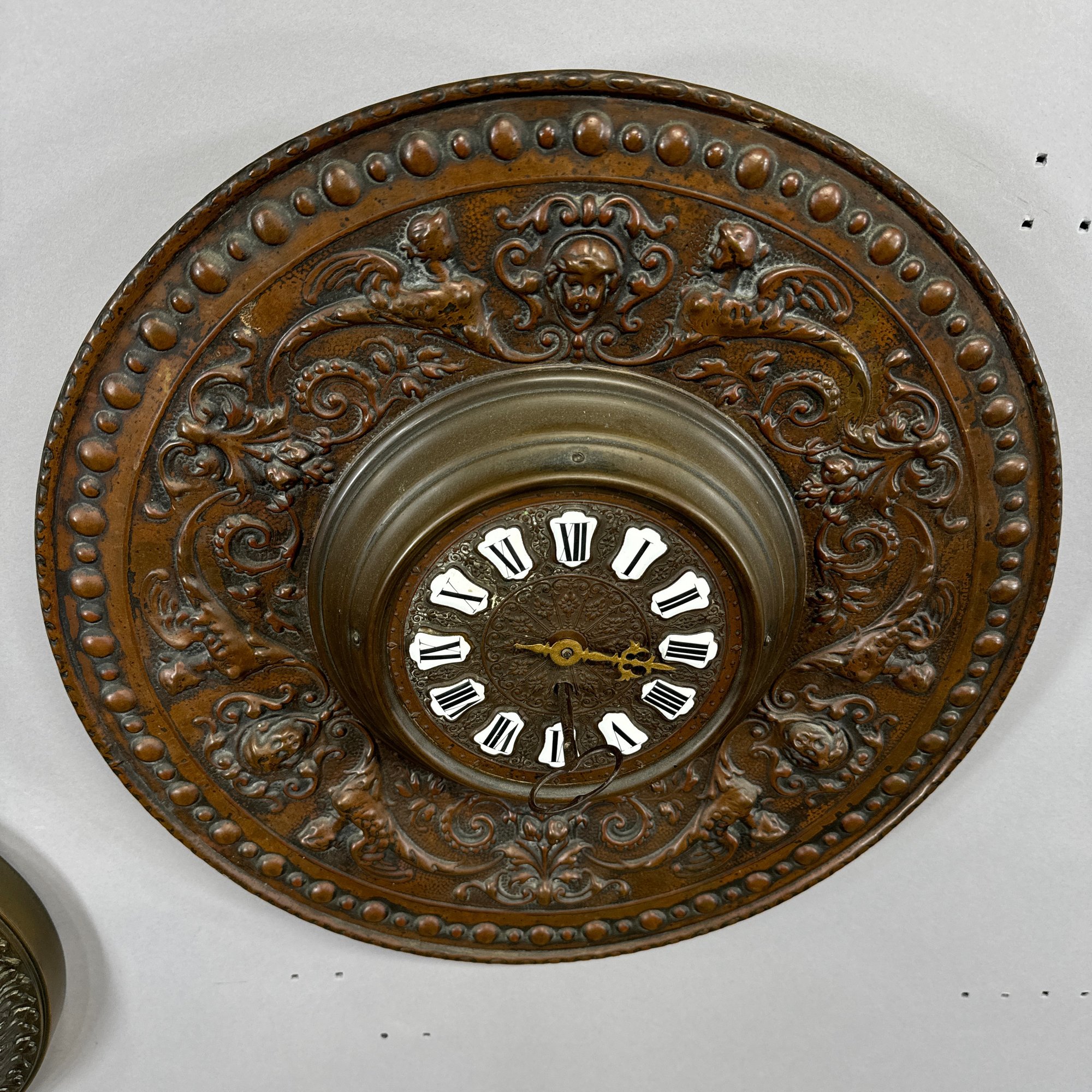German Brass Wall Clock and a Modern Brass Barometer. The wall clock mounted with enamel Roman numerals and repousse with a border of Harpies, masks, fruit and scrolling leaves, with winding key, "A.T./ GESCHUTZT" patent or trademark; the barometer possibly Westwood, Inc., Germany.