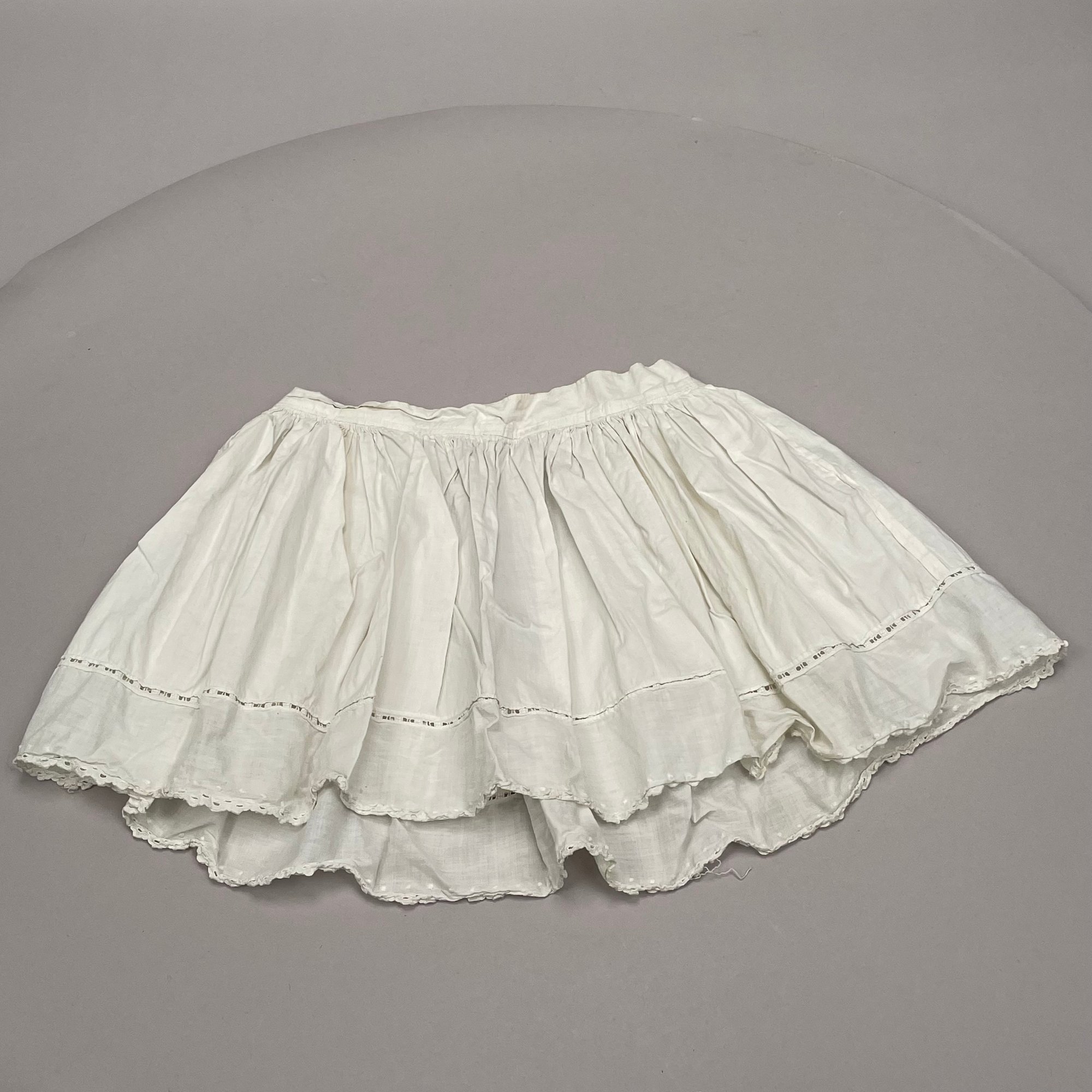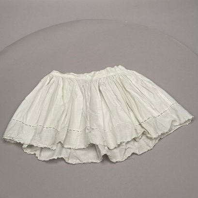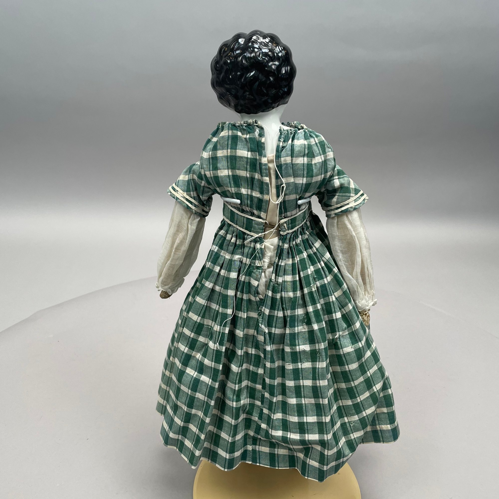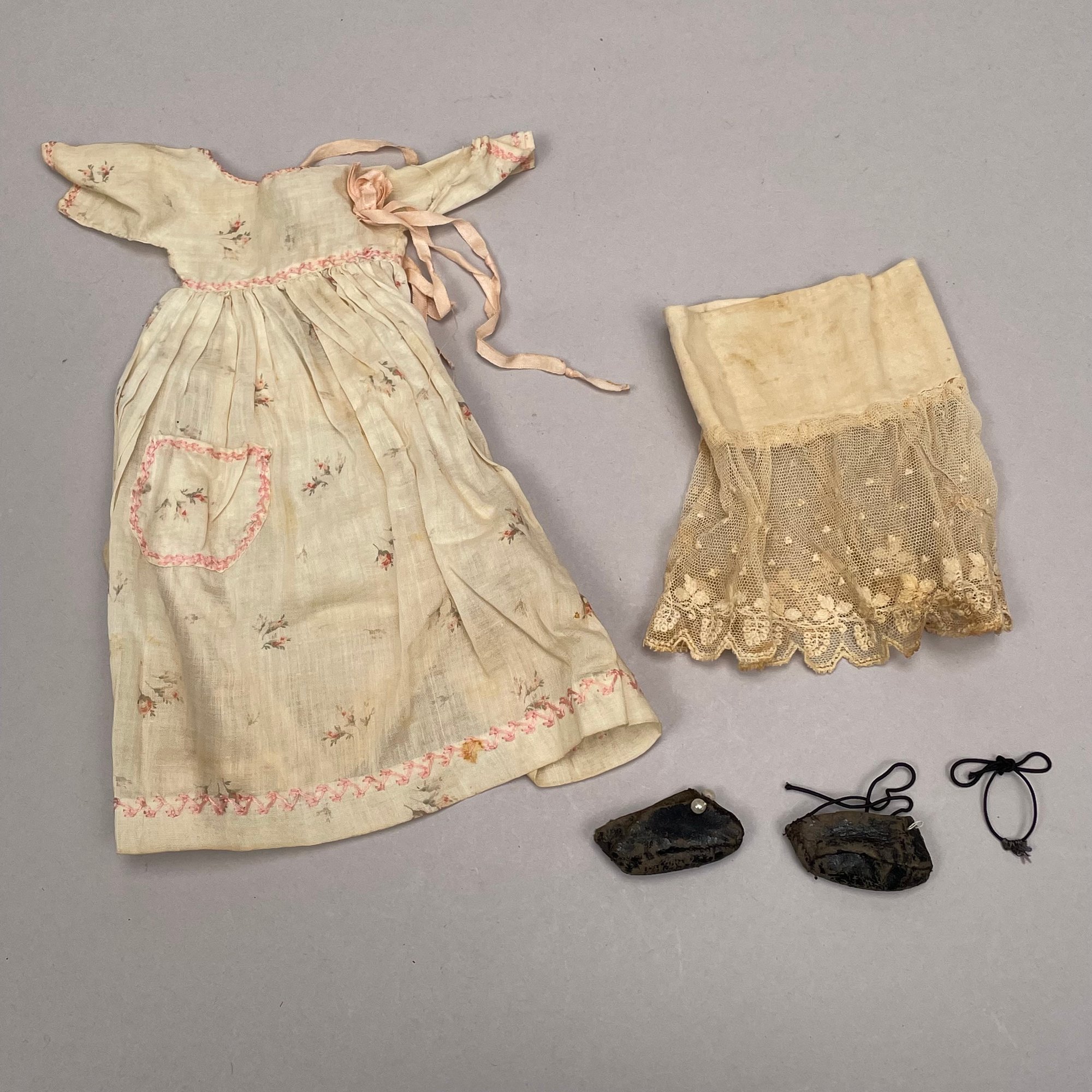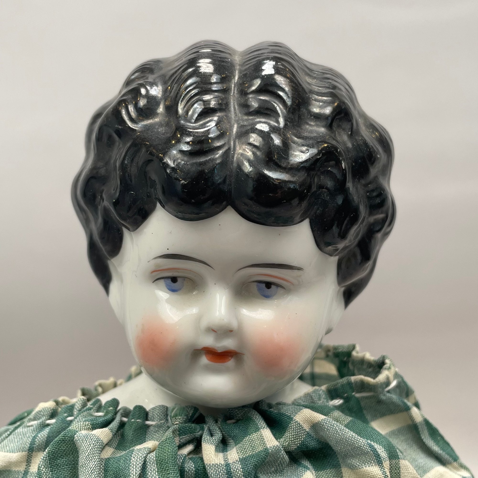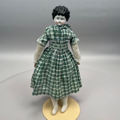 German Jenny Lind Porcelain Low Brow Portrait Doll, 1890's. Porcelain head and shoulders, hand-painted facial features, cloth body. Together with a doll's dress and a skirt, a lace slip and pair of leather shoes.
