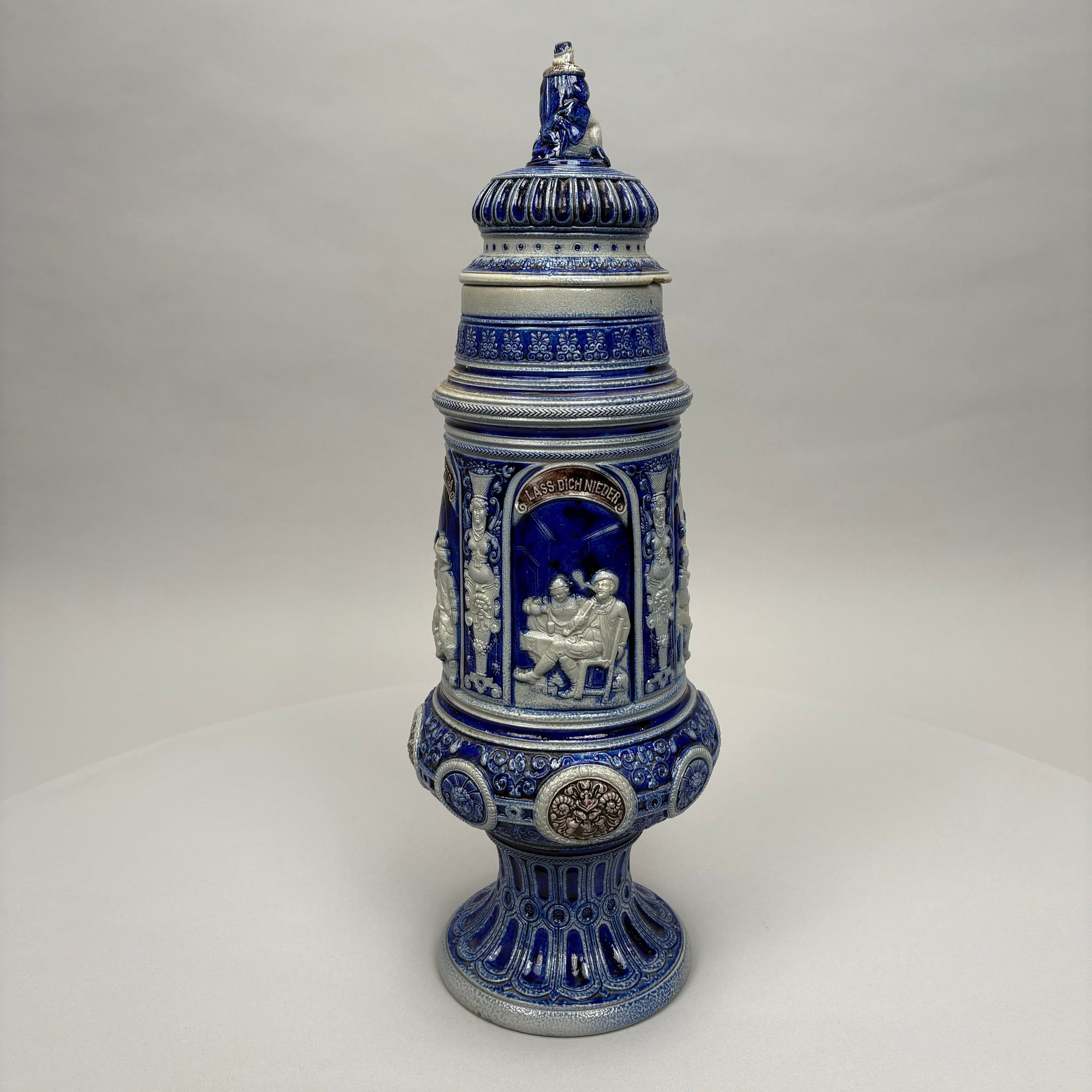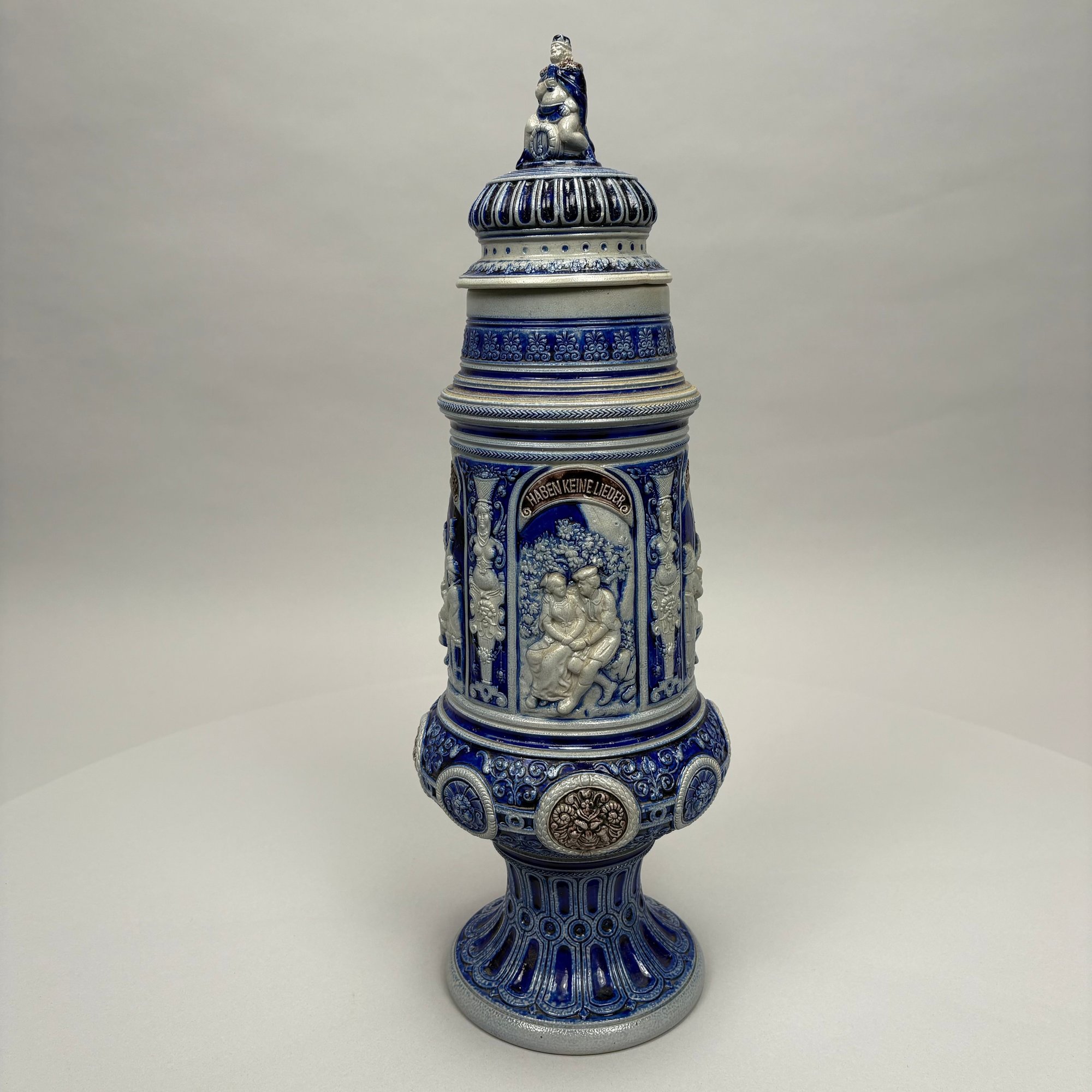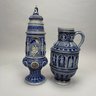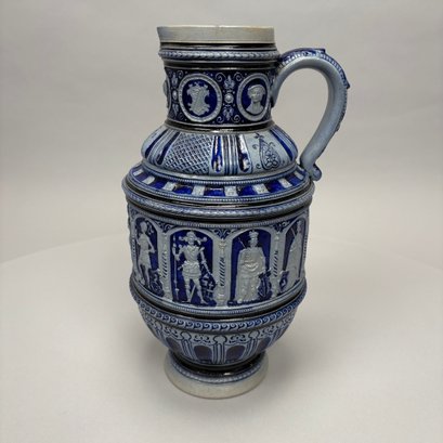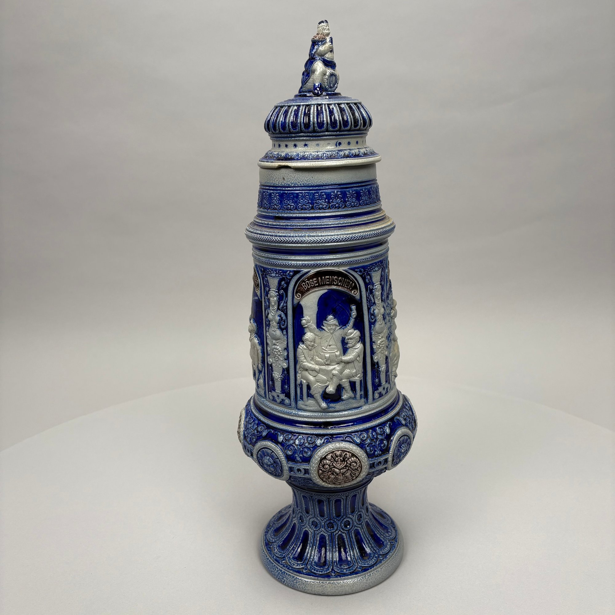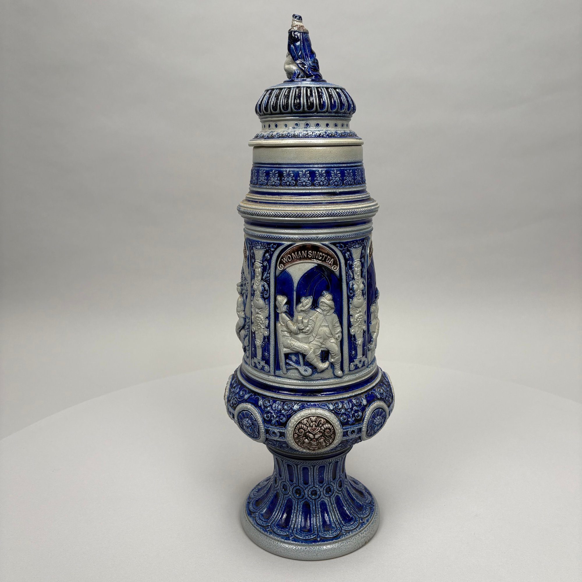 German Blue and White Saltglaze Stoneware Motto Beer Stein, Simon Peter Gerz; and a Tankard/ Pitcher, Possibly Gerz, Late 19th Century. The first impressed with the mark of a stein inside a triangle and mold number "449;" the second with mold number "167."