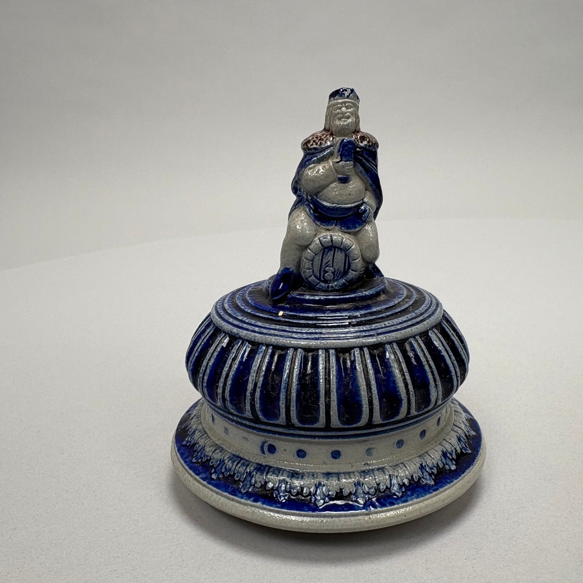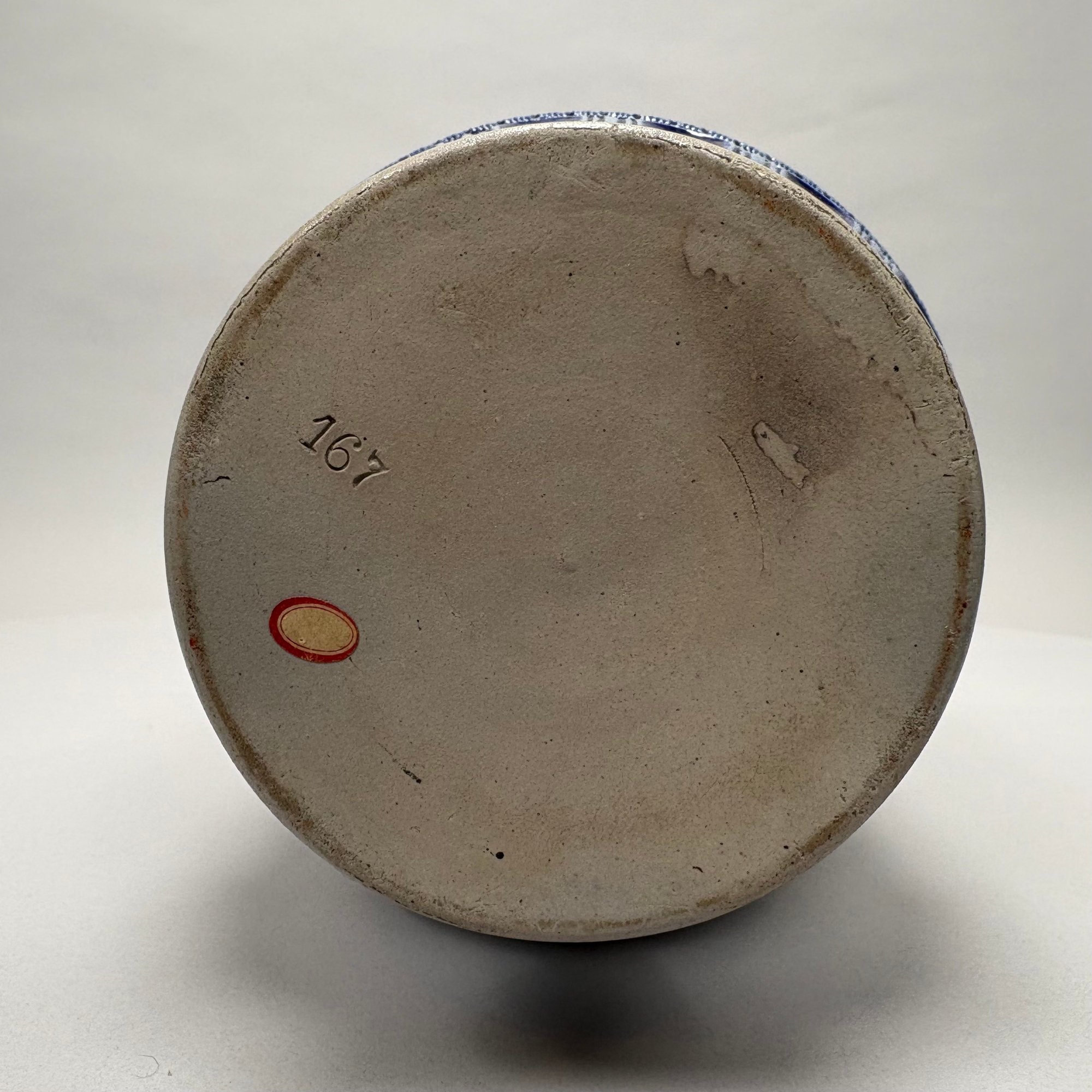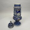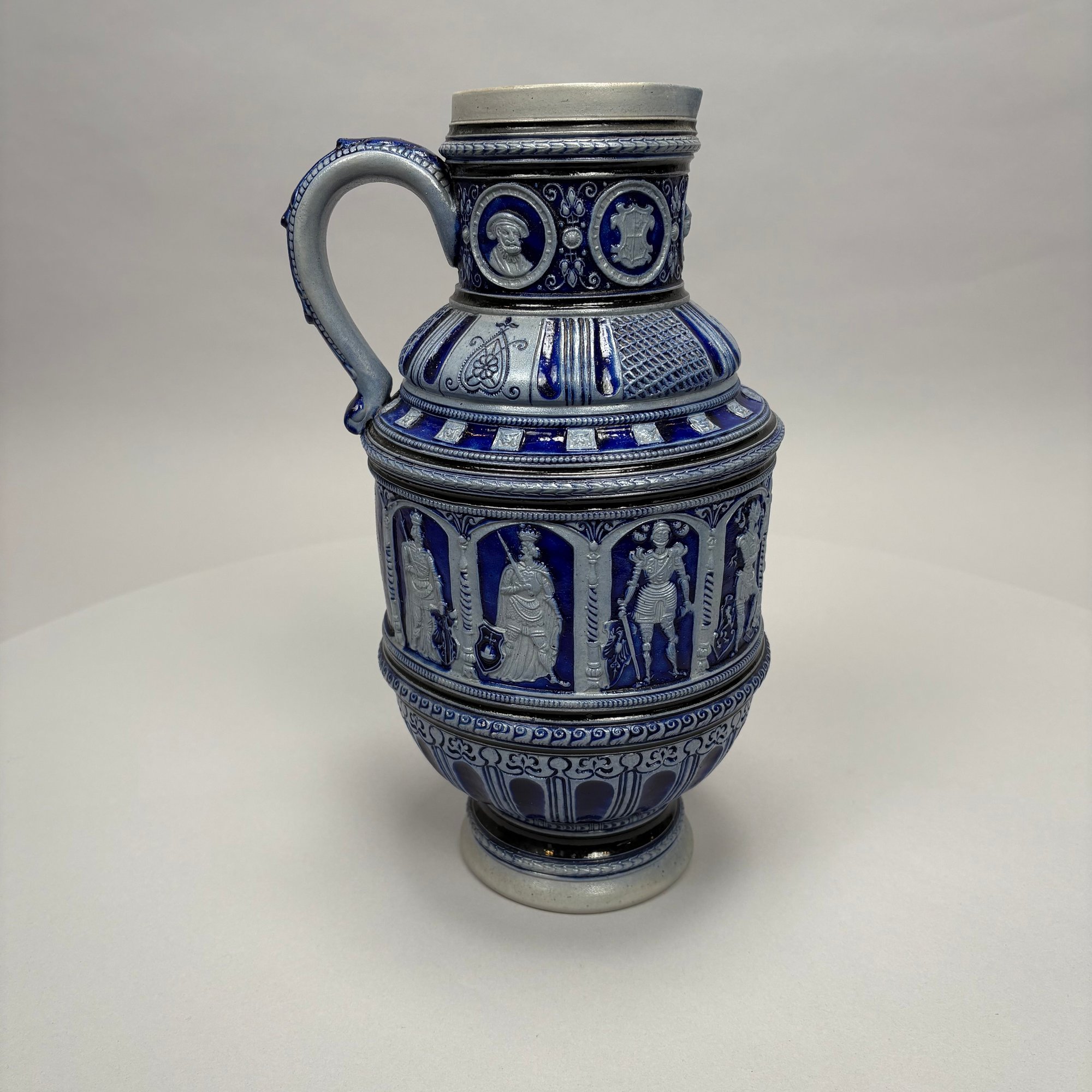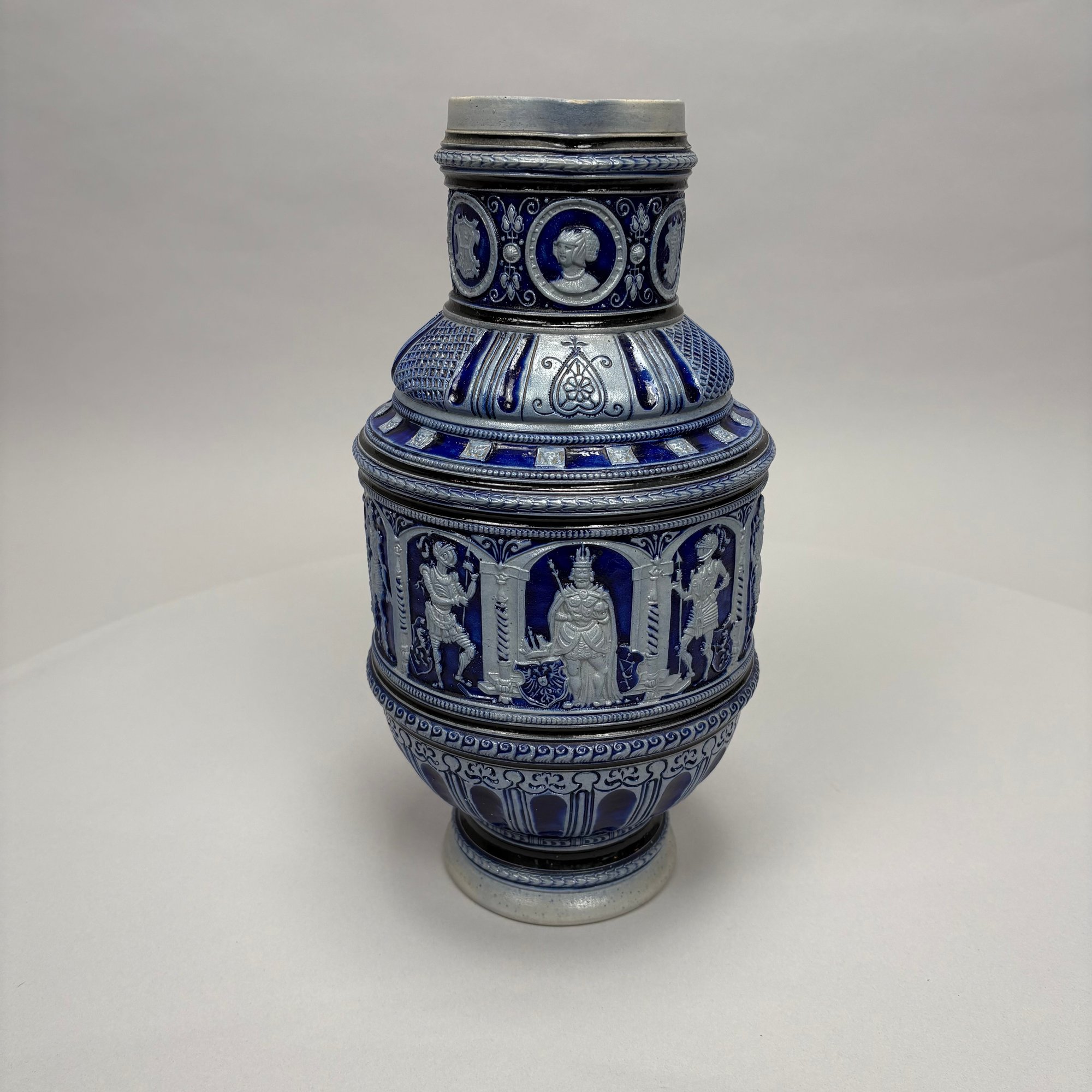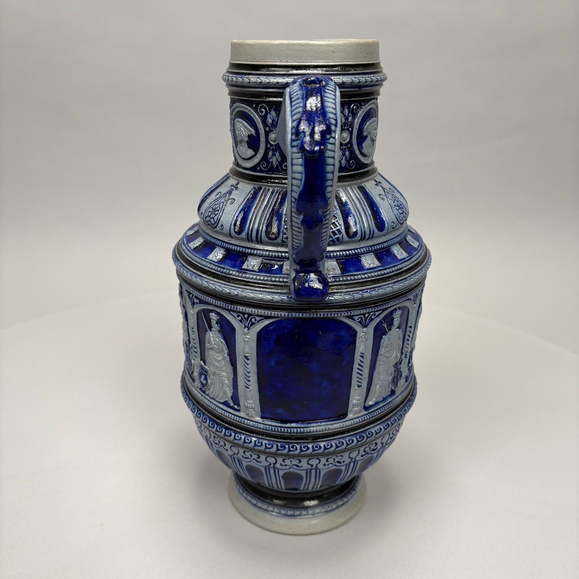 German Blue and White Saltglaze Stoneware Motto Beer Stein, Simon Peter Gerz; and a Tankard/ Pitcher, Possibly Gerz, Late 19th Century. The first impressed with the mark of a stein inside a triangle and mold number "449;" the second with mold number "167."