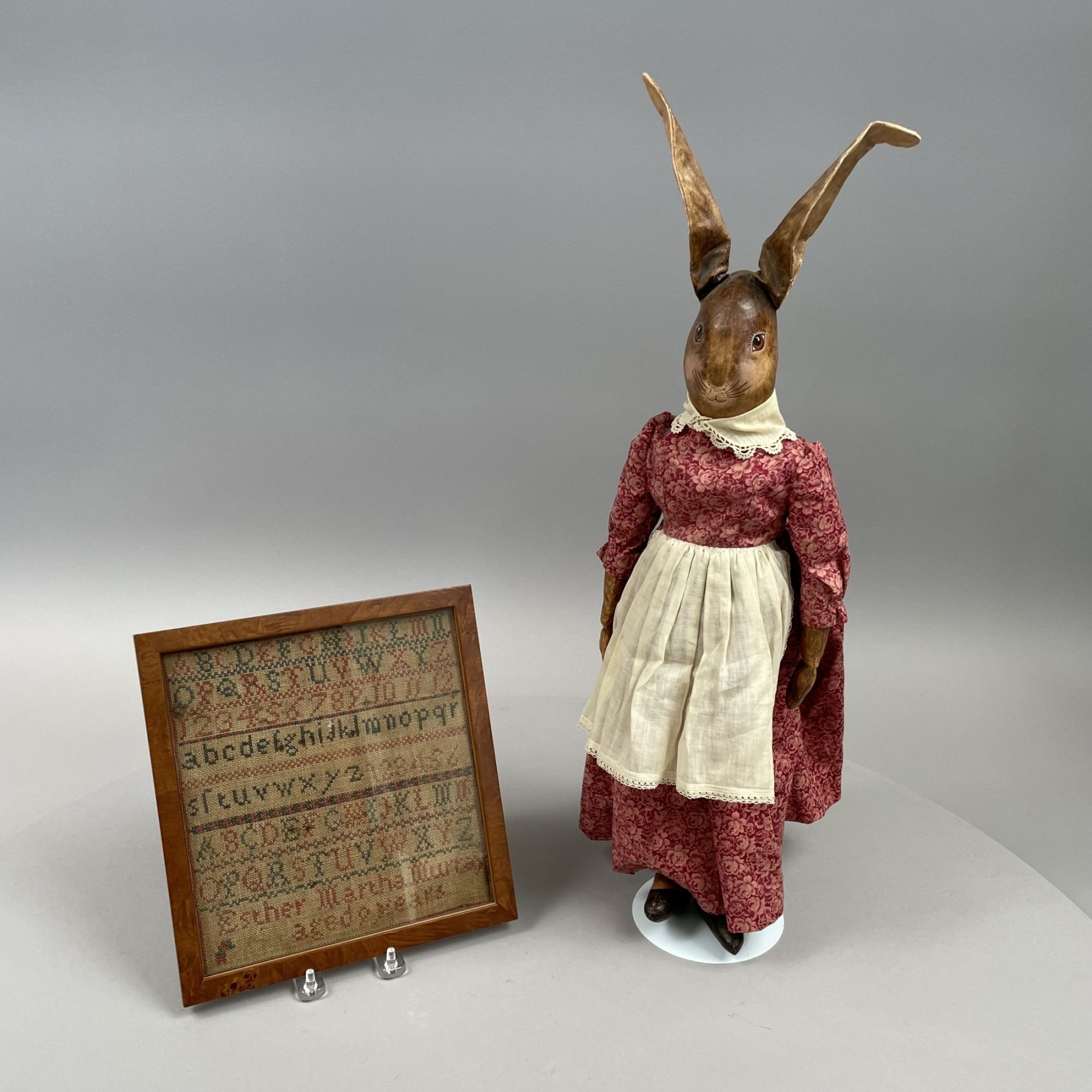 The needlework sampler stitched with alphabet and number rows, inscribed "Esther Martha Murray/ aged 9 years;" the rabbit signed on the back of the head "'Nancy Lee' by Jo Buckley 1979."