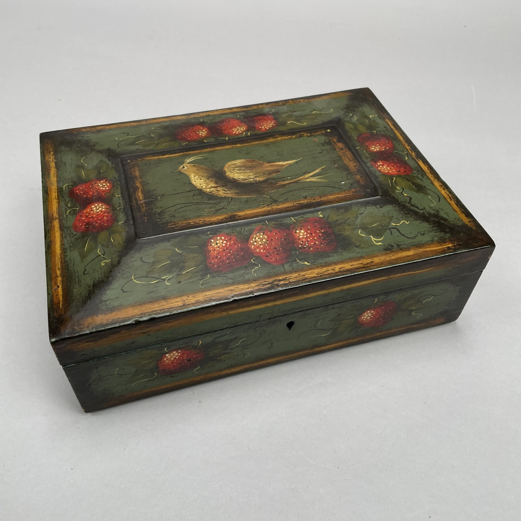 Painted on the cover with a bird walking within a border of strawberries , the front and sides with strawberries, signed "Peter Ompir" in black paint beneath.