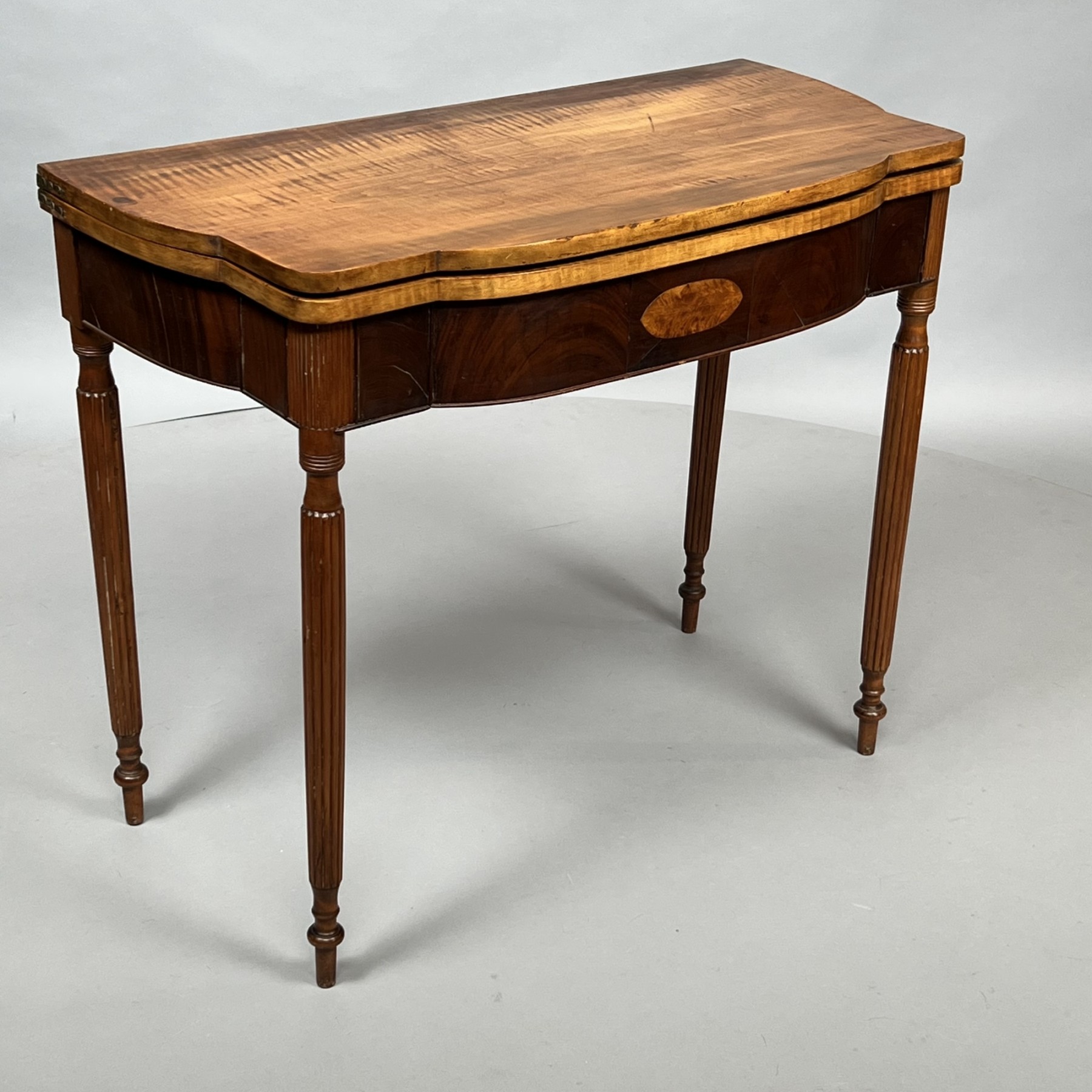 The oblong top with bow front and shaped sides above a conforming mahogany frieze with central satinwood oval inlay and reeded corners, raised on turned and reeded tapering legs with cuffs.