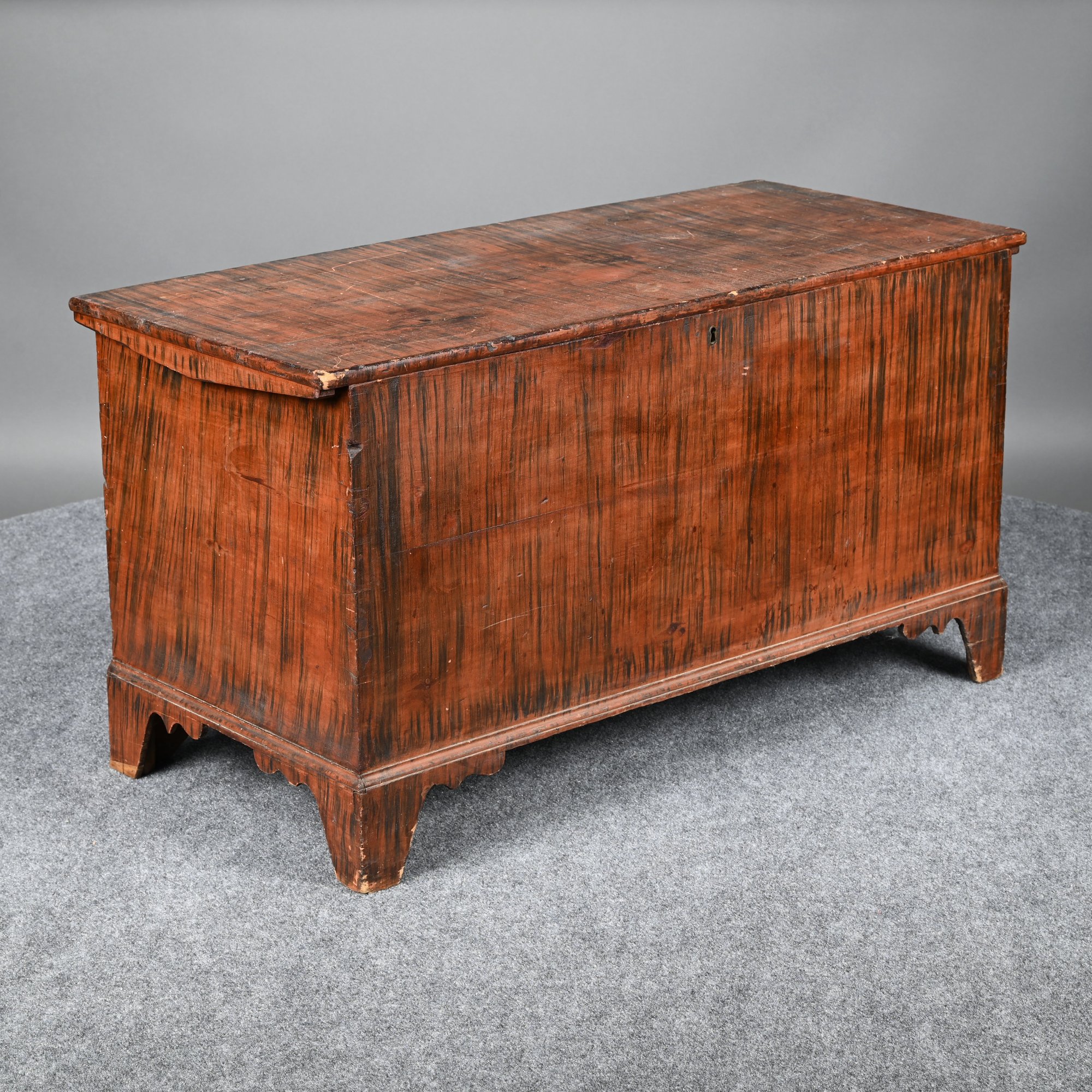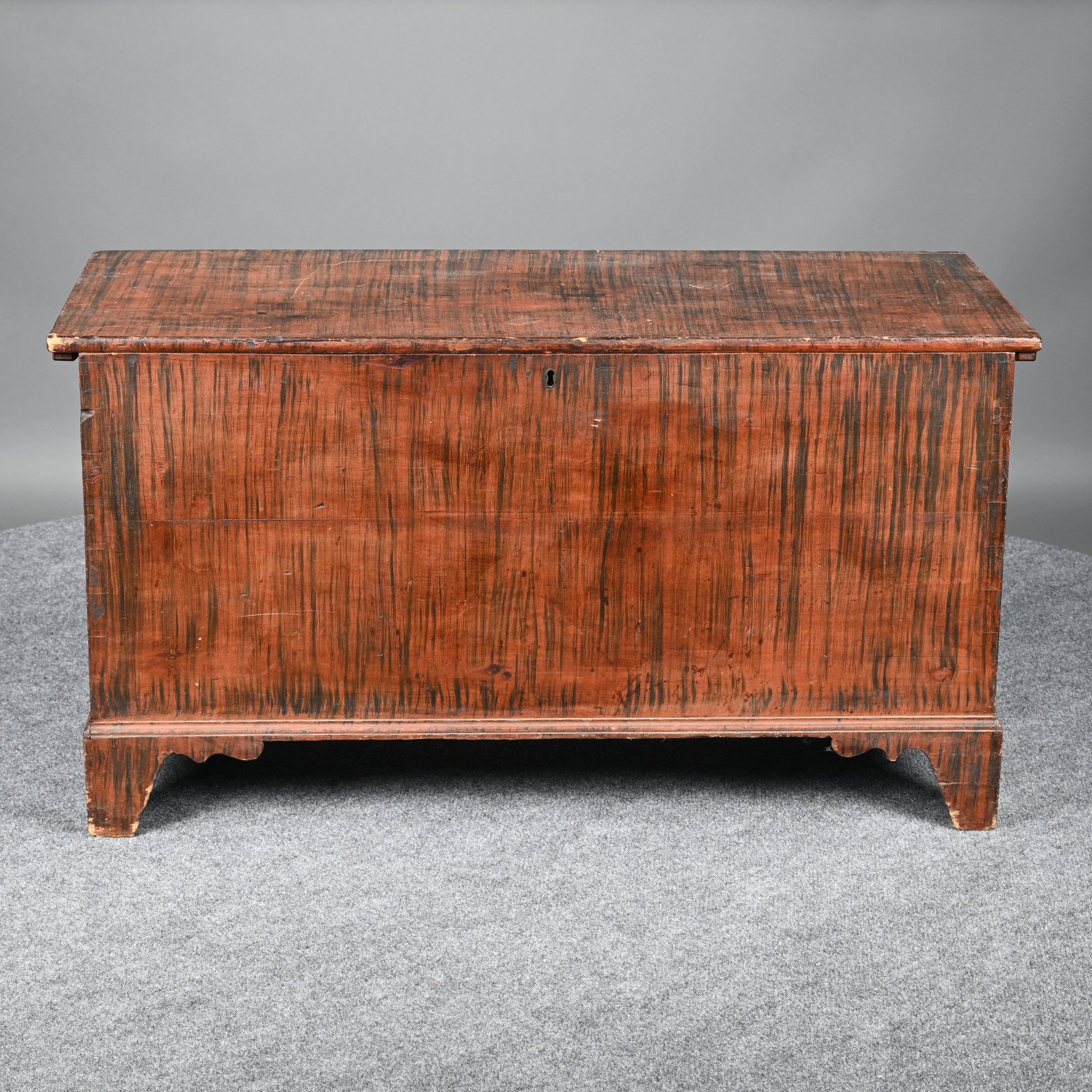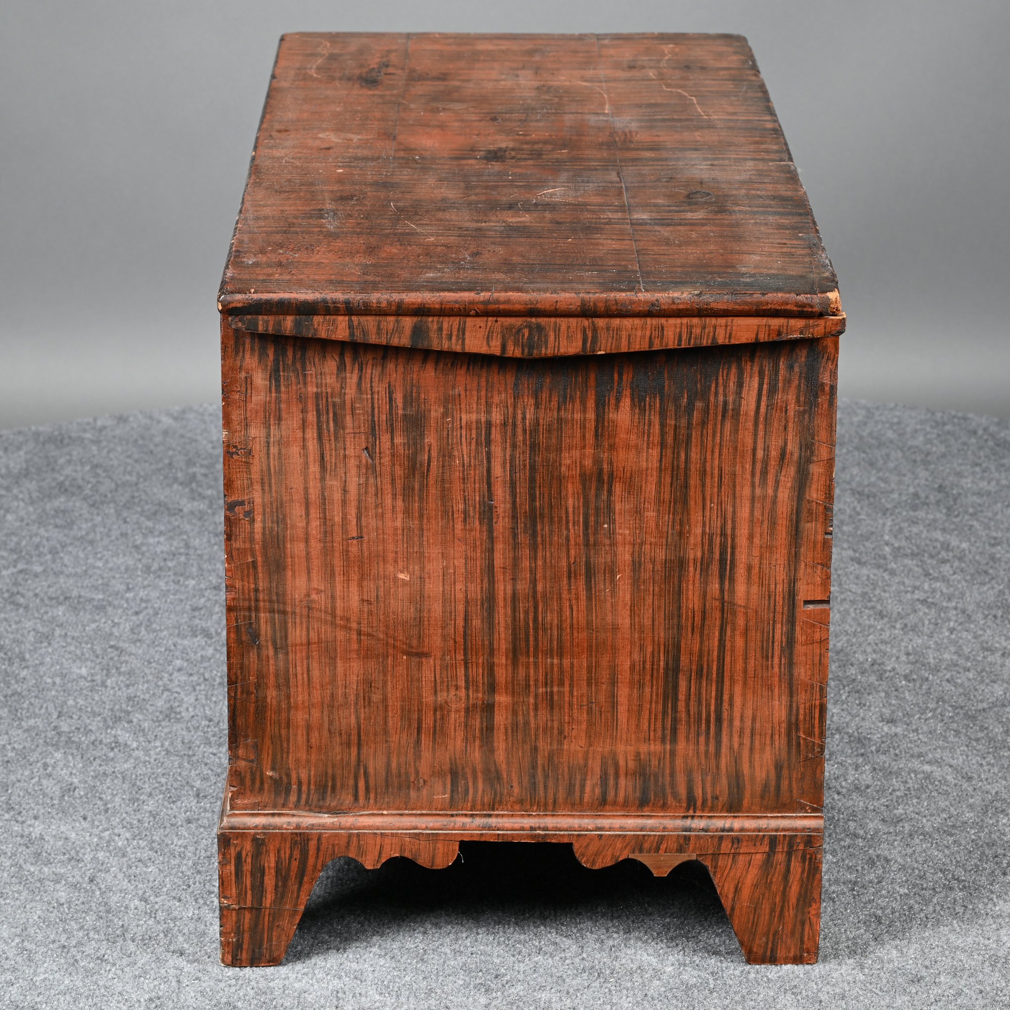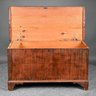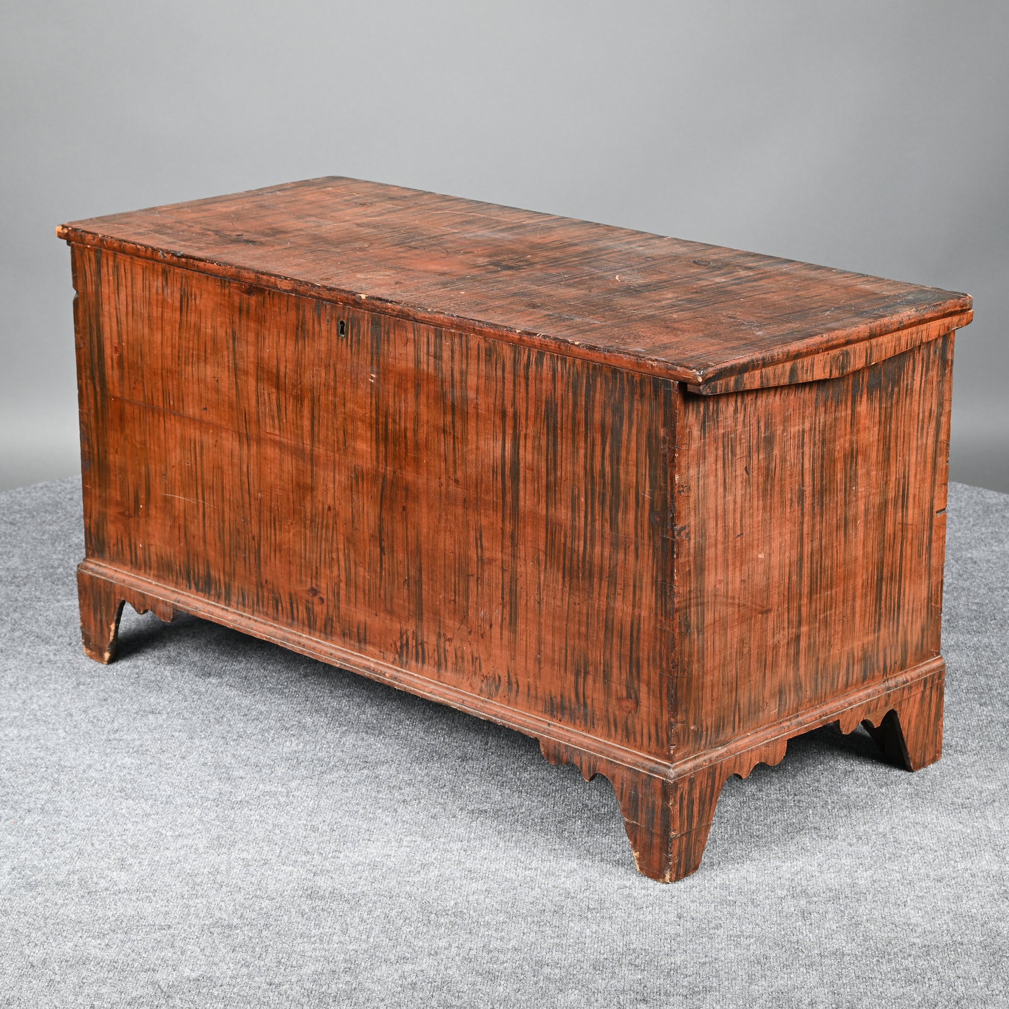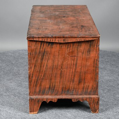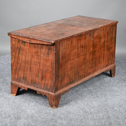 New England Poplar and Pine Grain-Painted Blanket Chest. The rectangular top lifting to reveal a till, the base with applied border raised on bracket feet, the whole painted in black streaks on a red ground.