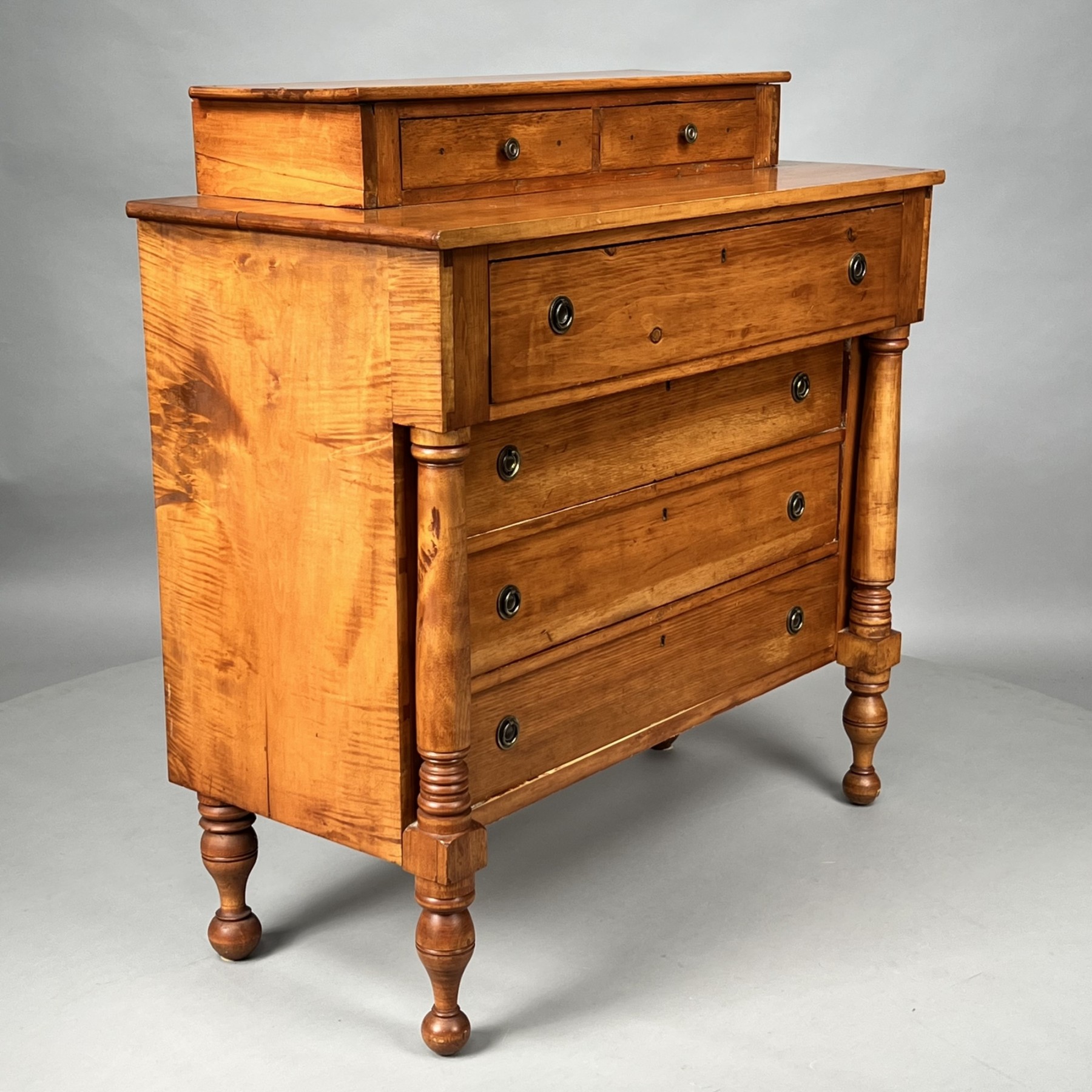 The rectangular superstructure fitted with two aligned drawers, above the top and long drawer, over three inset drawers flanked by free-standing ring-turned columns, raised on turned vase-form feet.